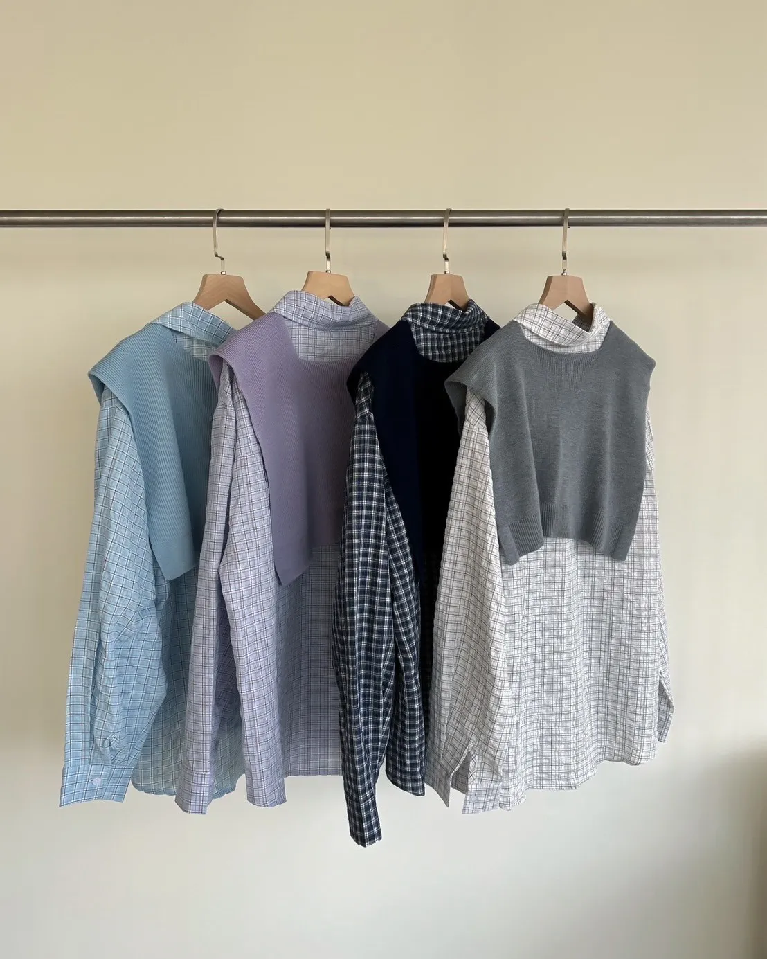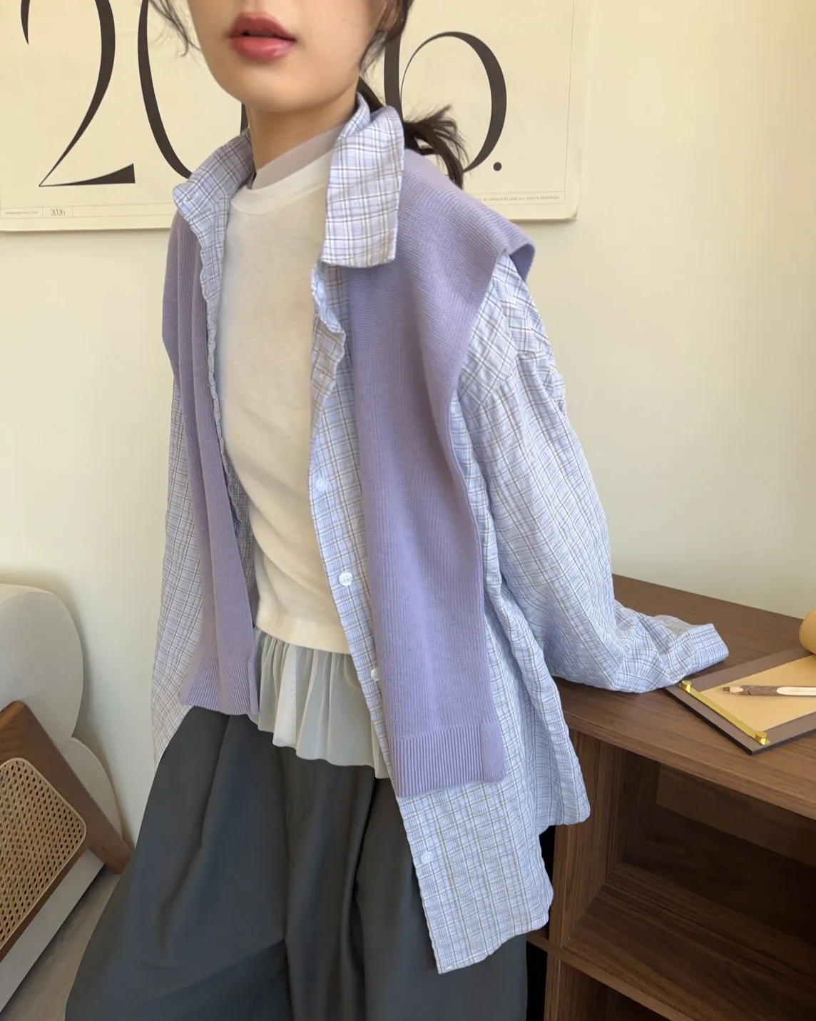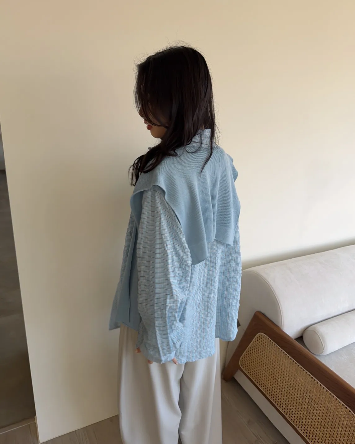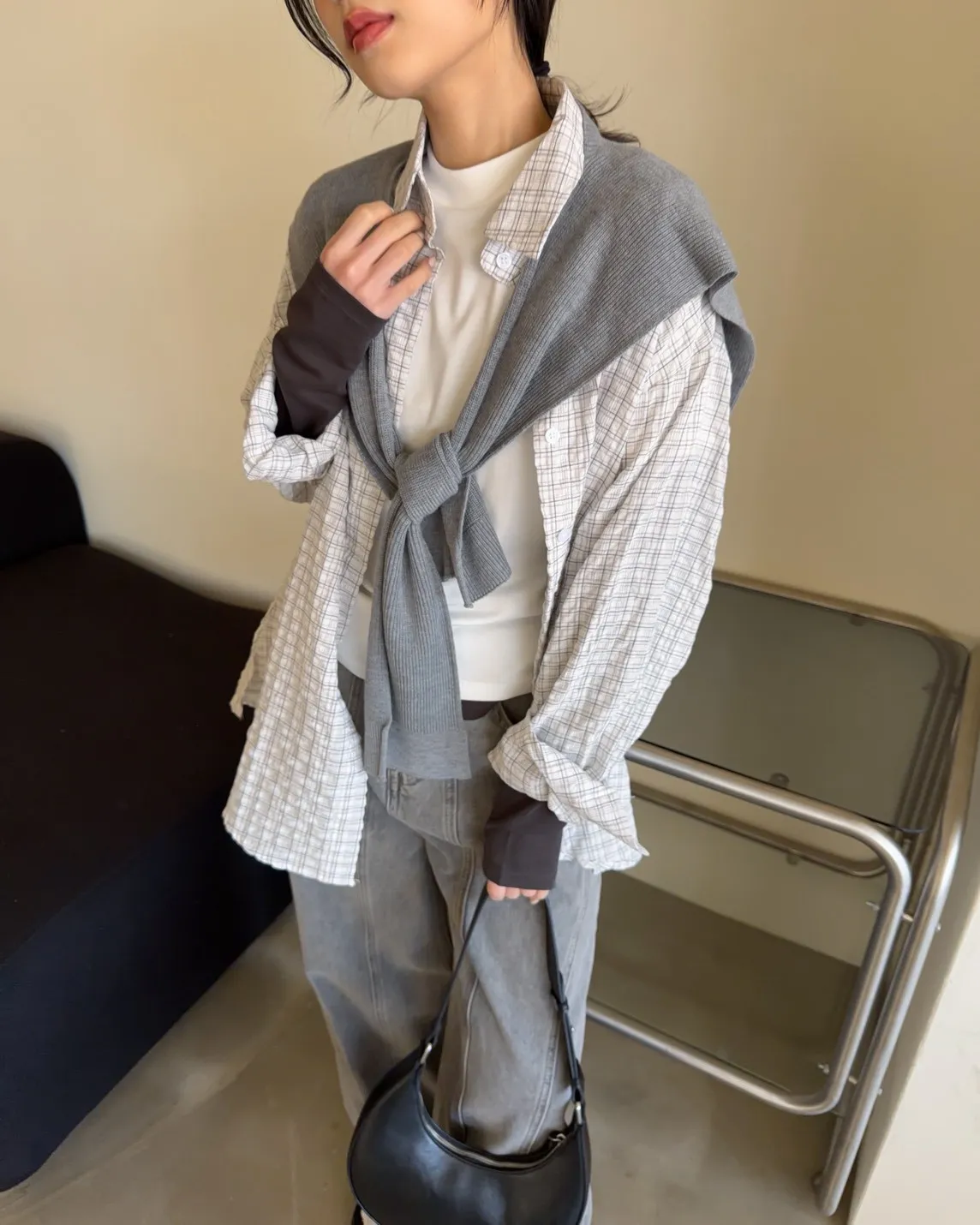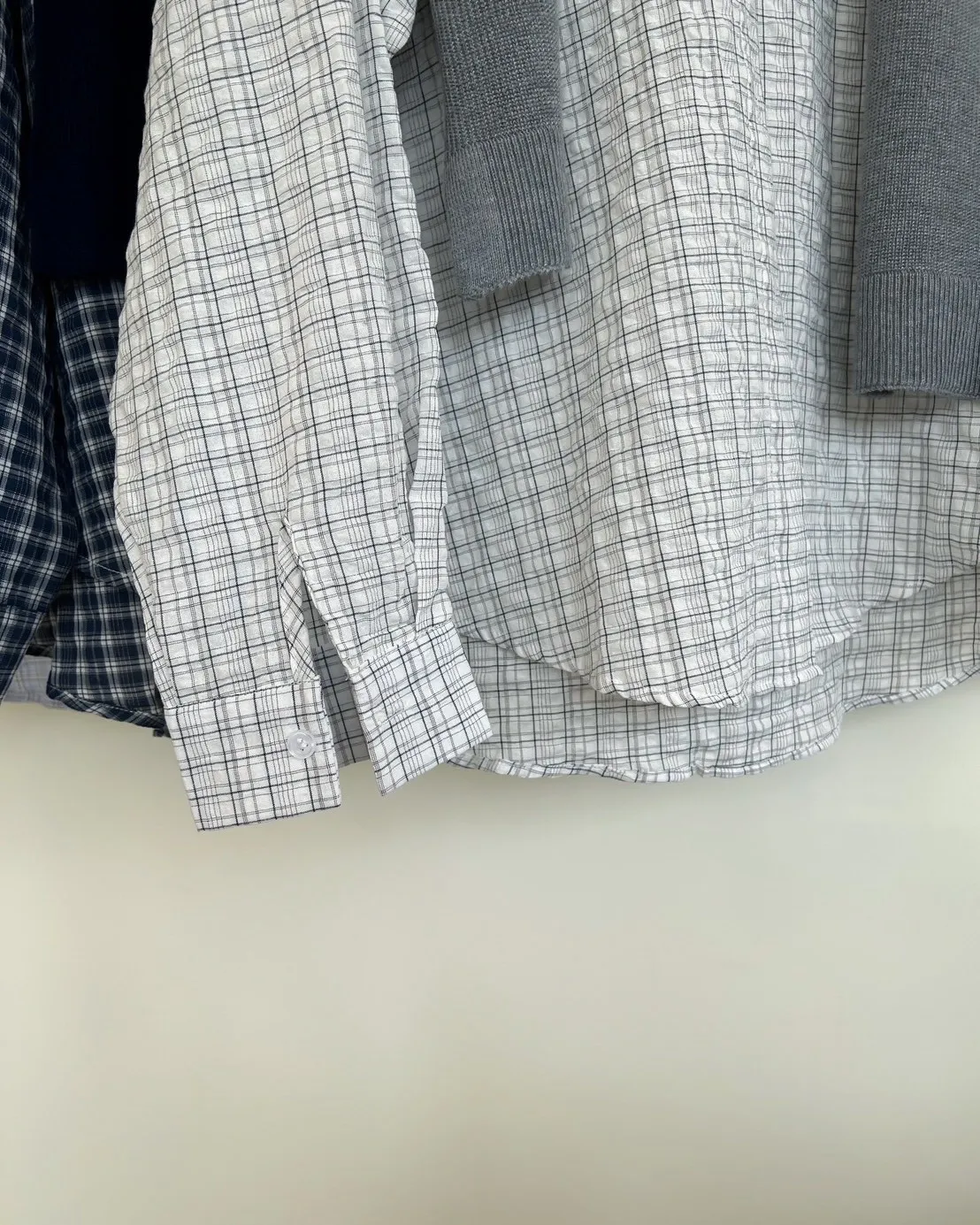 附針織披肩(可拆) 兩側開岔 前短後長 細線格紋 皺皺紋理感