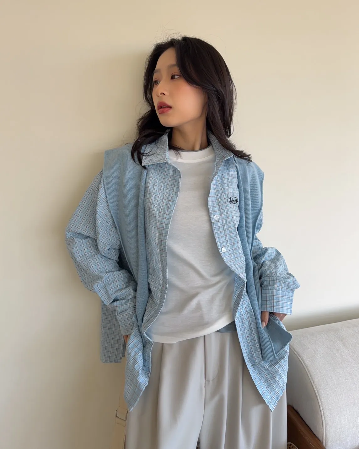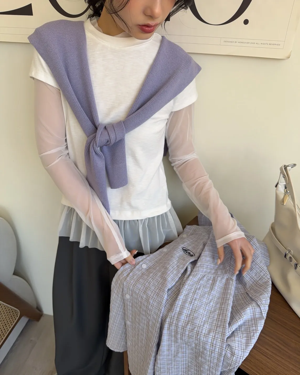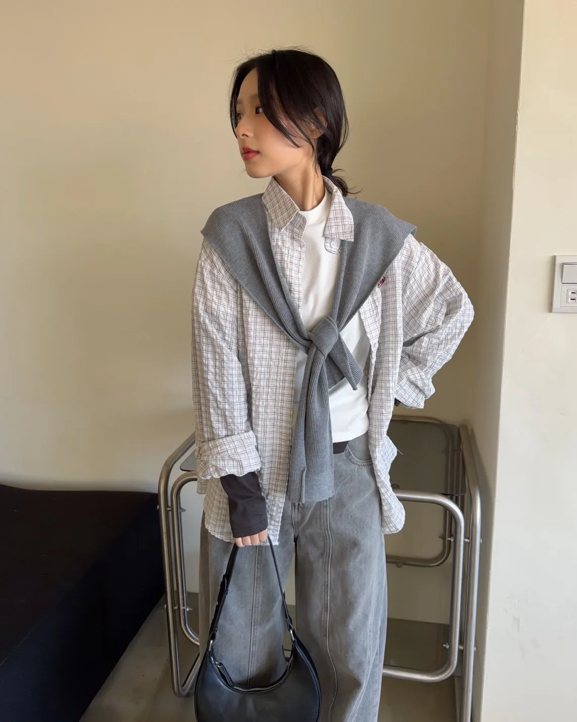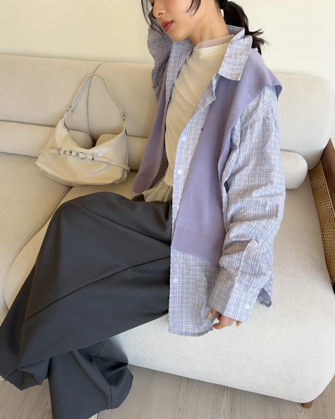 附針織披肩(可拆) 兩側開岔 前短後長 細線格紋 皺皺紋理感