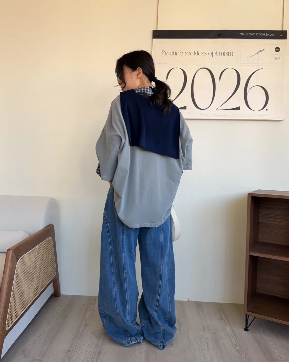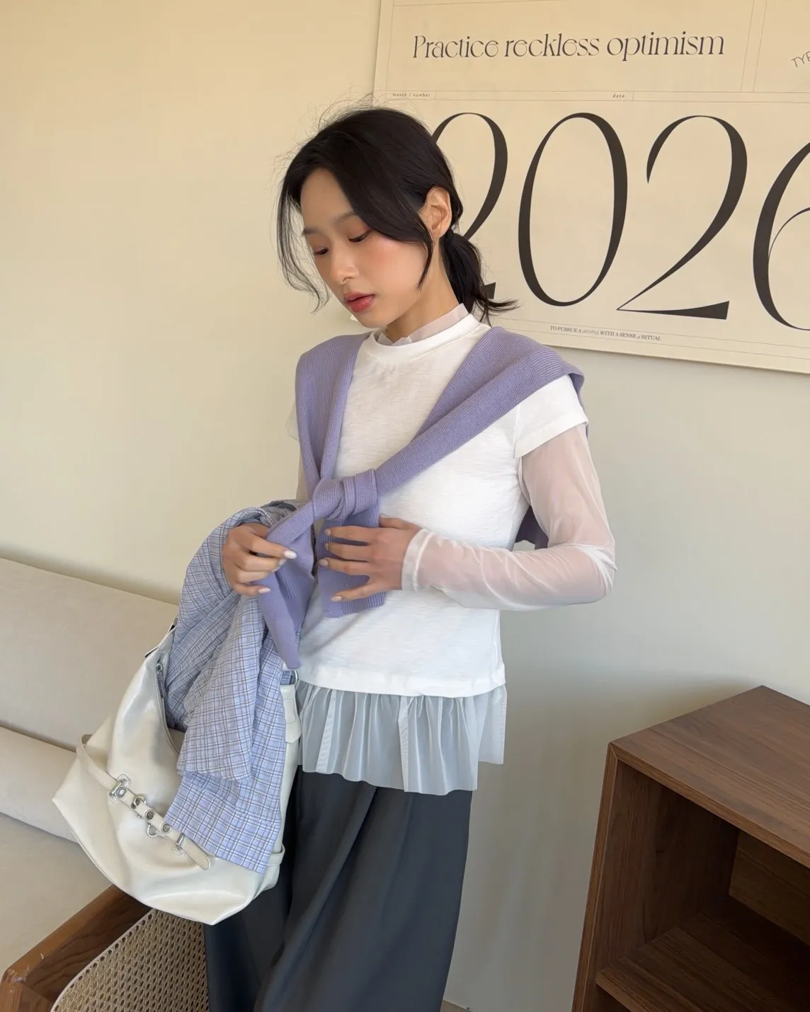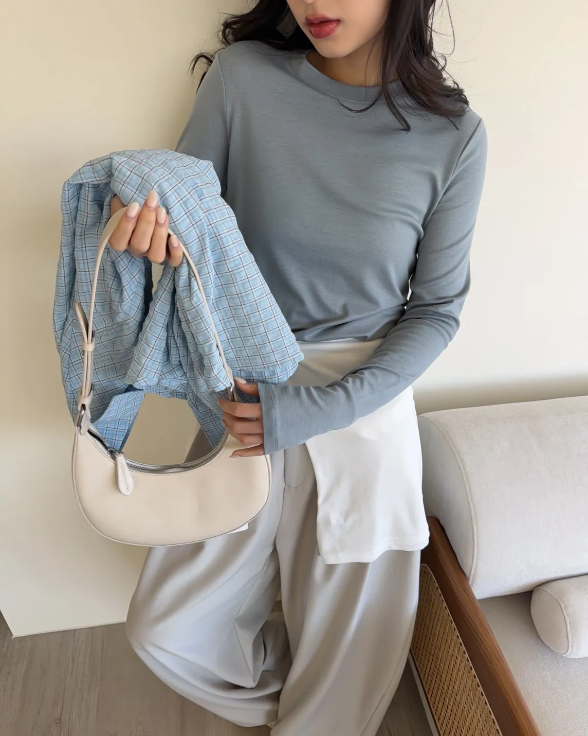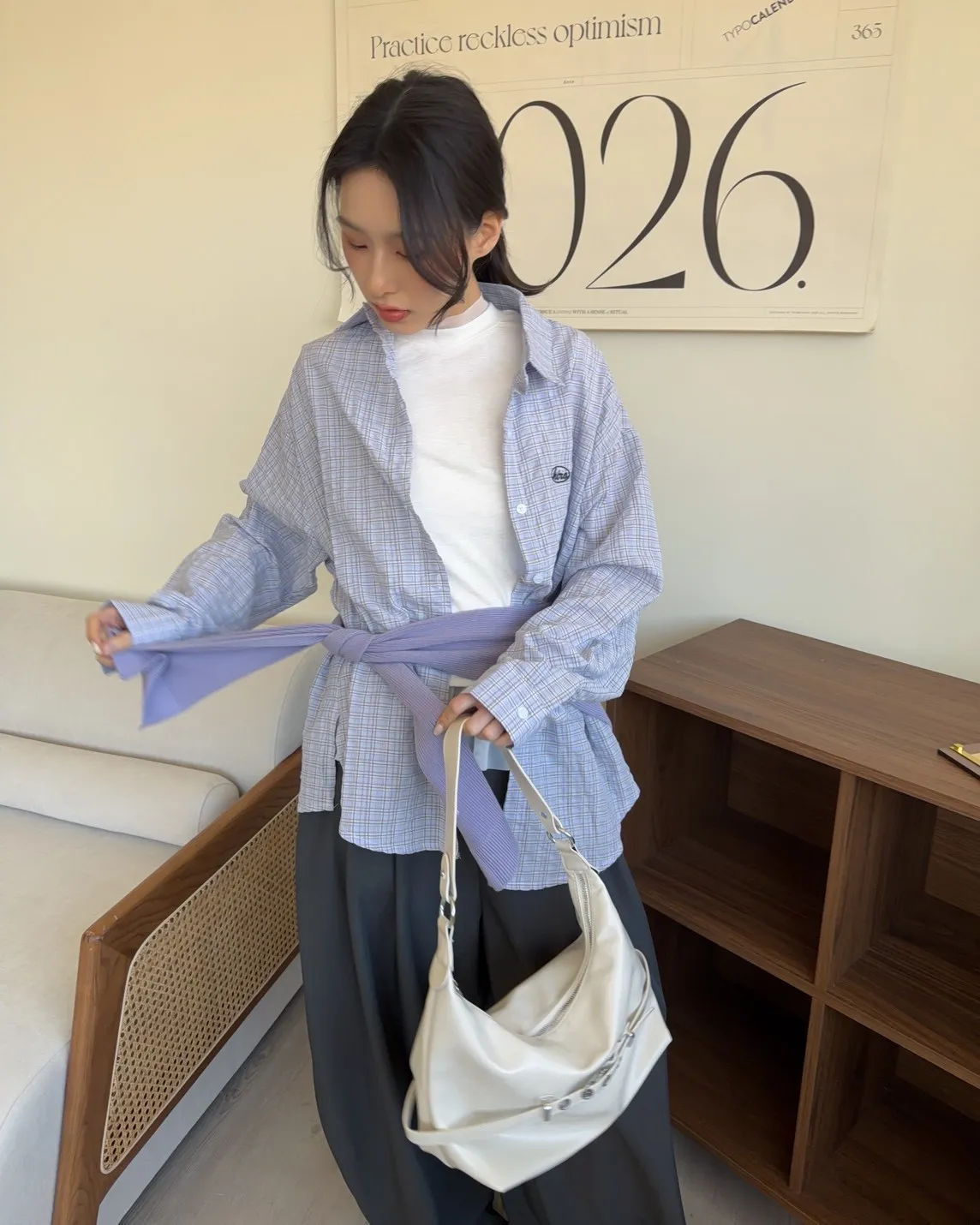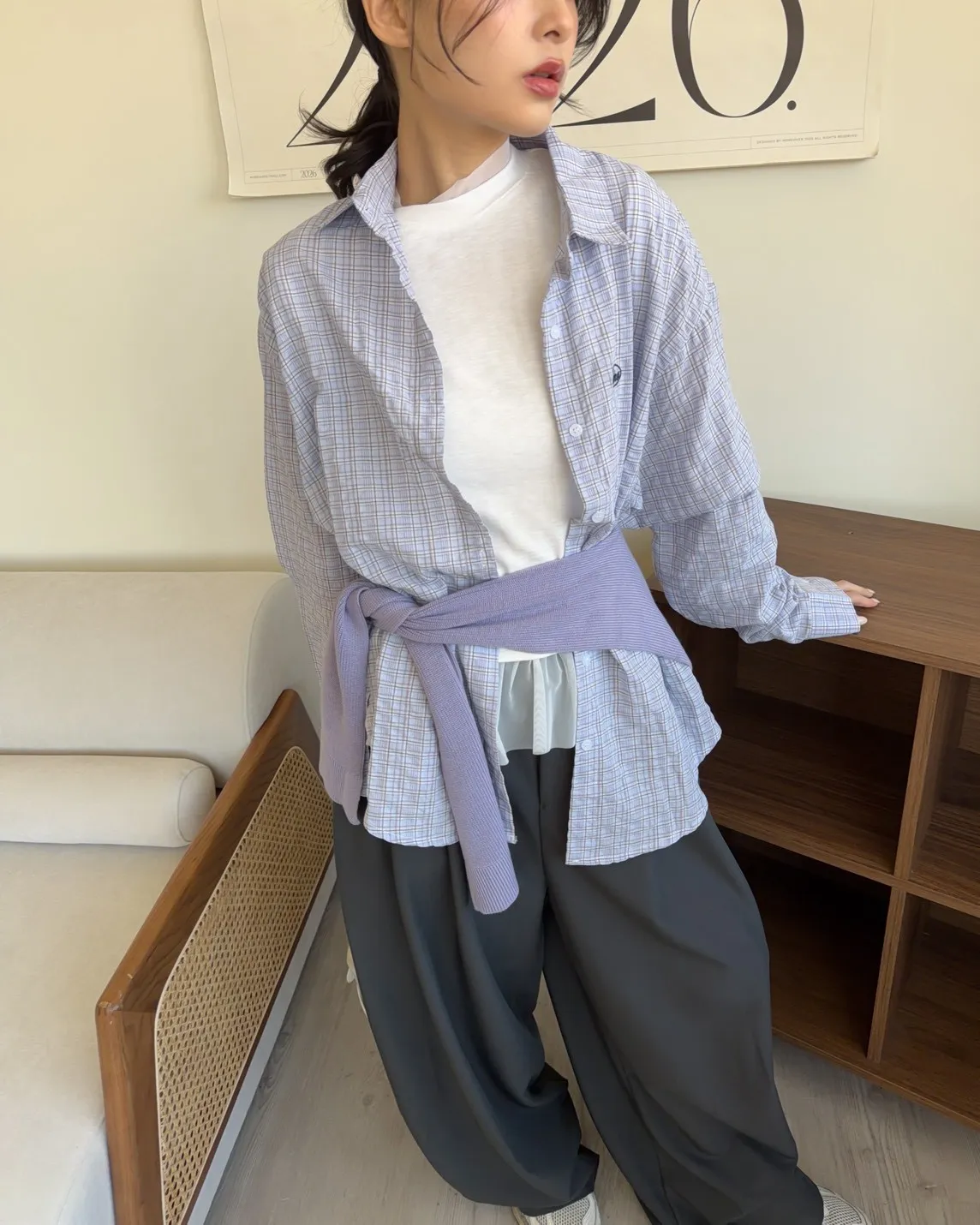 附針織披肩(可拆) 兩側開岔 前短後長 細線格紋 皺皺紋理感