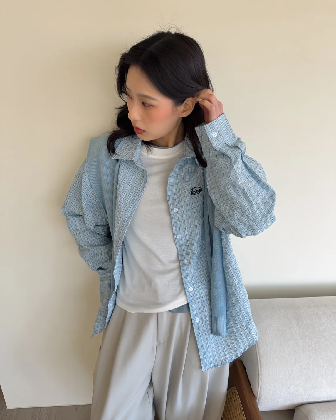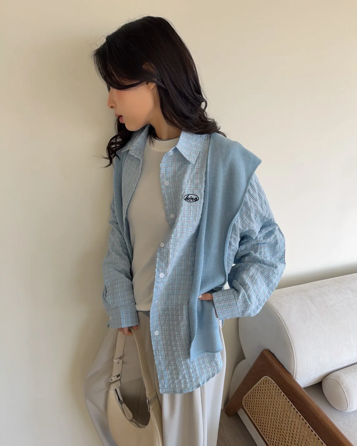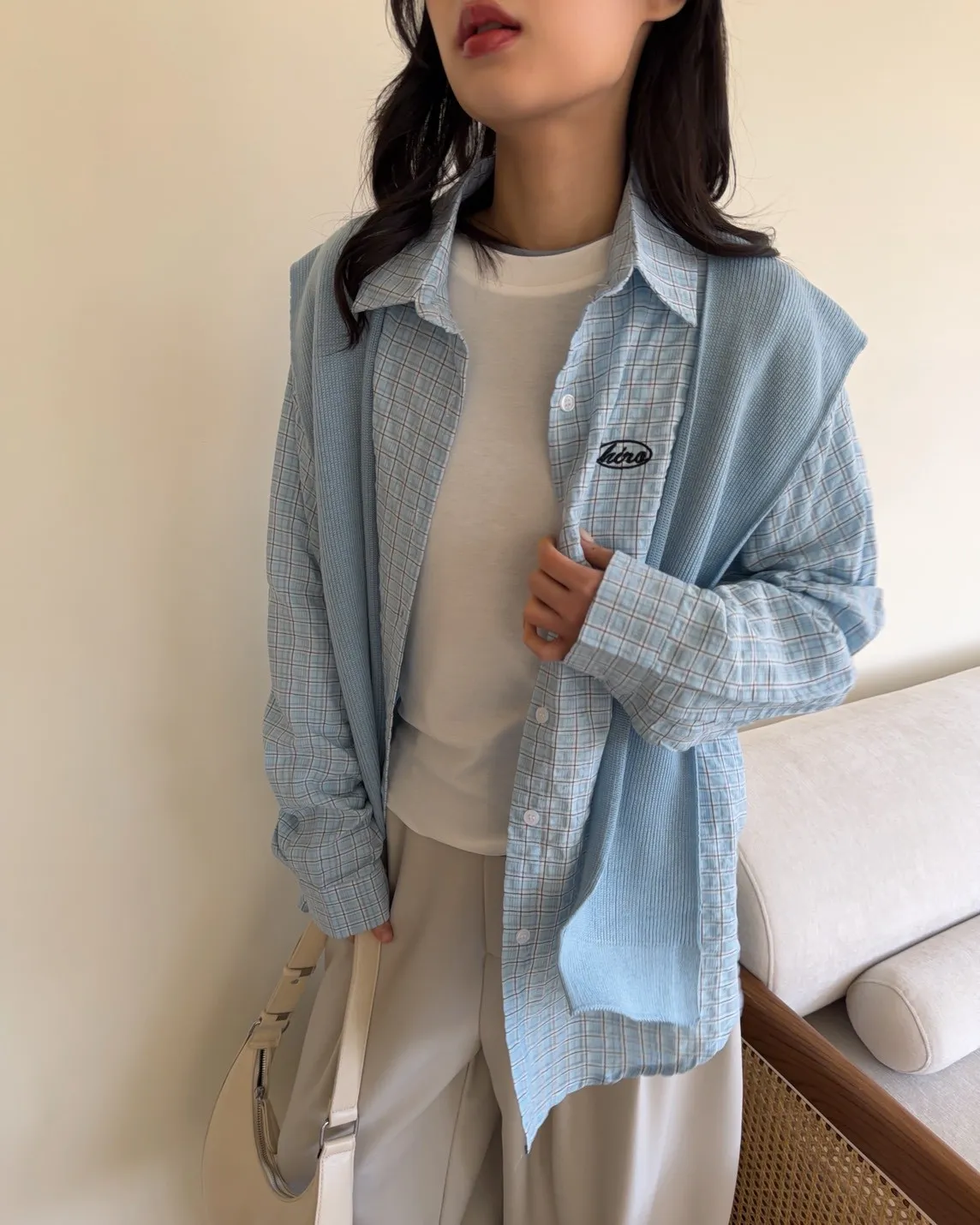 淺藍色襯衫-黑色刺繡-淺藍色披肩