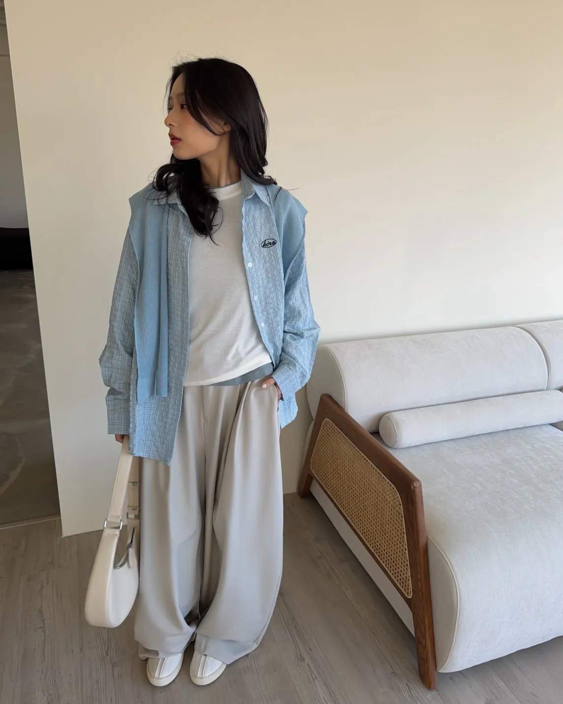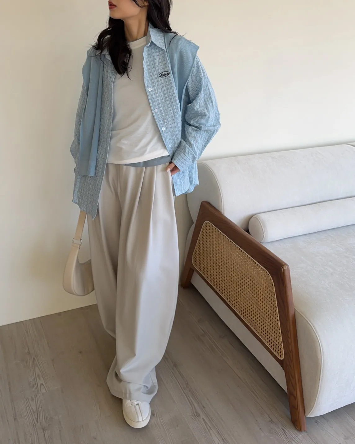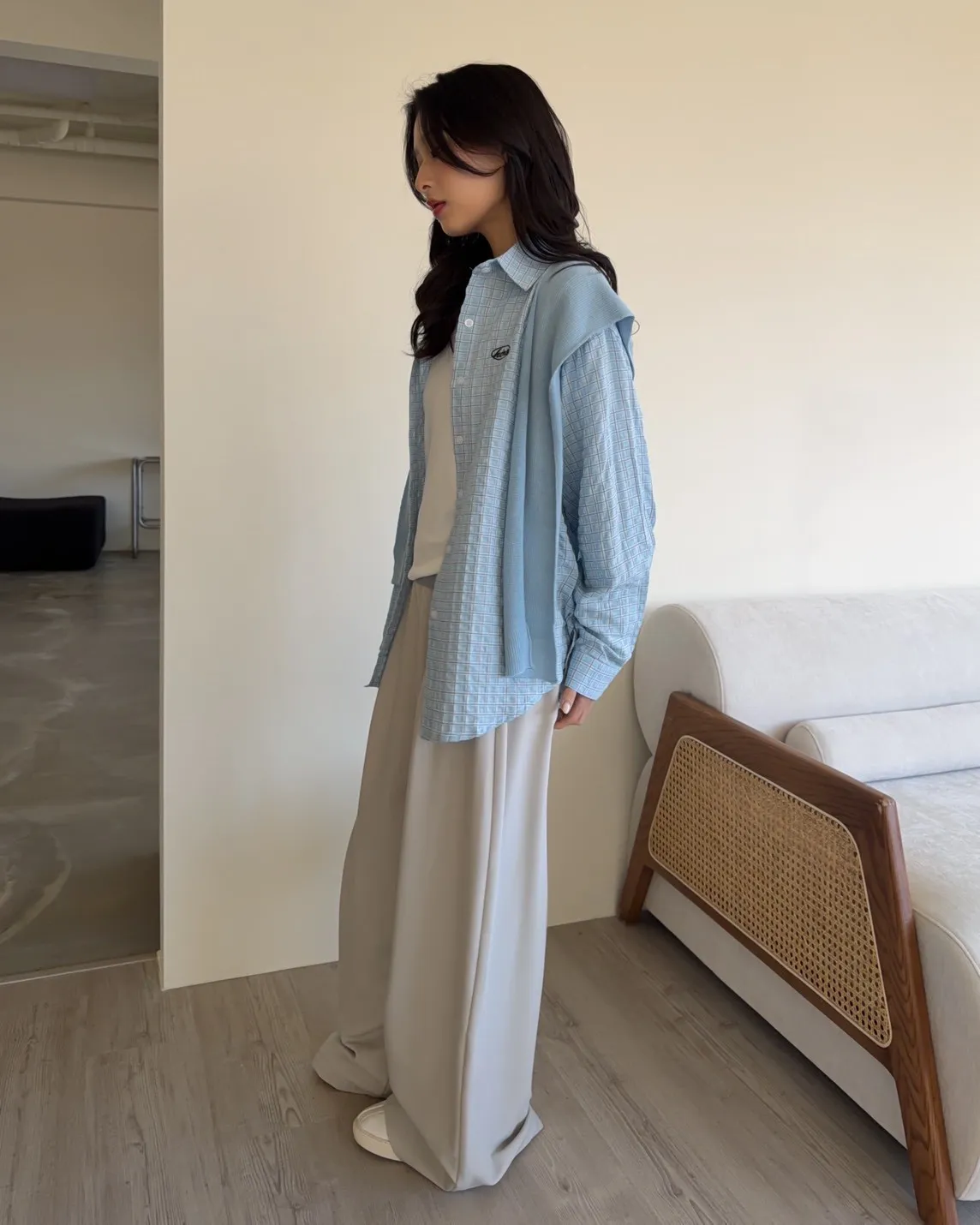 淺藍色襯衫-黑色刺繡-淺藍色披肩