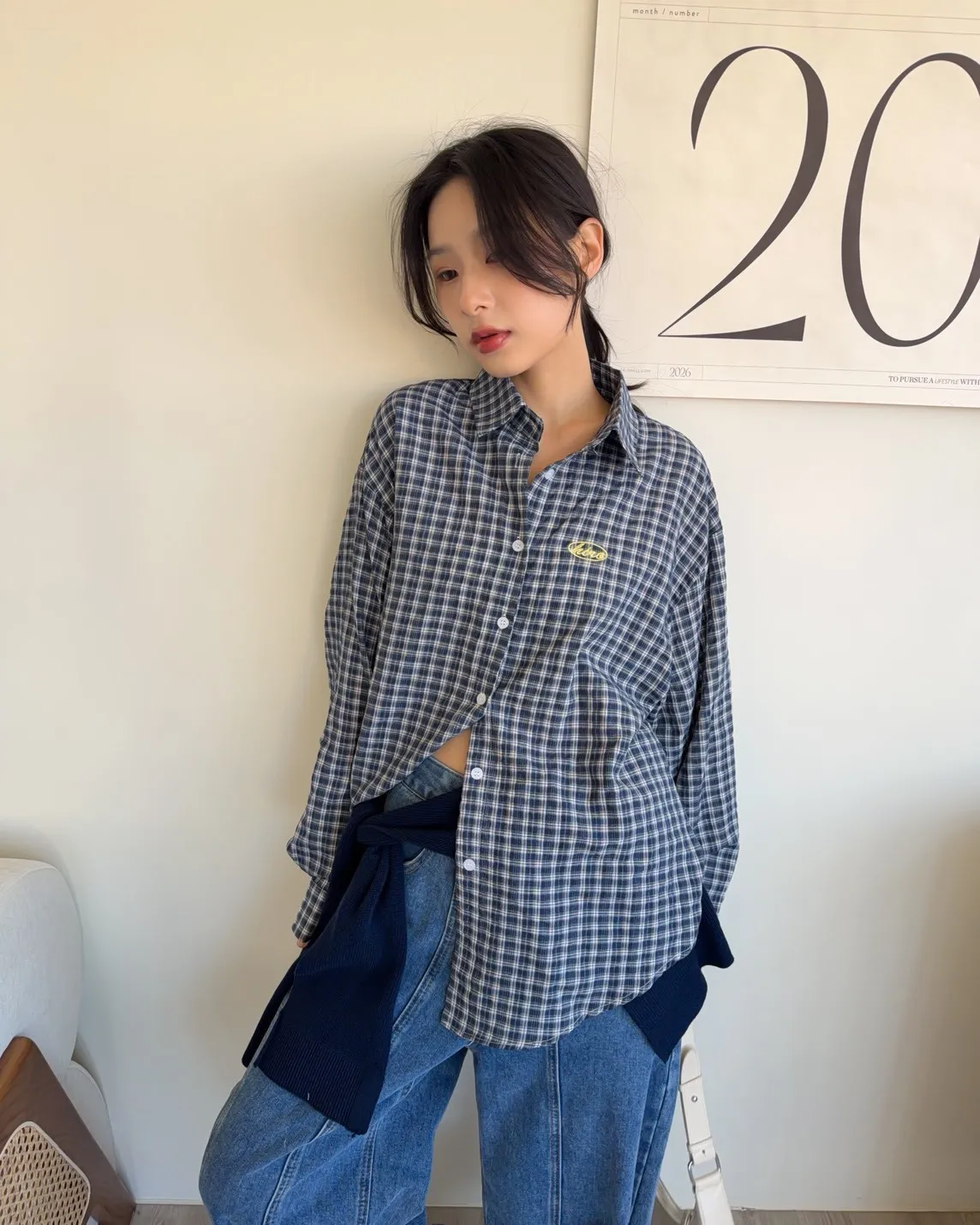 深藍色襯衫-黃色刺繡-深藍色披肩