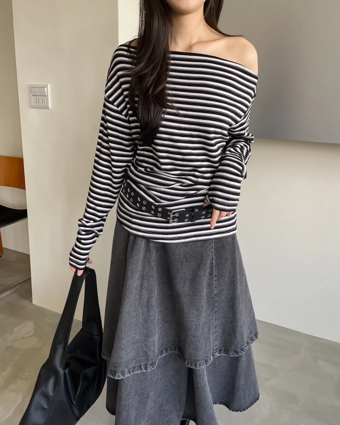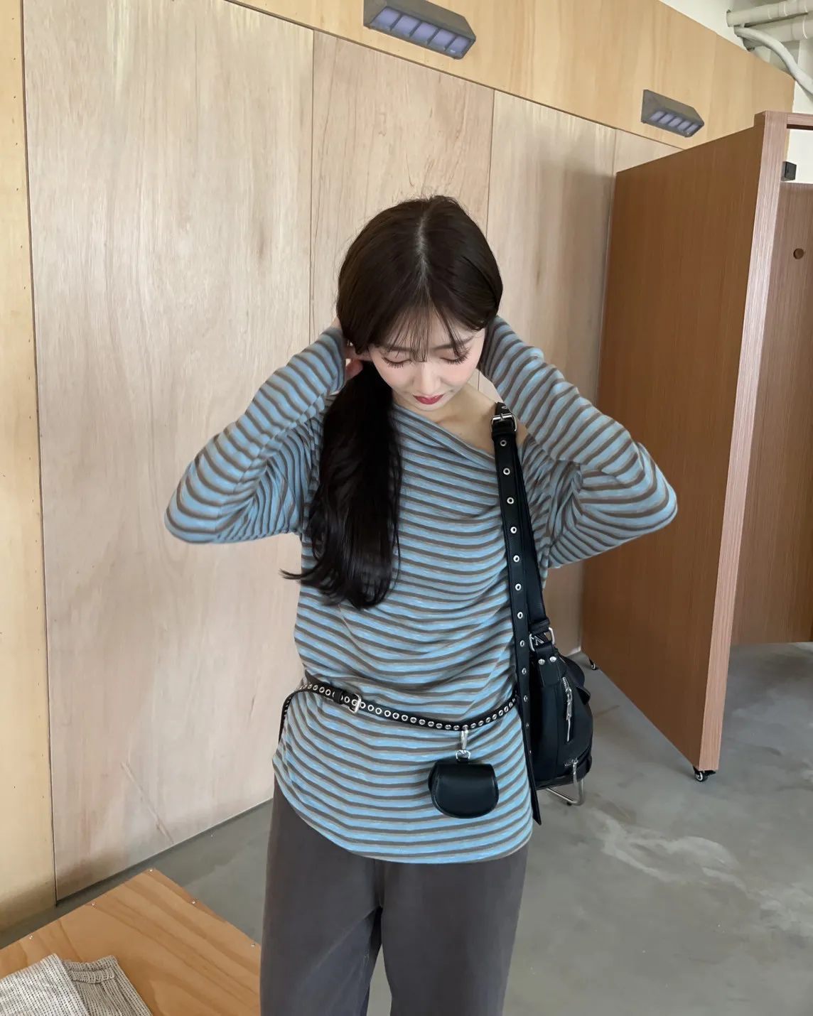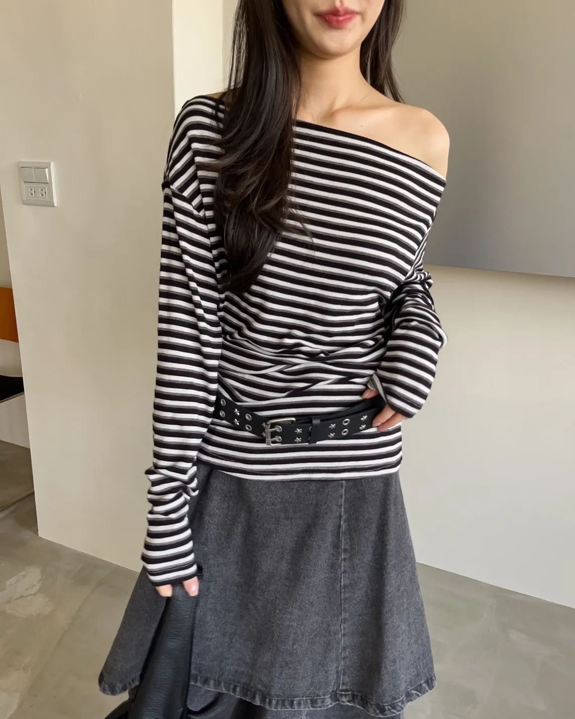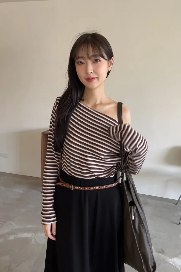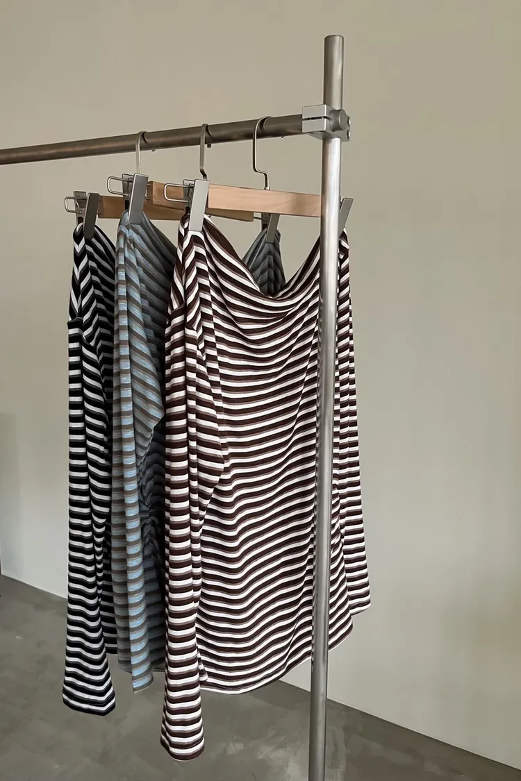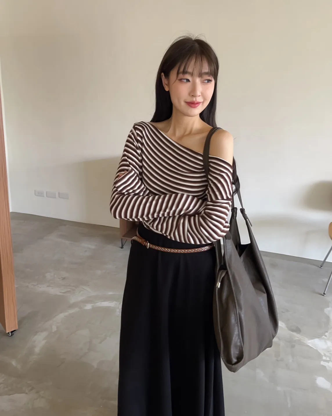V0074夾心軟糖平領縮腰條紋衣(咖啡/藍/黑)(售完不補)