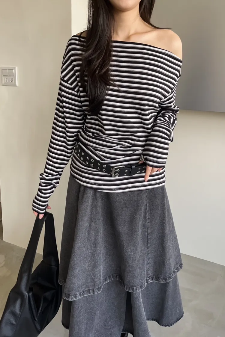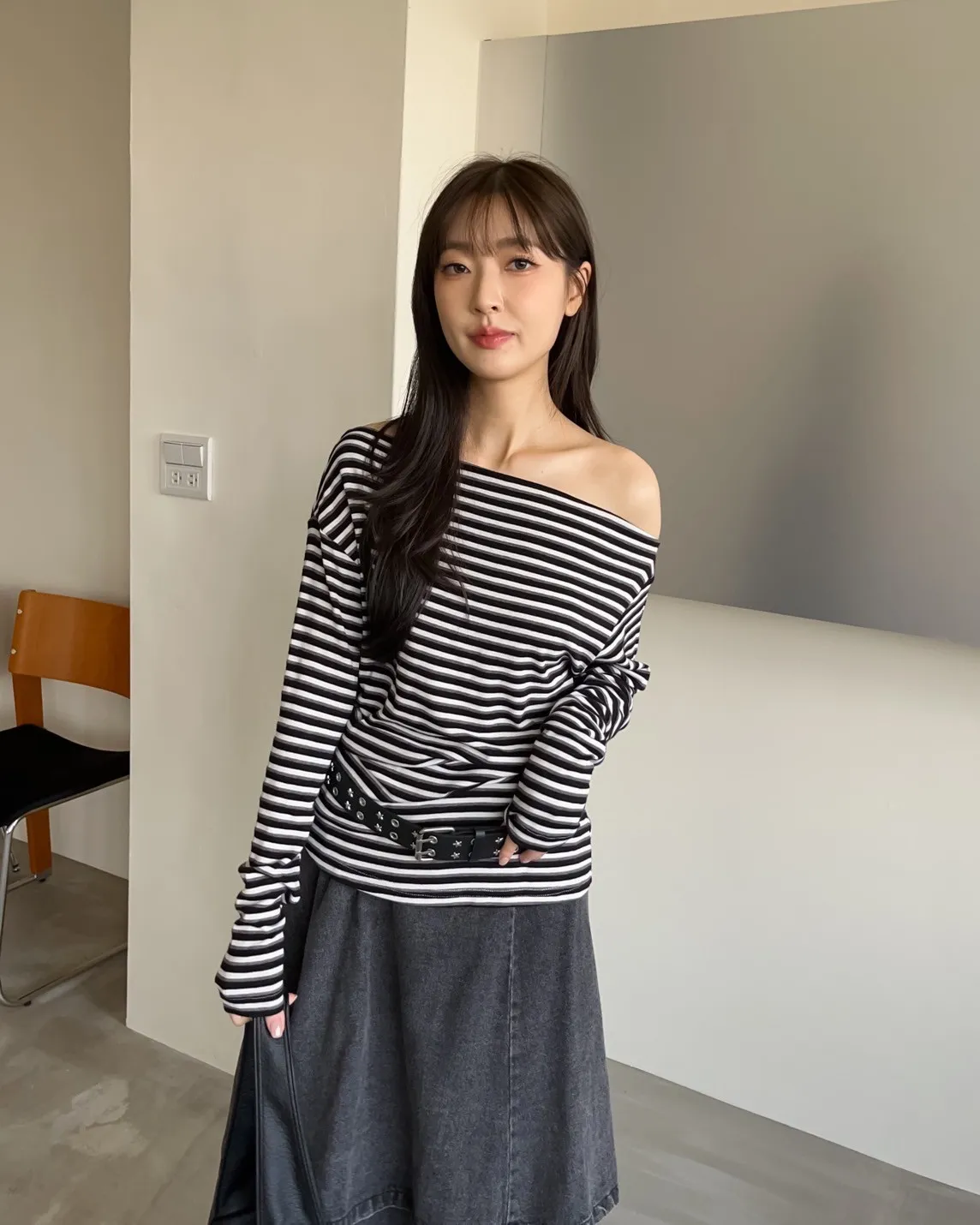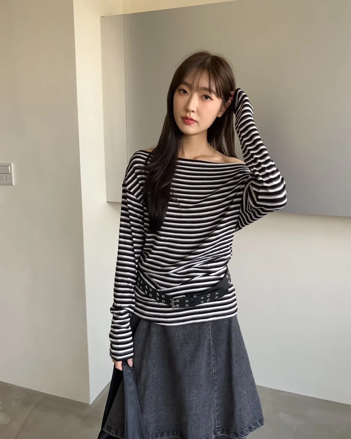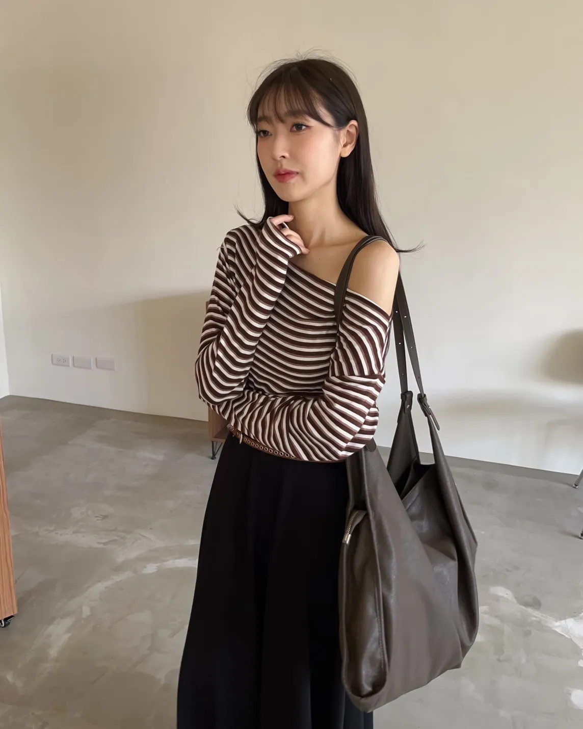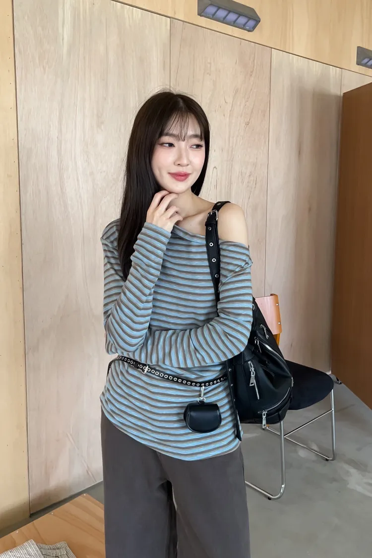 V0074夾心軟糖平領縮腰條紋衣(咖啡/藍/黑)(售完不補)