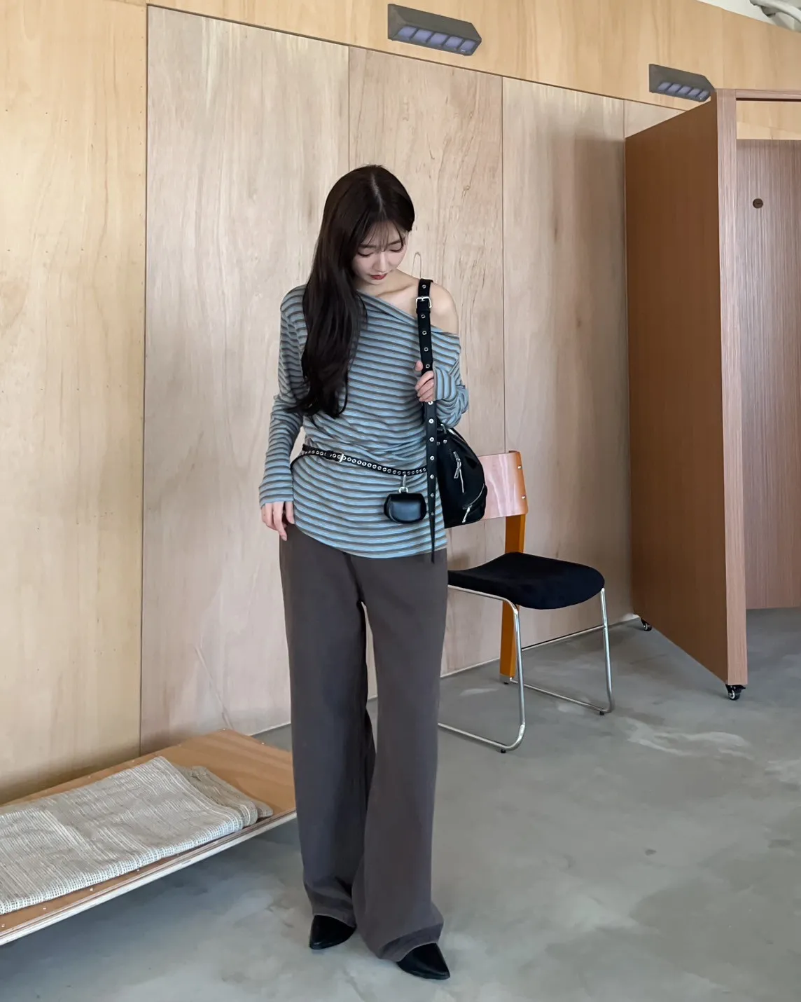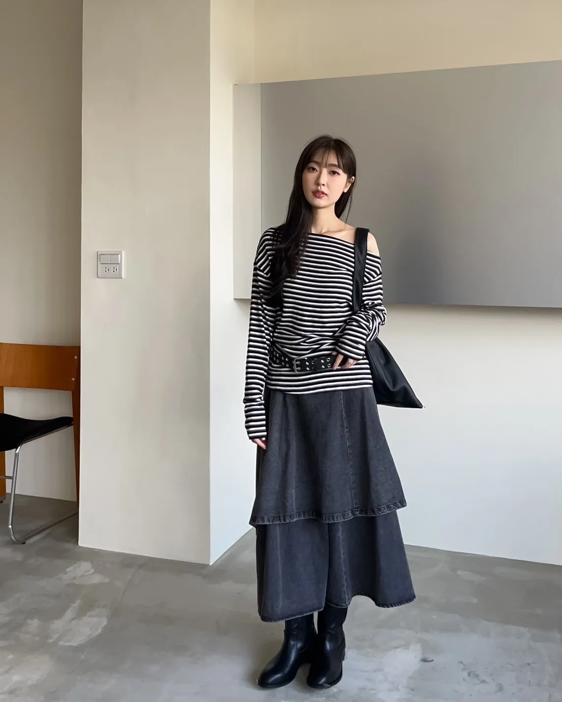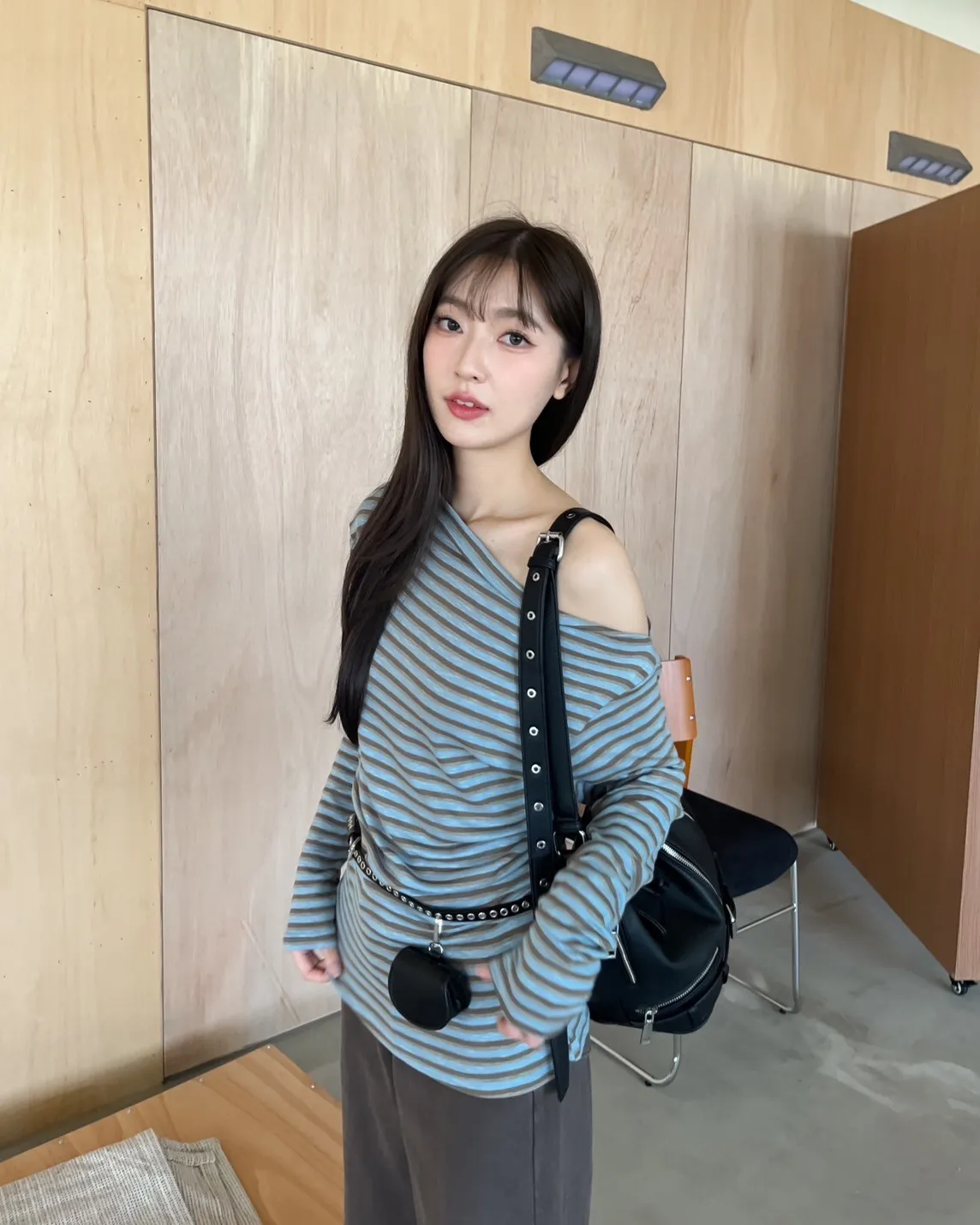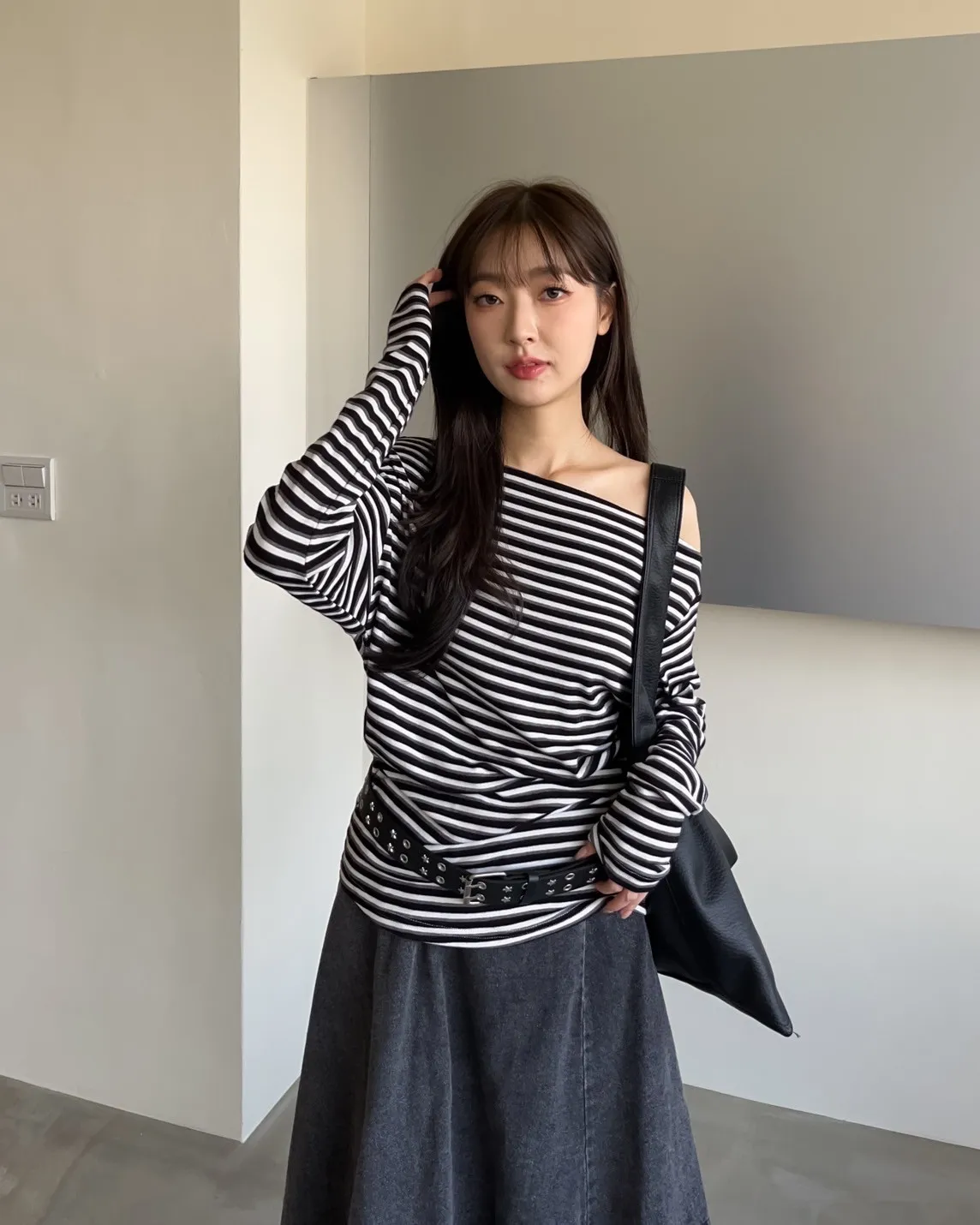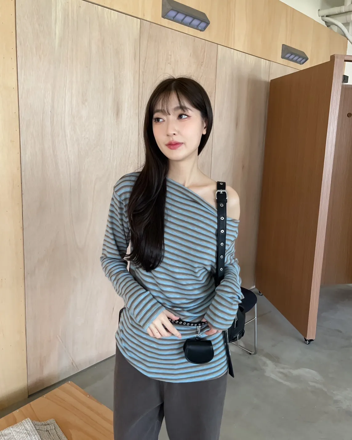 V0074夾心軟糖平領縮腰條紋衣(咖啡/藍/黑)(售完不補)