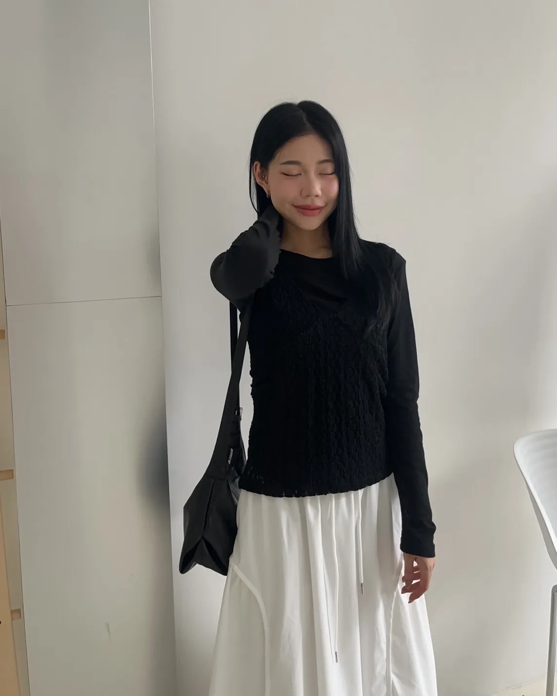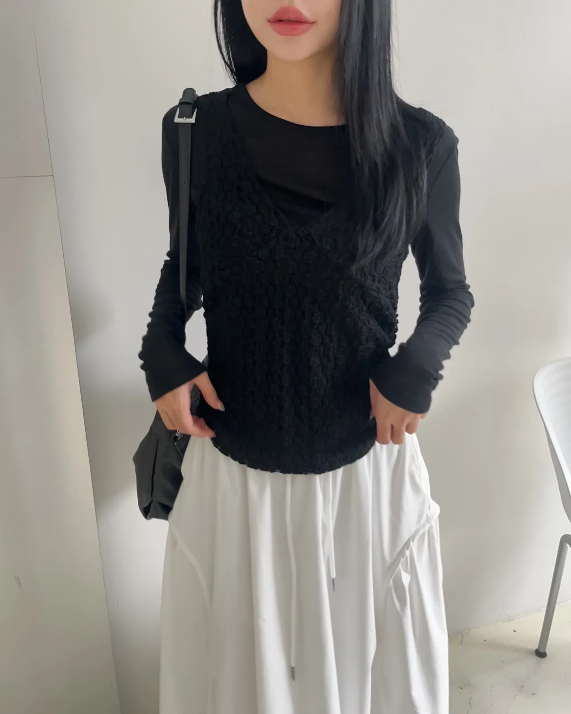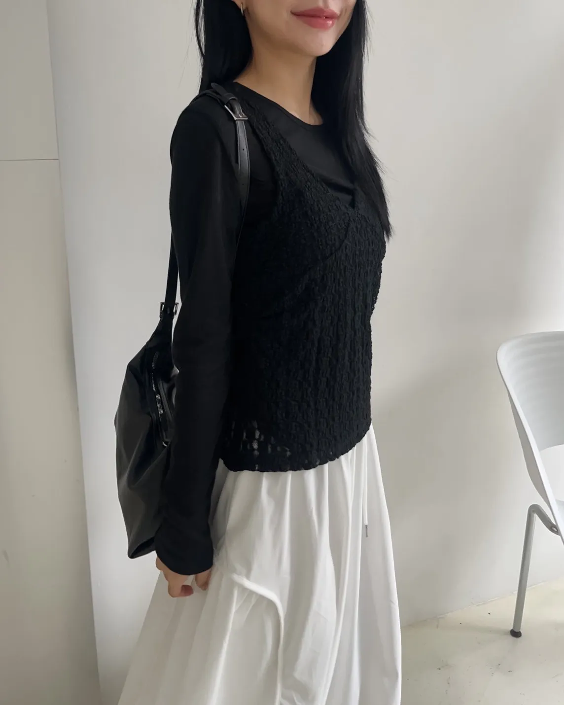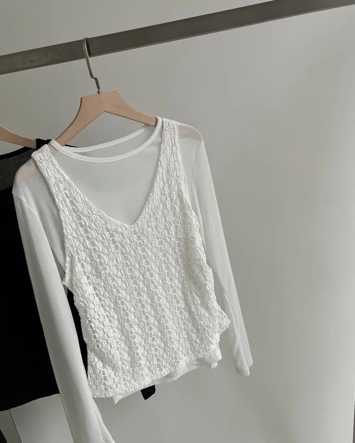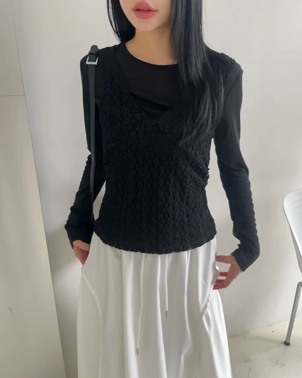U0040(SET)法式蕾絲抓腰背心+薄棉長袖(白/黑)