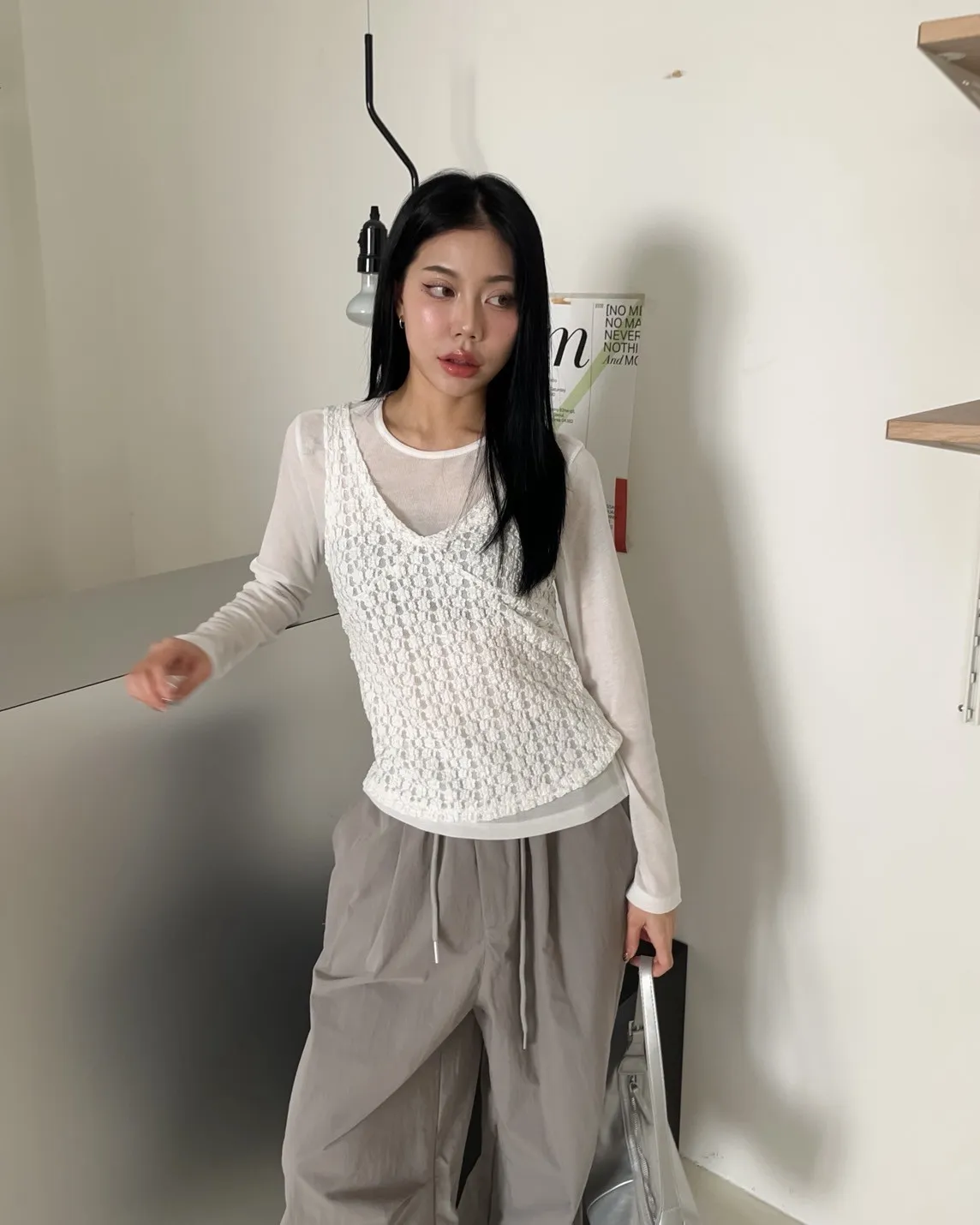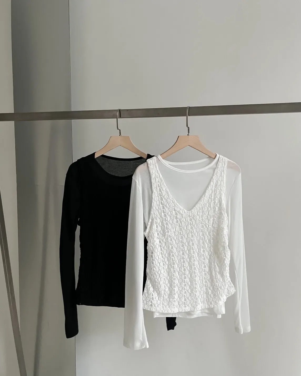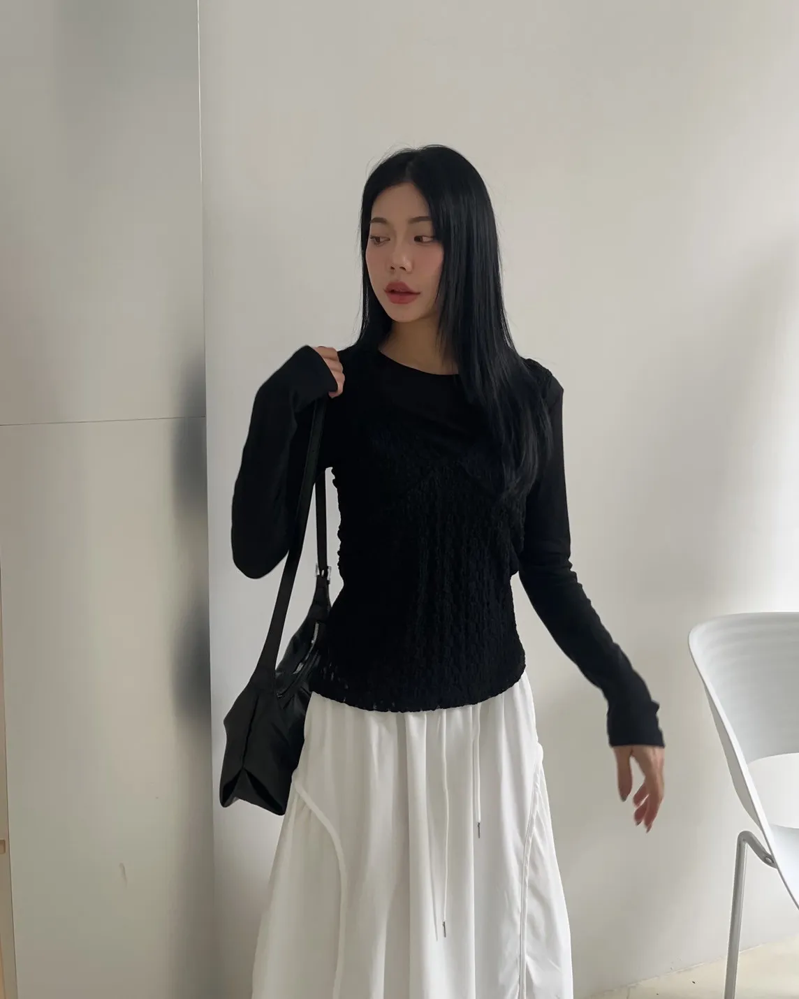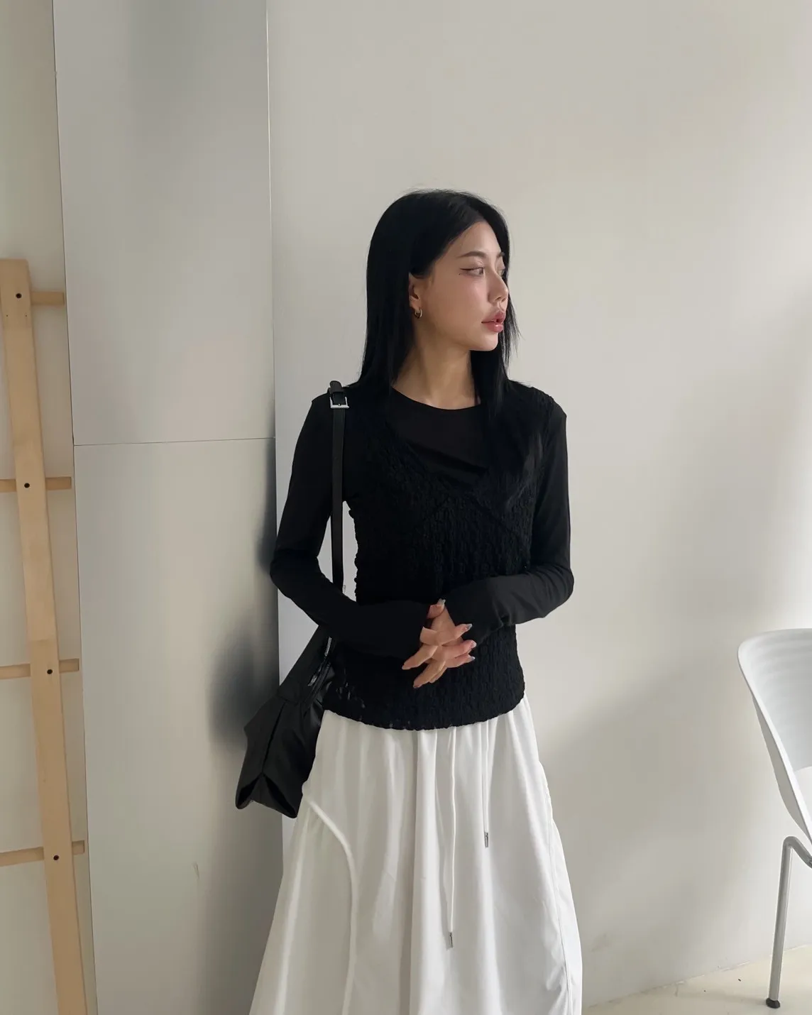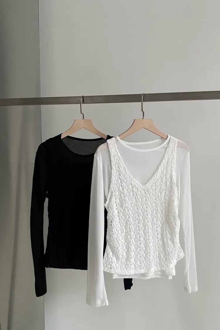 U0040(SET)法式蕾絲抓腰背心+薄棉長袖(白/黑)