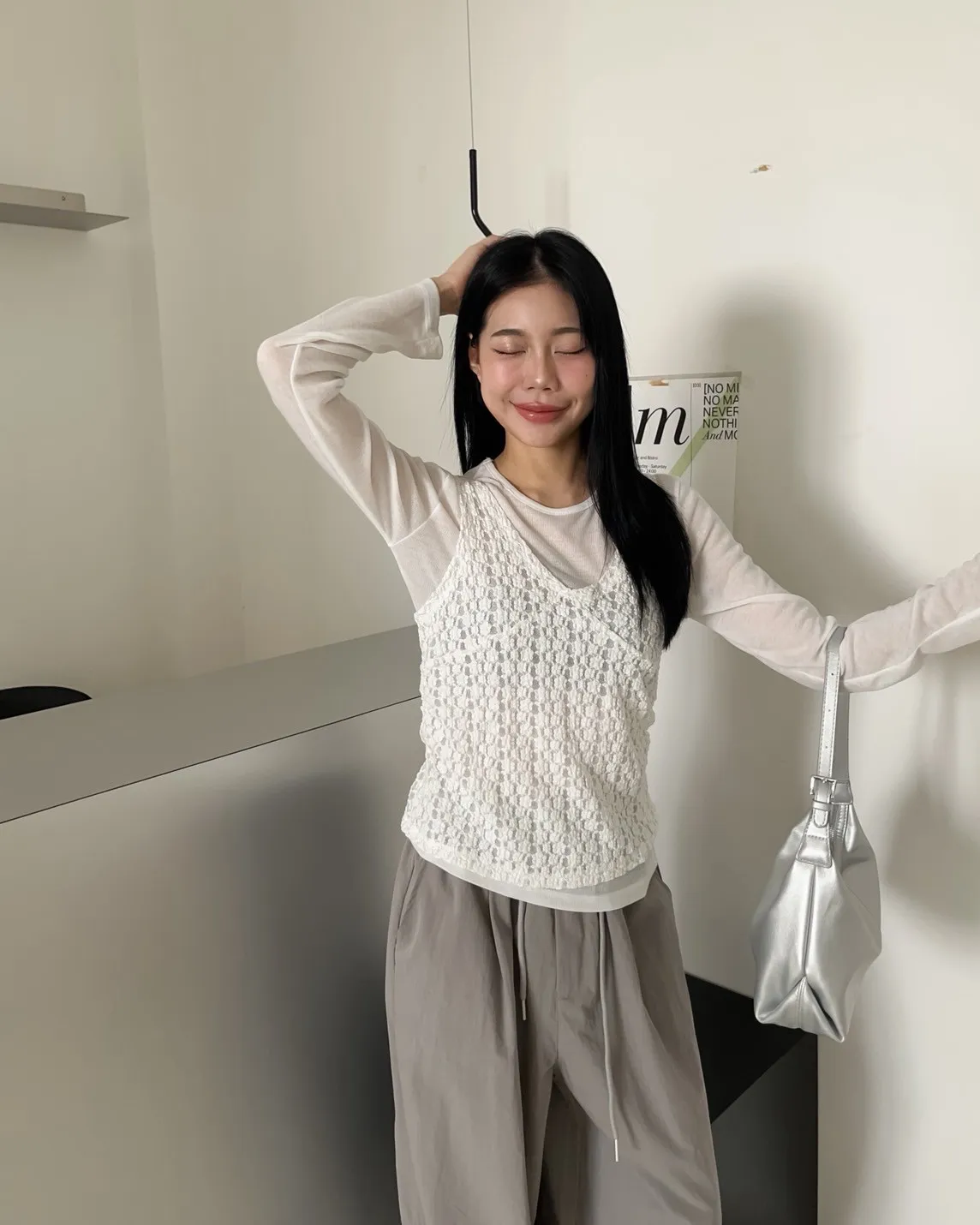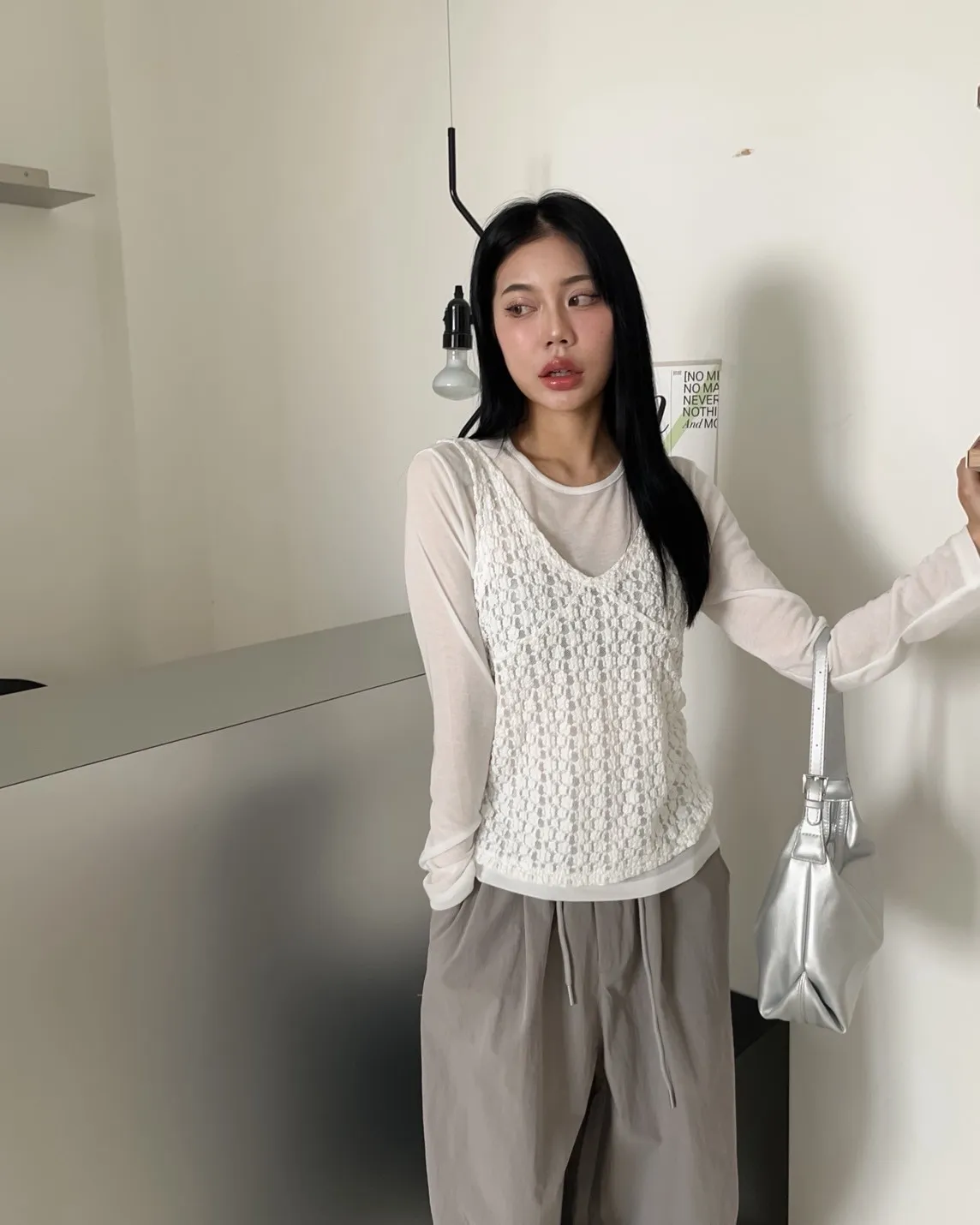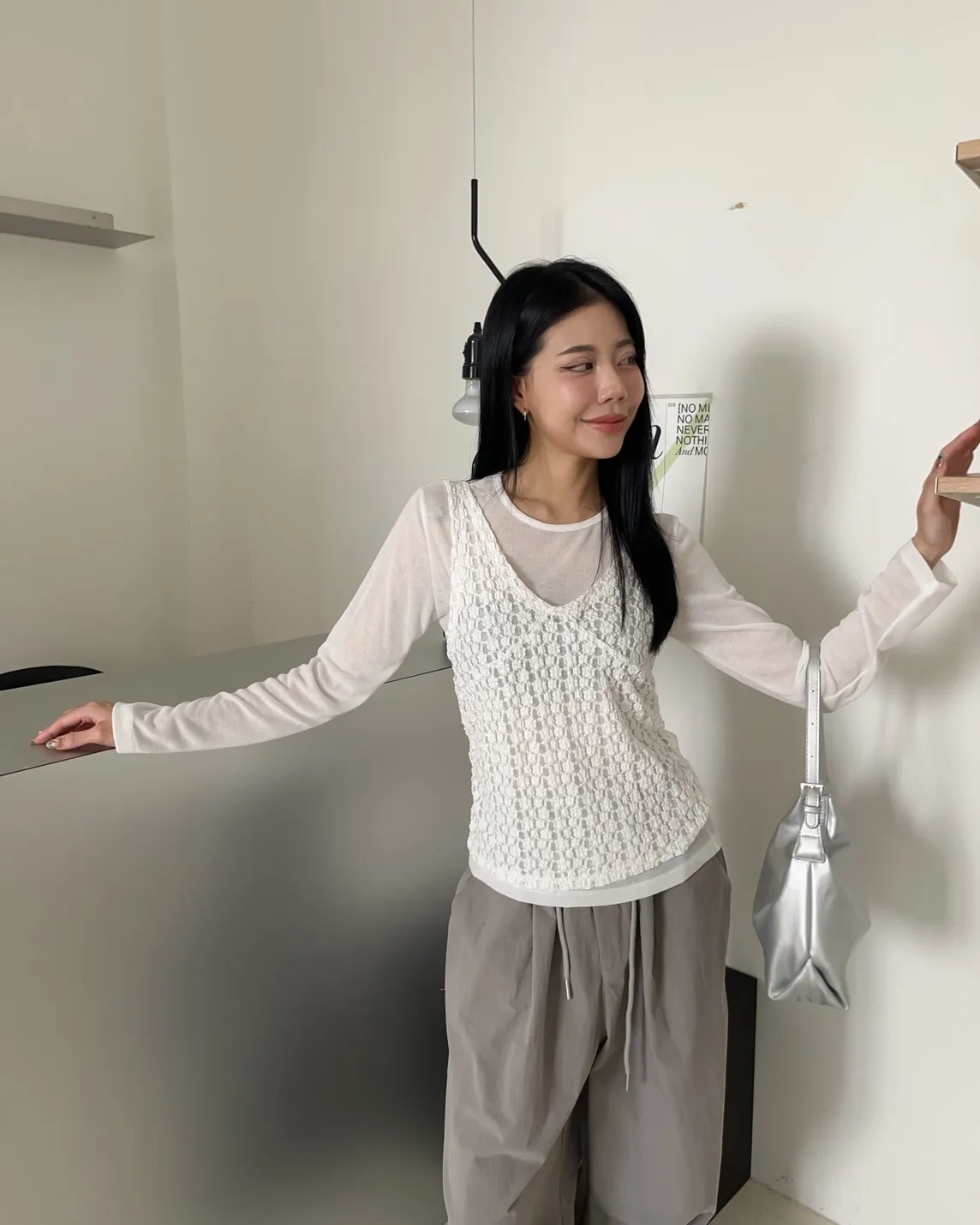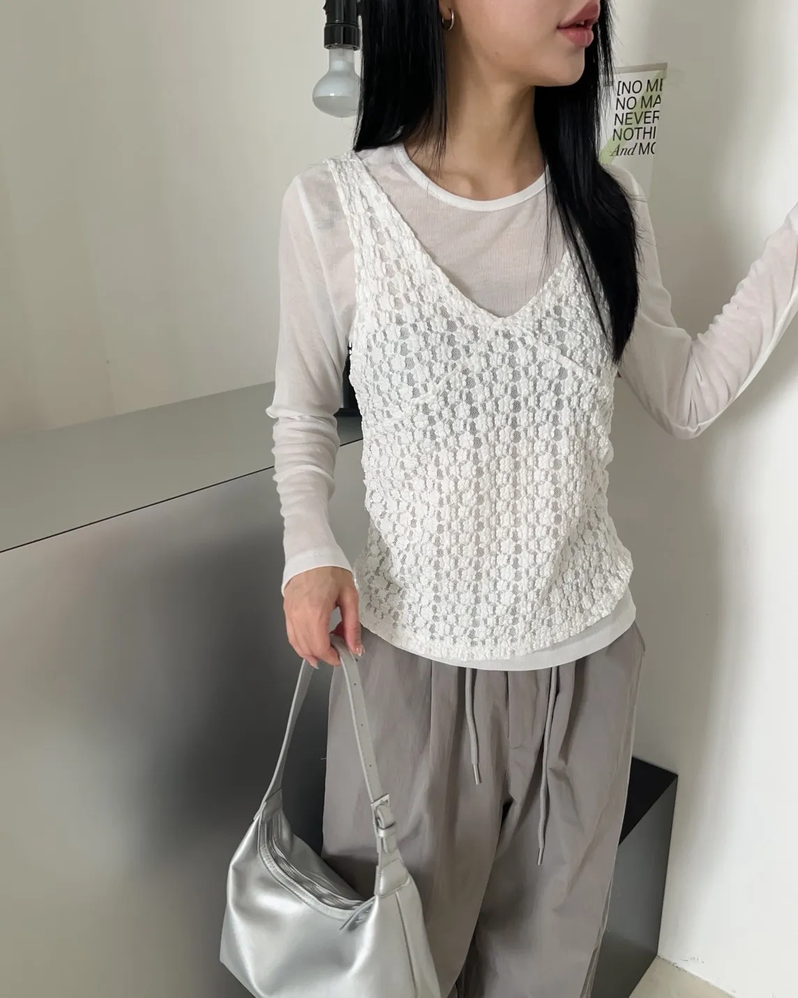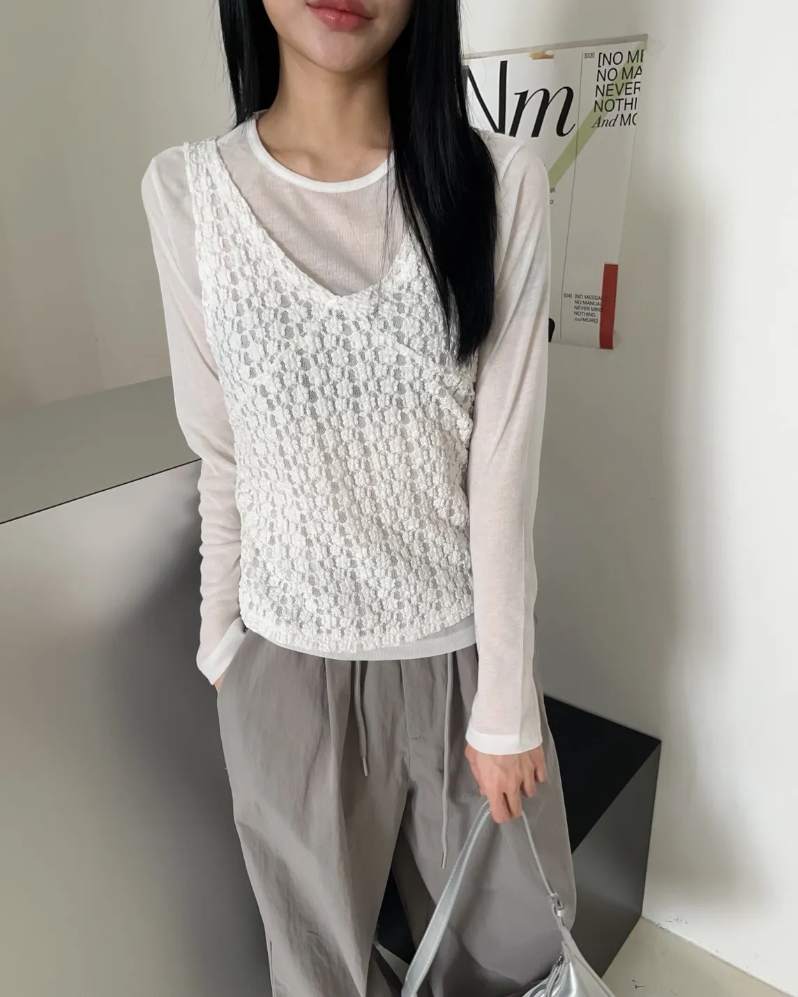 U0040(SET)法式蕾絲抓腰背心+薄棉長袖(白/黑)