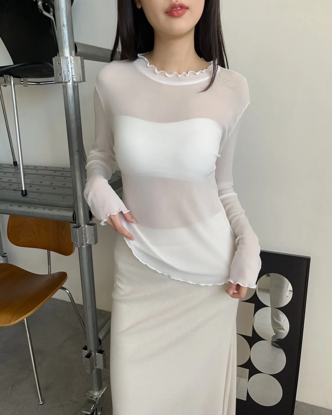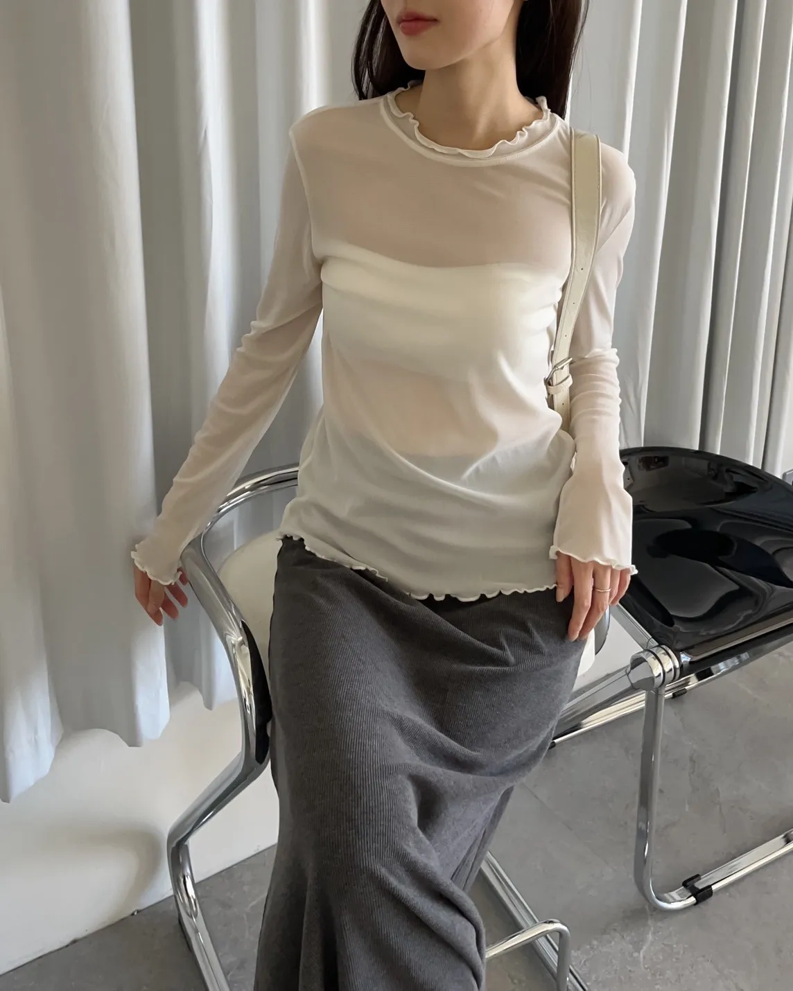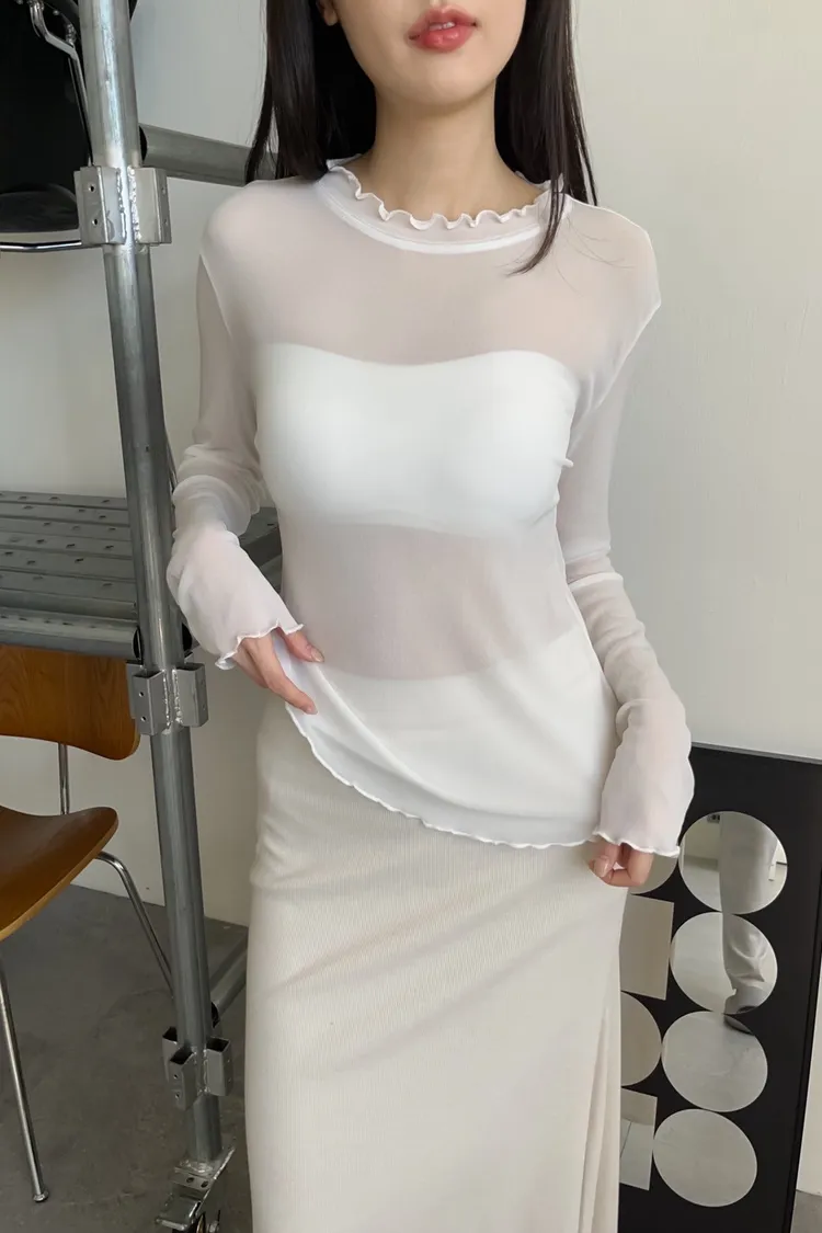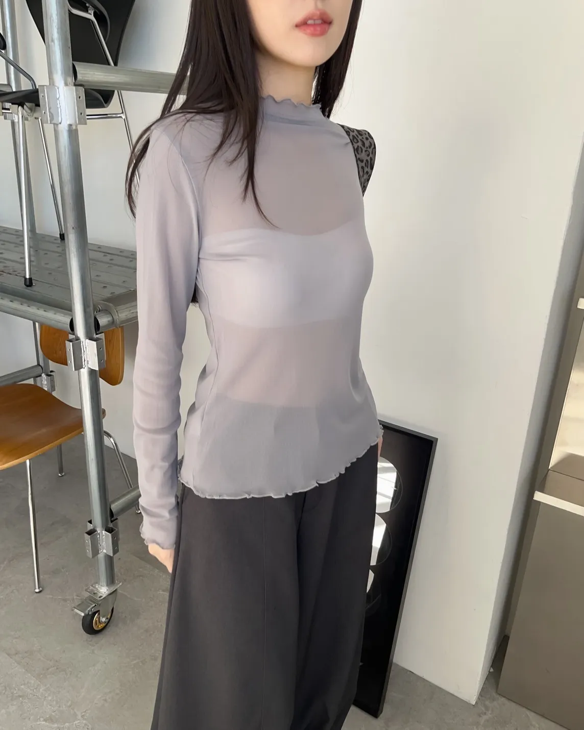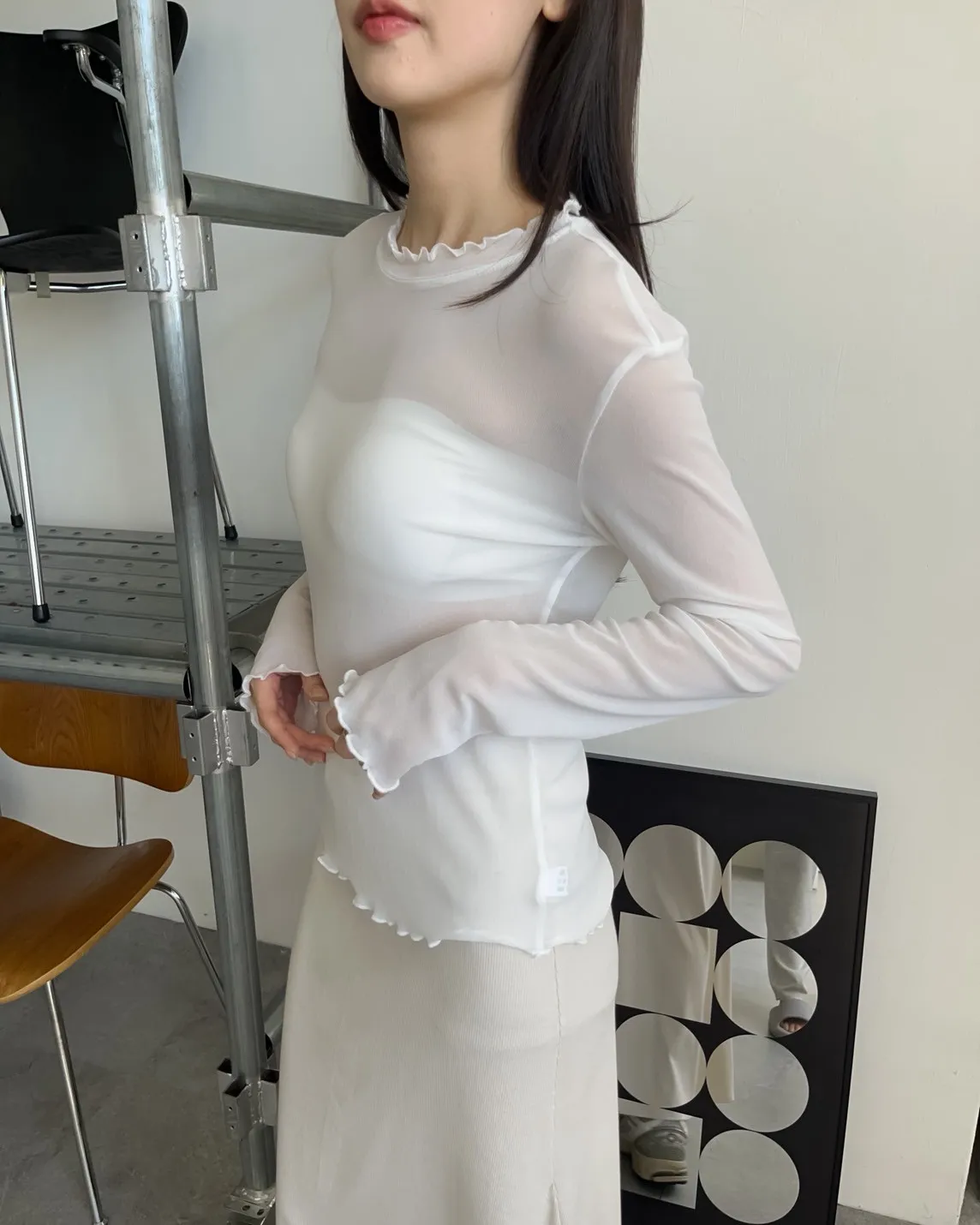 U0070(七色)木耳邊透膚上衣(白/米/咖啡/藍綠/淺灰/深灰/黑)