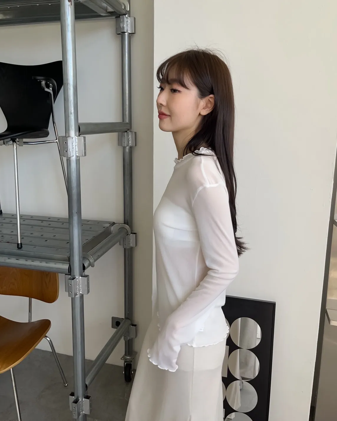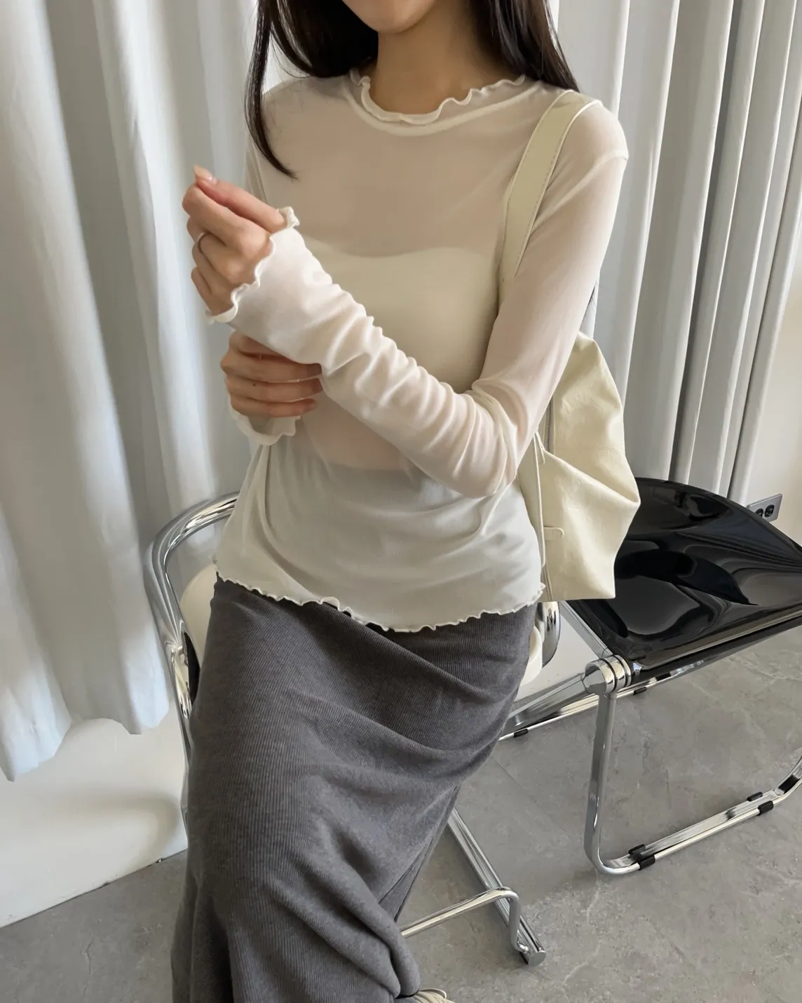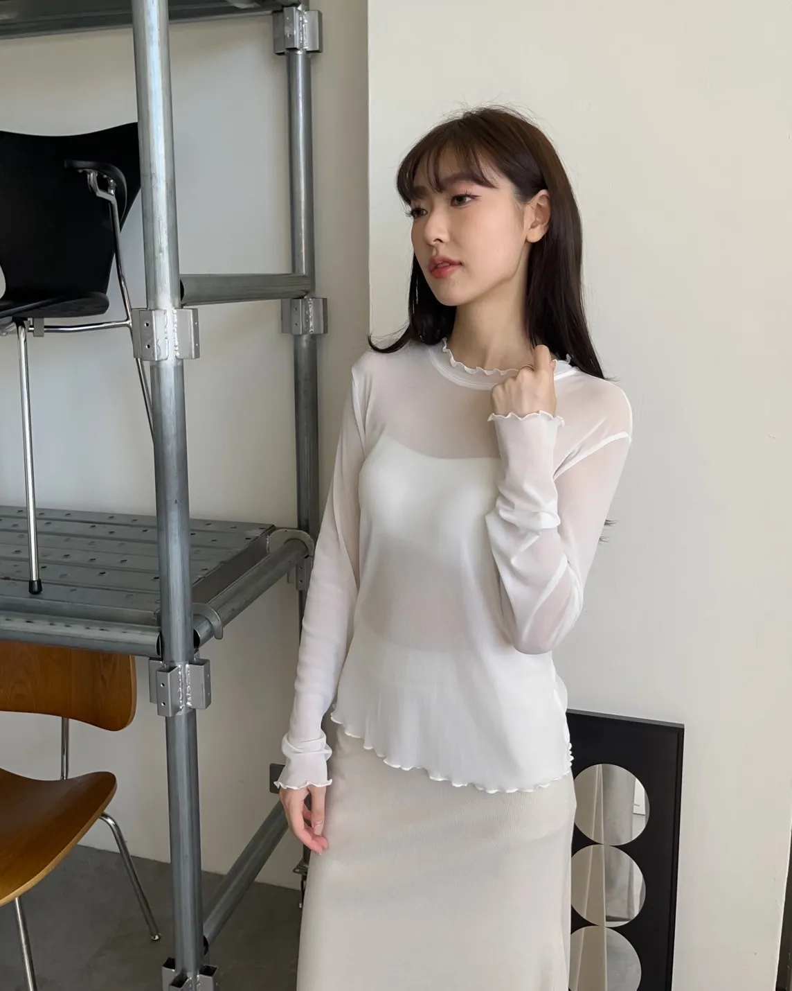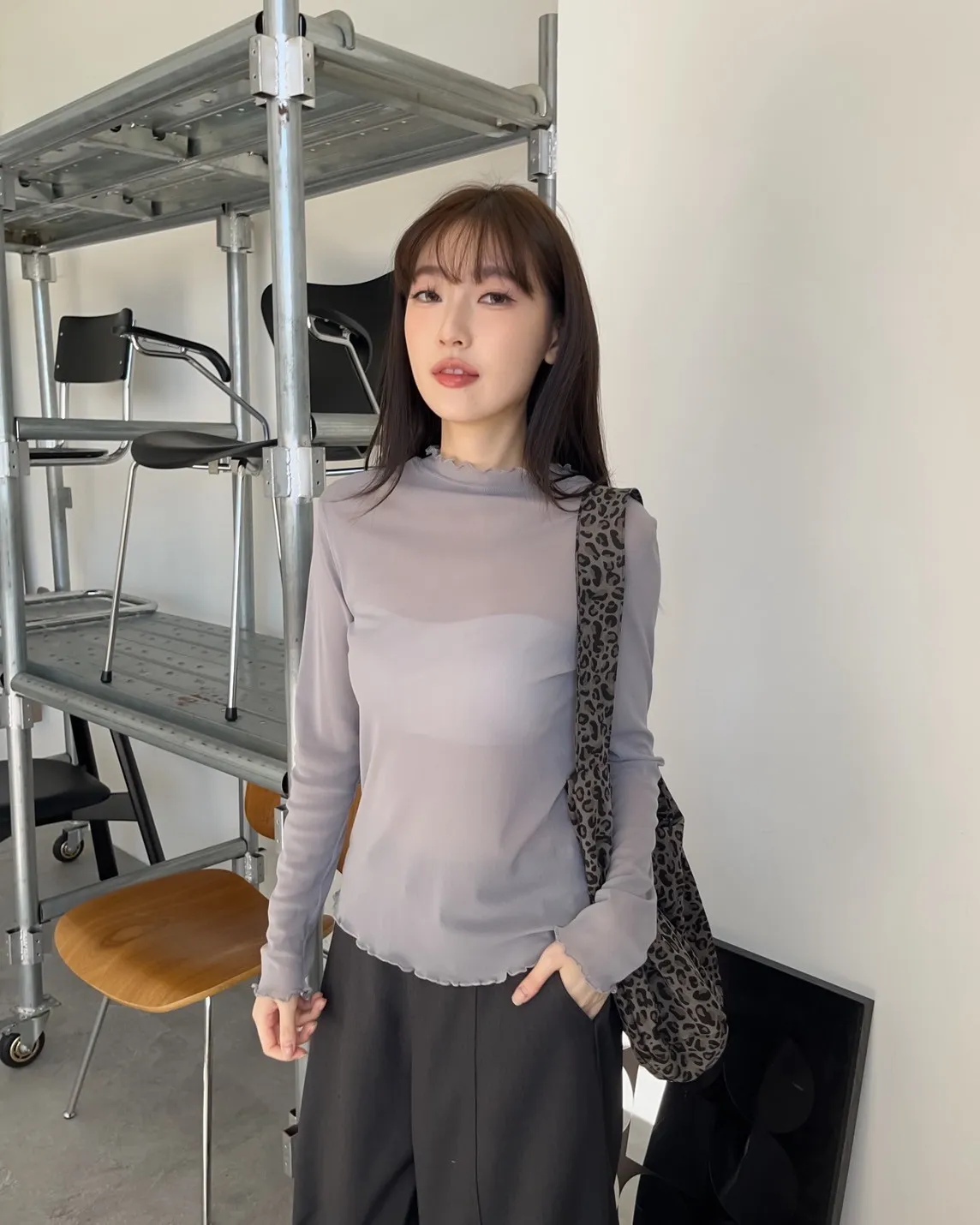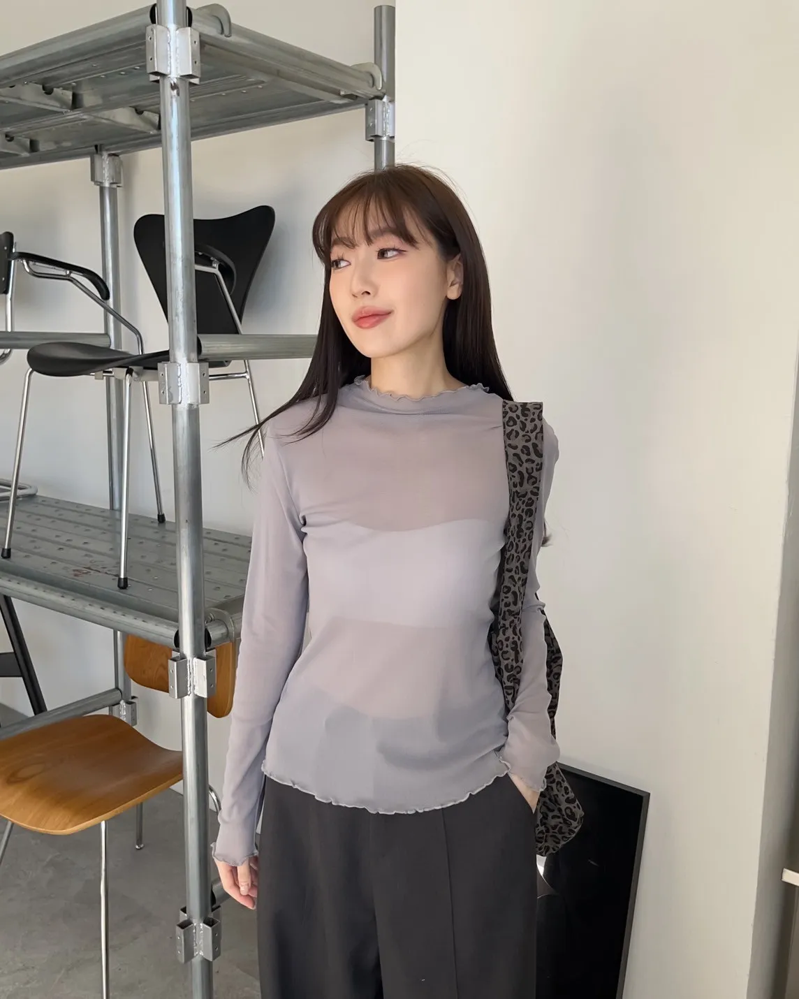 U0070(七色)木耳邊透膚上衣(白/米/咖啡/藍綠/淺灰/深灰/黑)