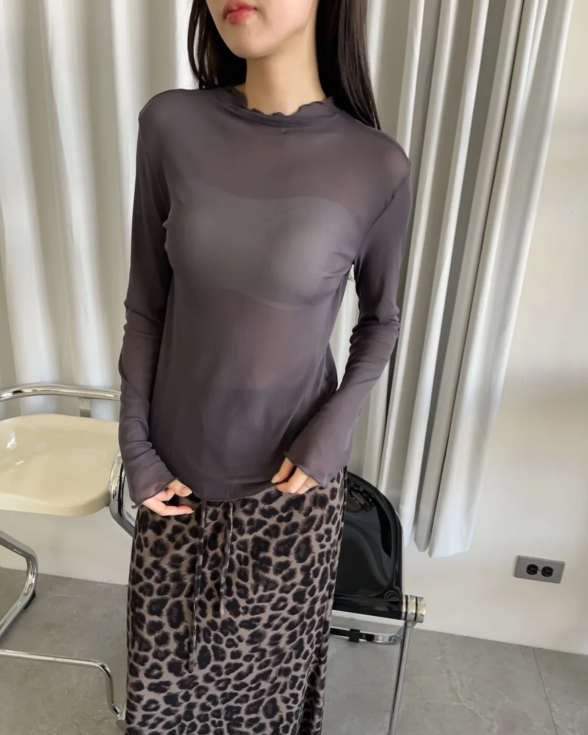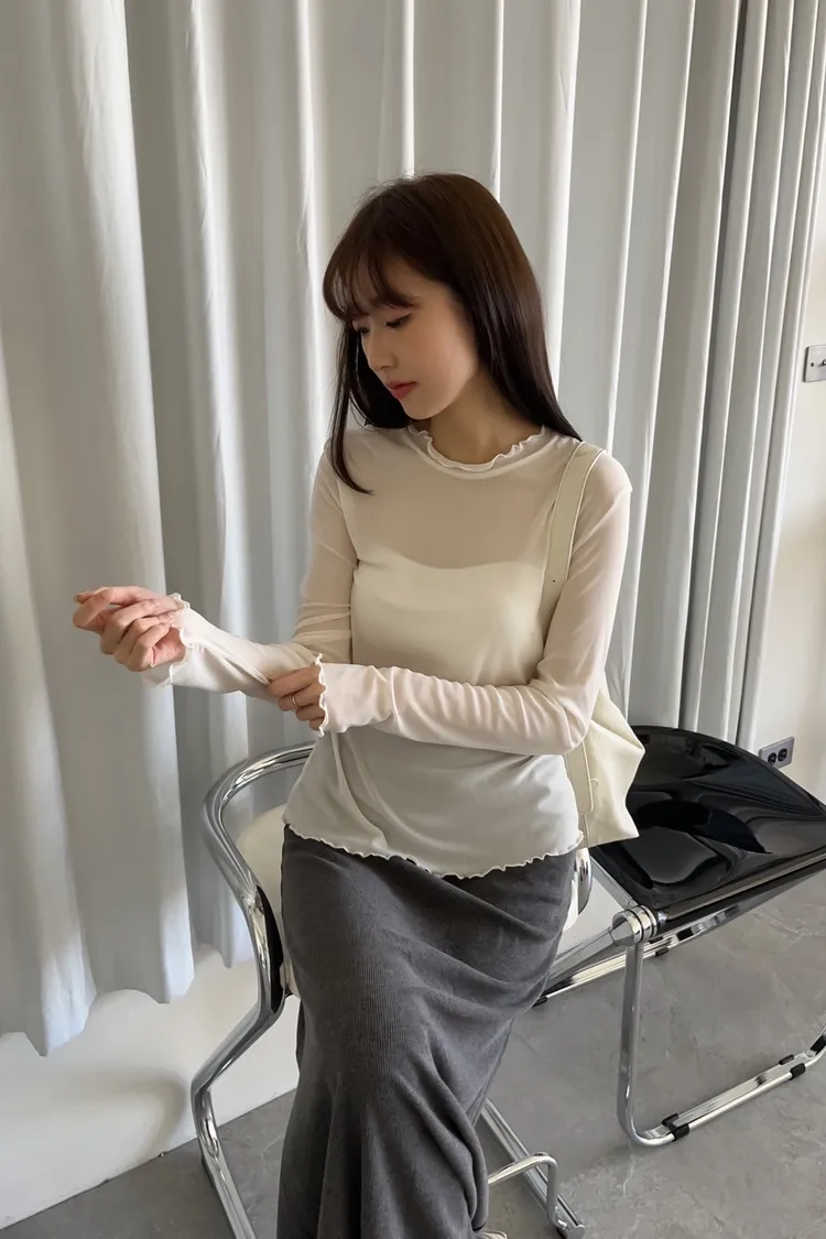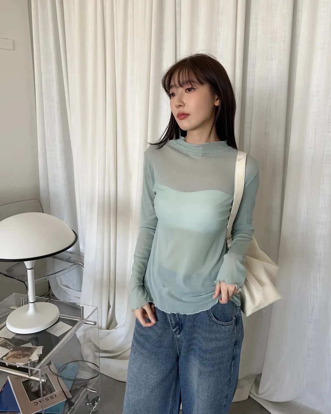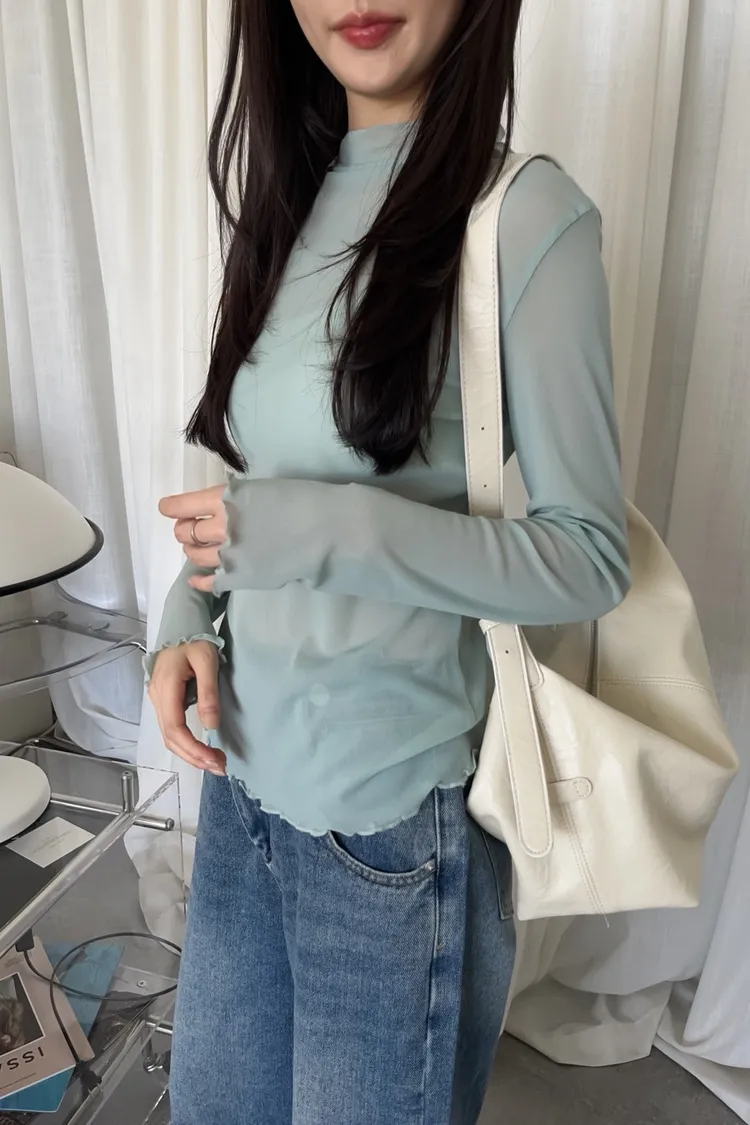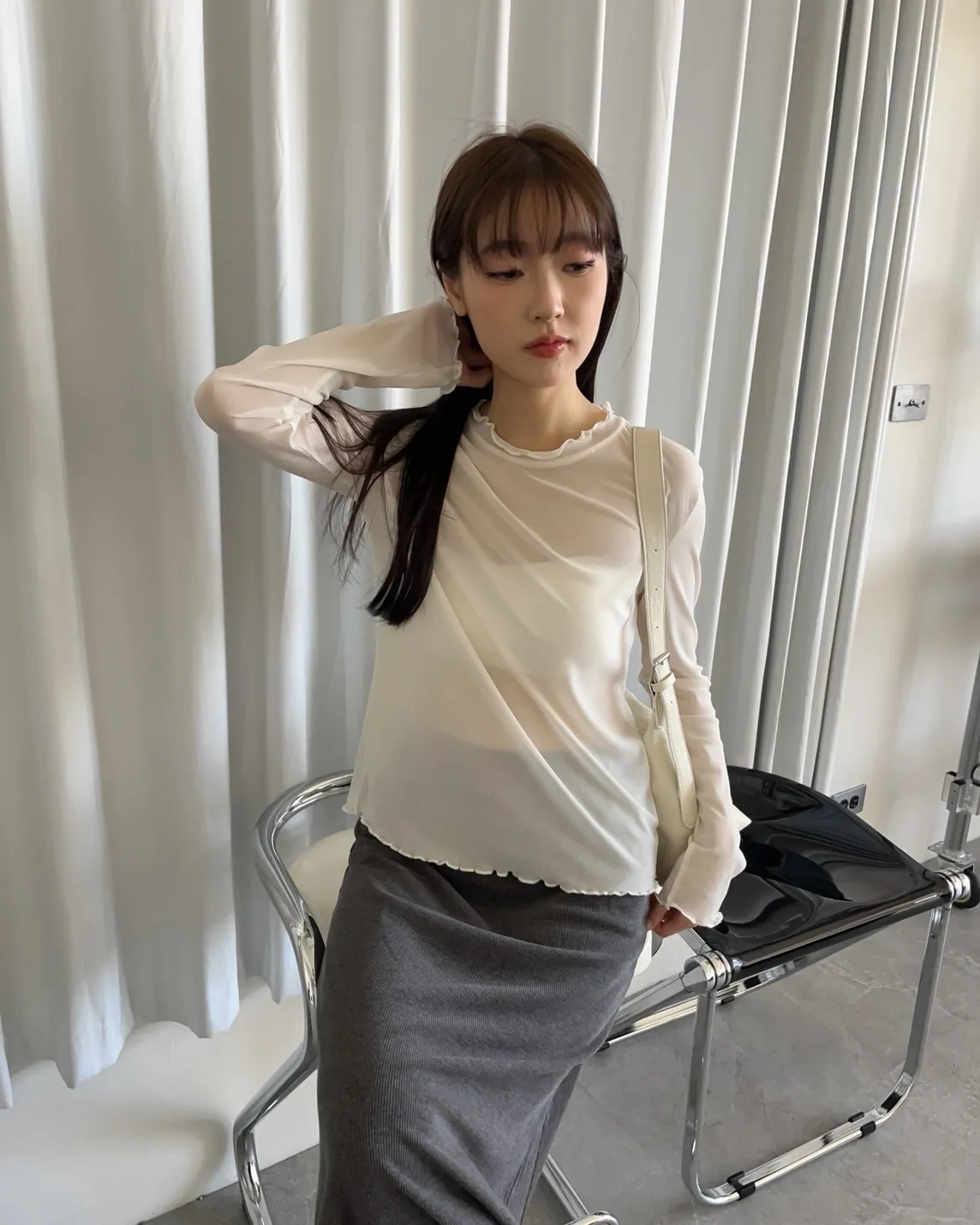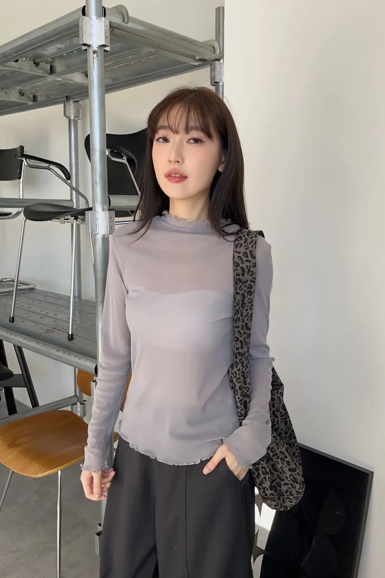 U0070(七色)木耳邊透膚上衣(白/米/咖啡/藍綠/淺灰/深灰/黑)
