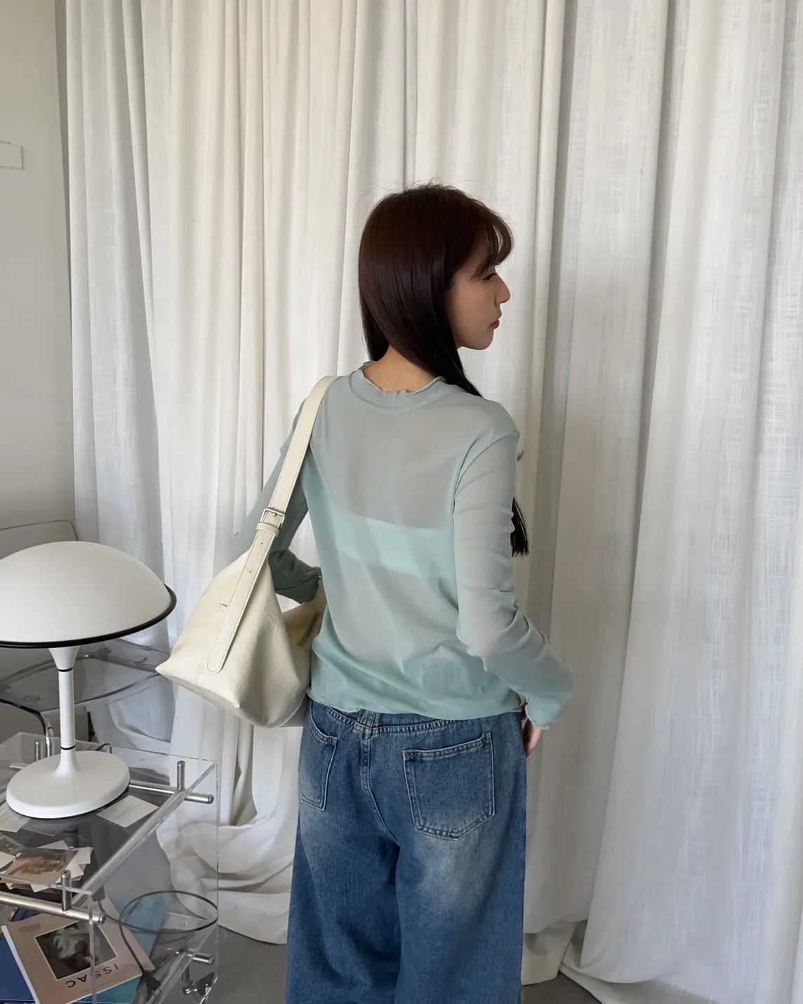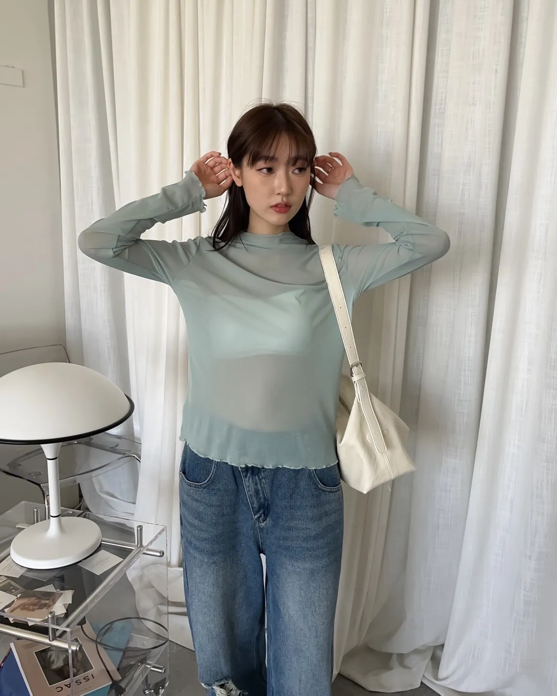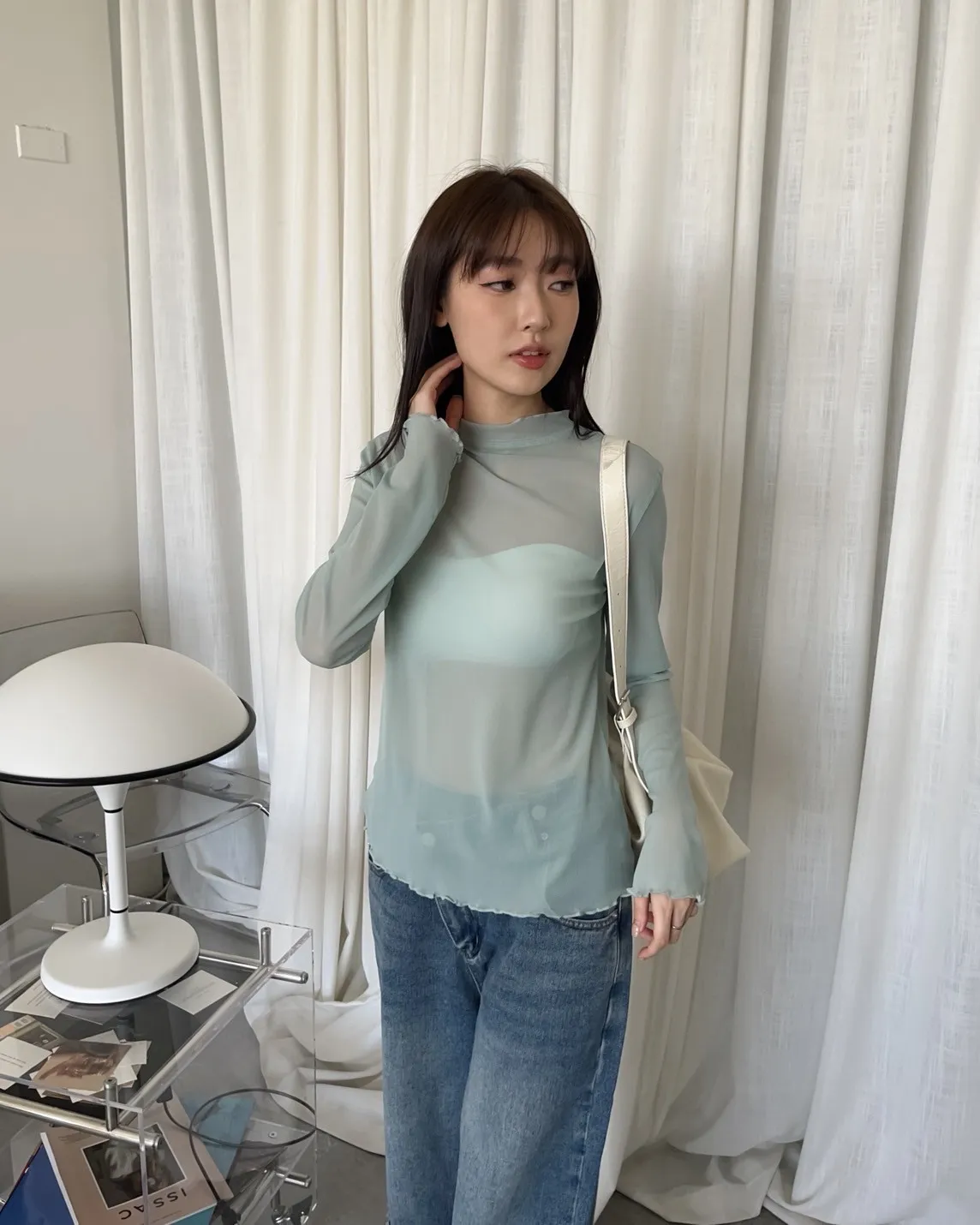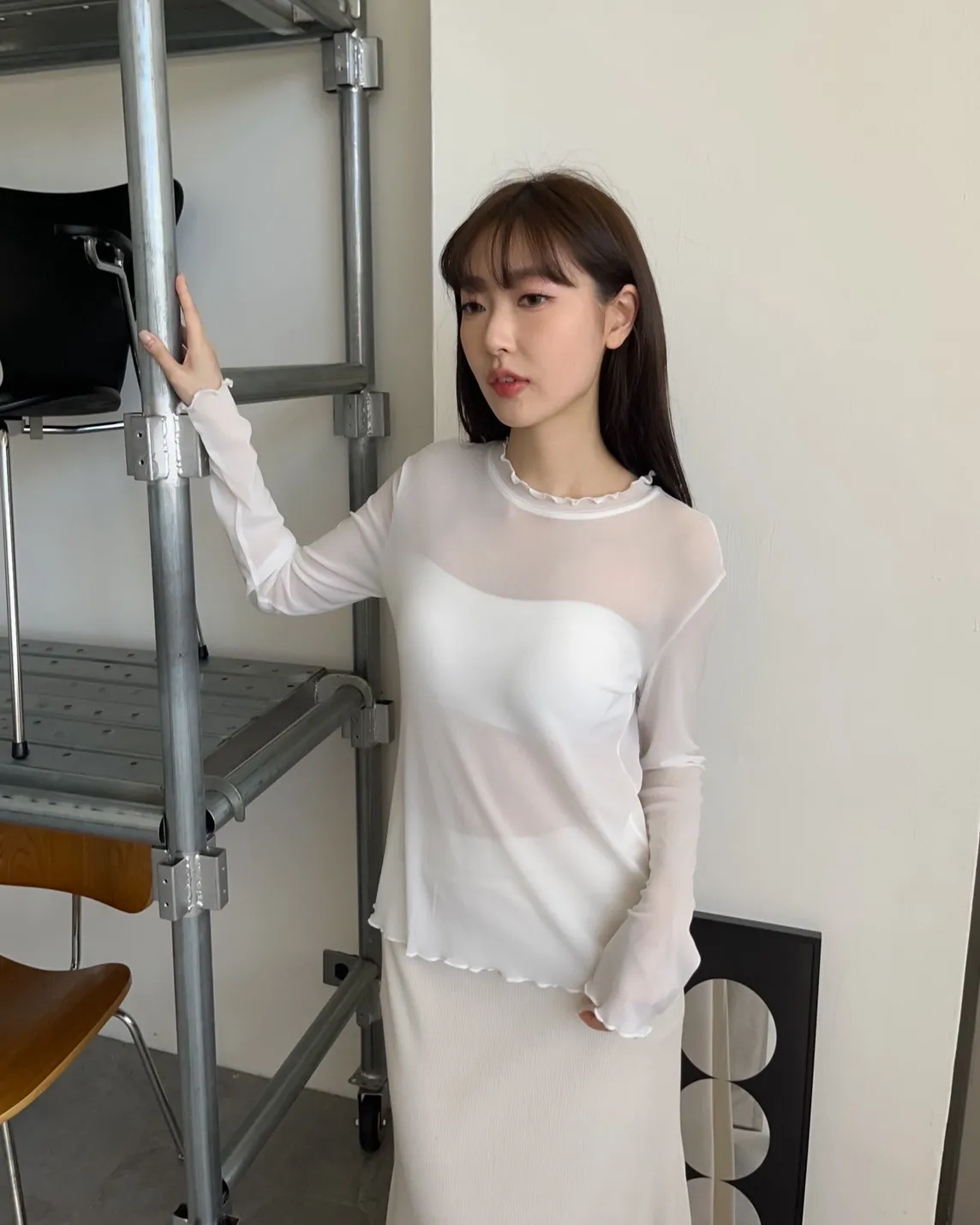 U0070(七色)木耳邊透膚上衣(白/米/咖啡/藍綠/淺灰/深灰/黑)