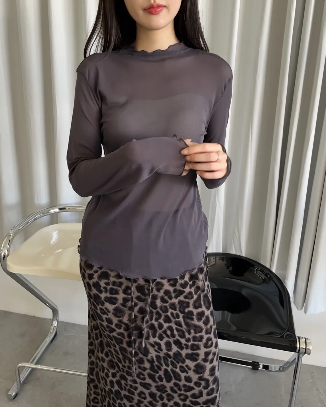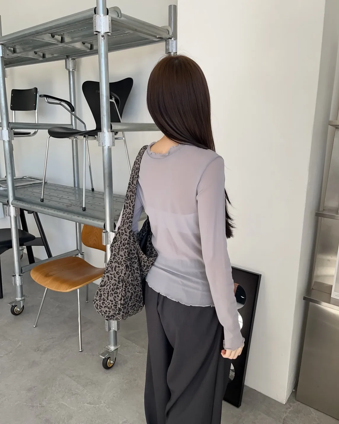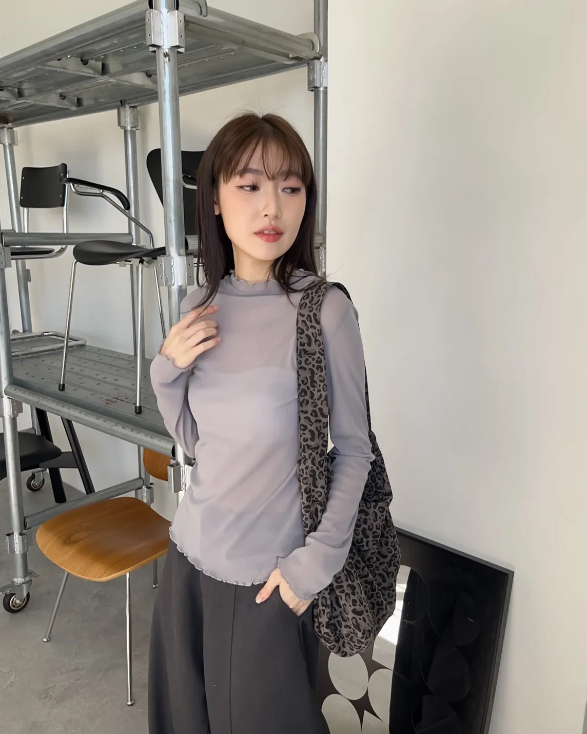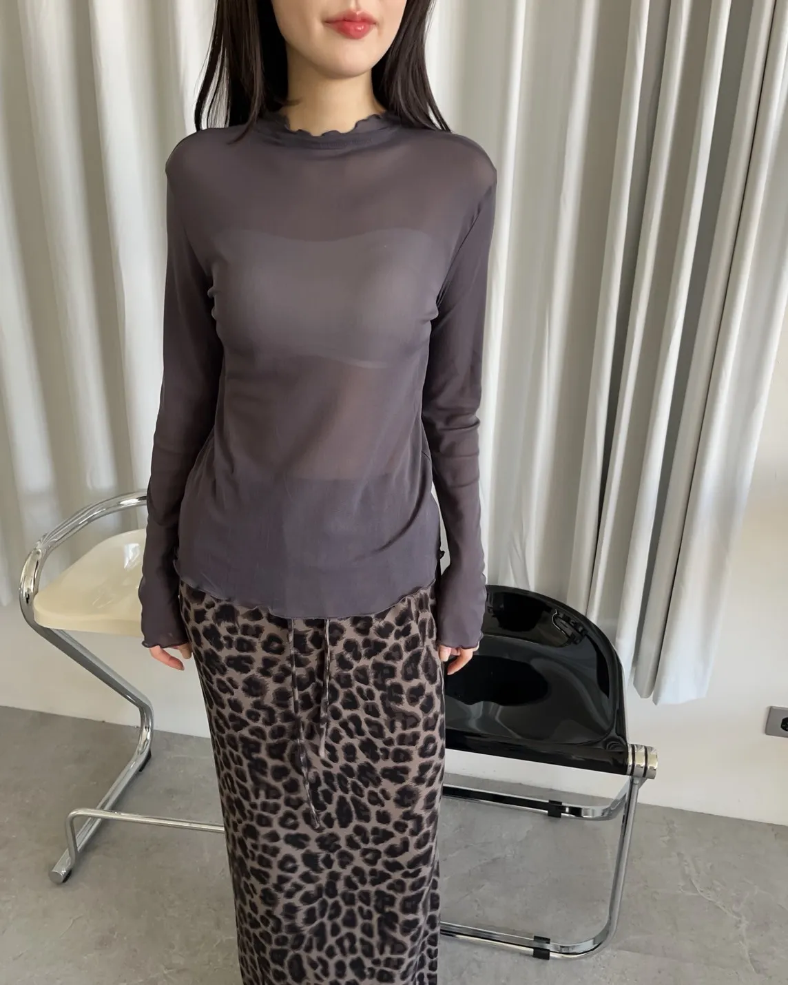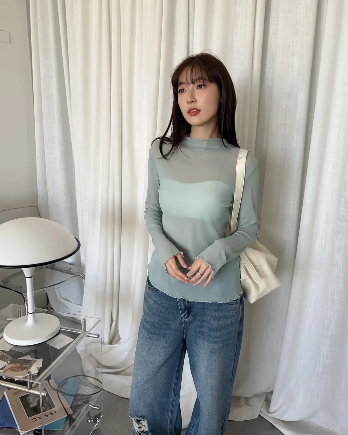 U0070(七色)木耳邊透膚上衣(白/米/咖啡/藍綠/淺灰/深灰/黑)