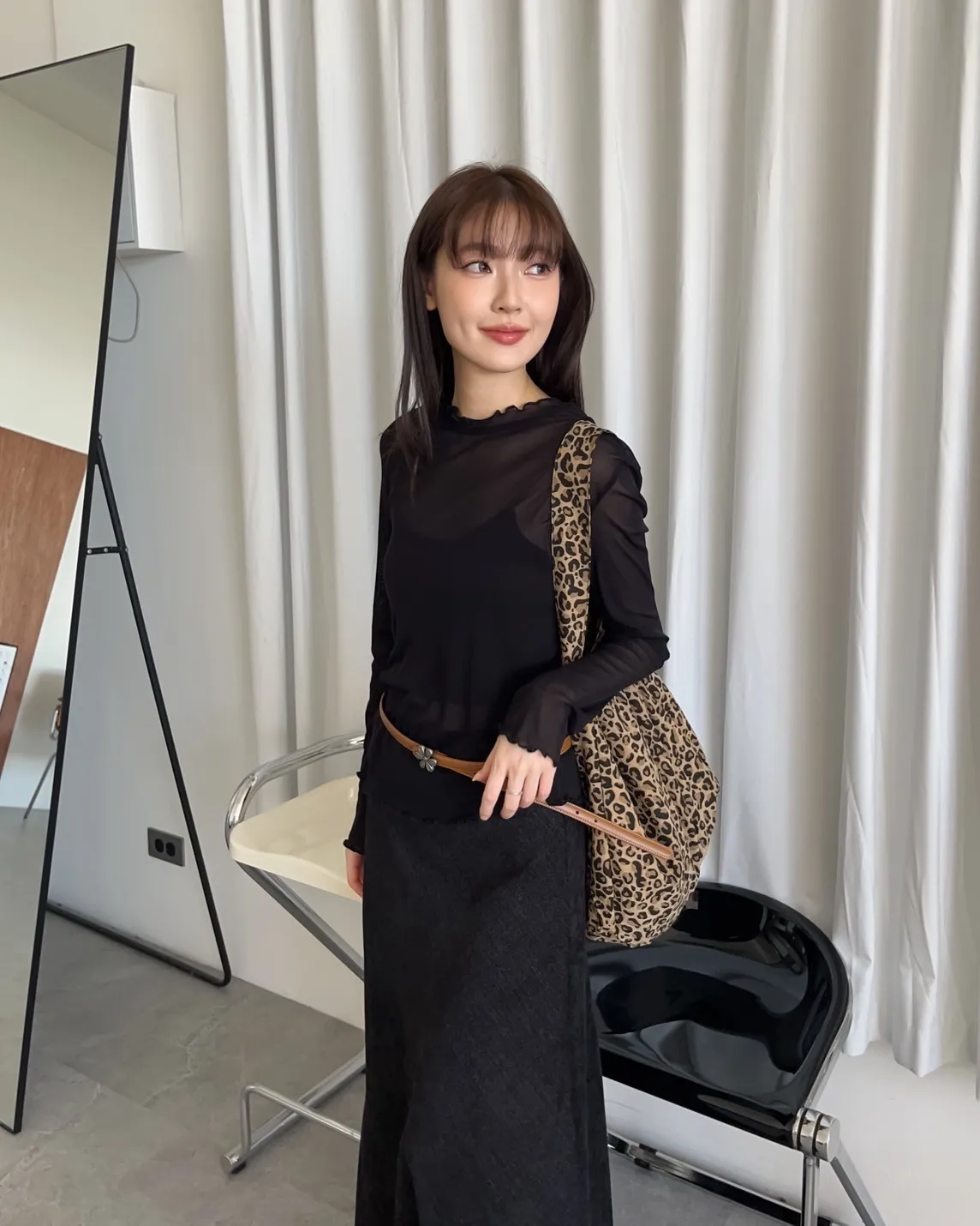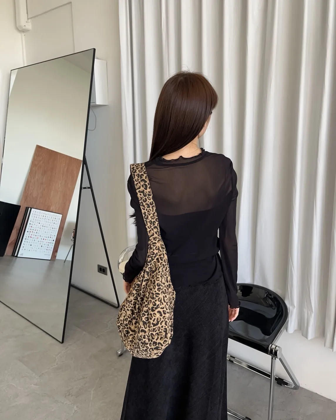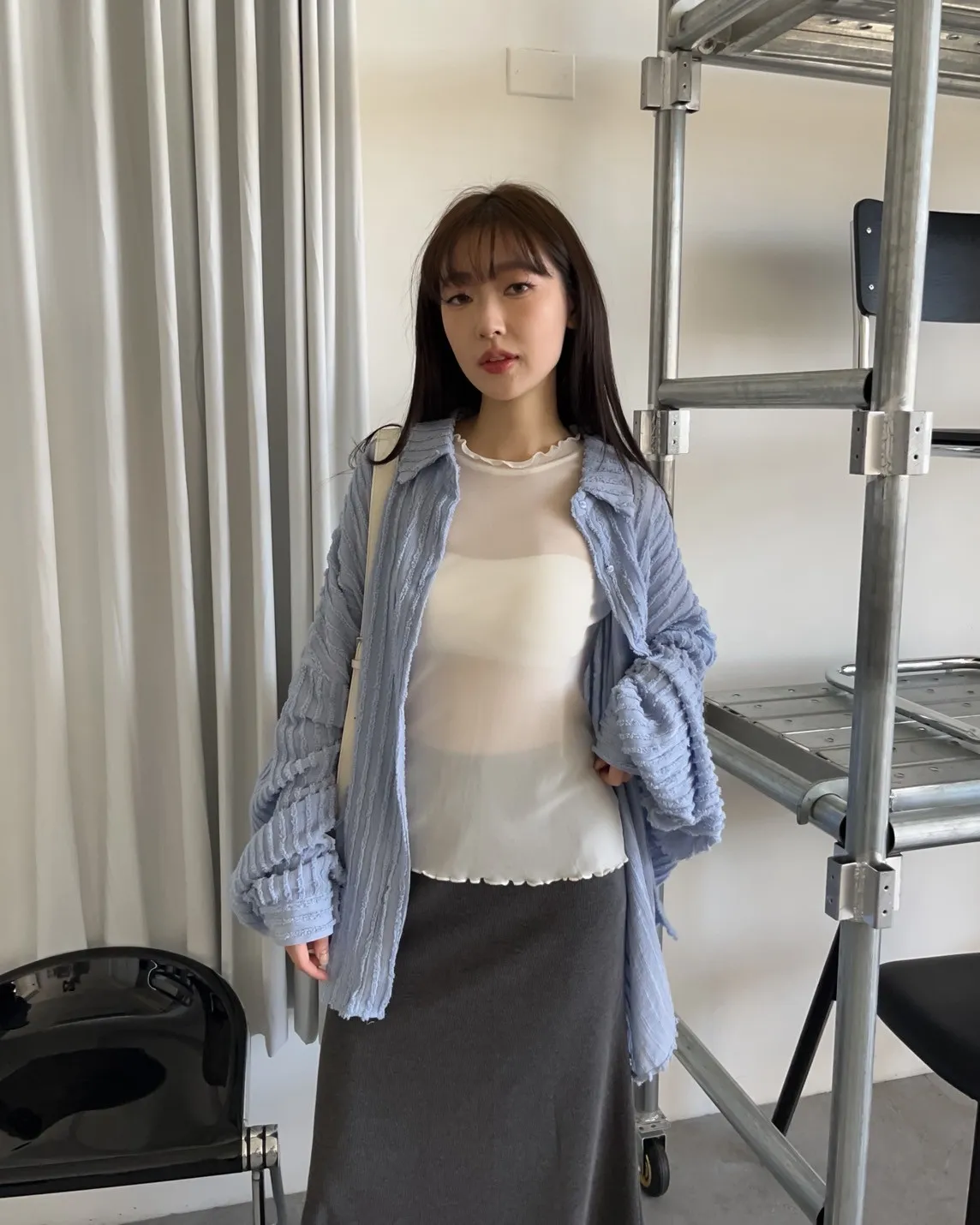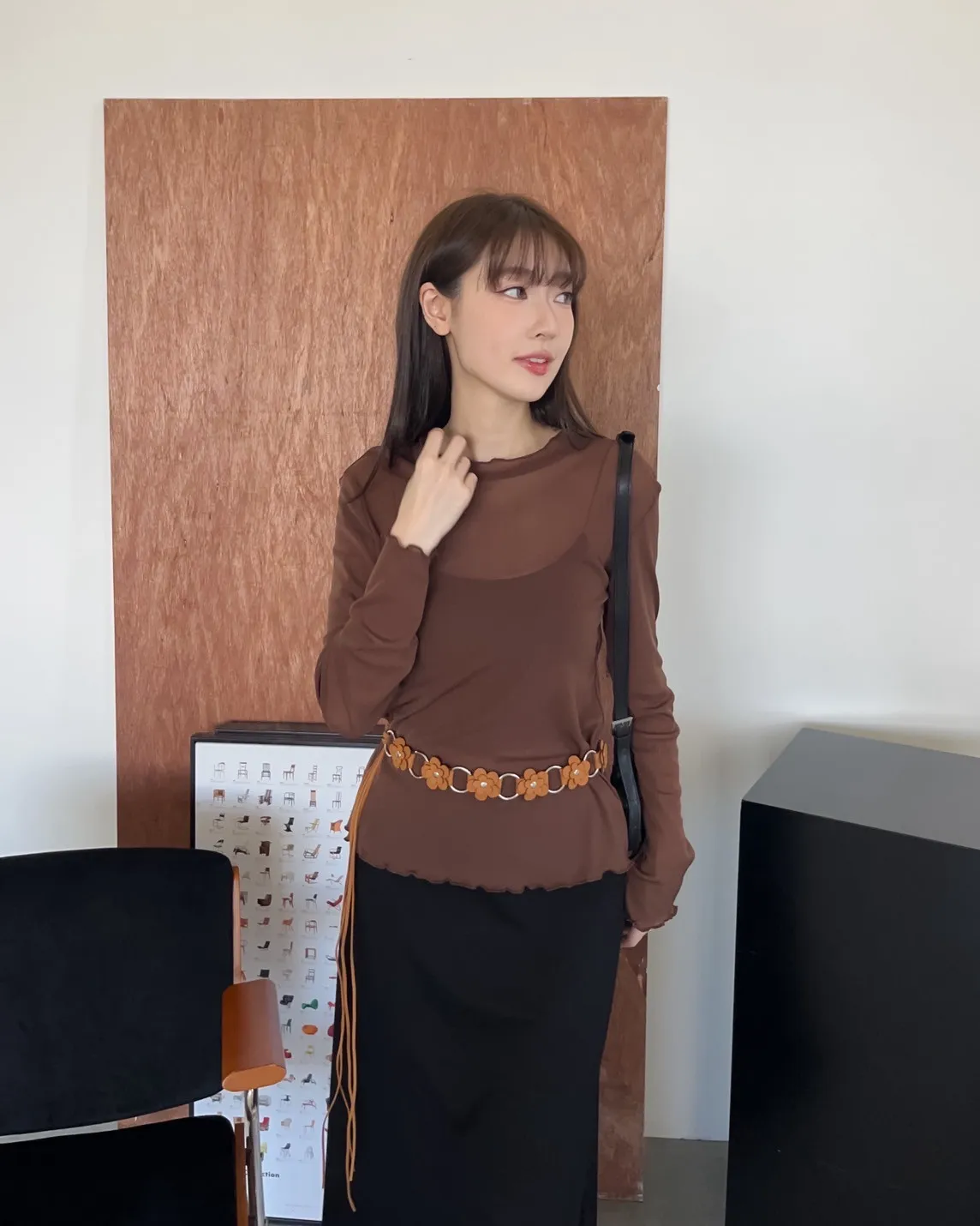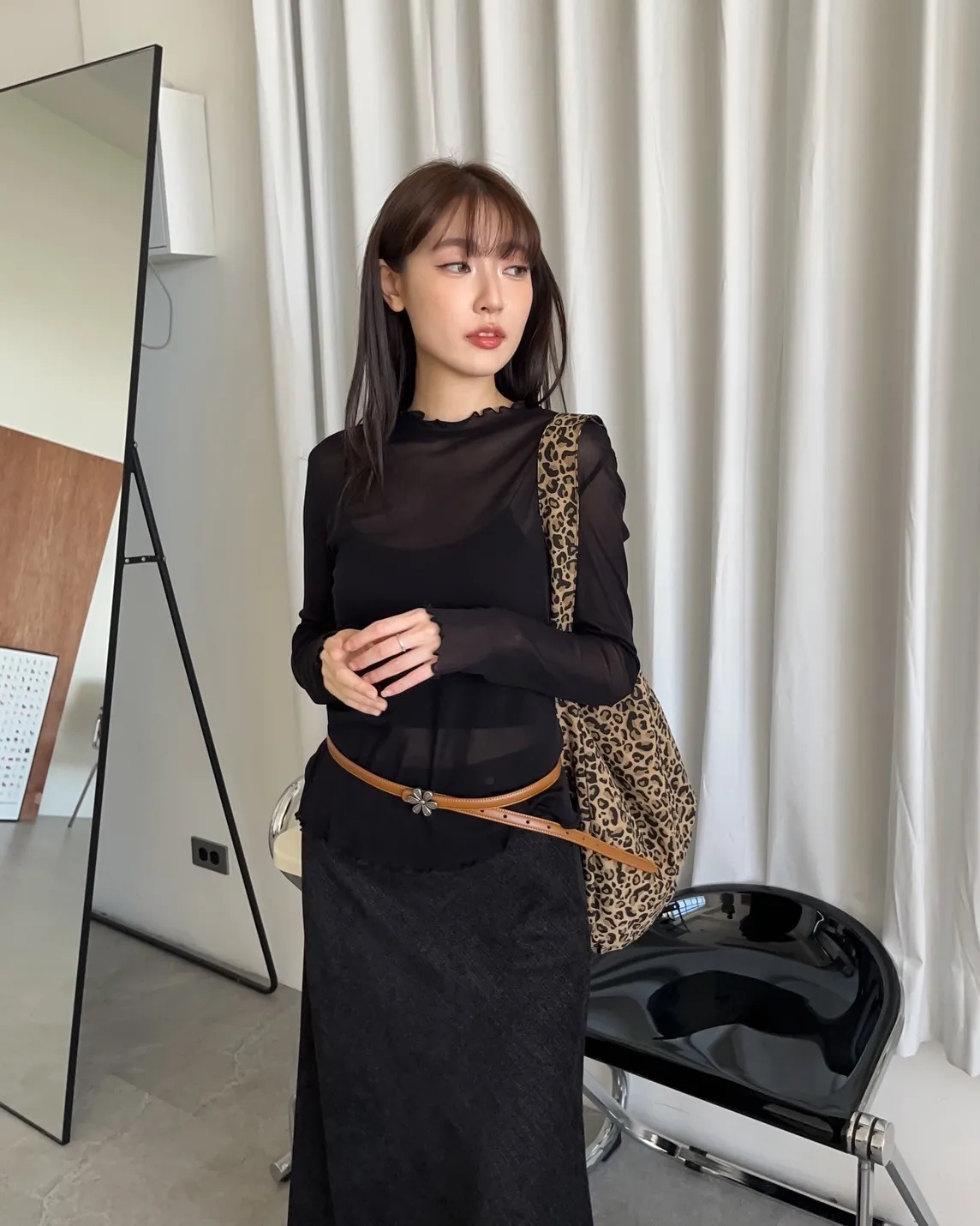 U0070(七色)木耳邊透膚上衣(白/米/咖啡/藍綠/淺灰/深灰/黑)