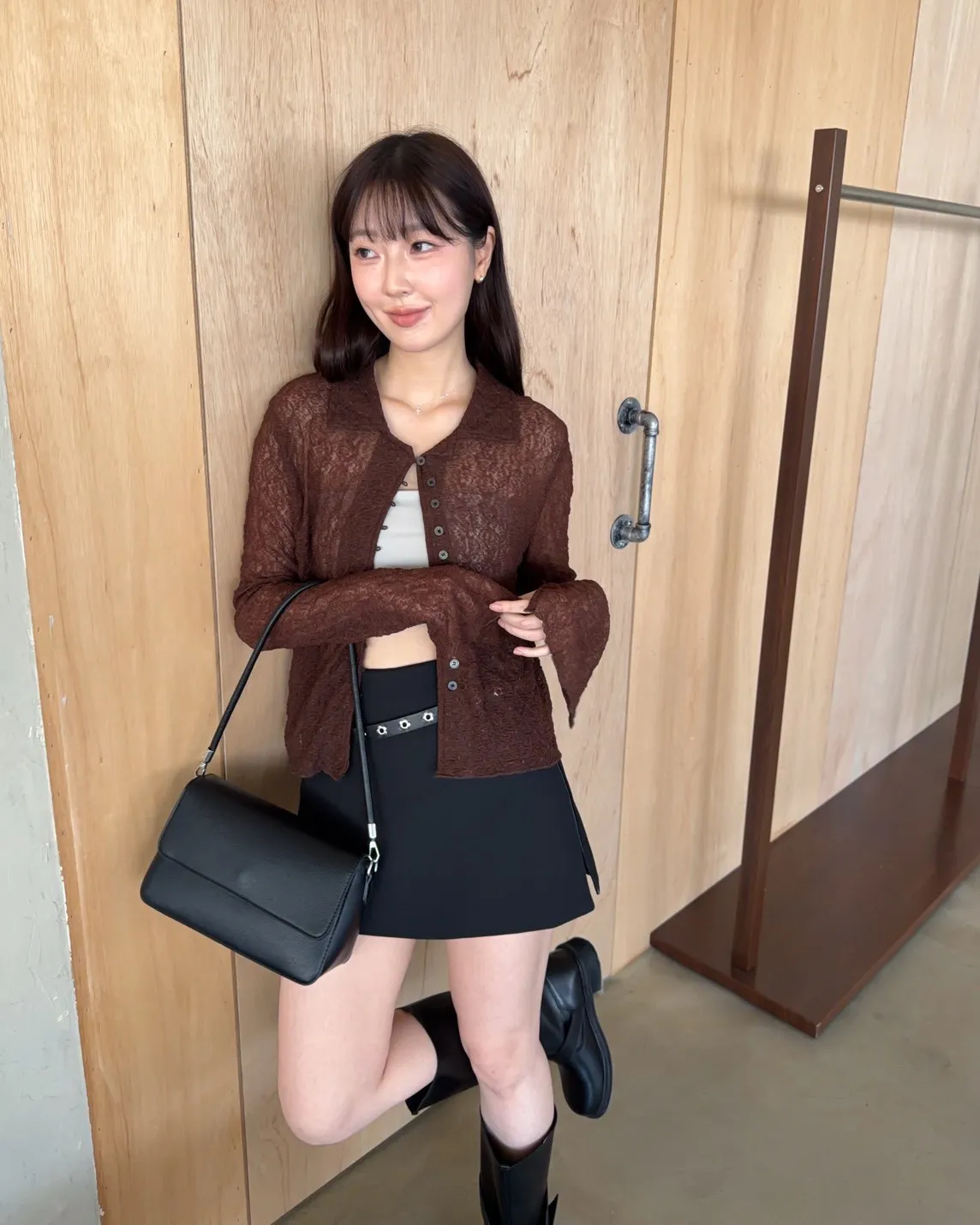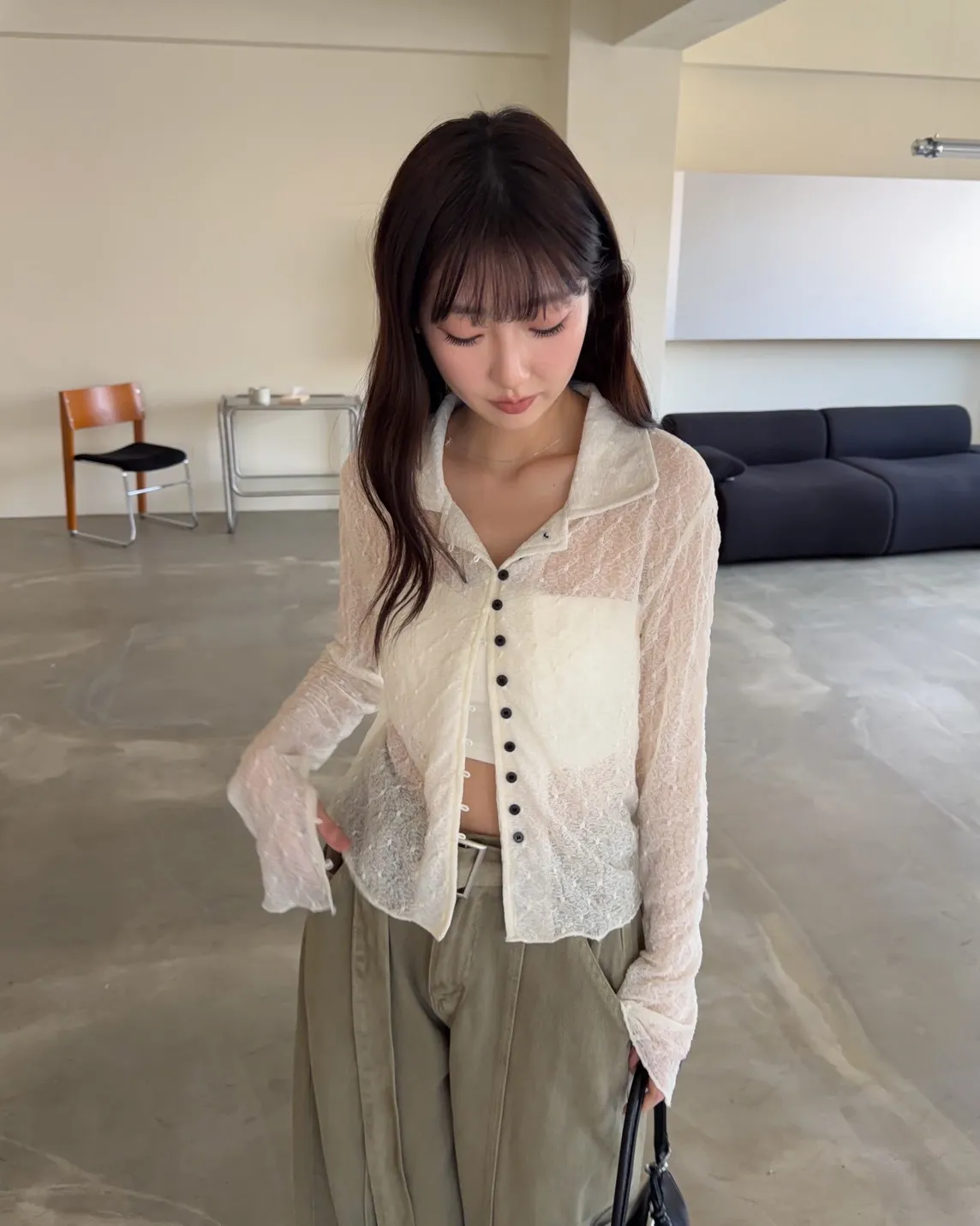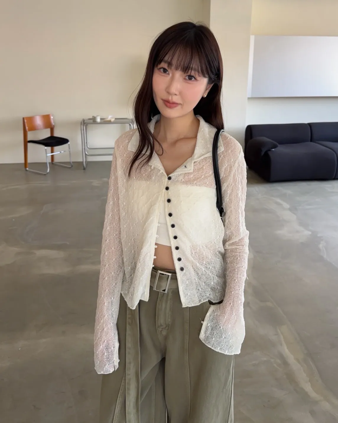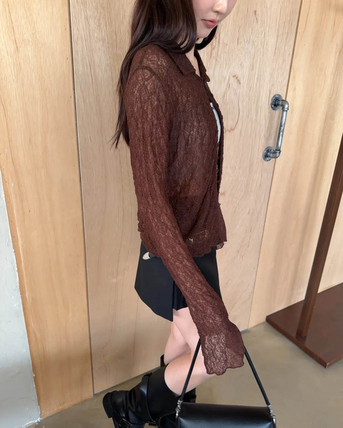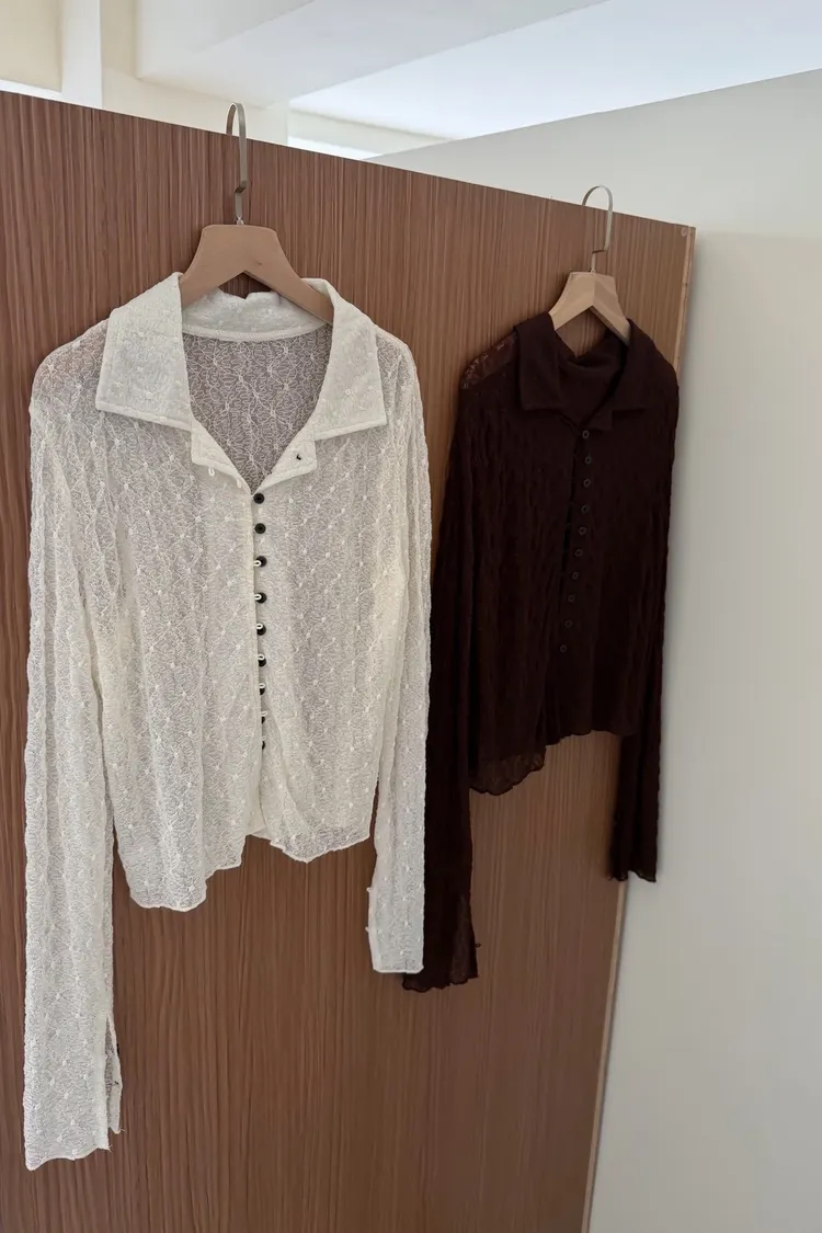 B0062細緻花紋翻領排釦透衫(米/咖啡)