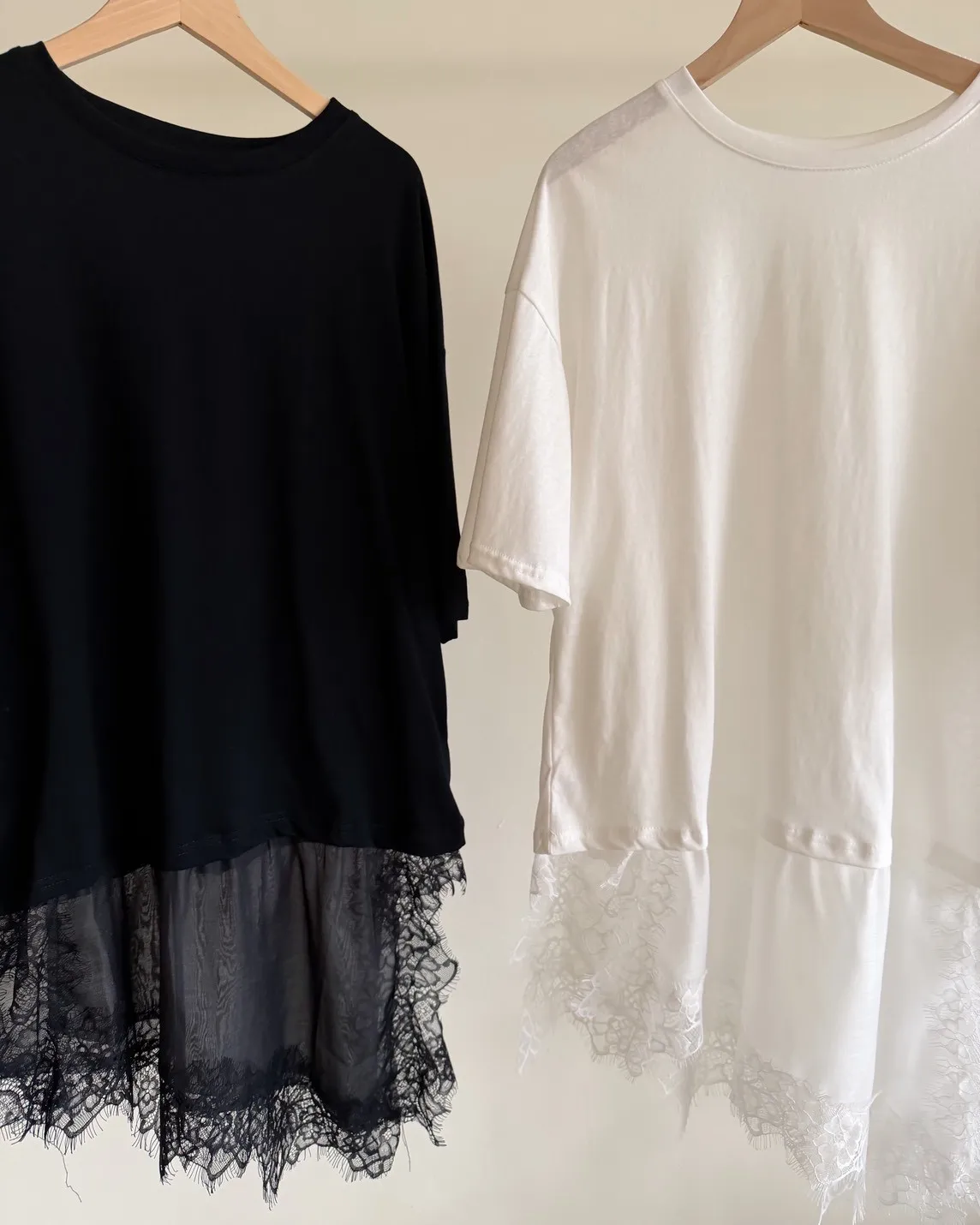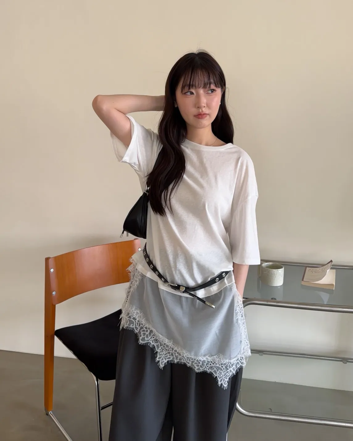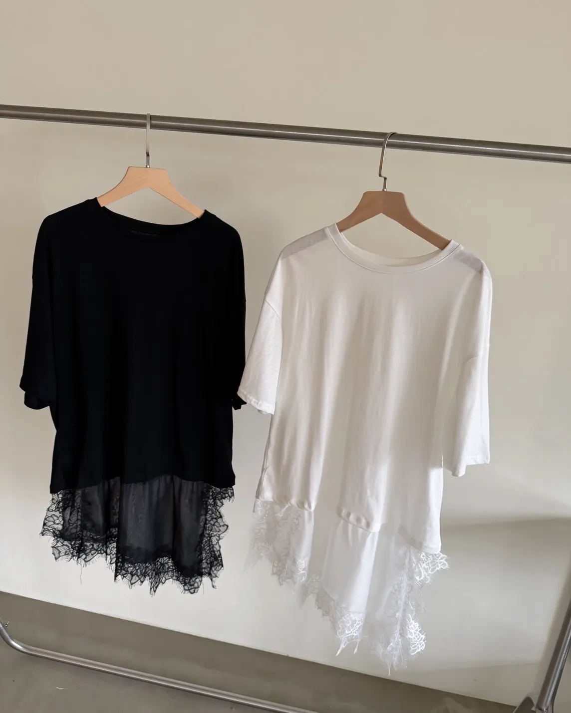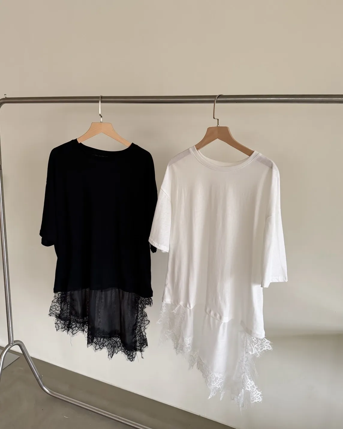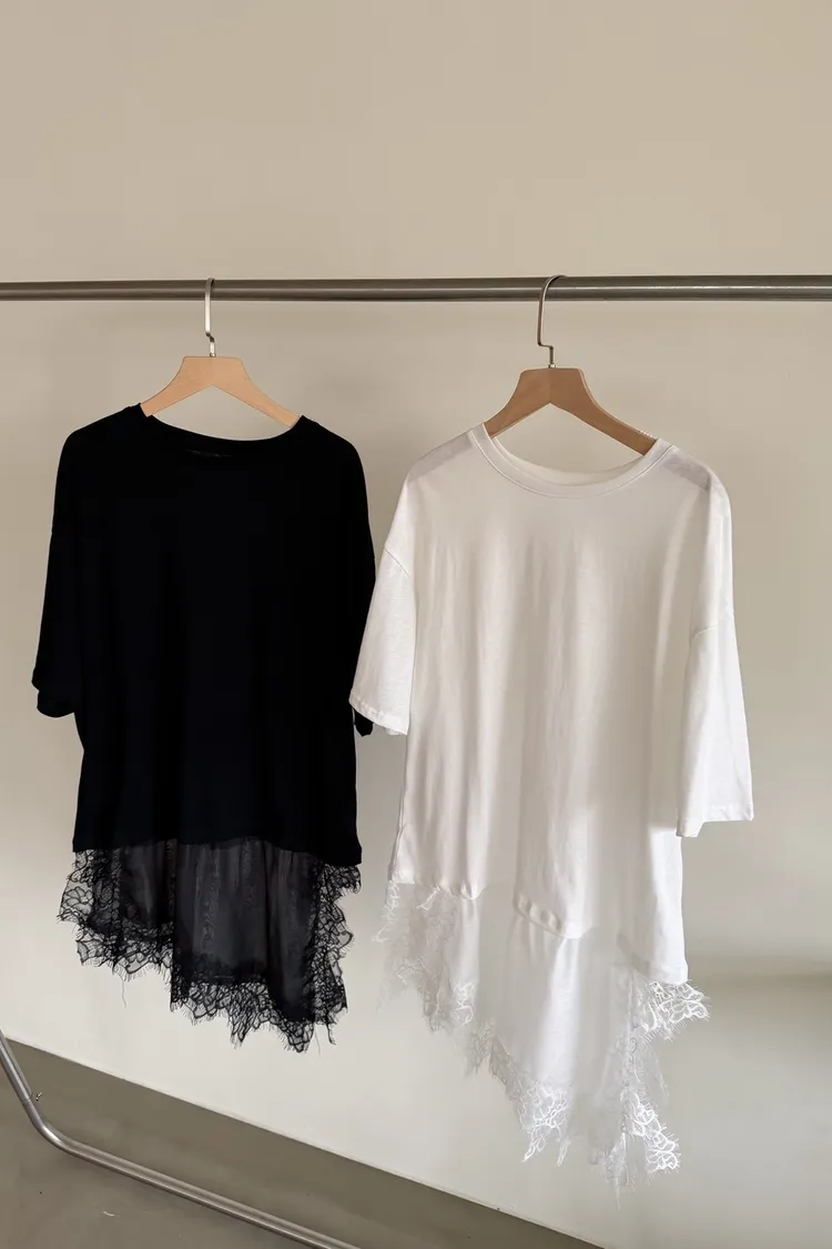不規則蕾絲下擺 寬鬆落肩 薄棉料