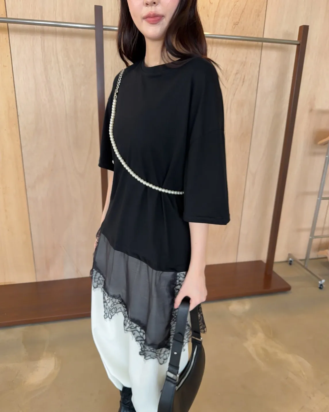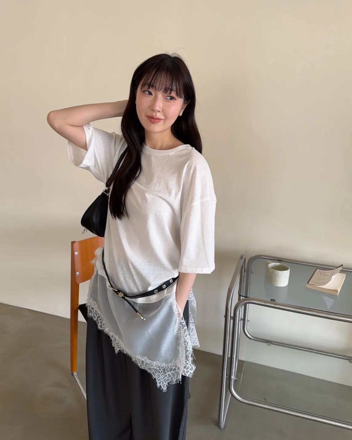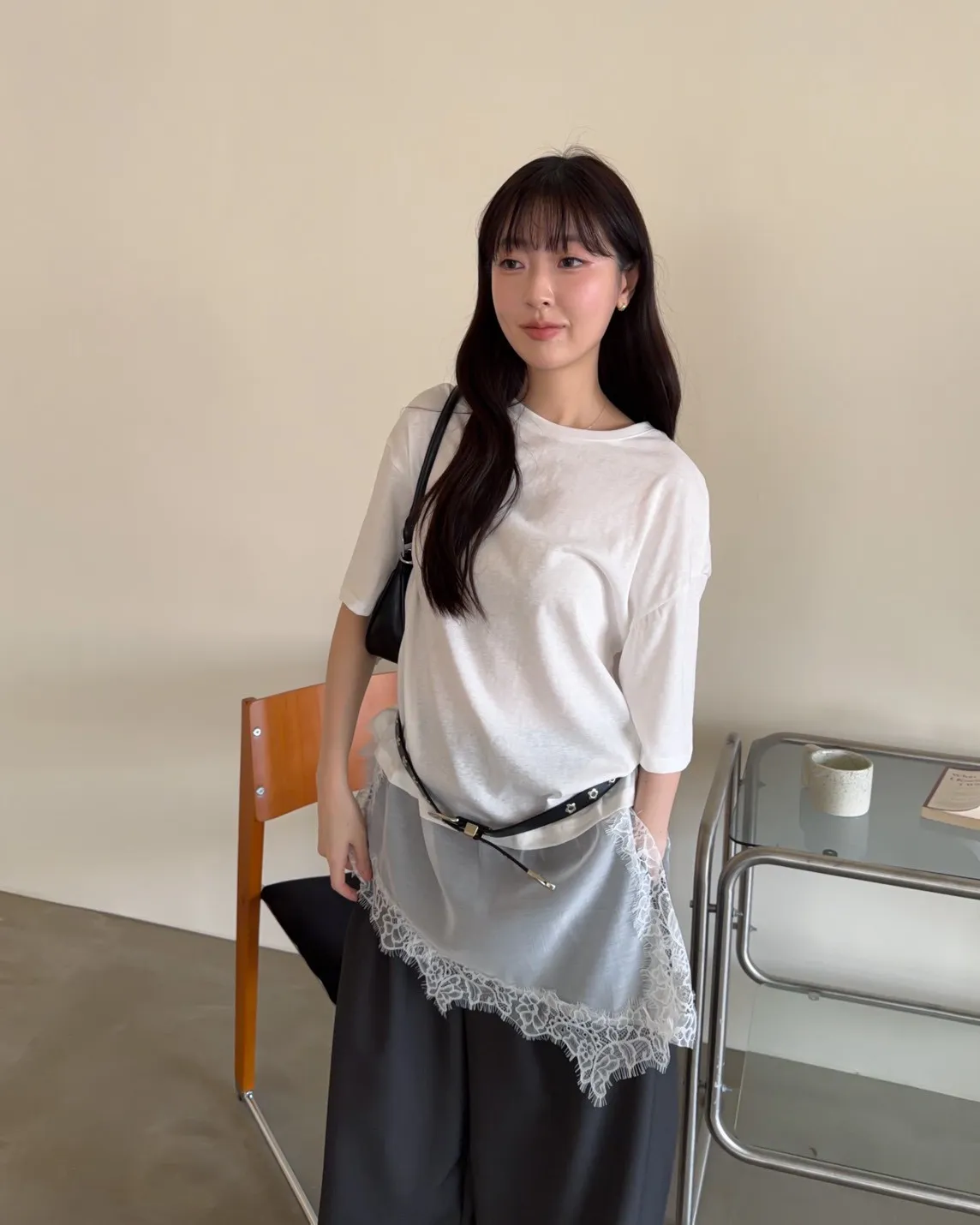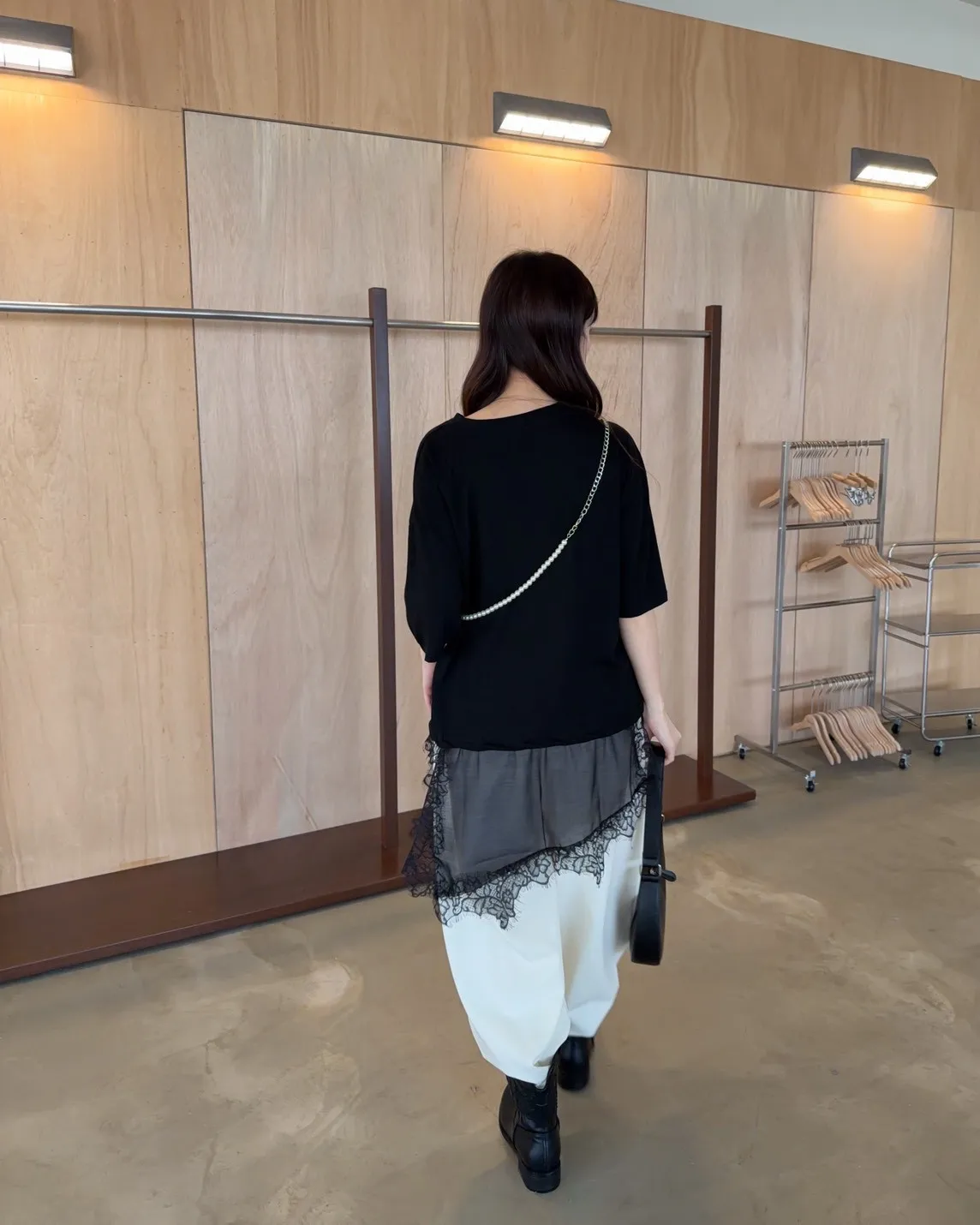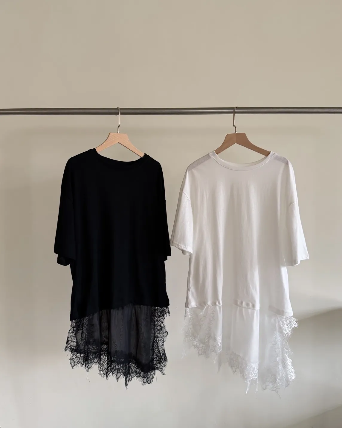 不規則蕾絲下擺 寬鬆落肩 薄棉料