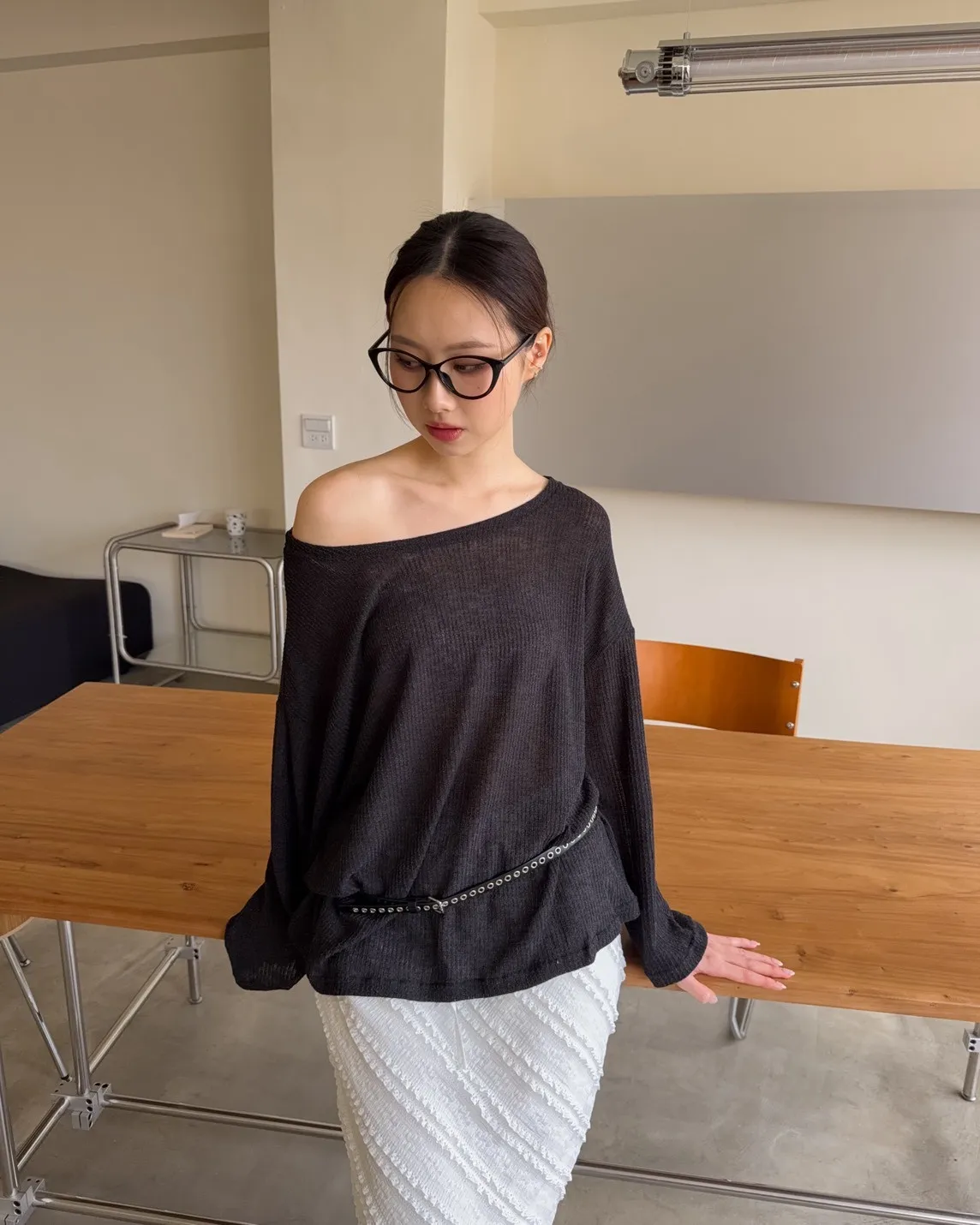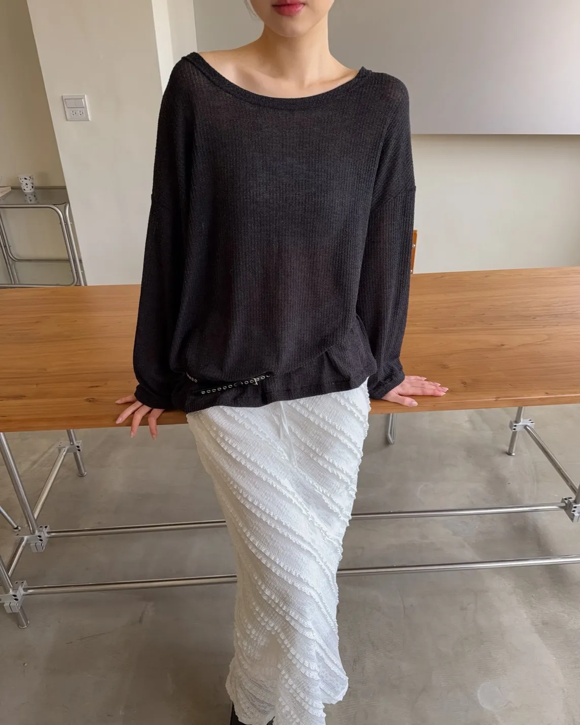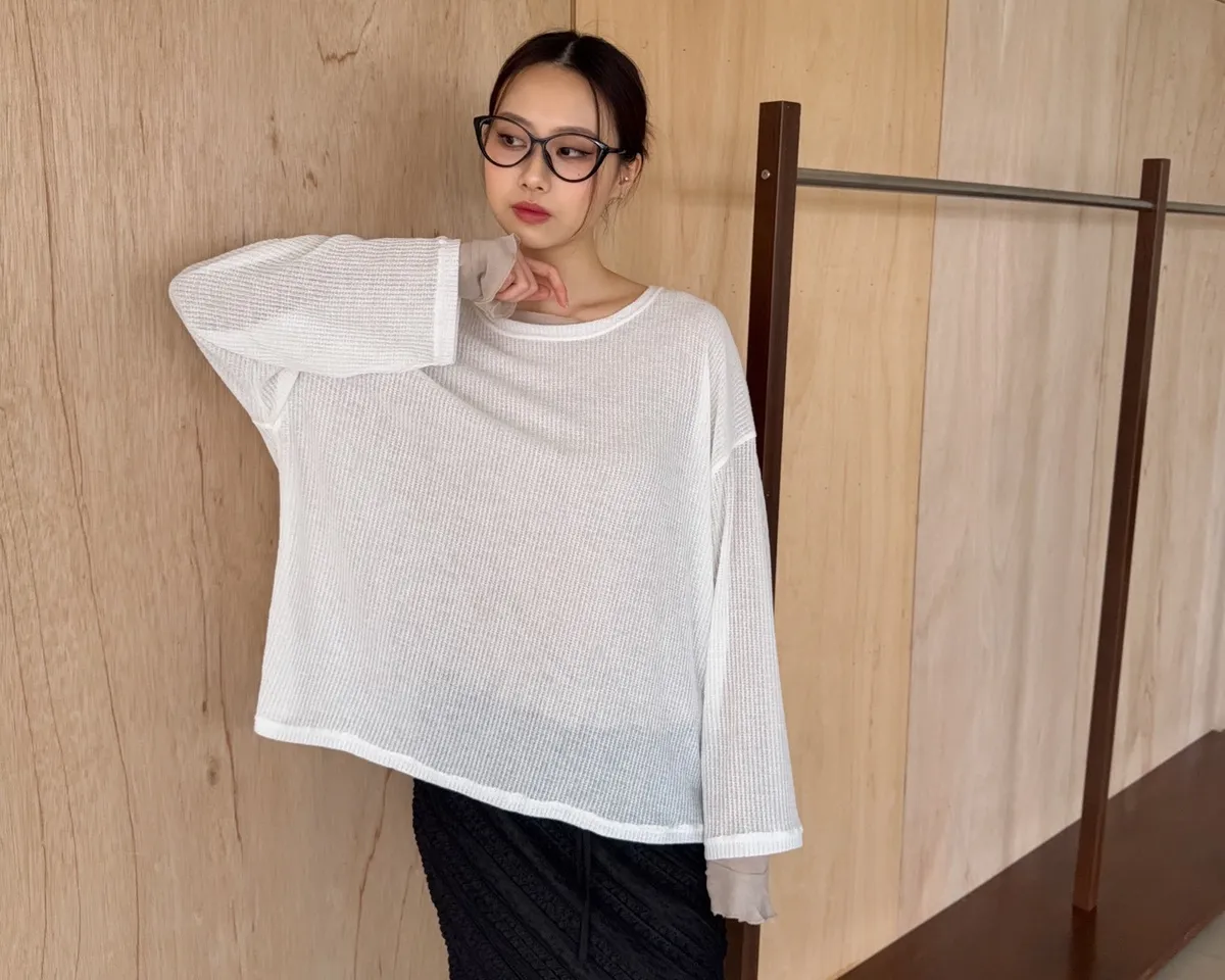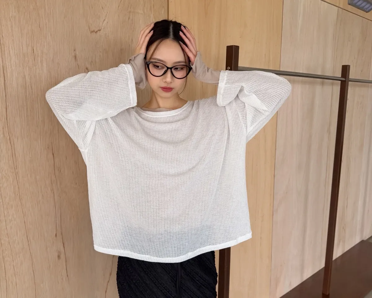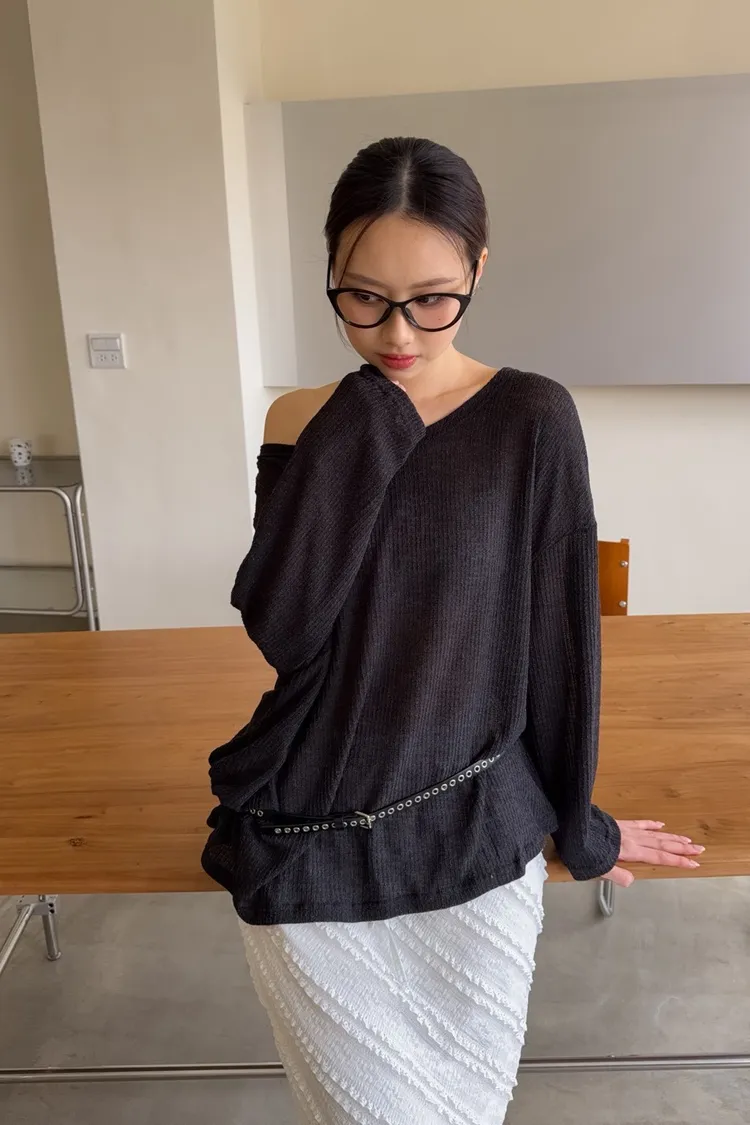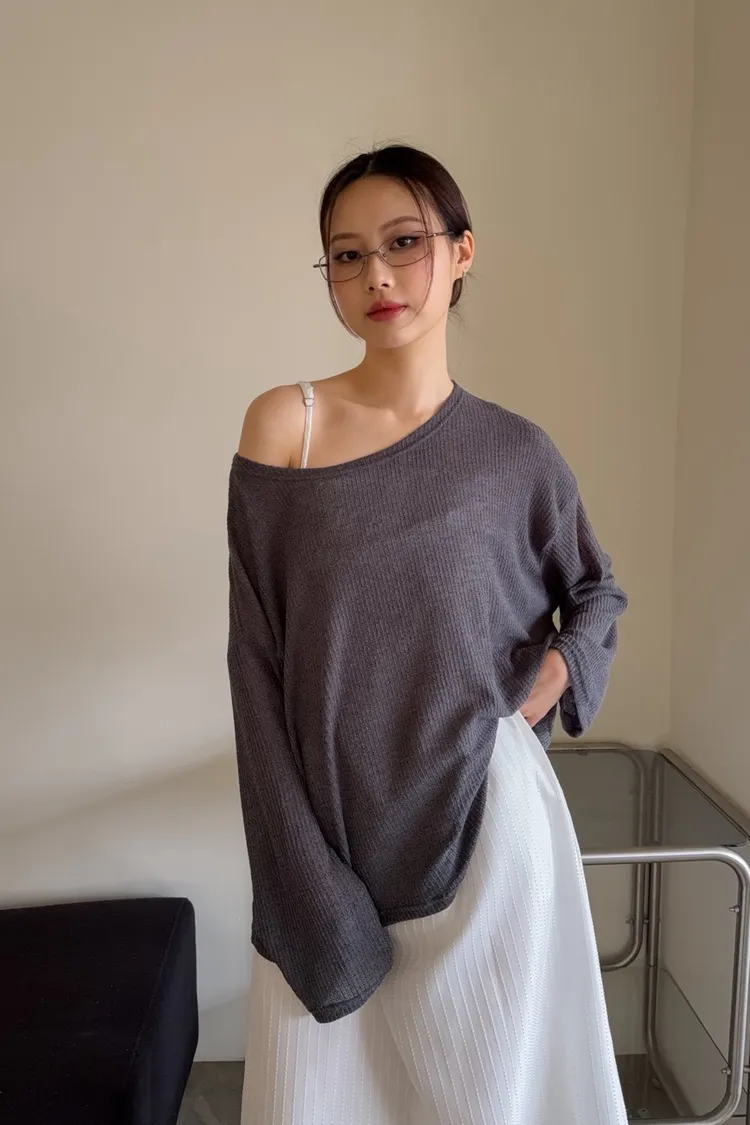 彈性大領口 露出鎖骨顯瘦 可斜肩 微透薄針織 寬版