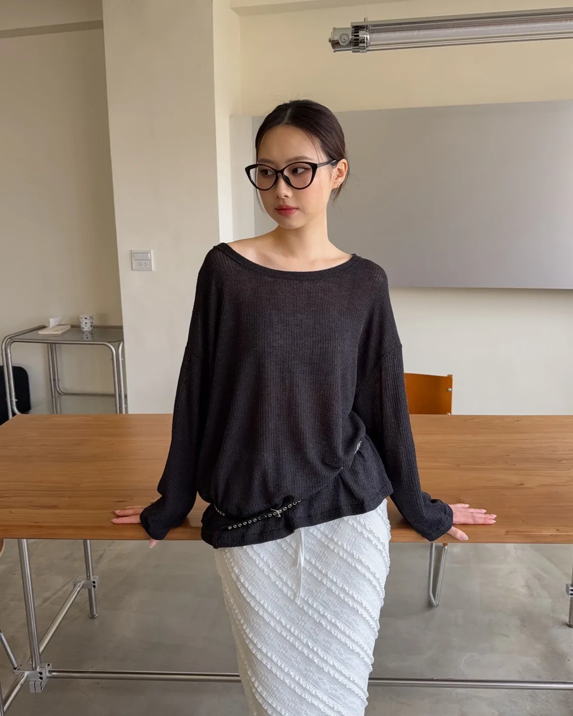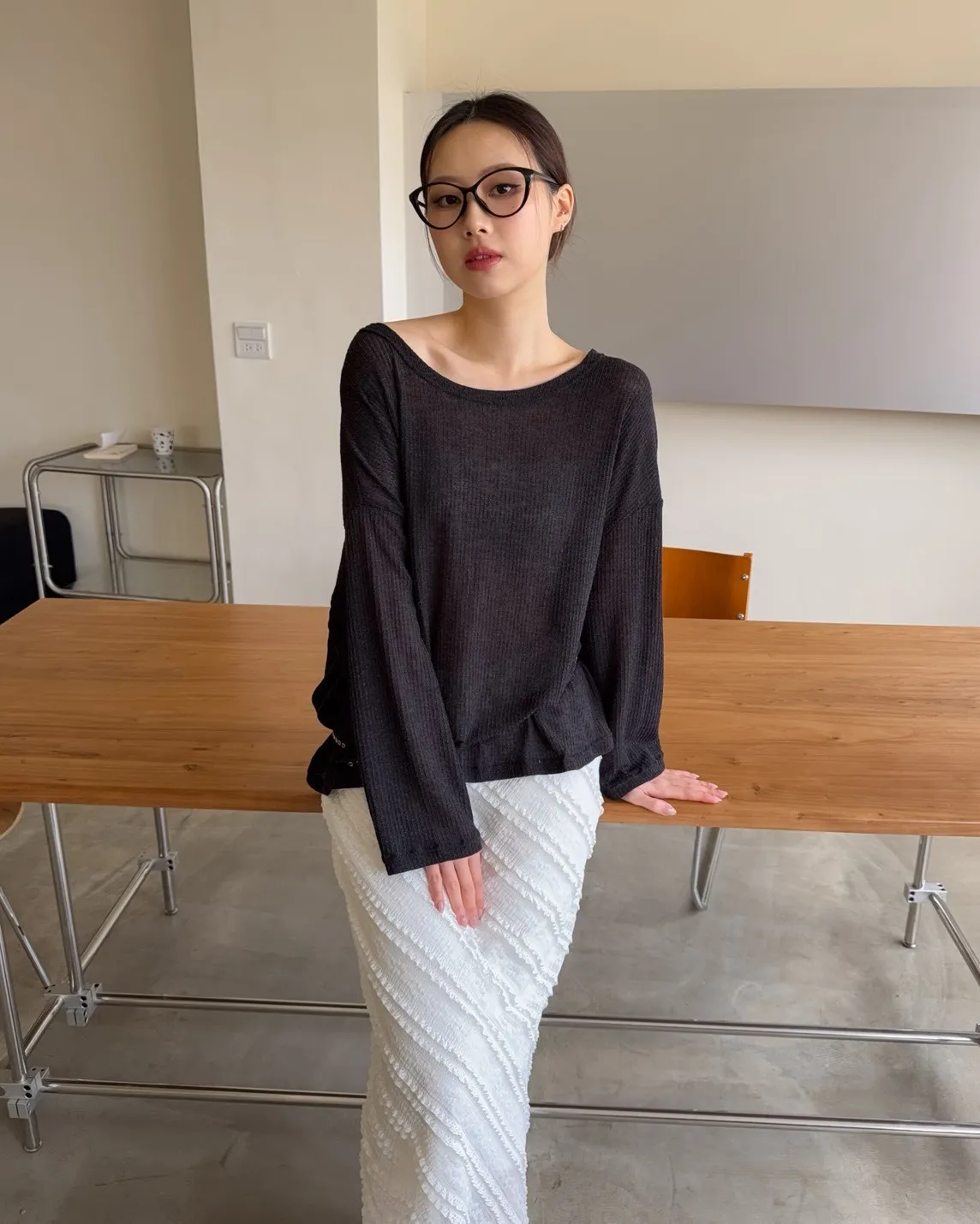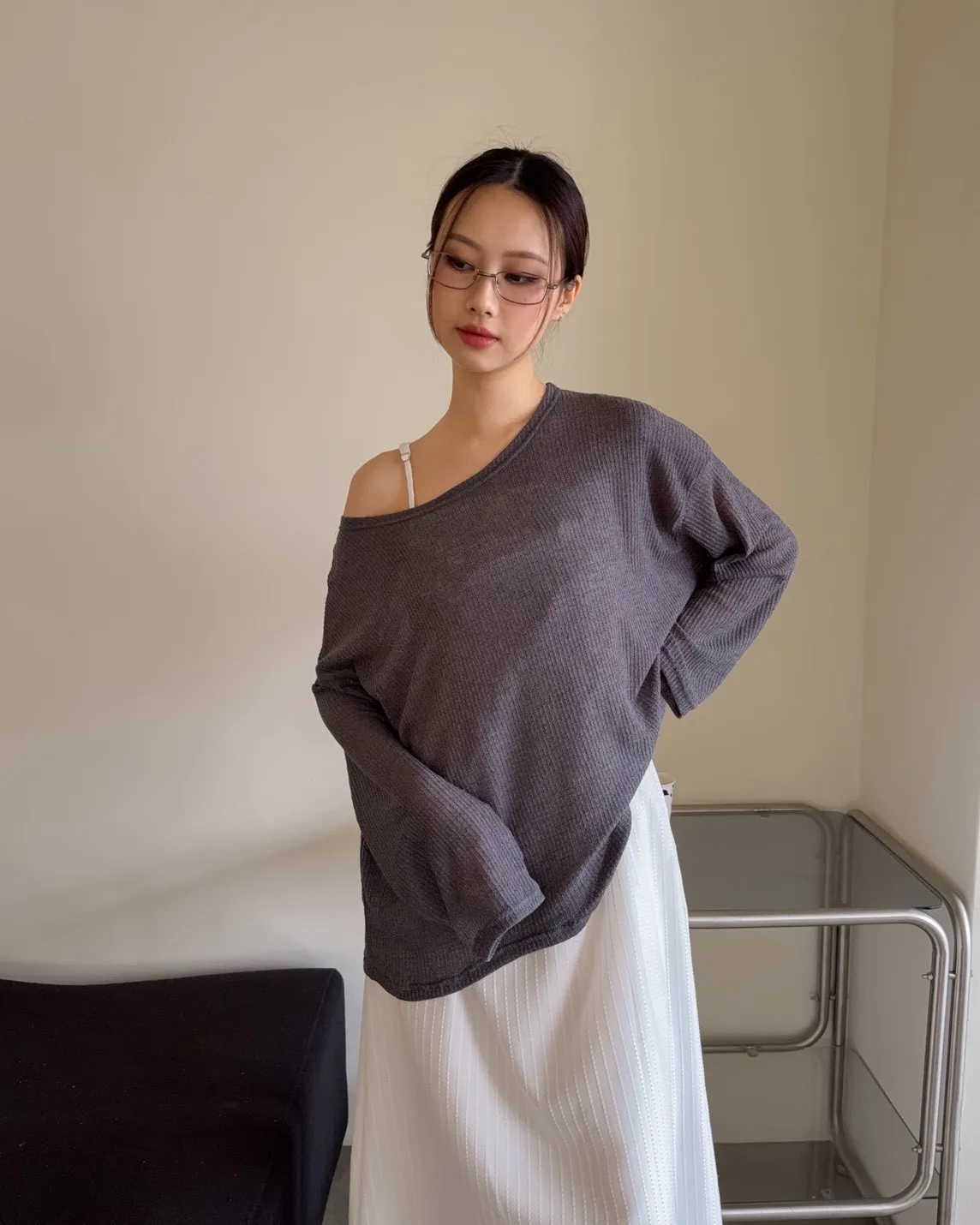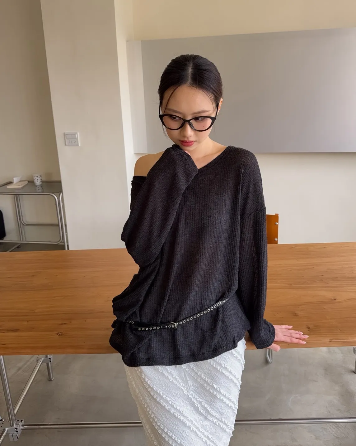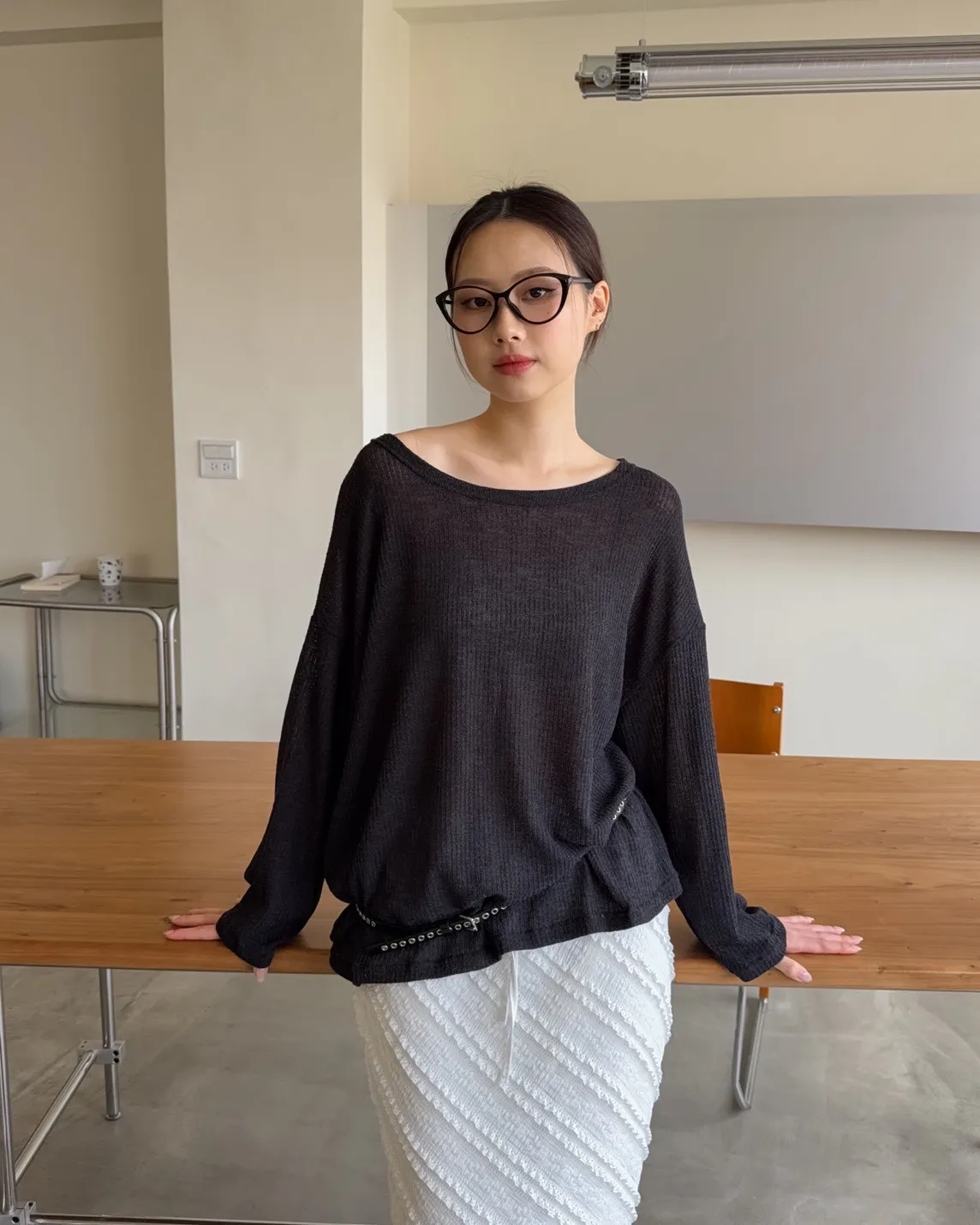 彈性大領口 露出鎖骨顯瘦 可斜肩 微透薄針織 寬版