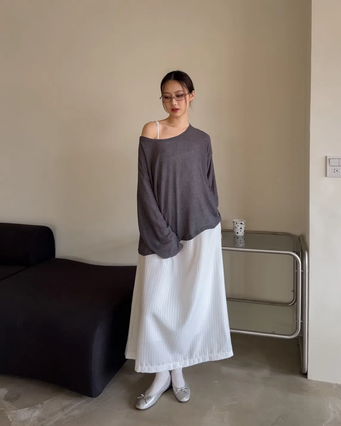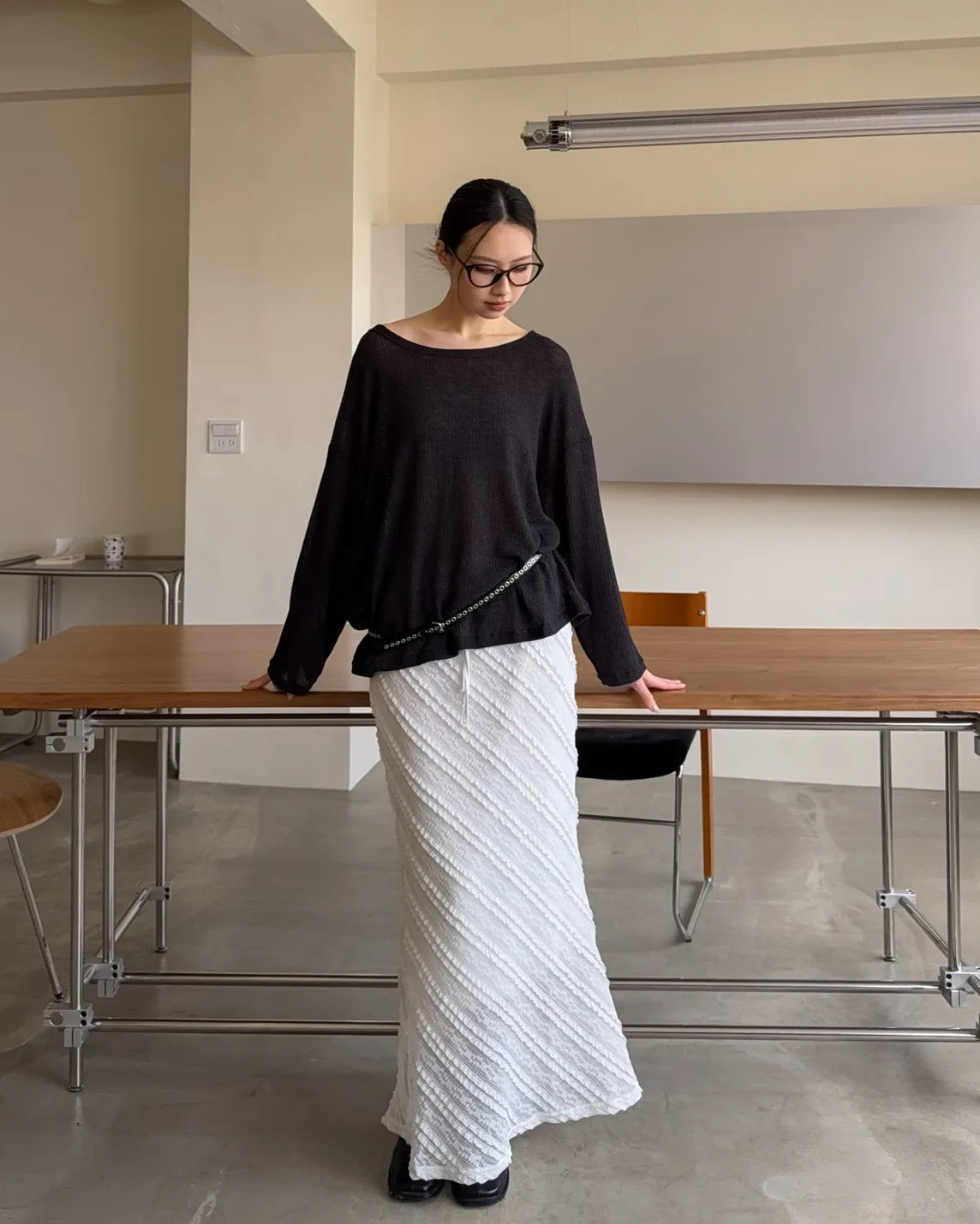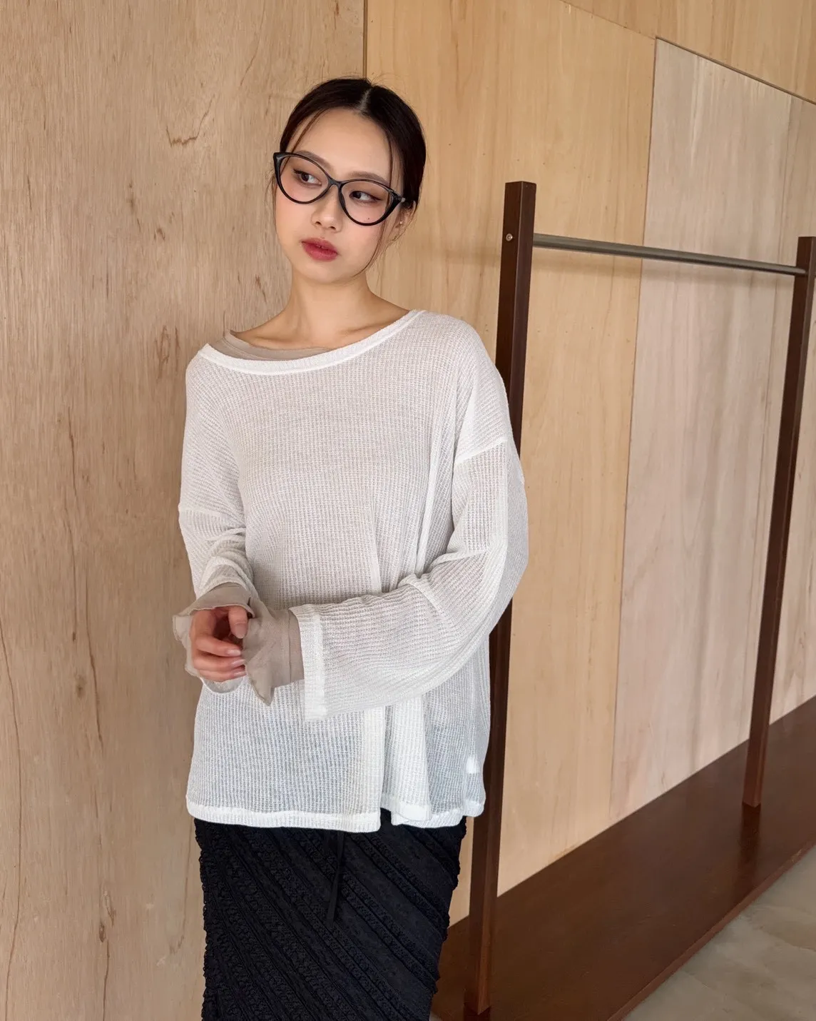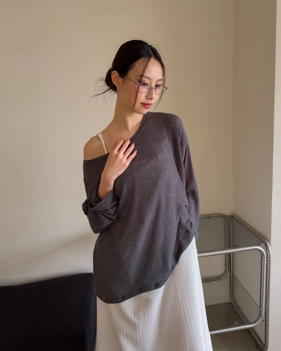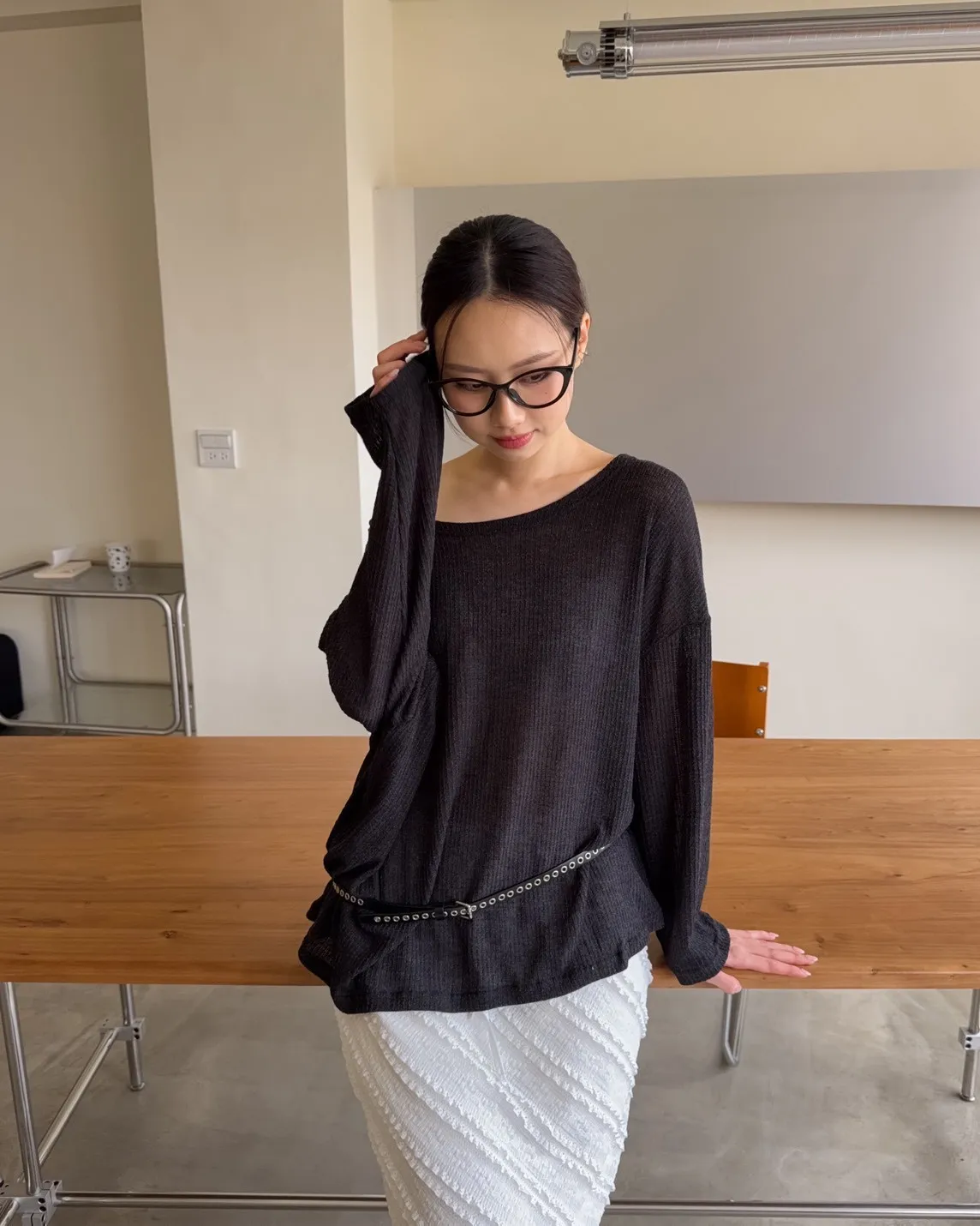 彈性大領口 露出鎖骨顯瘦 可斜肩 微透薄針織 寬版