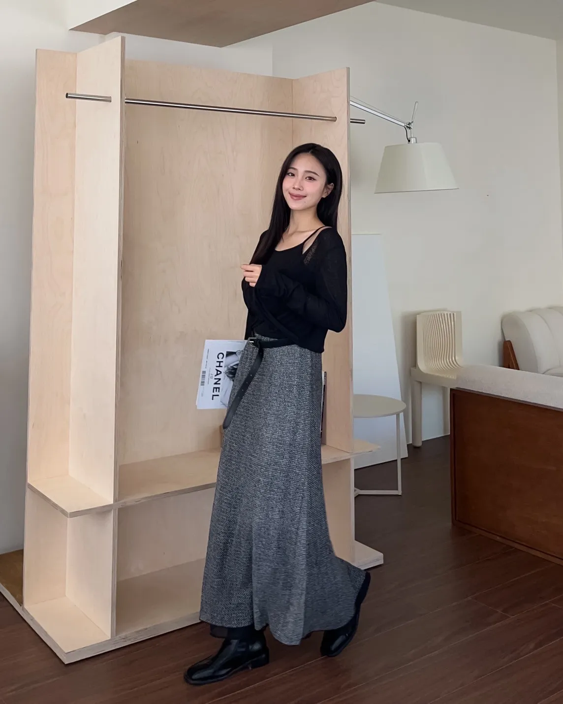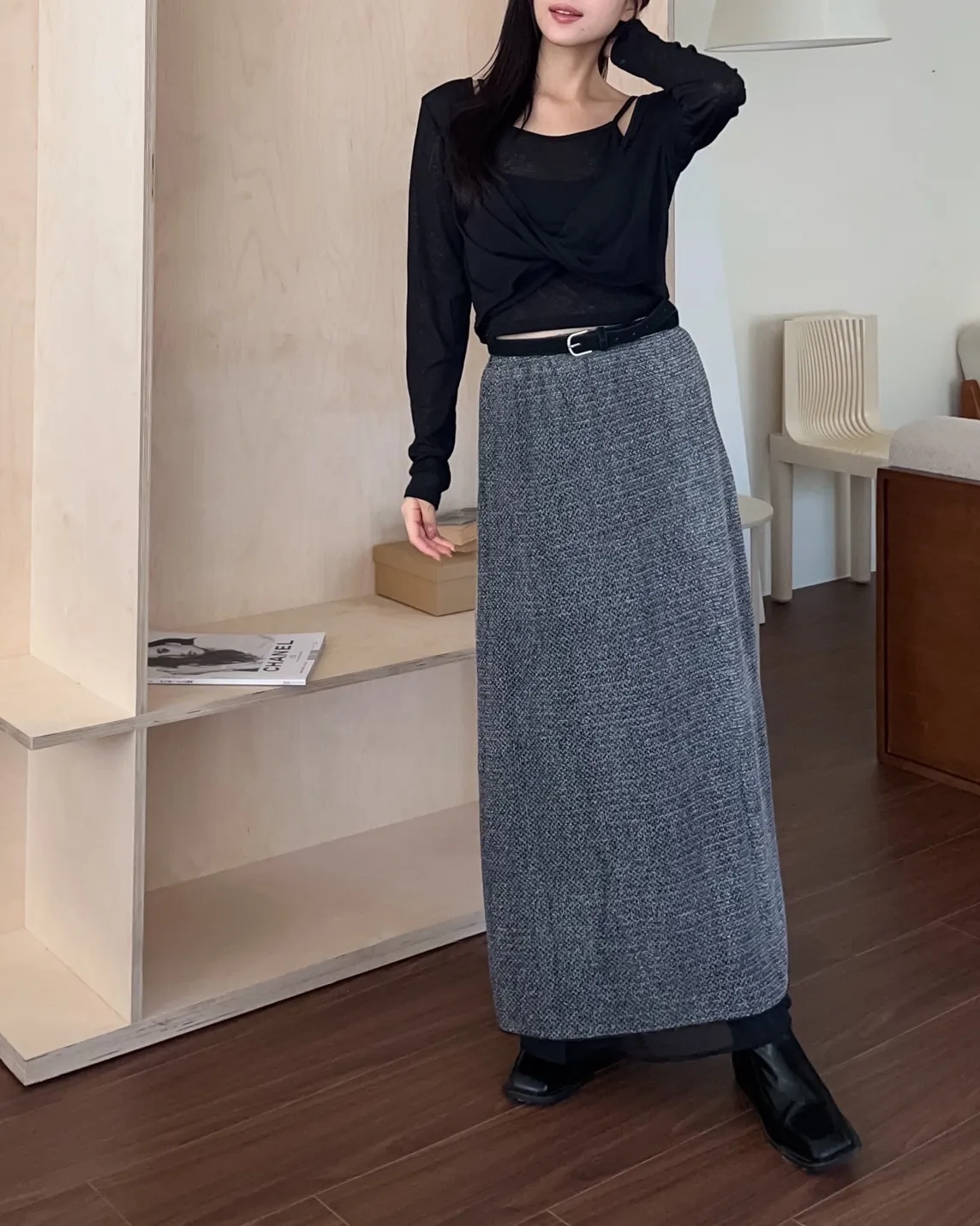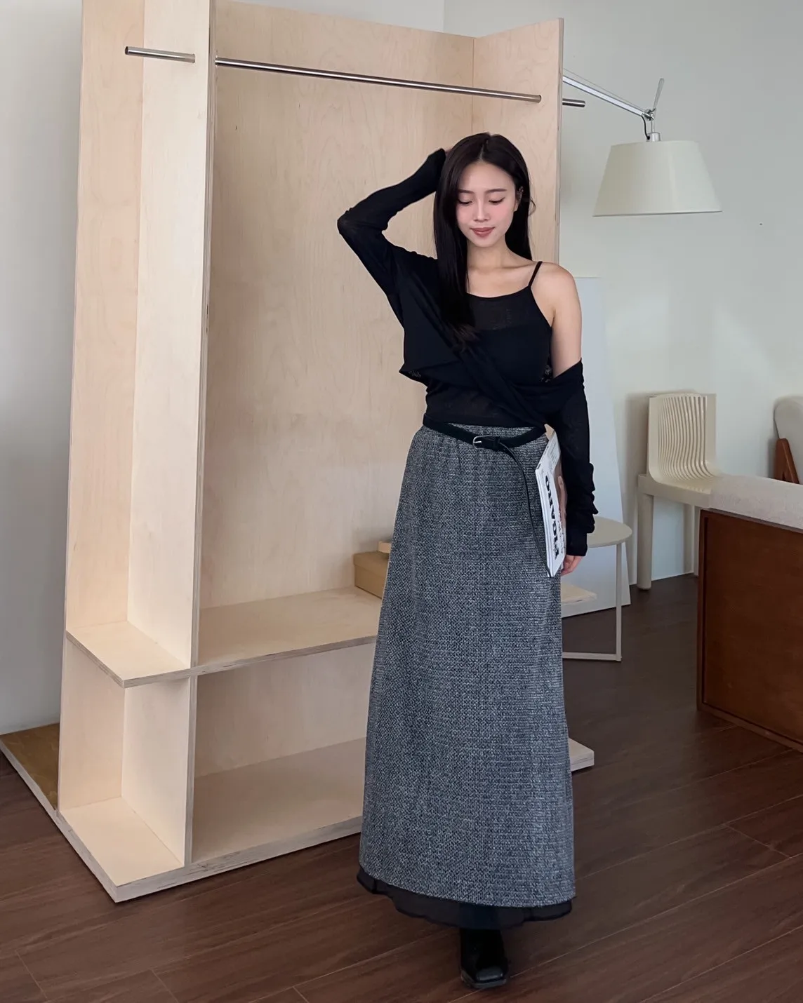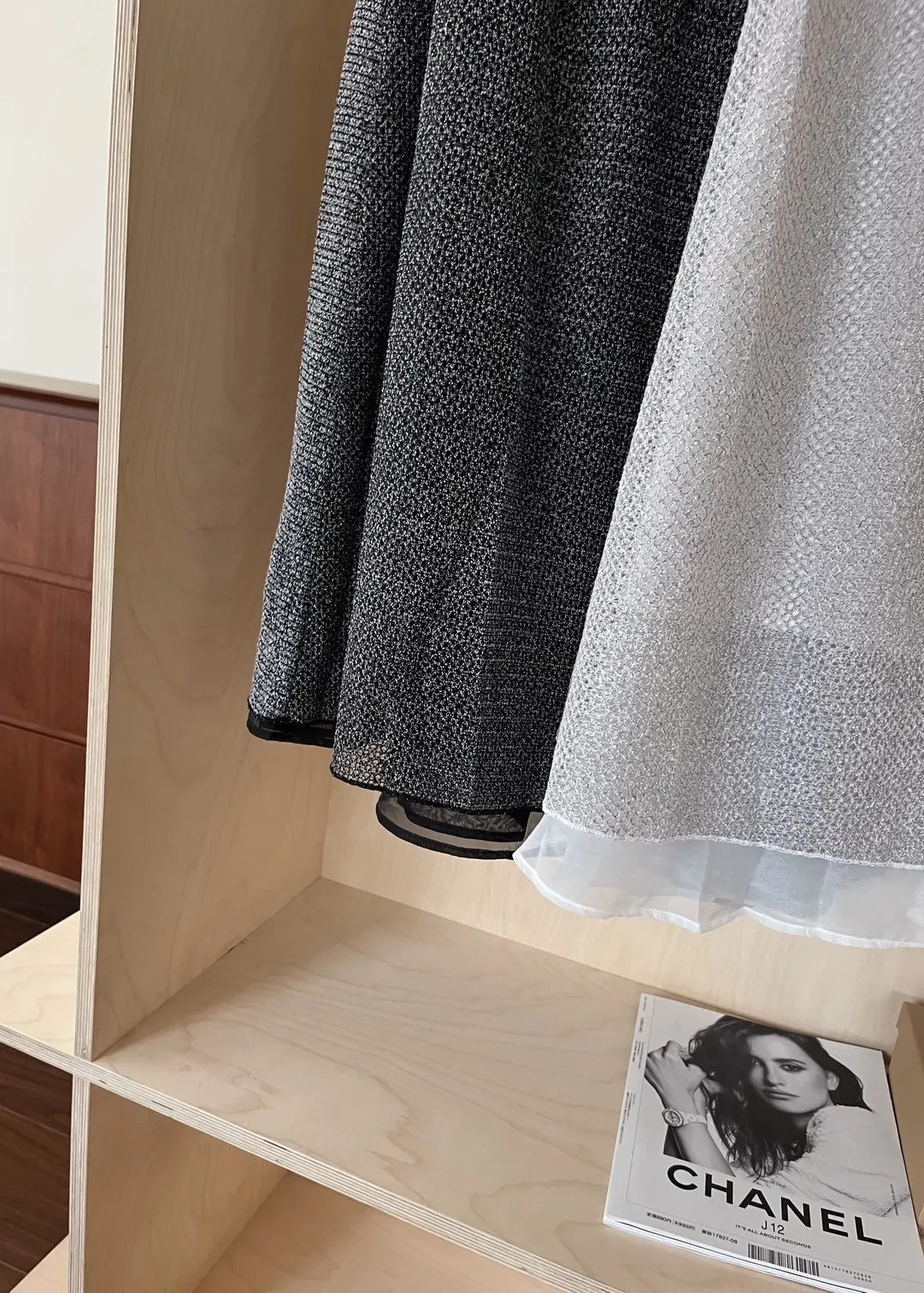 T0041小香風下擺透紗雙層長裙(灰/黑)