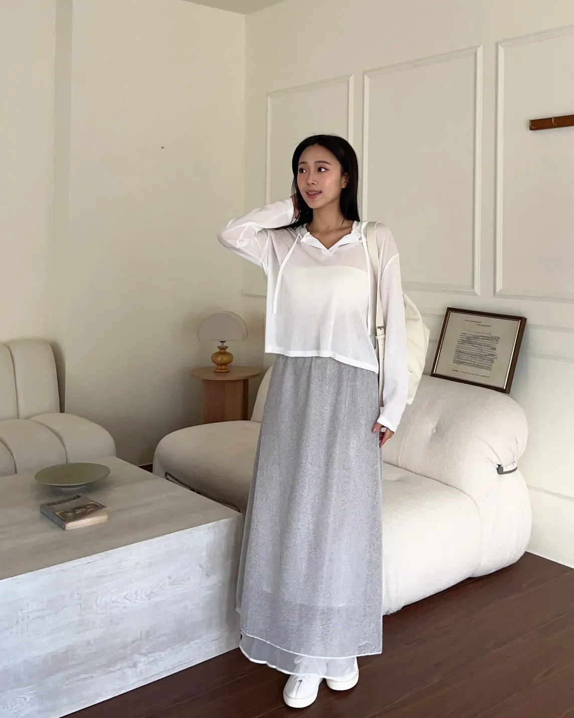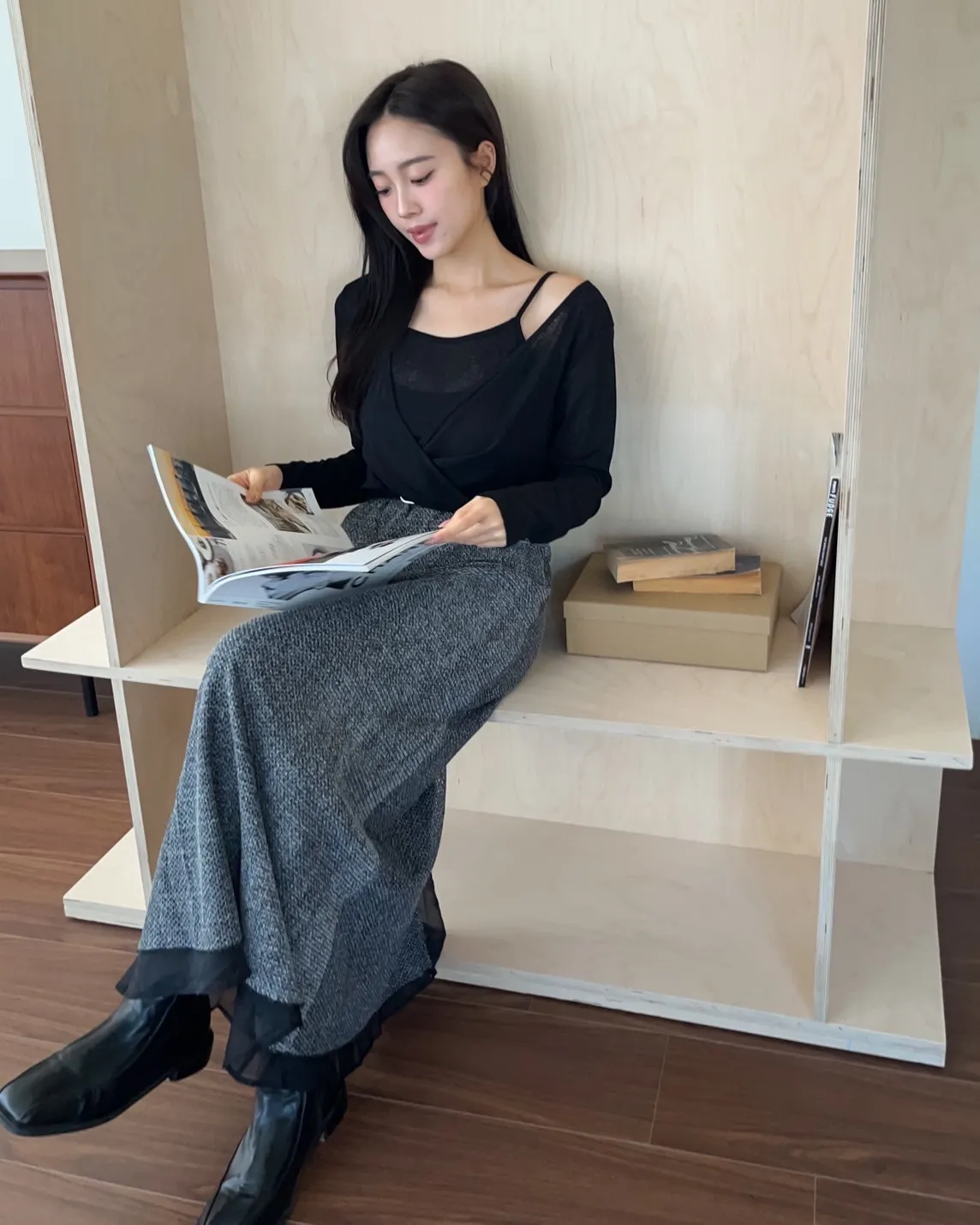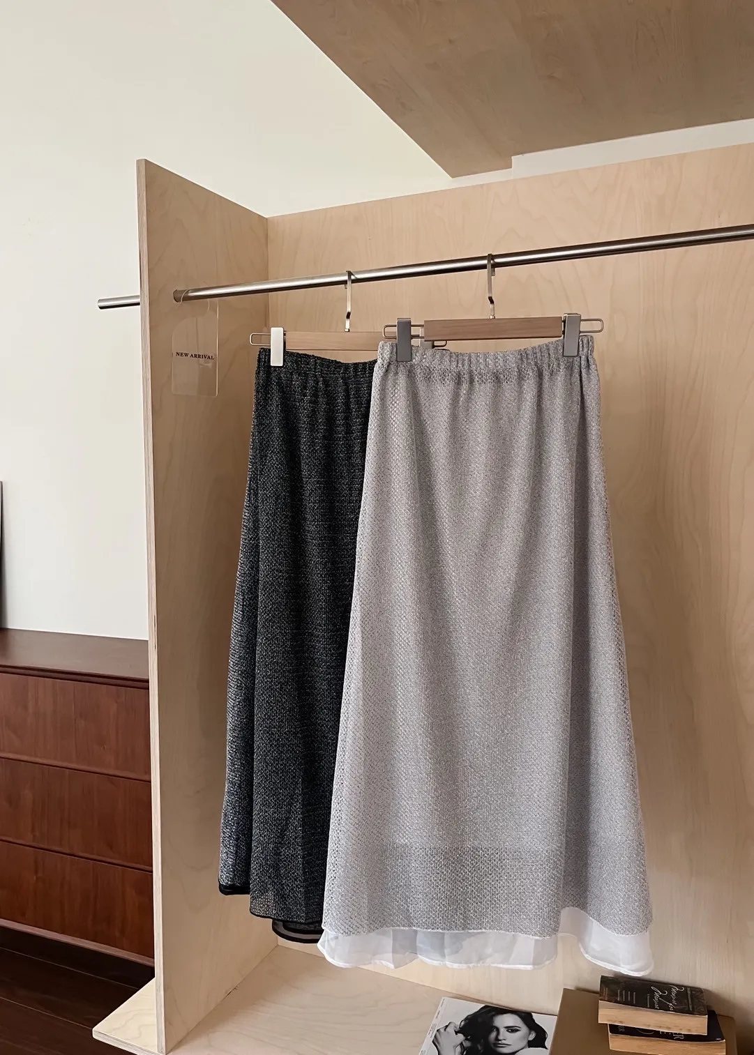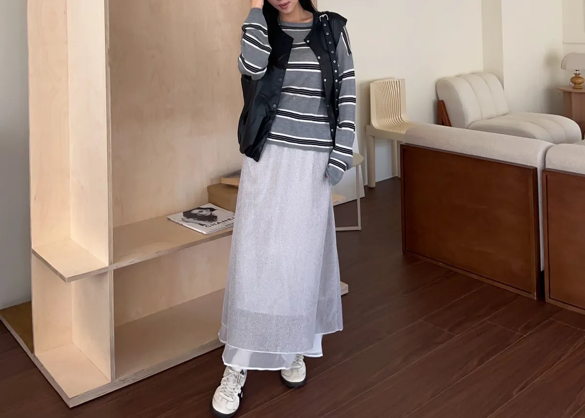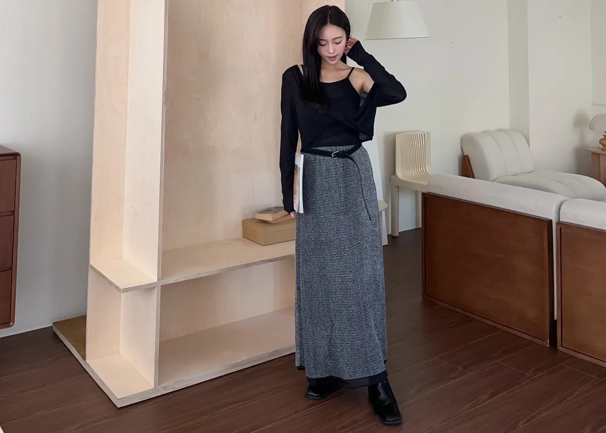 T0041小香風下擺透紗雙層長裙(灰/黑)