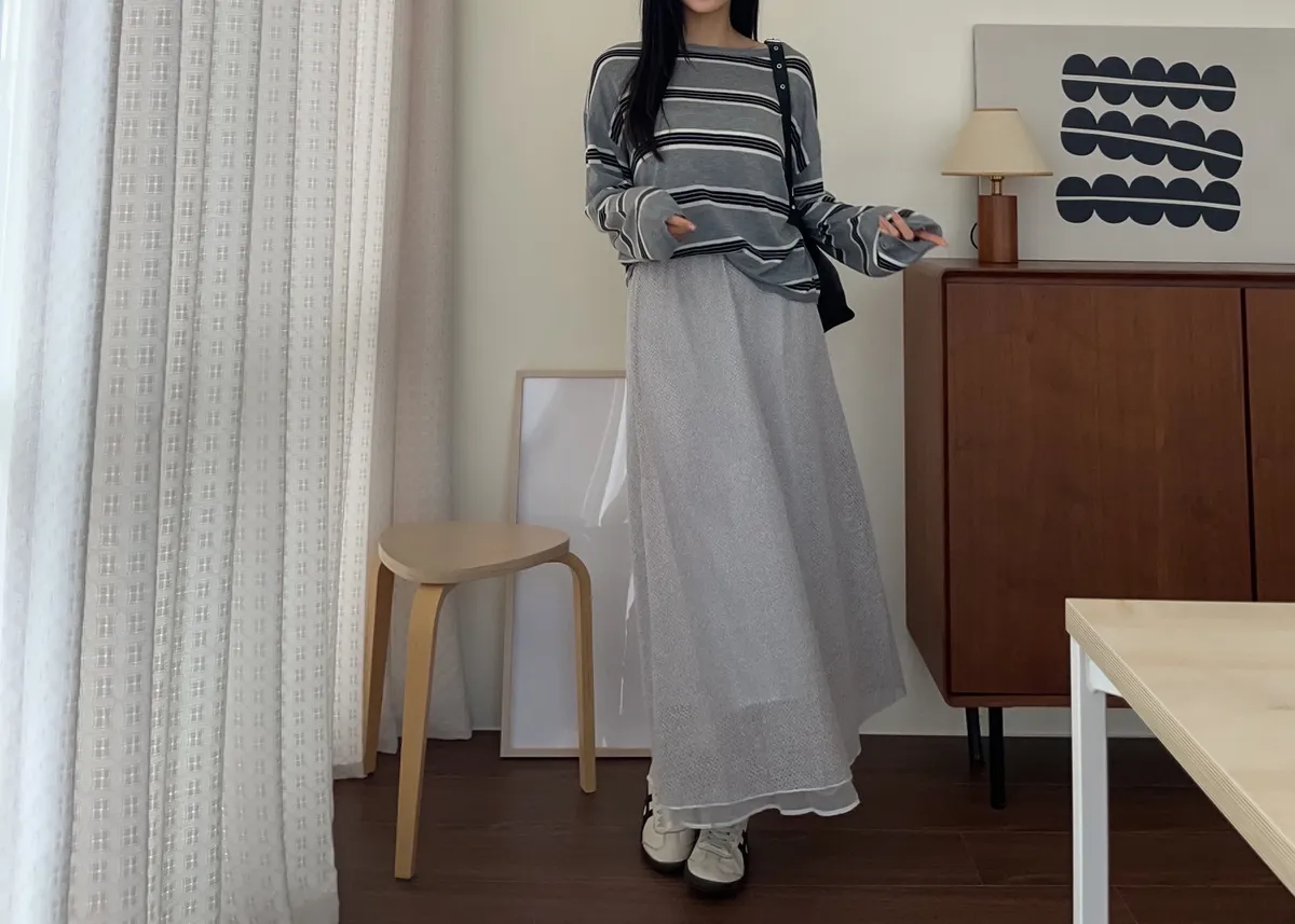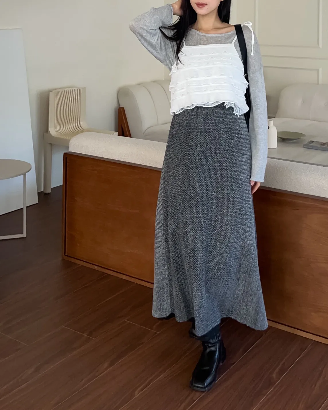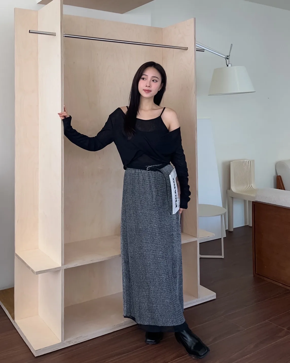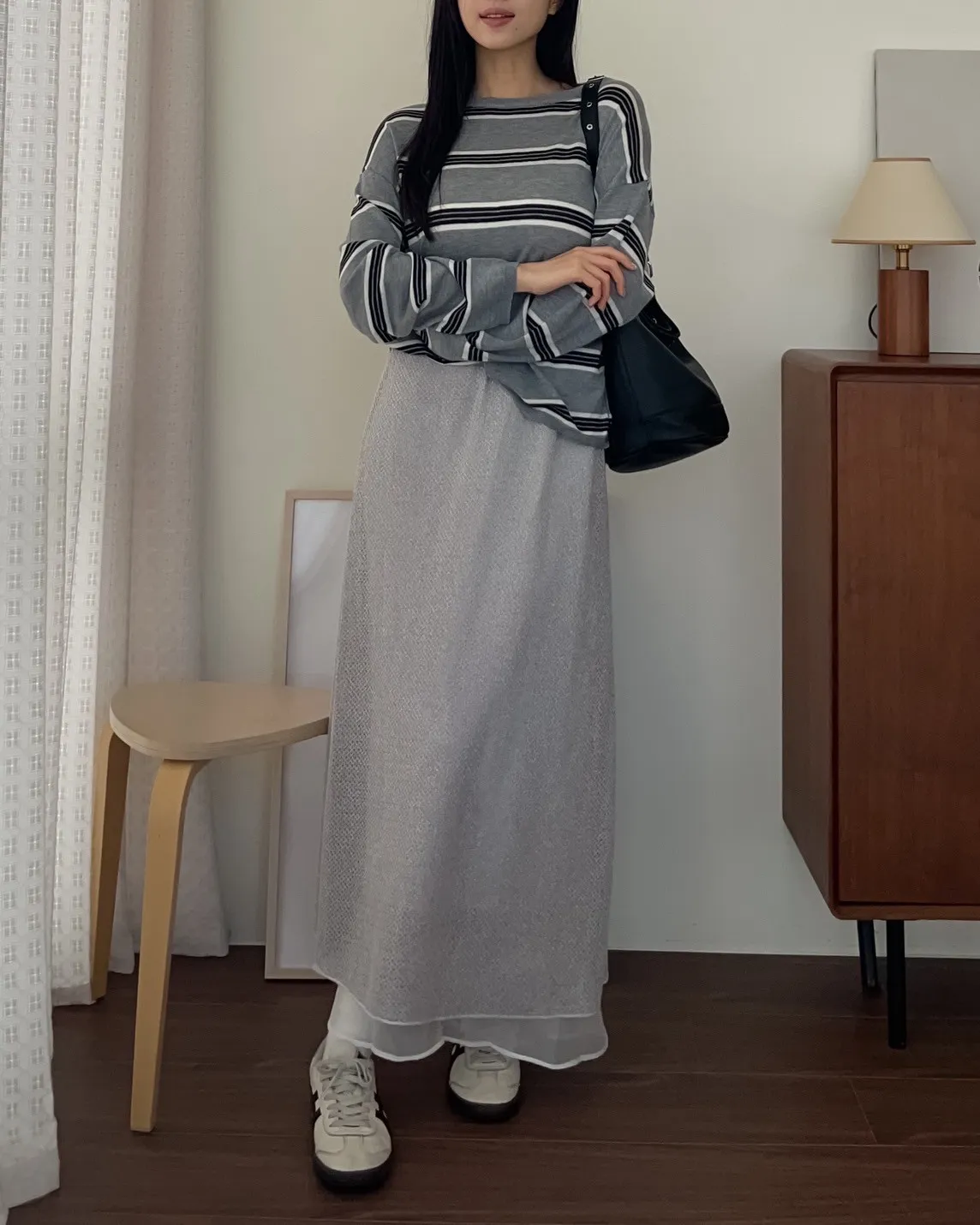 T0041小香風下擺透紗雙層長裙(灰/黑)