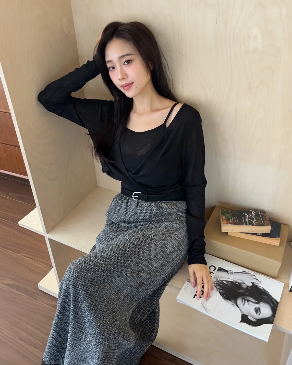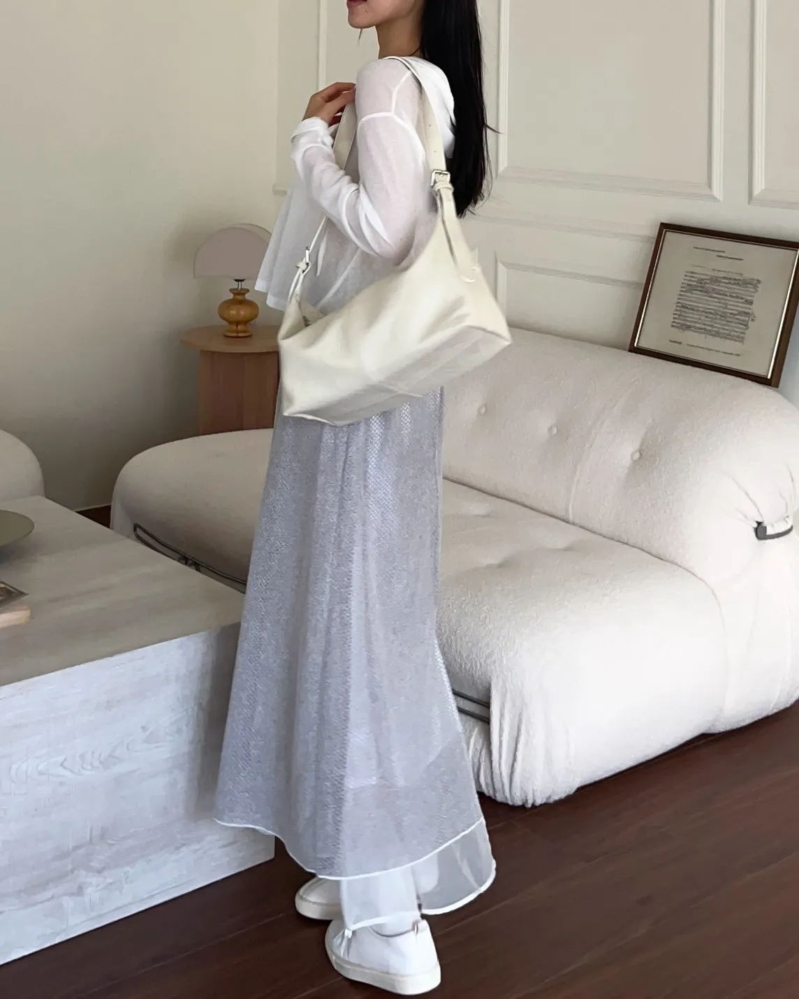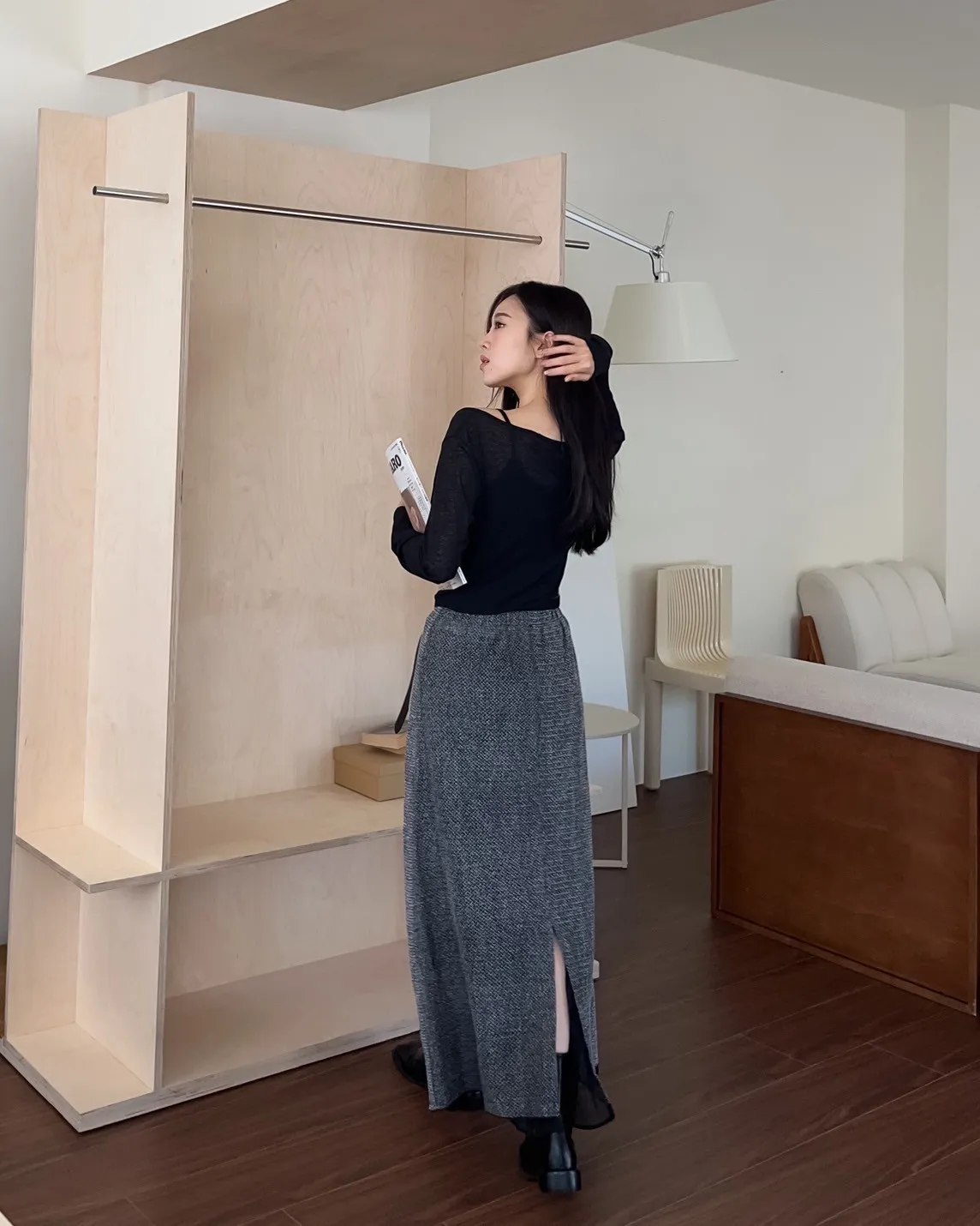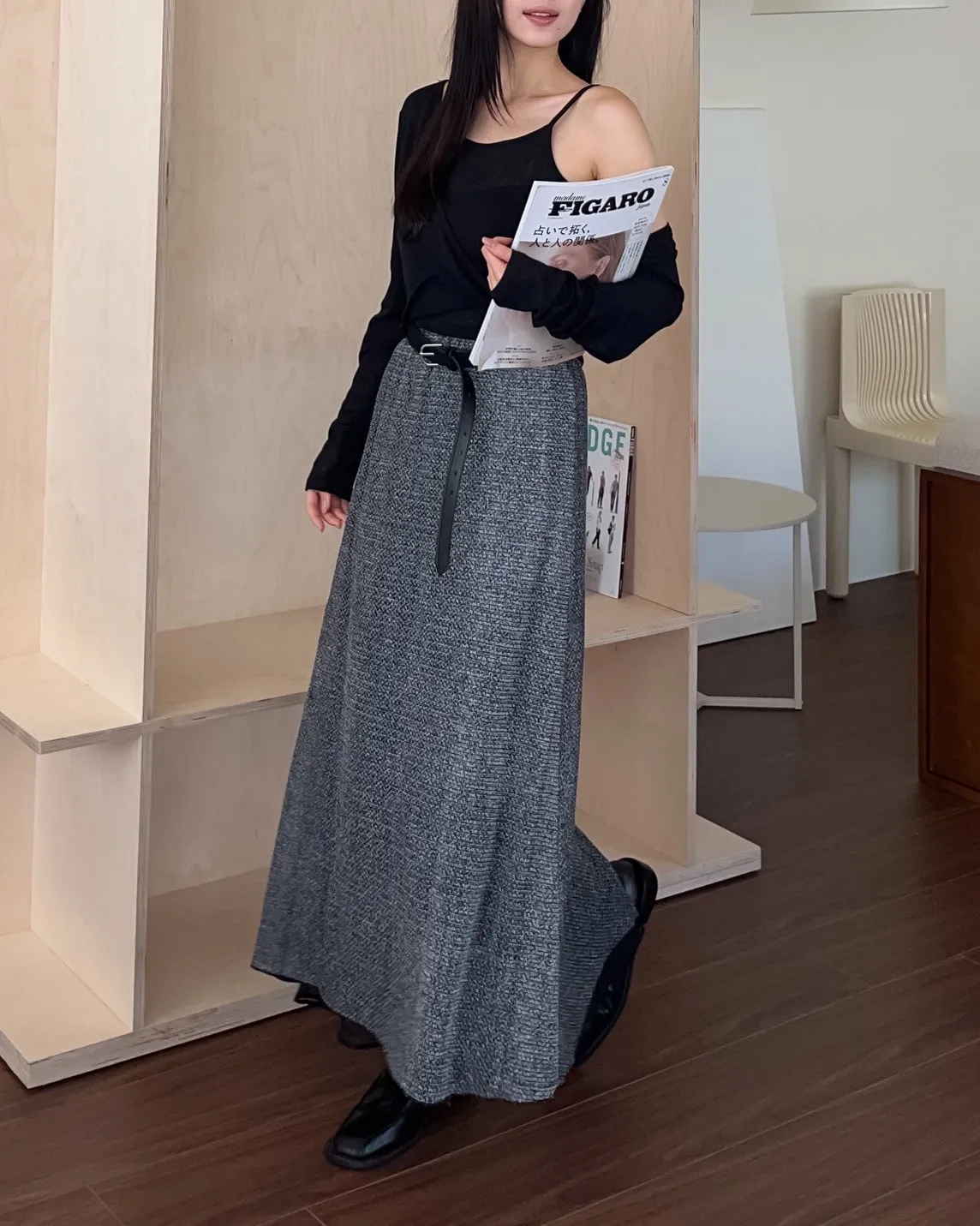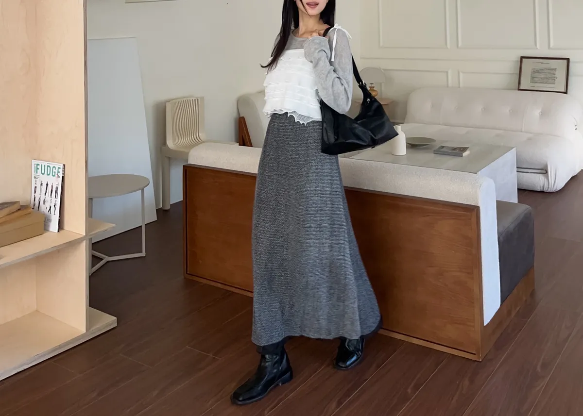 T0041小香風下擺透紗雙層長裙(灰/黑)