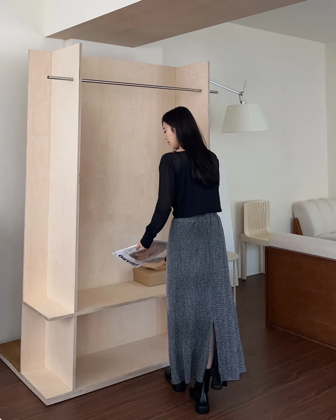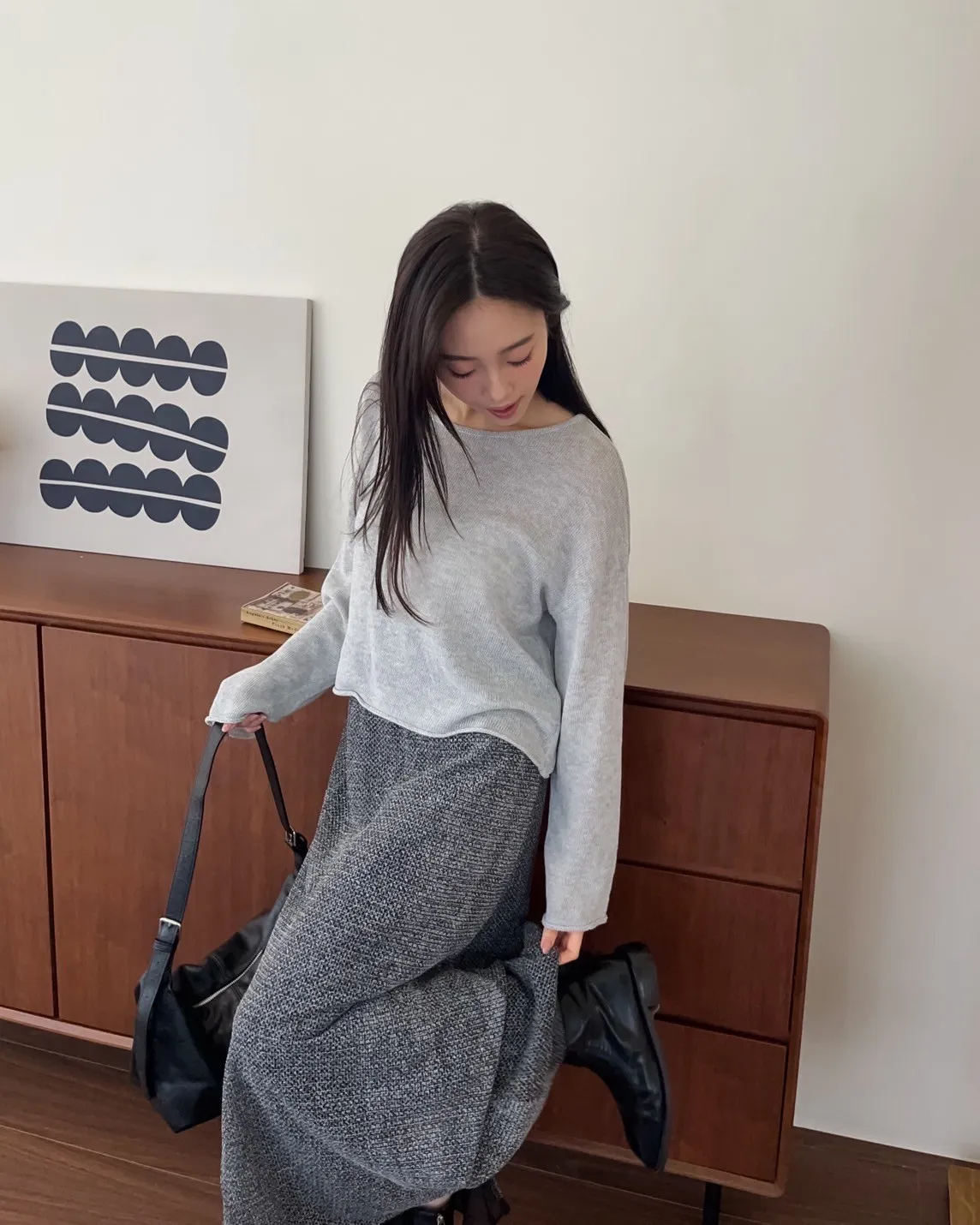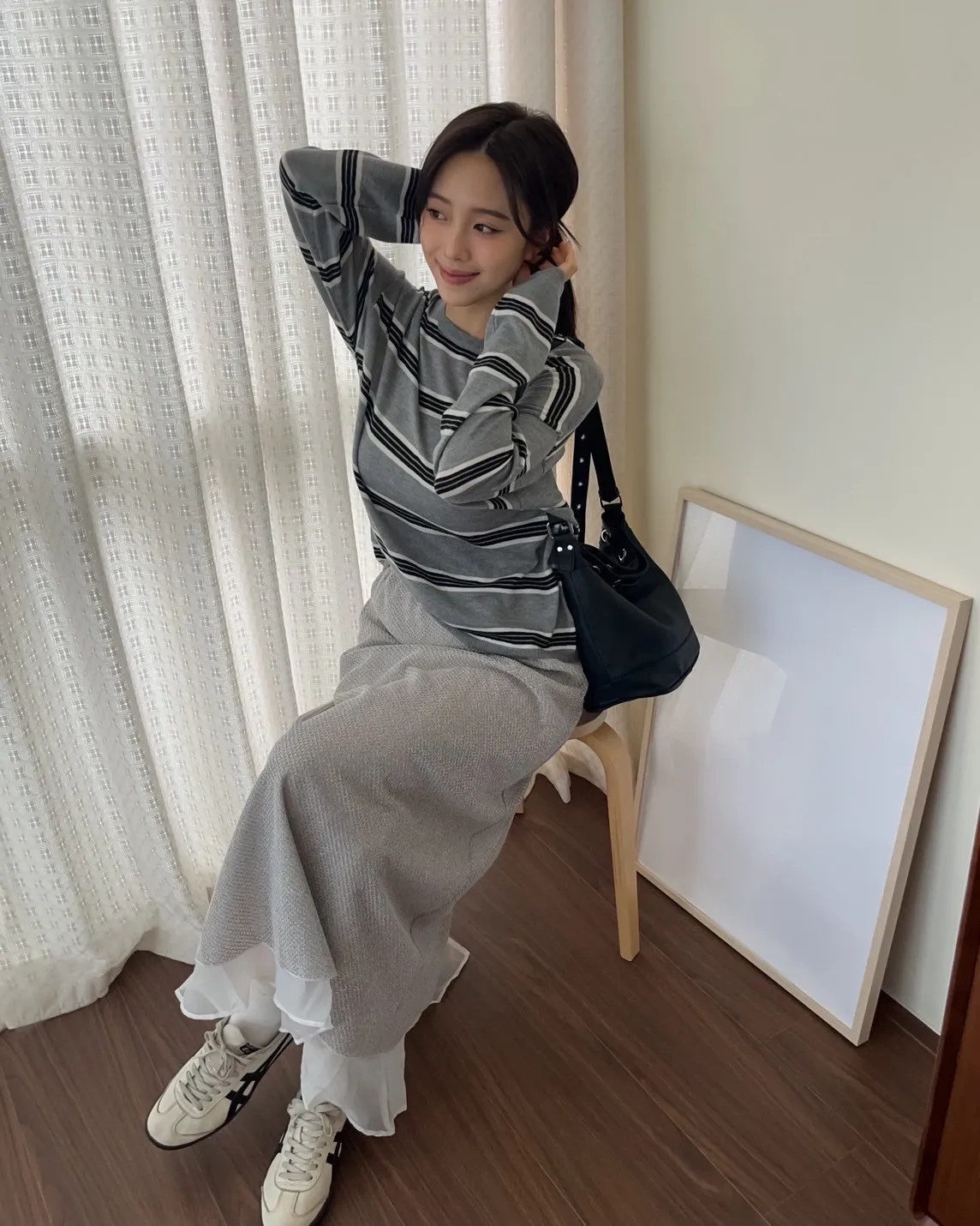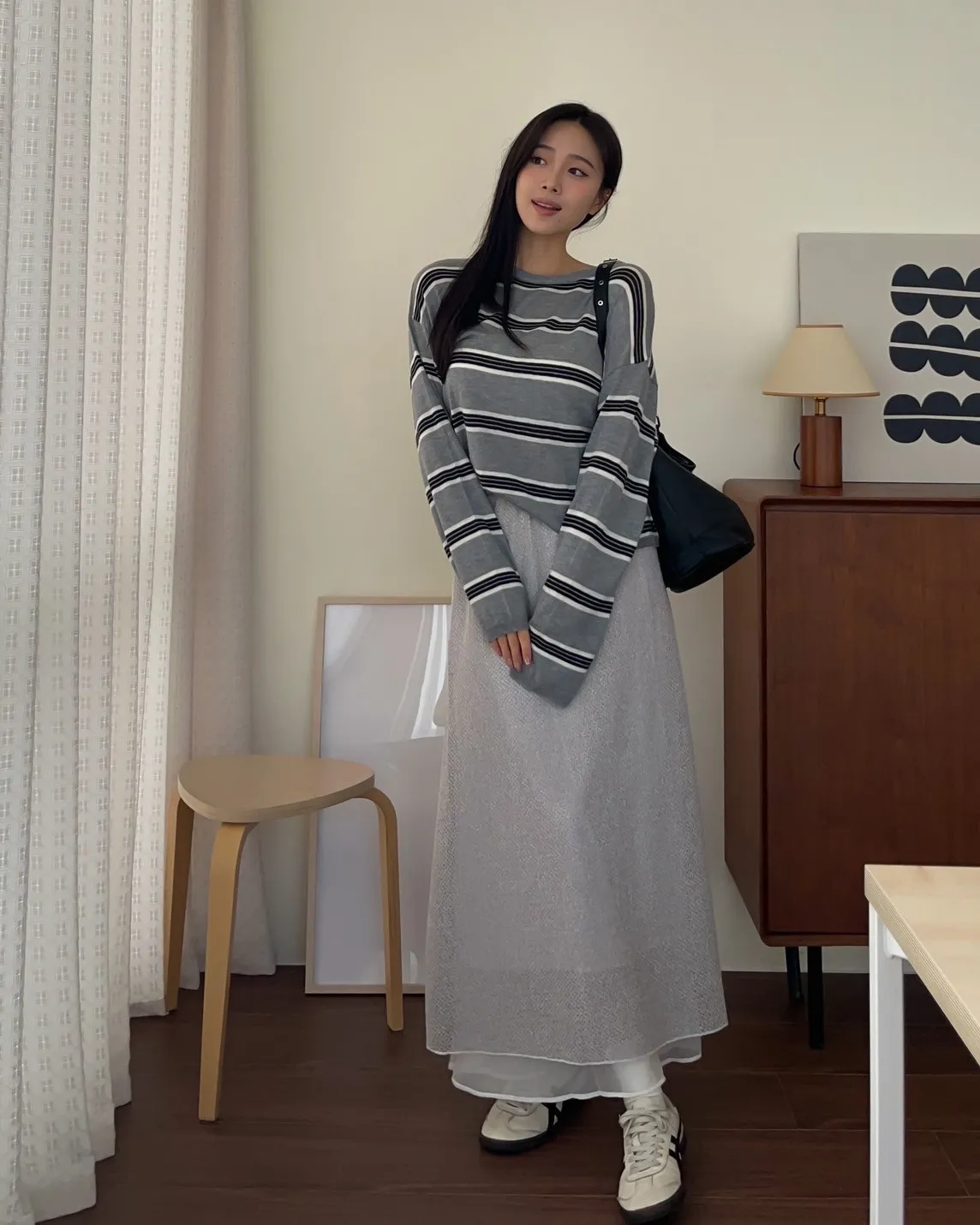 T0041小香風下擺透紗雙層長裙(灰/黑)