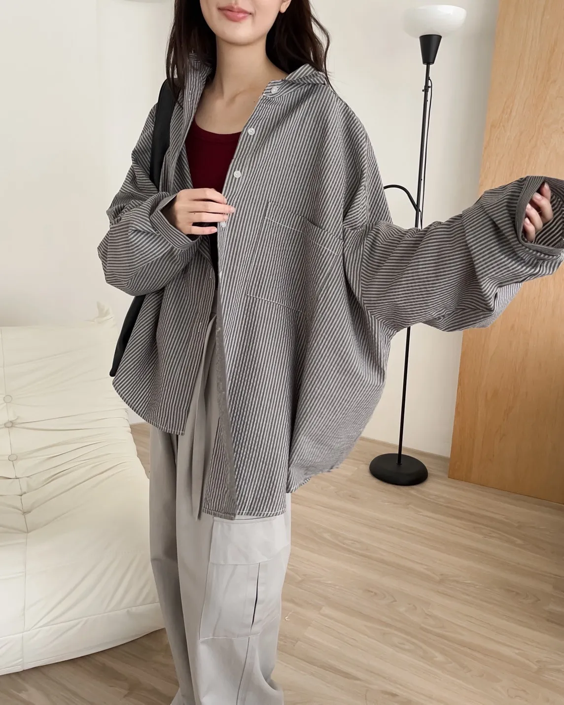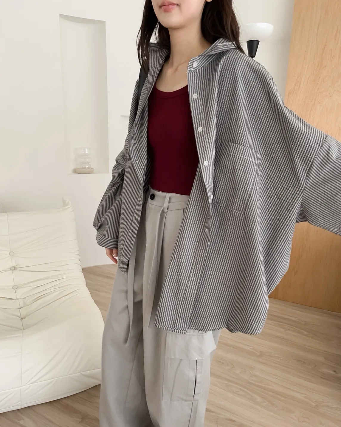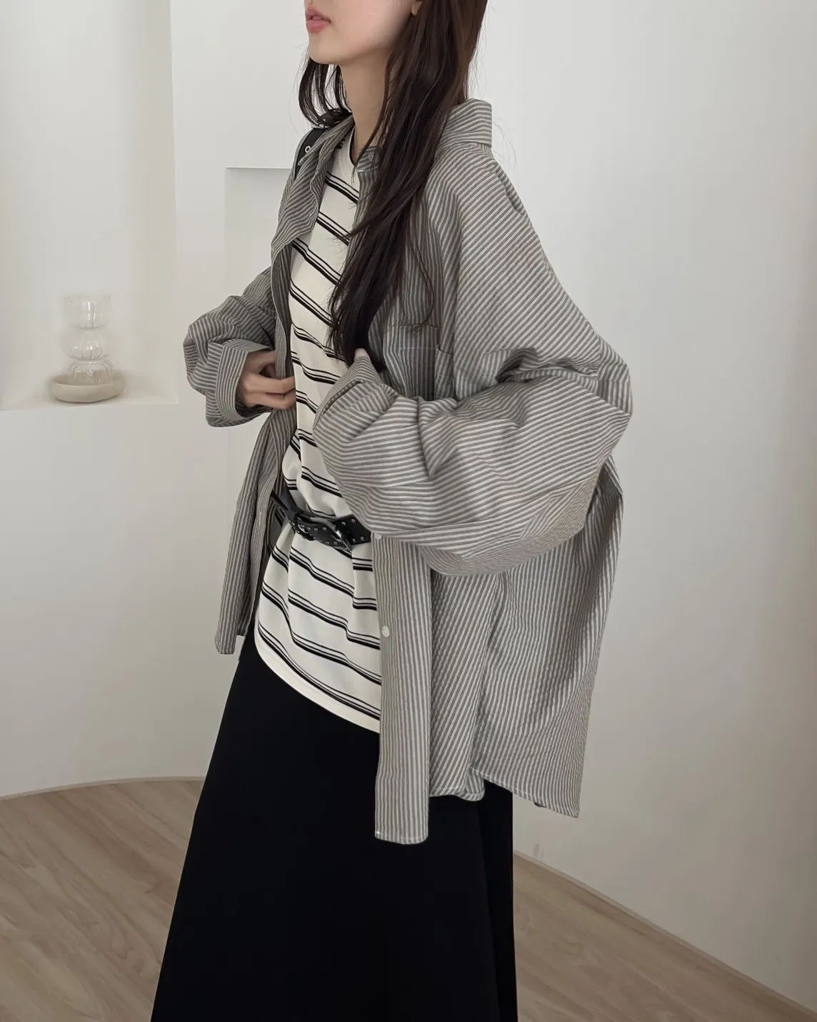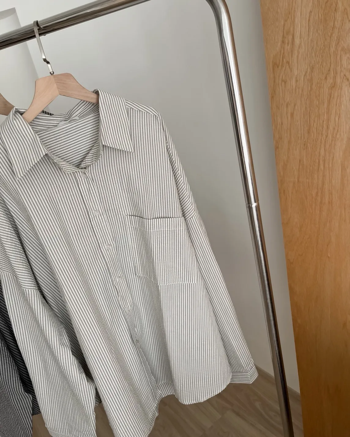 寬鬆落肩 前短後長 直條紋 棉麻無彈性 胸前單側口袋