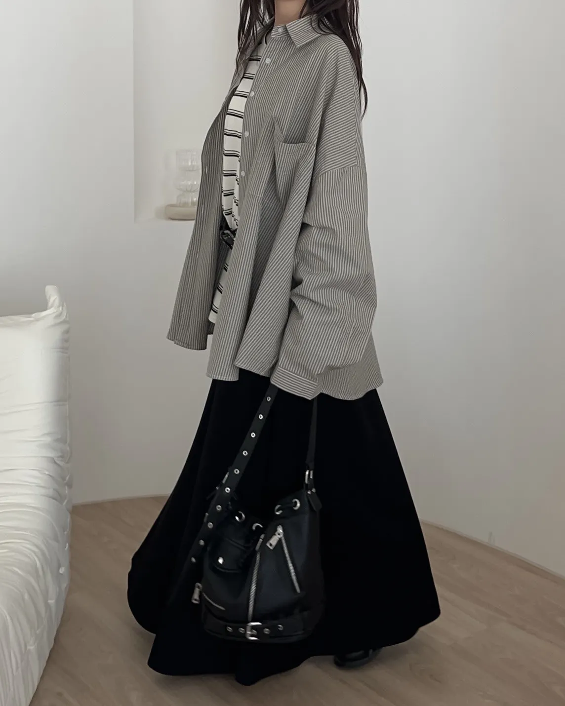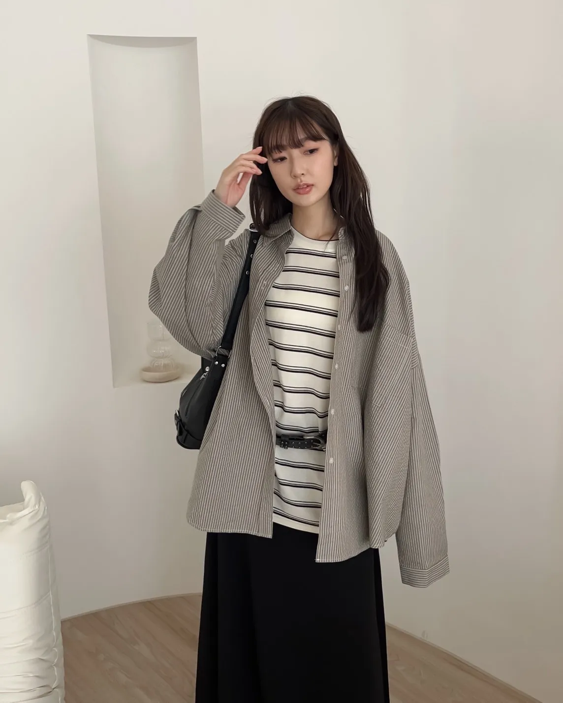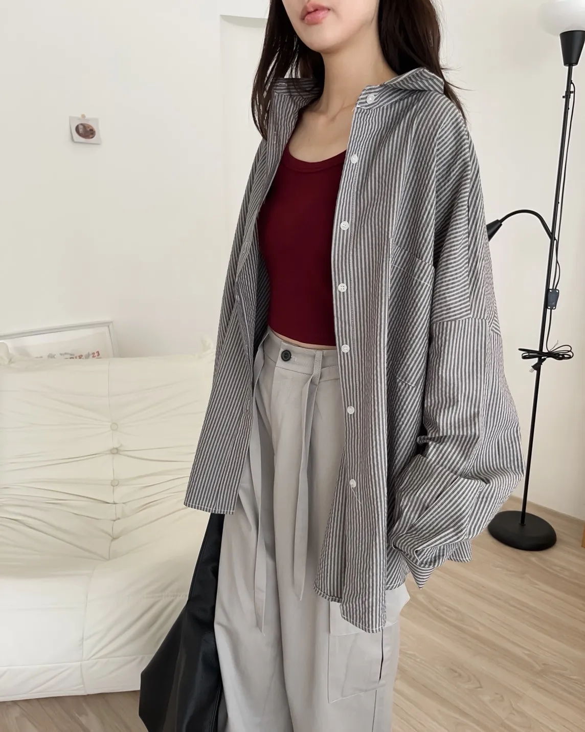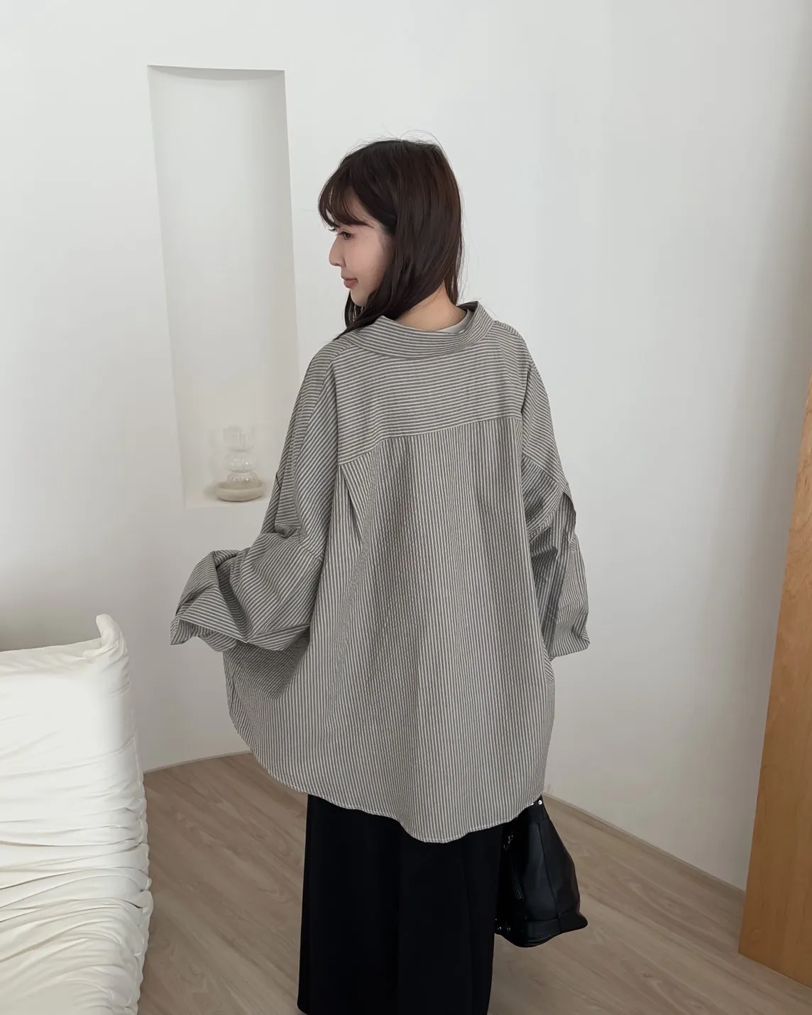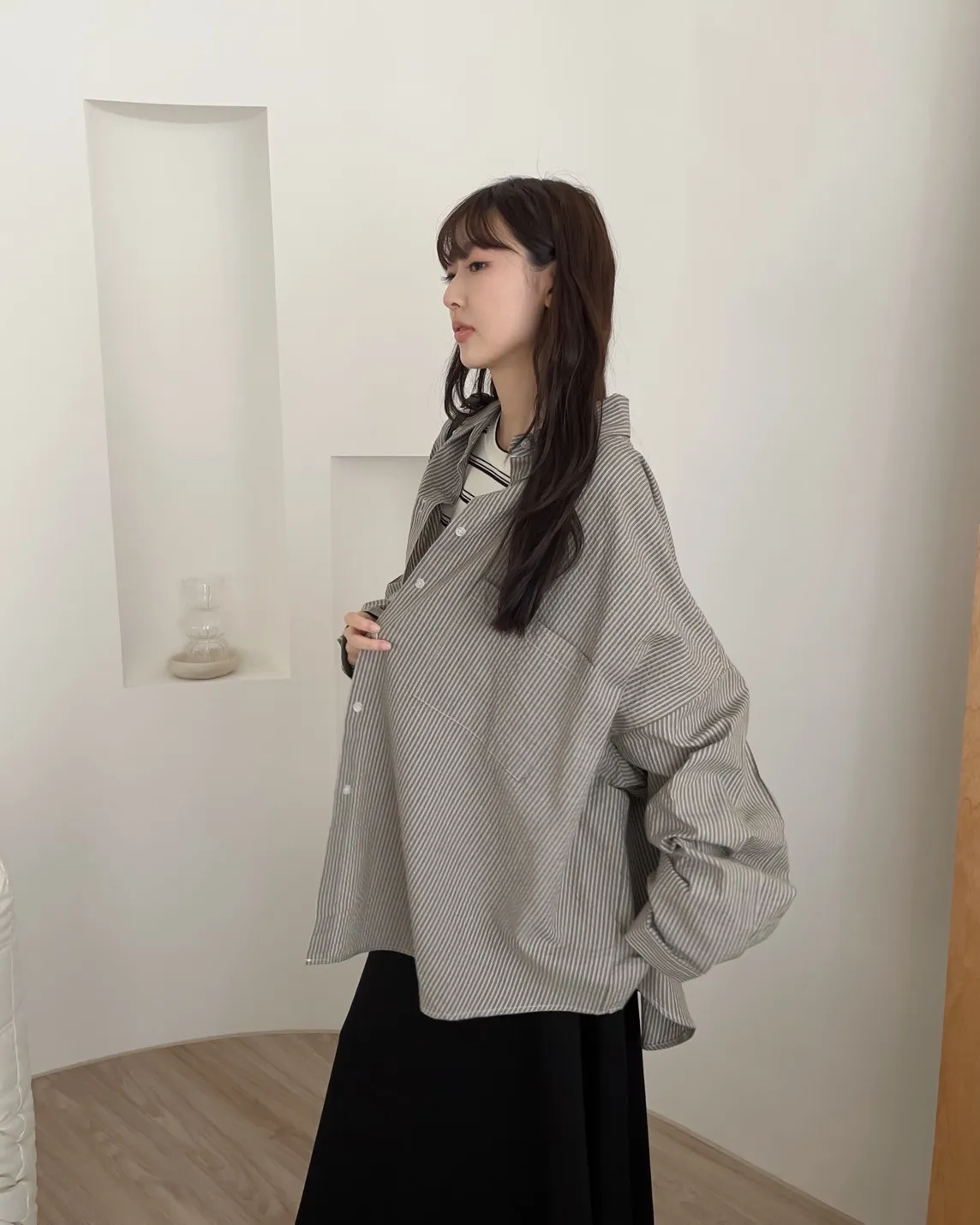 寬鬆落肩 前短後長 直條紋 棉麻無彈性 胸前單側口袋