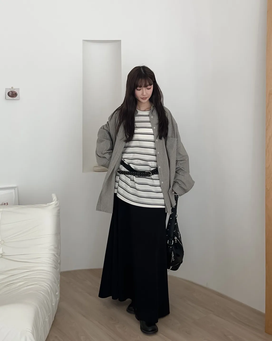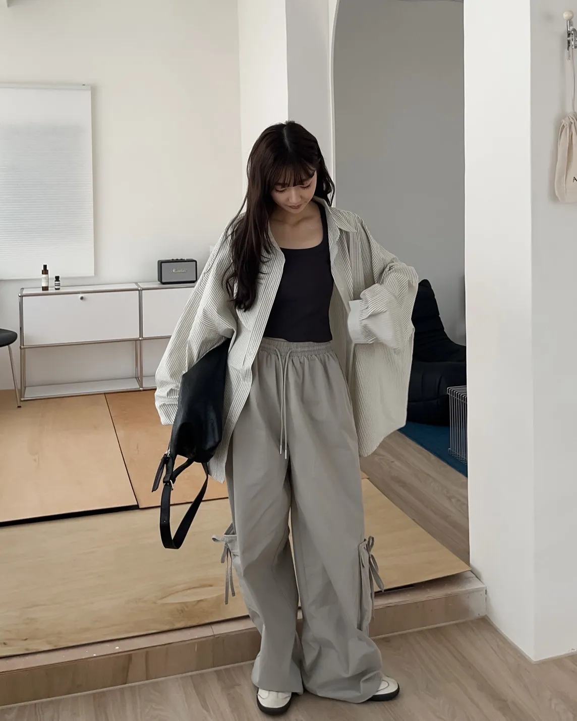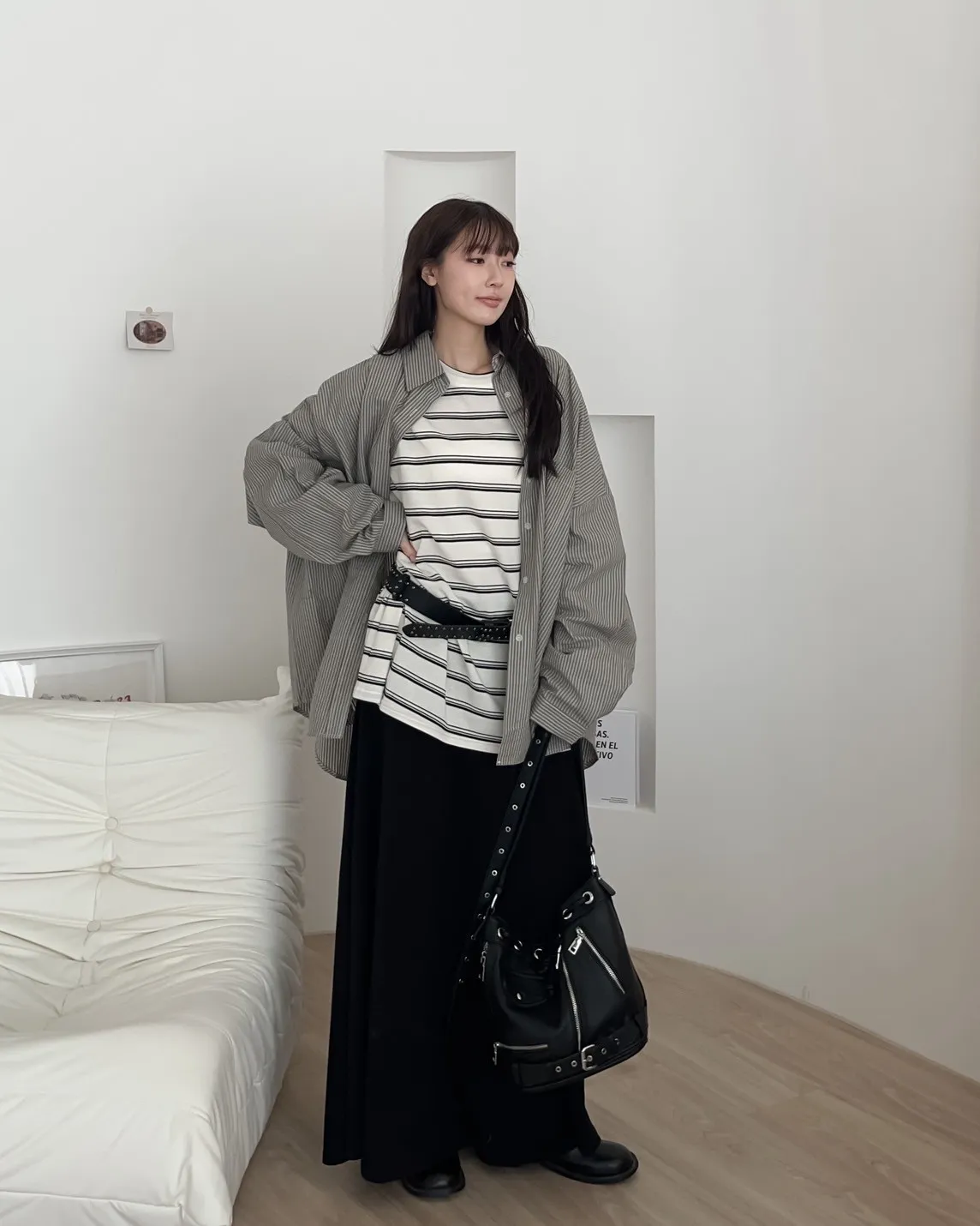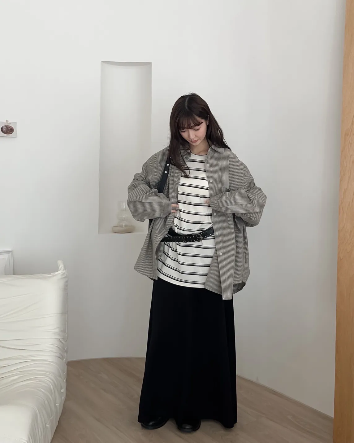 寬鬆落肩 前短後長 直條紋 棉麻無彈性 胸前單側口袋
