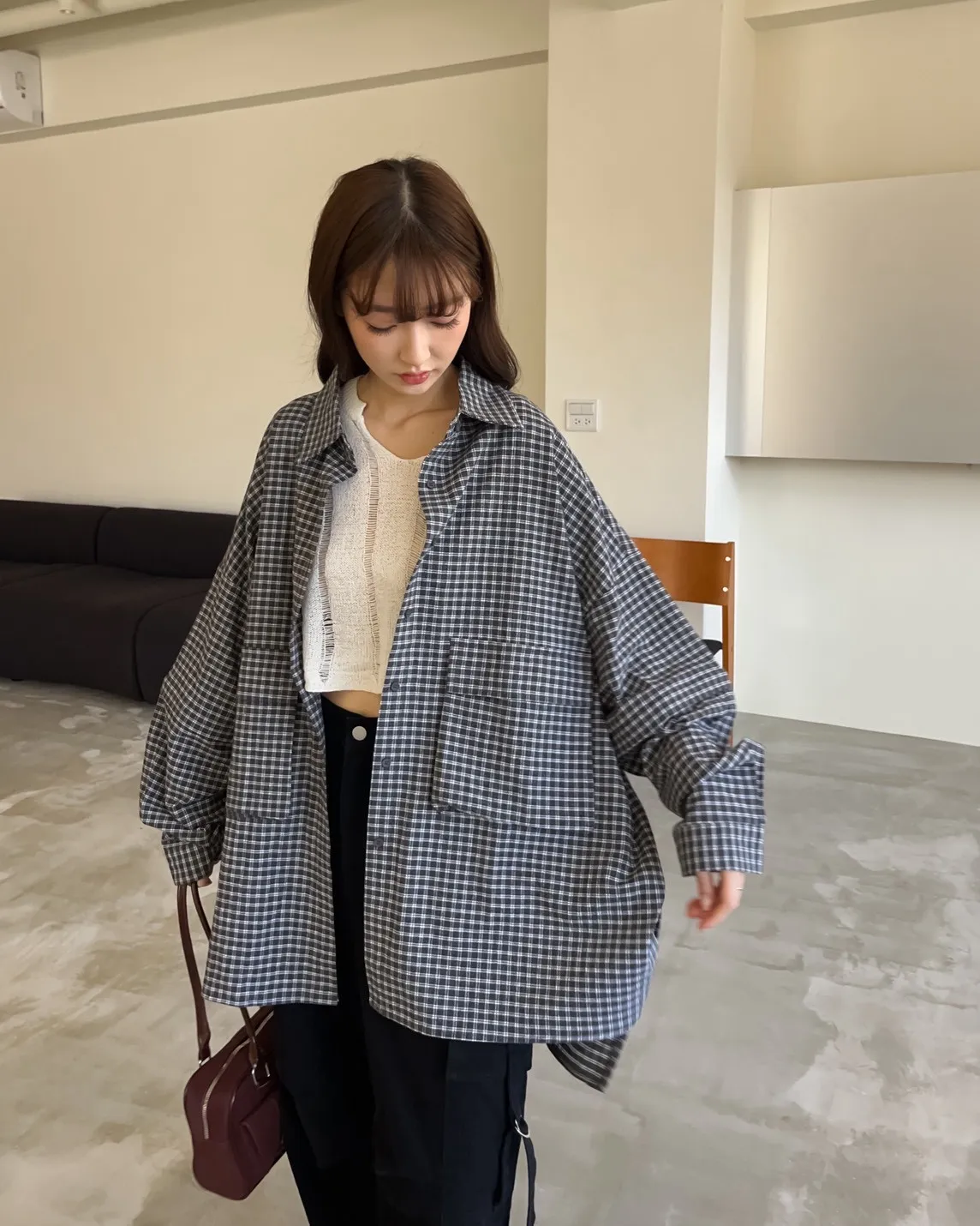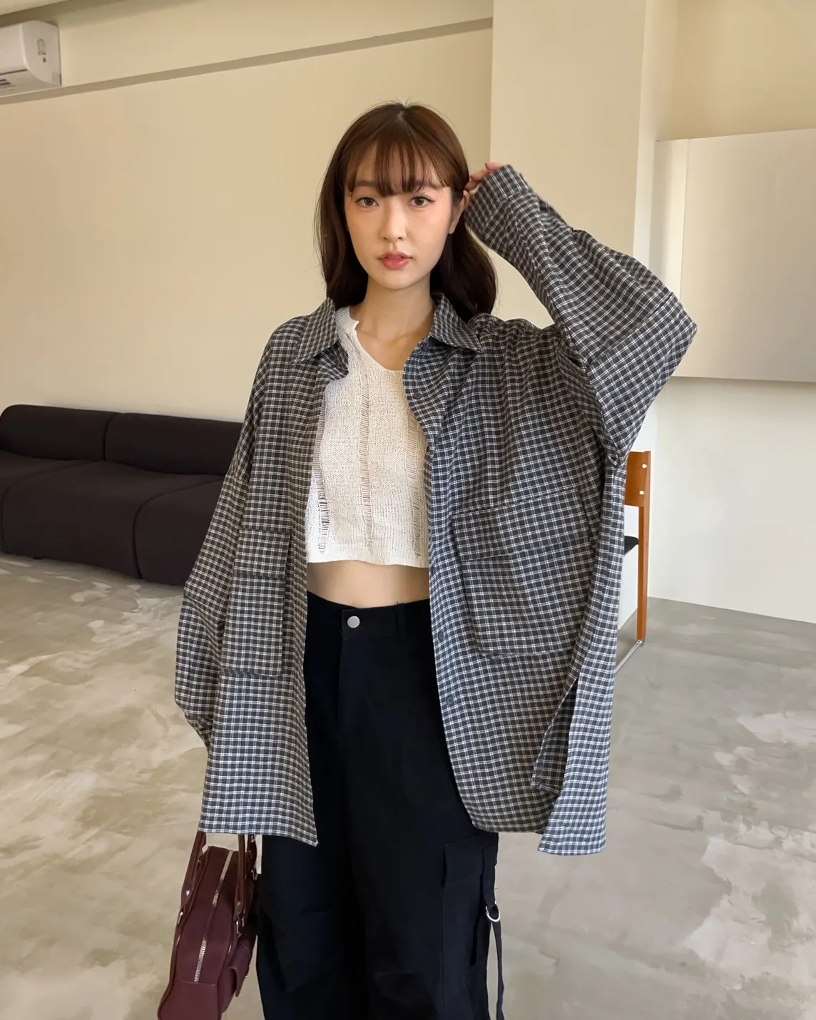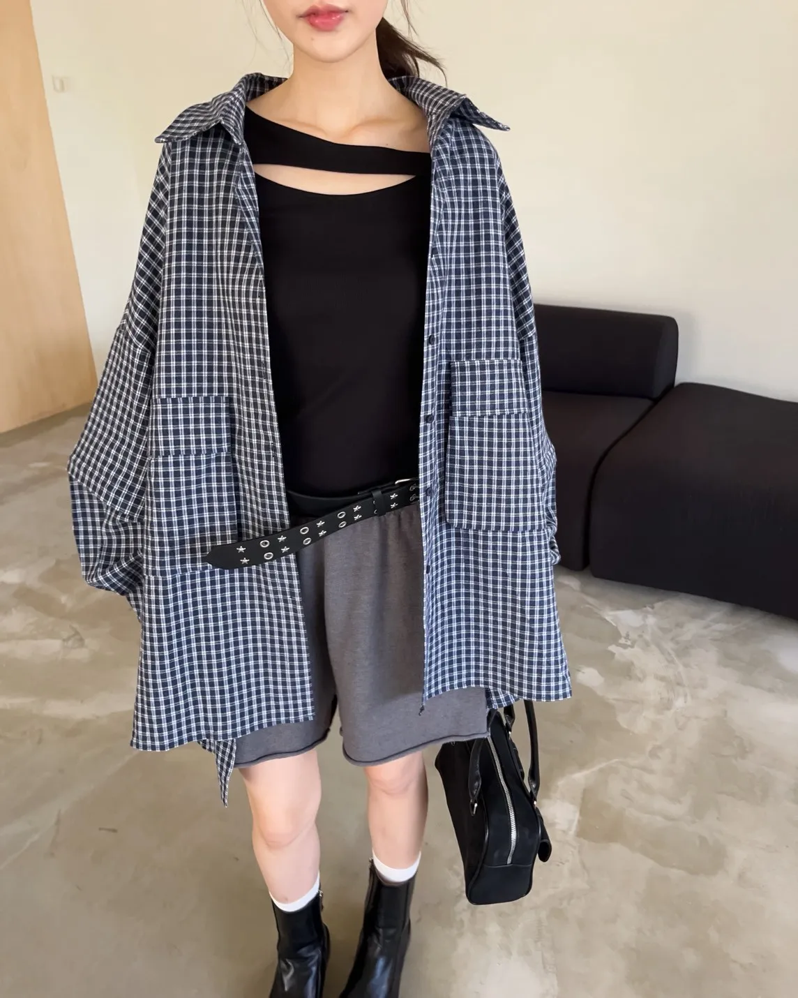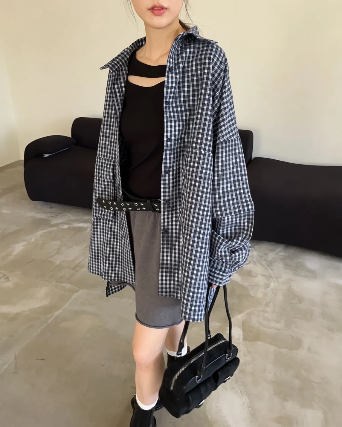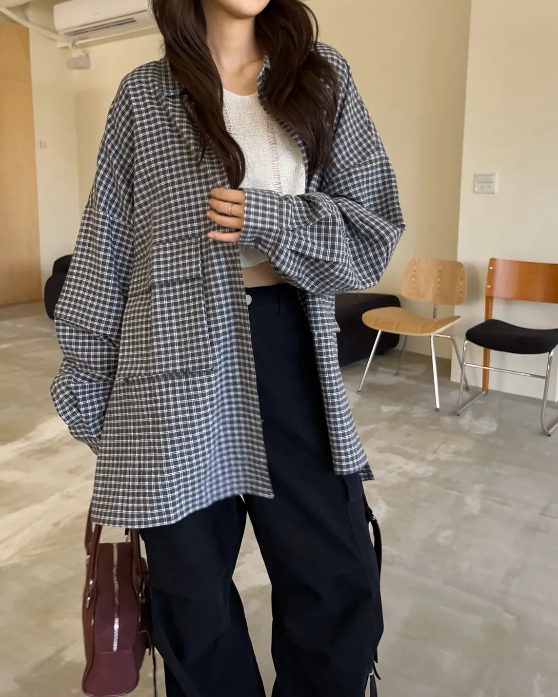 V0031(袖可拆)翻蓋口袋寬版格子衫(白/深藍/深灰)(售完不補)