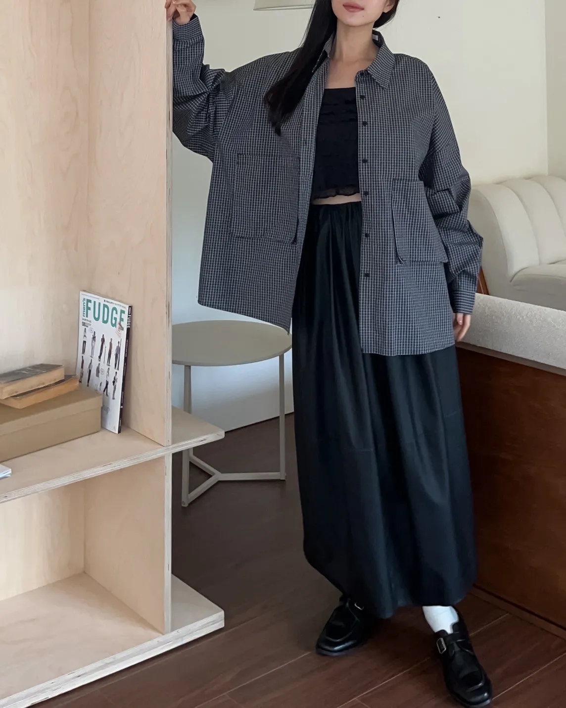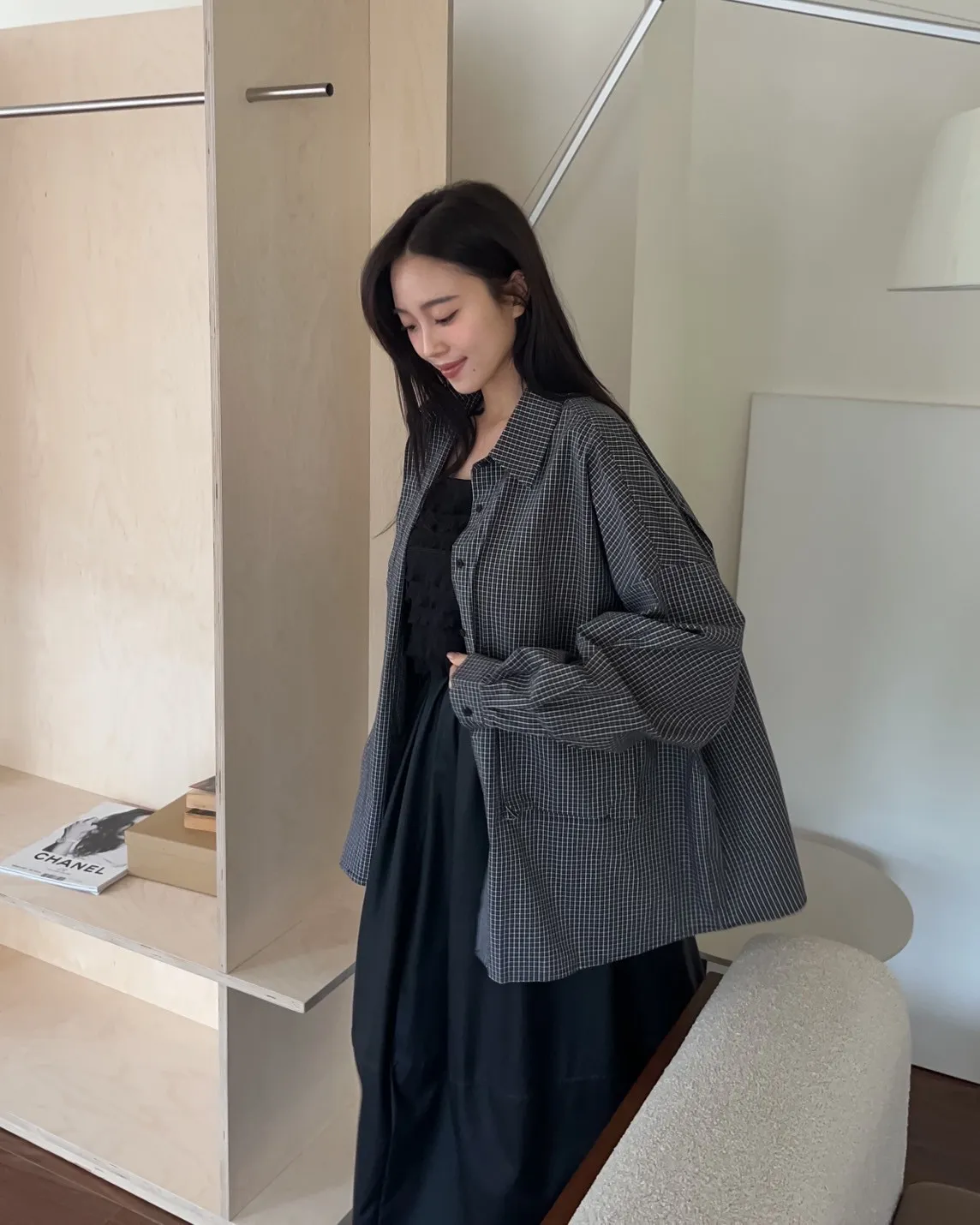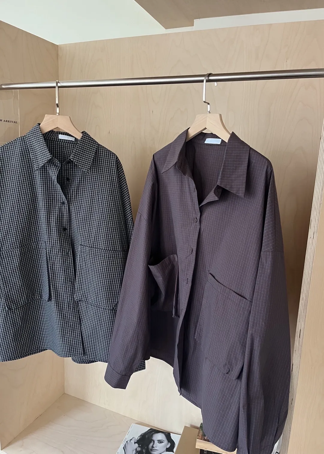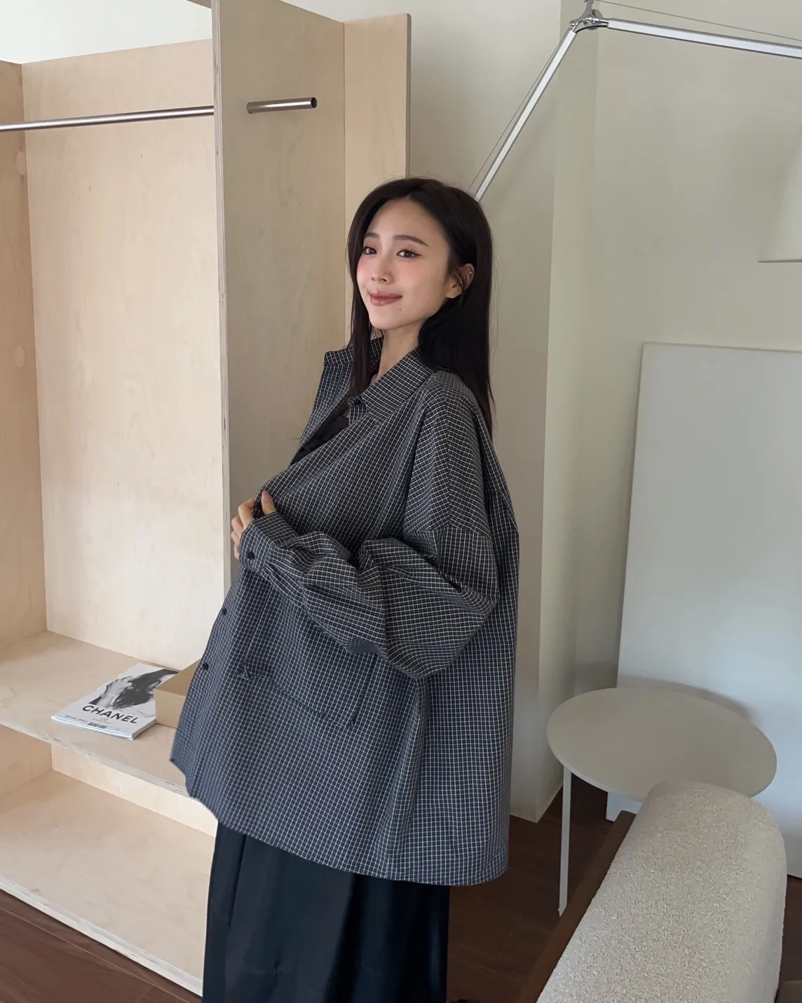 寬鬆落肩 寬版 胸前大口袋 格紋 布料本身無彈性