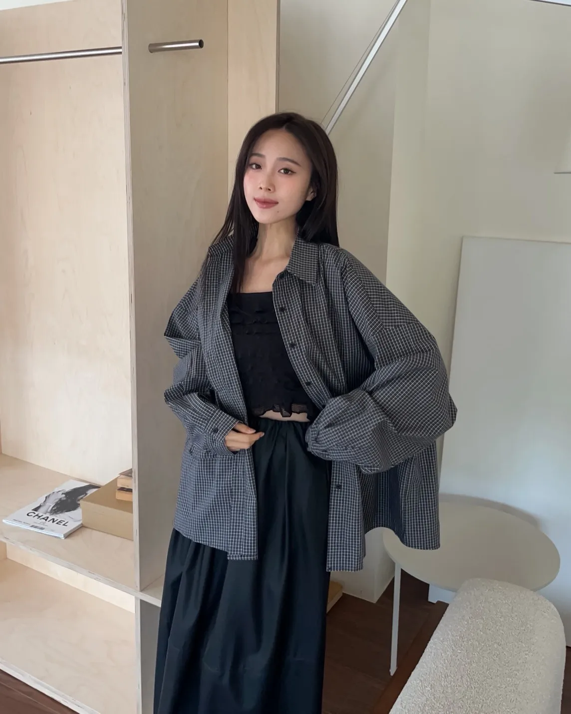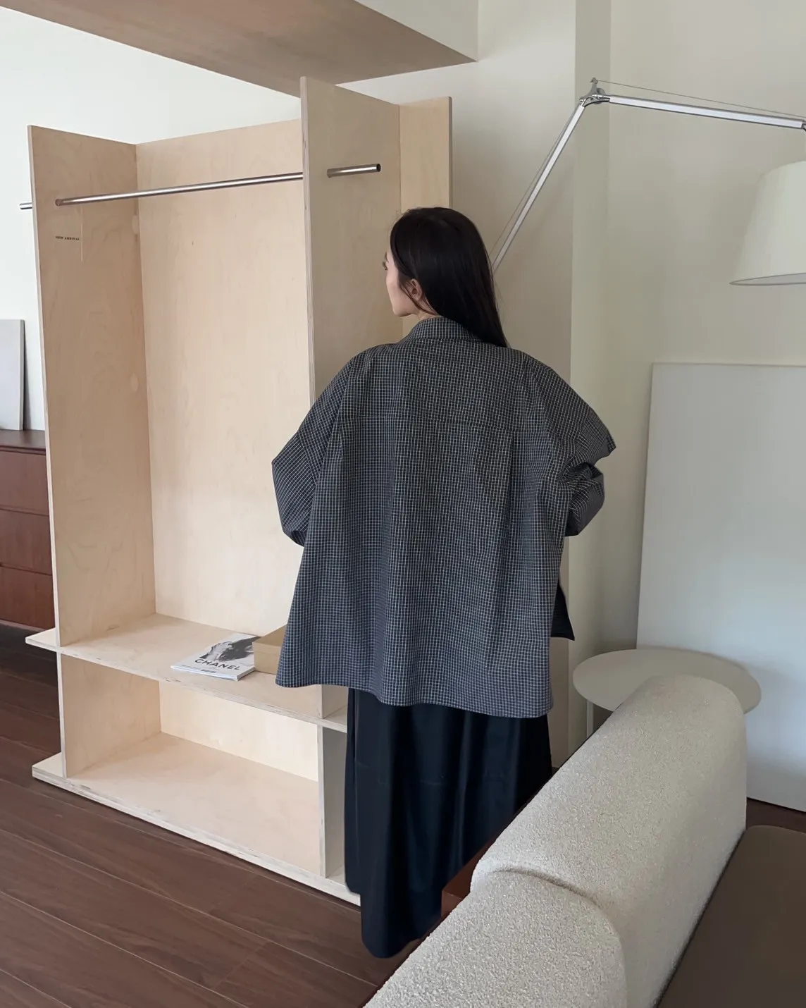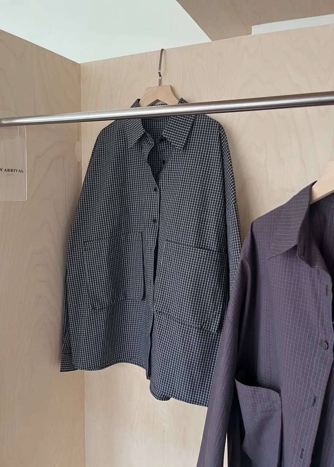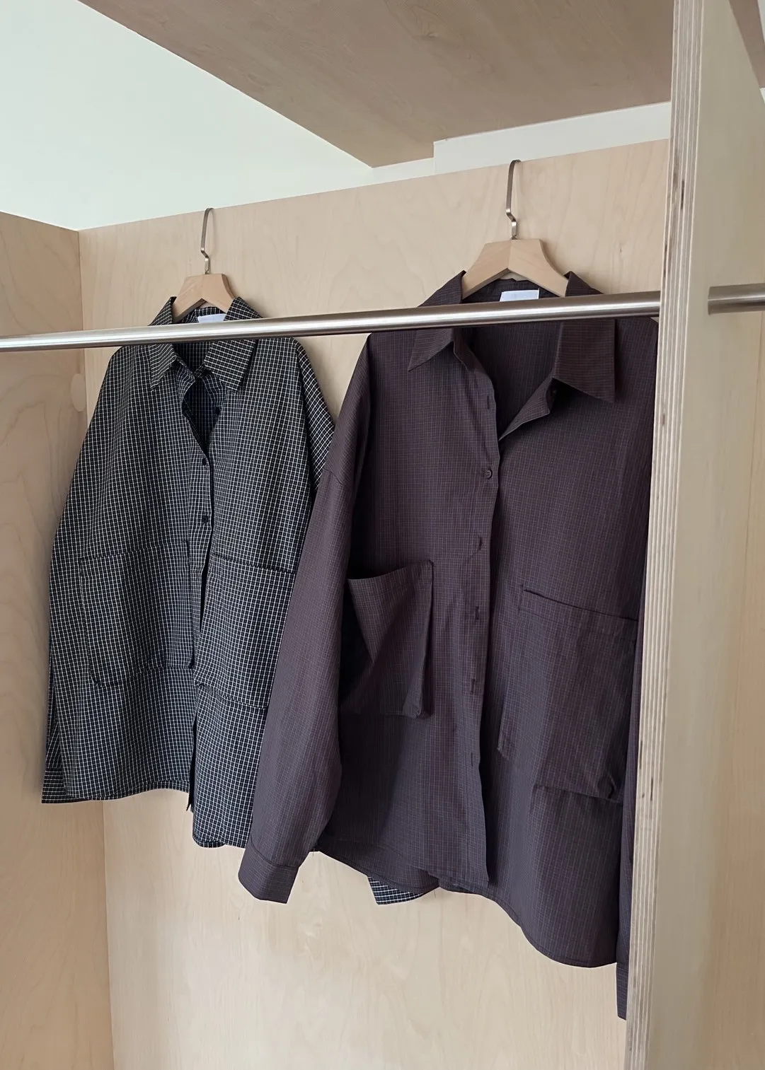寬鬆落肩 寬版 胸前大口袋 格紋 布料本身無彈性
