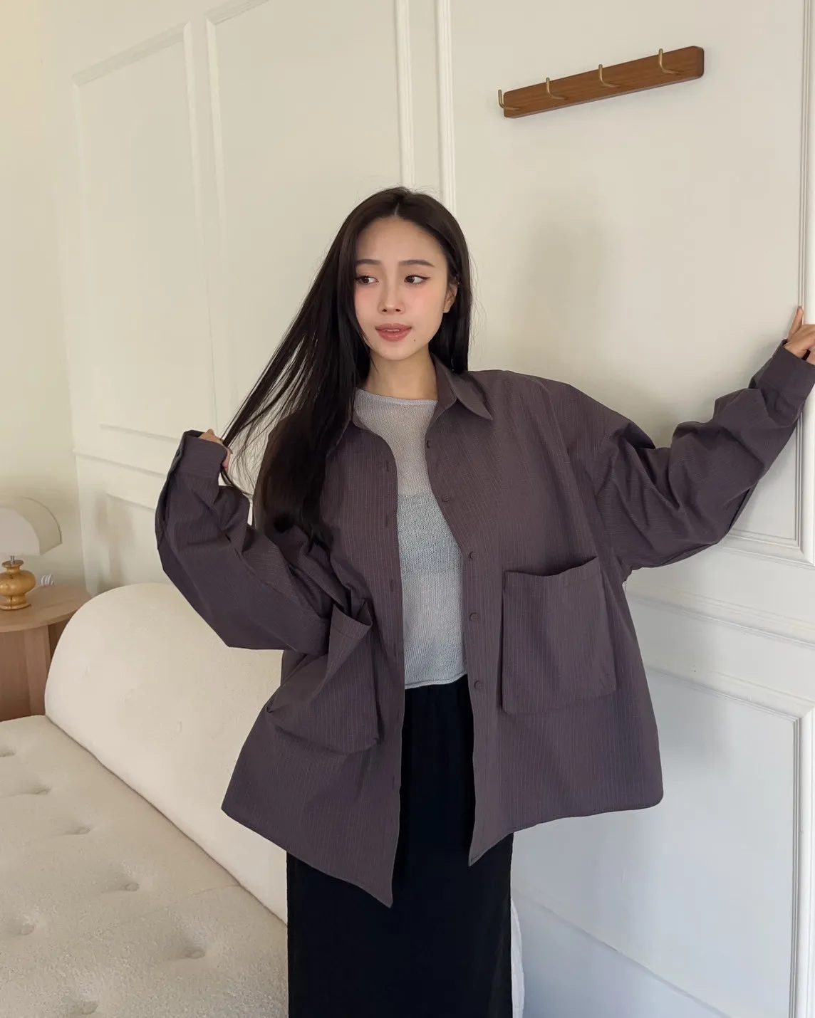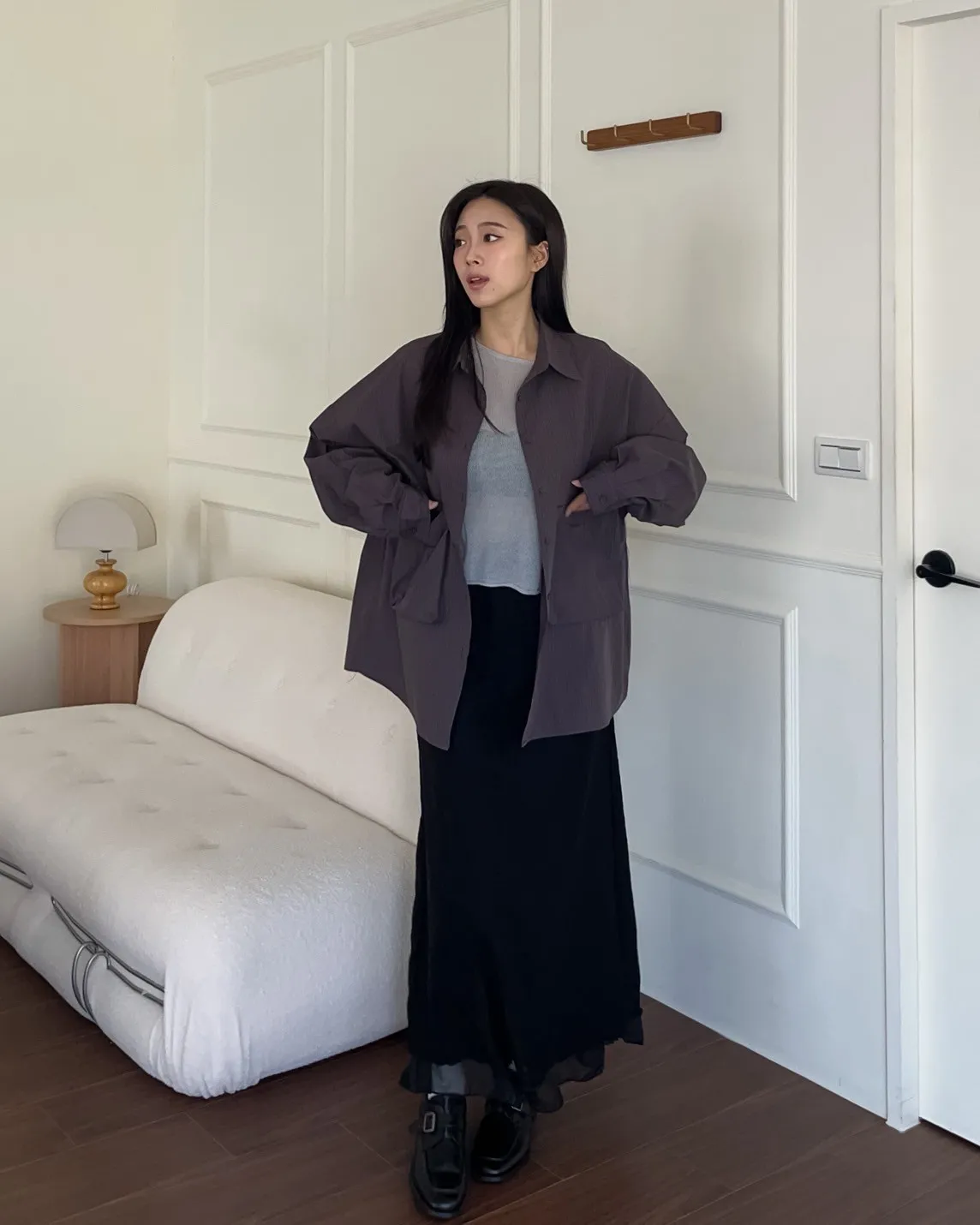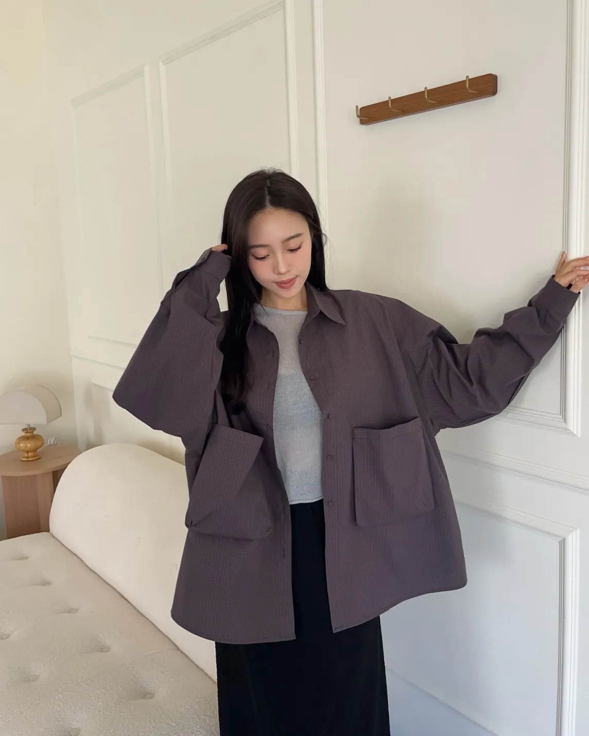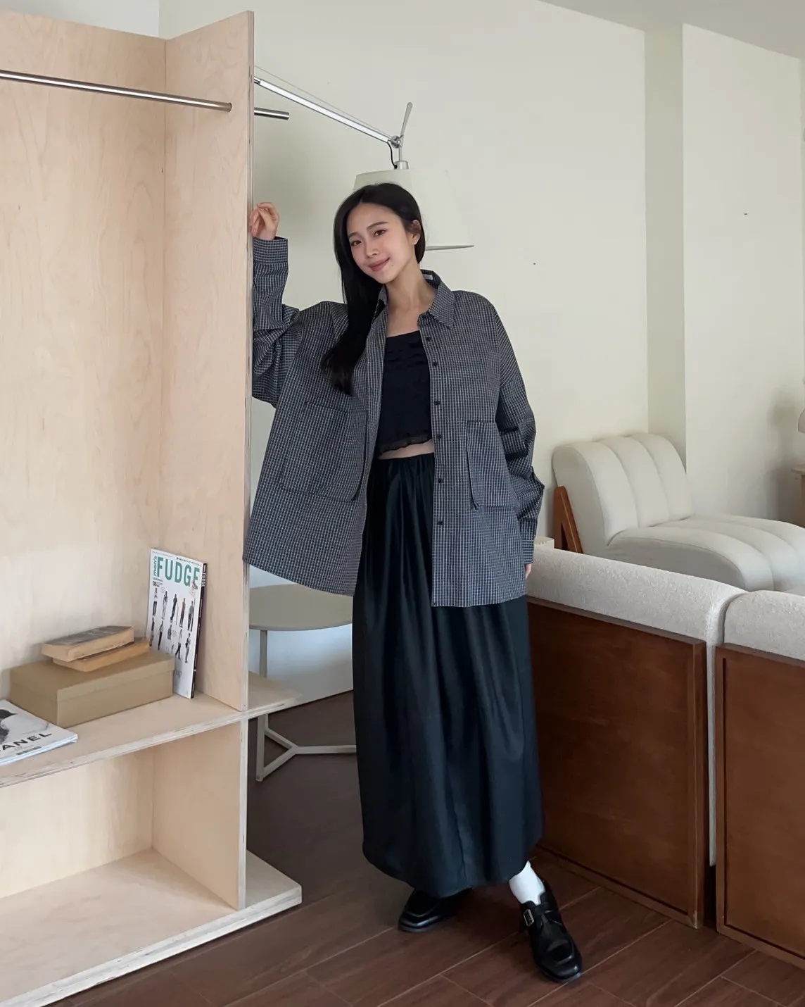 寬鬆落肩 寬版 胸前大口袋 格紋 布料本身無彈性