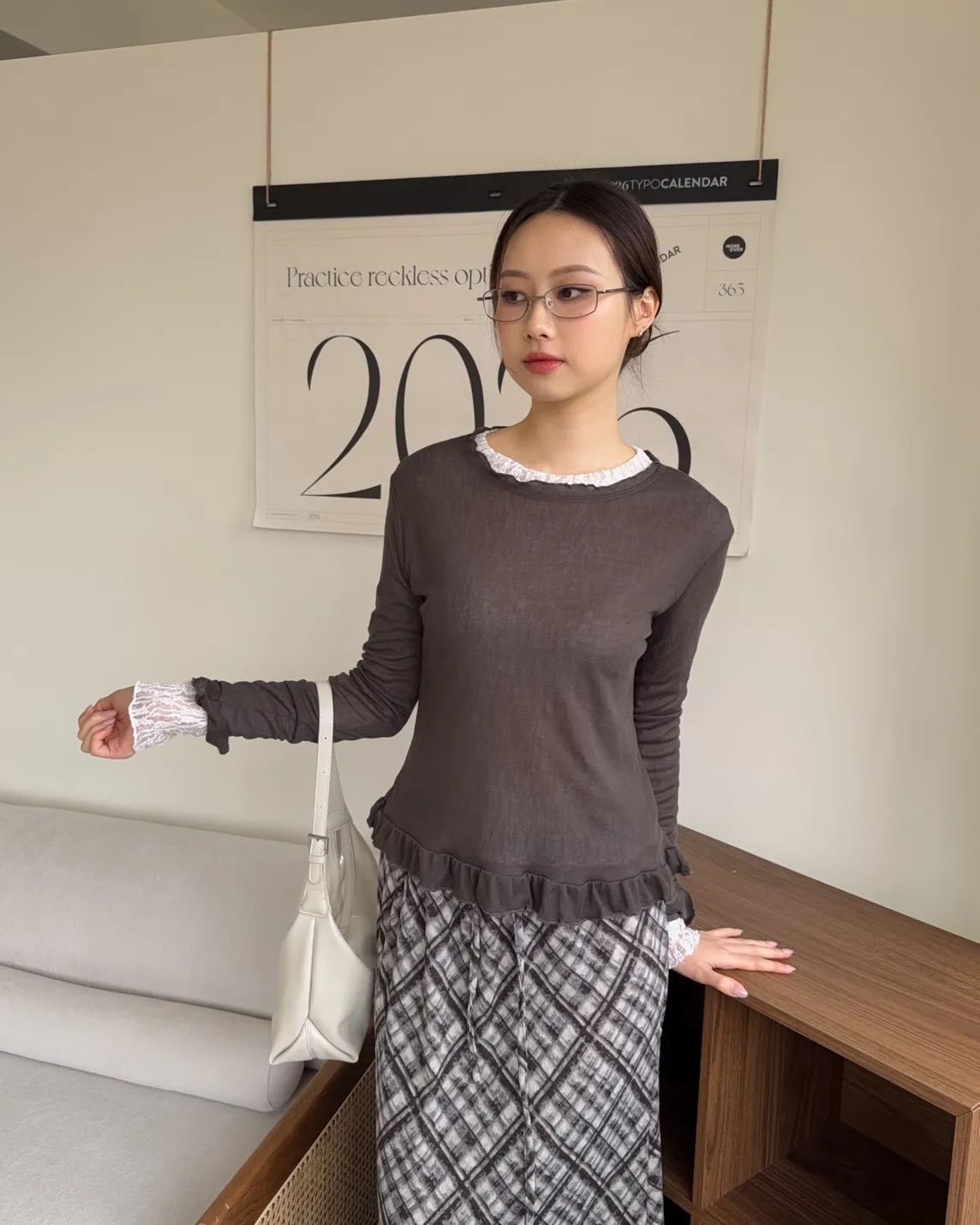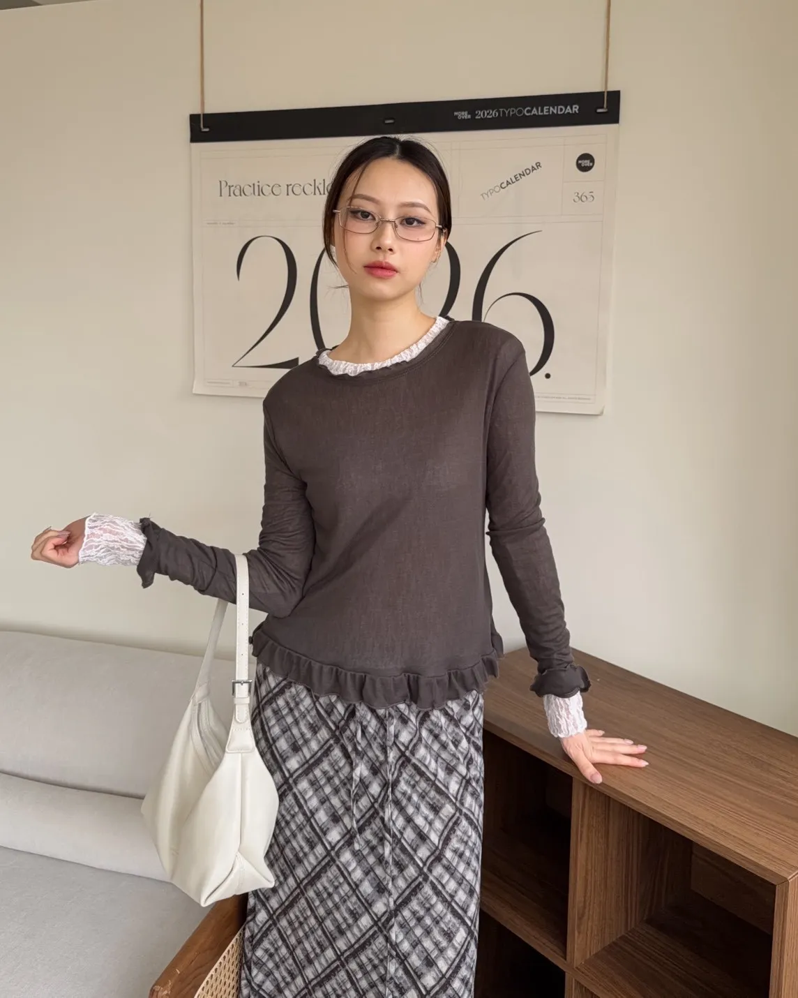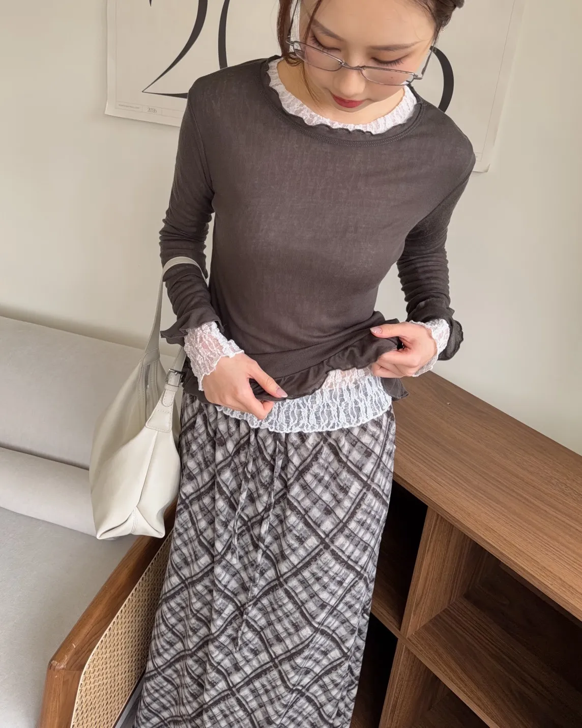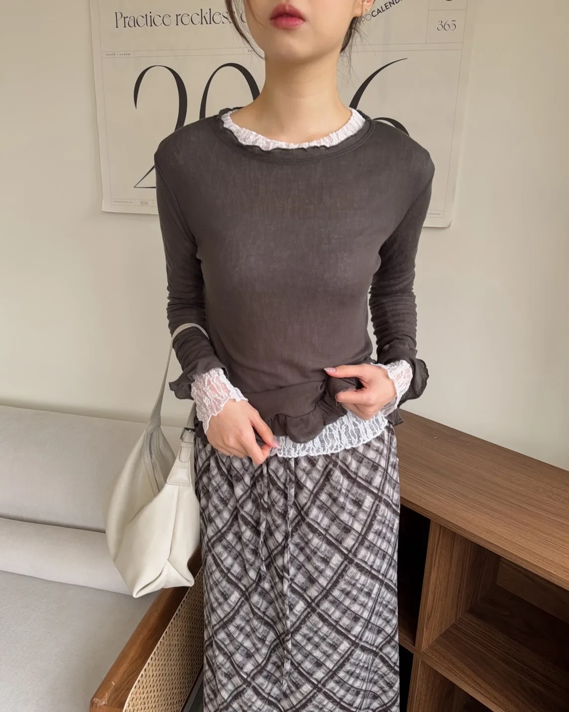 A0014捲捲花邊喇叭袖棉質上衣(白/奶茶/深灰)