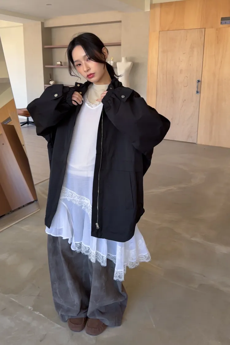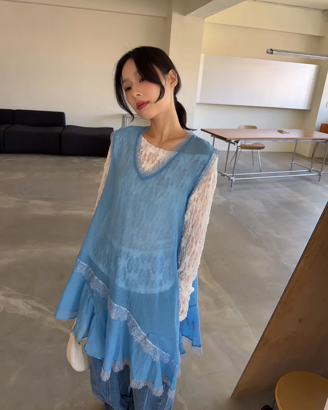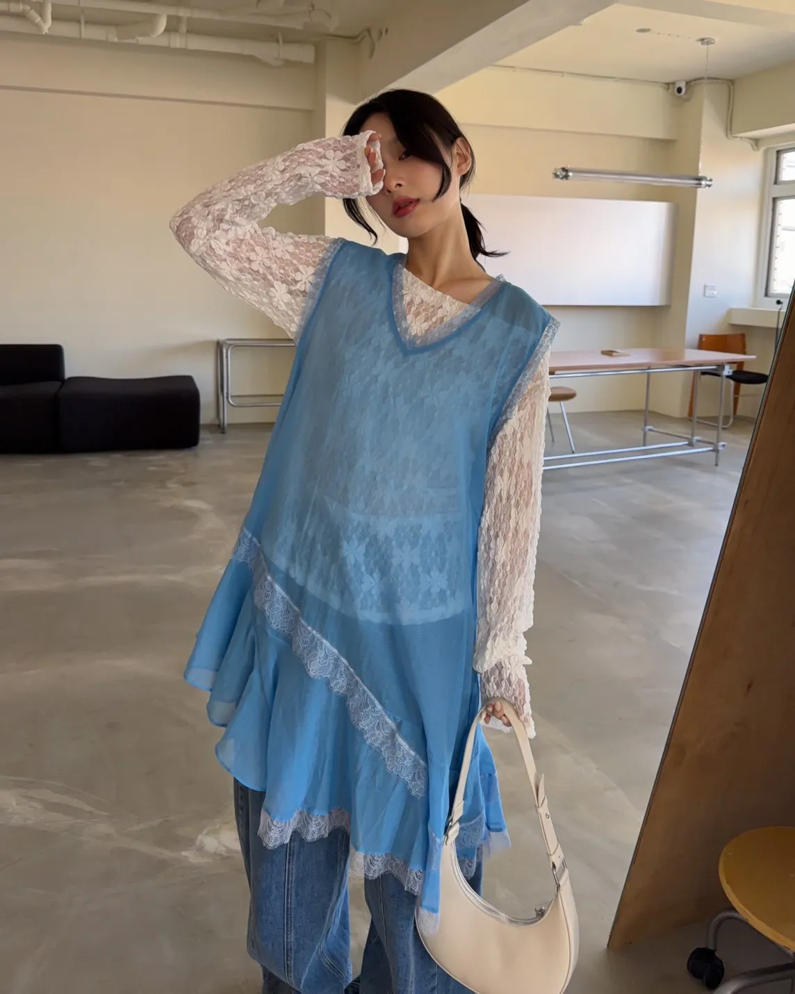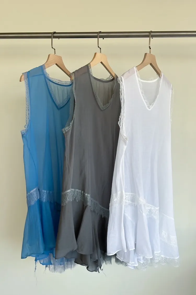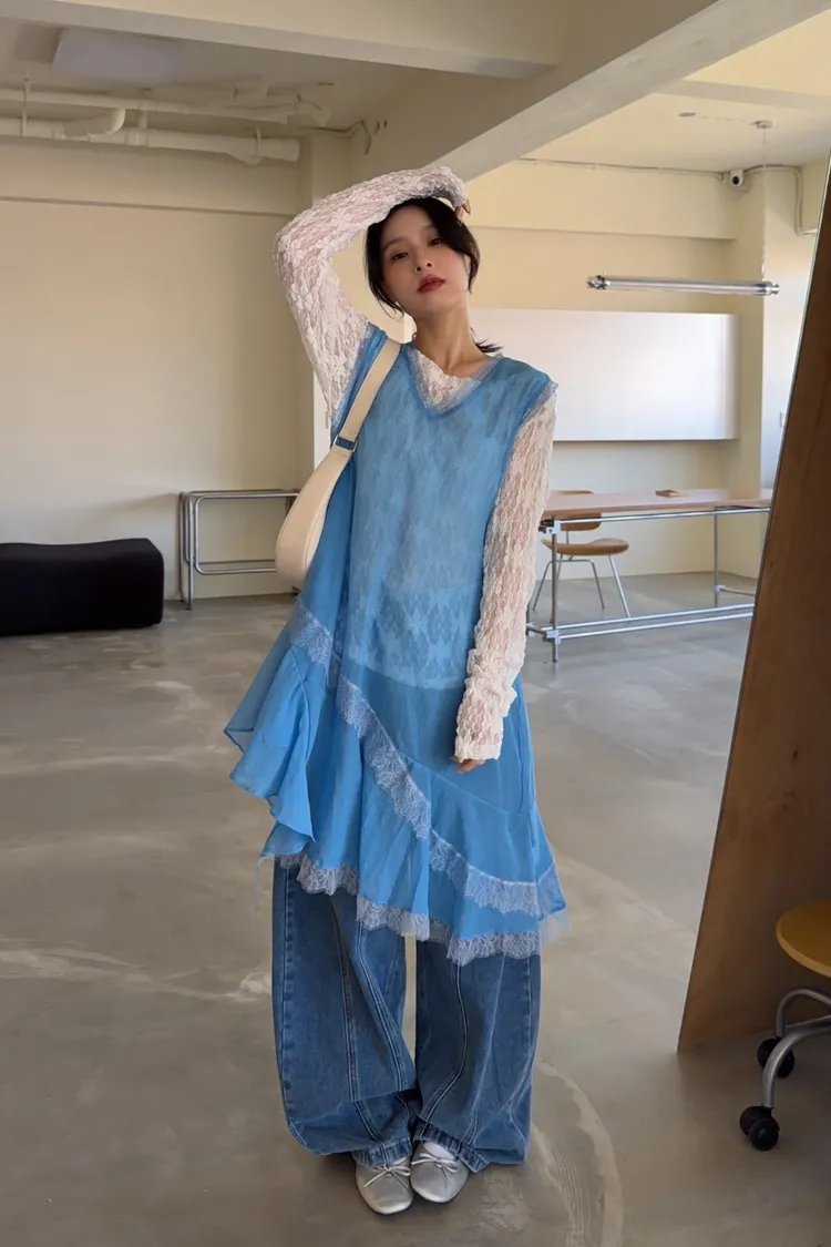 A0045蕾絲滾邊斜擺外搭洋(白/藍/灰)