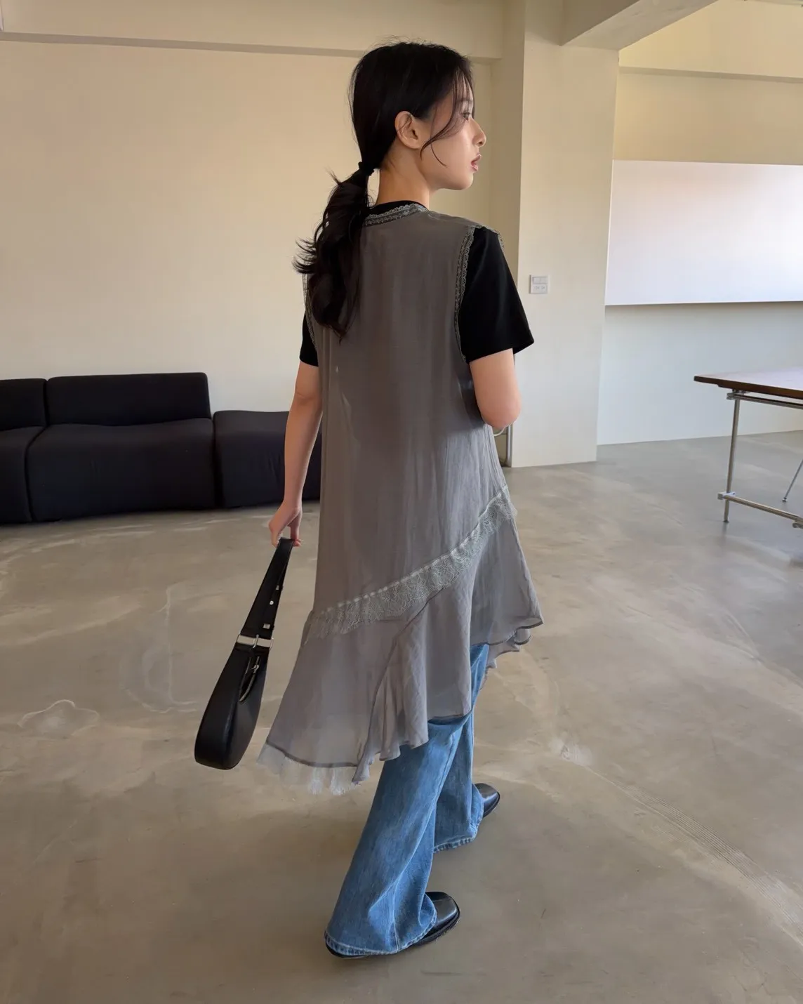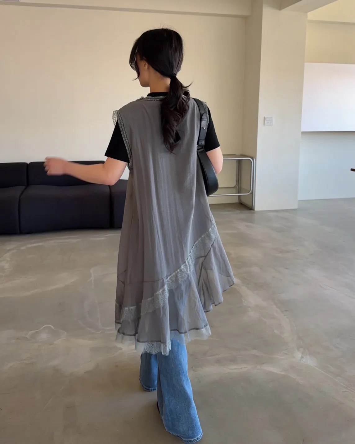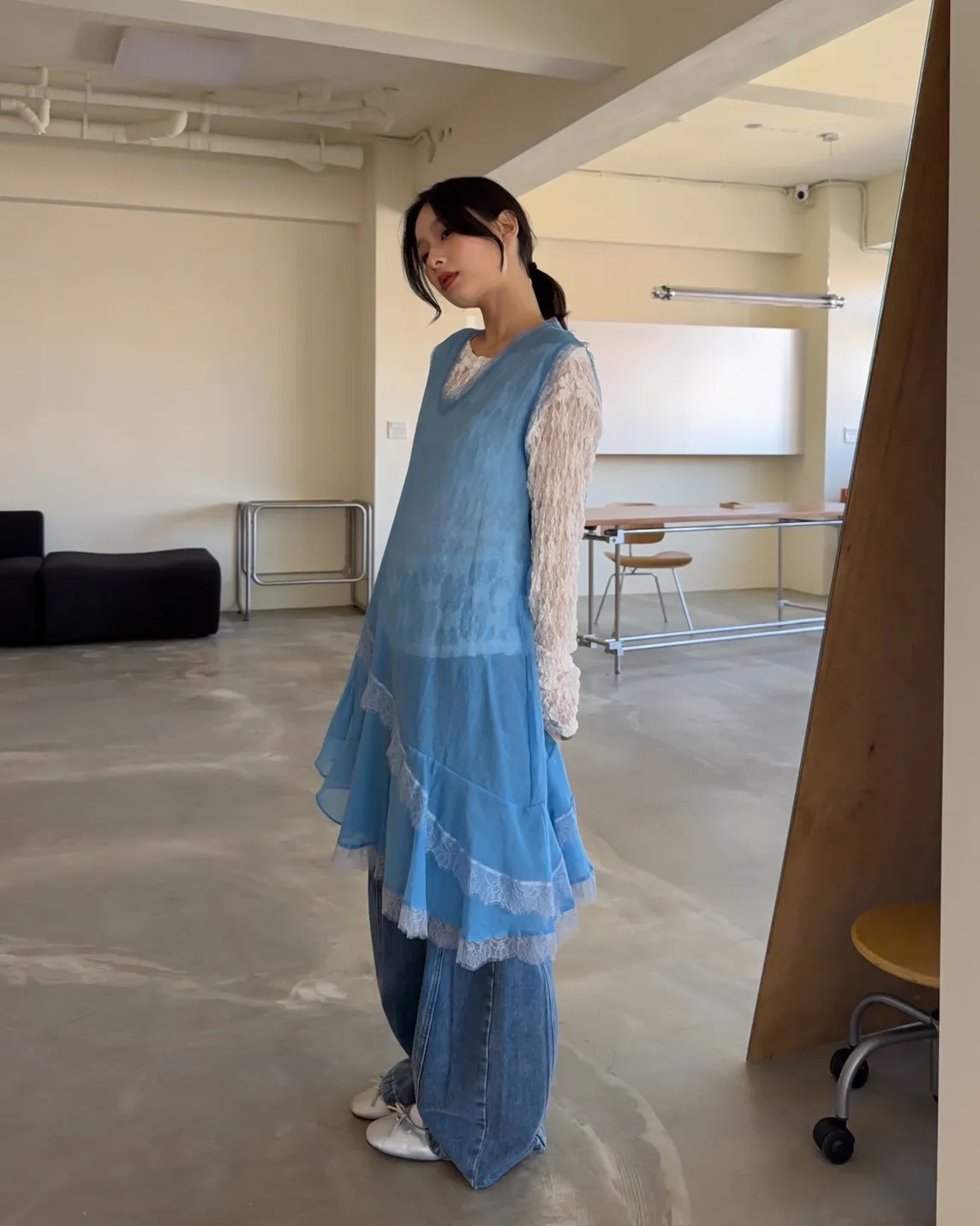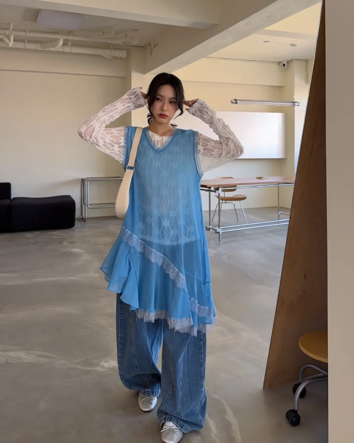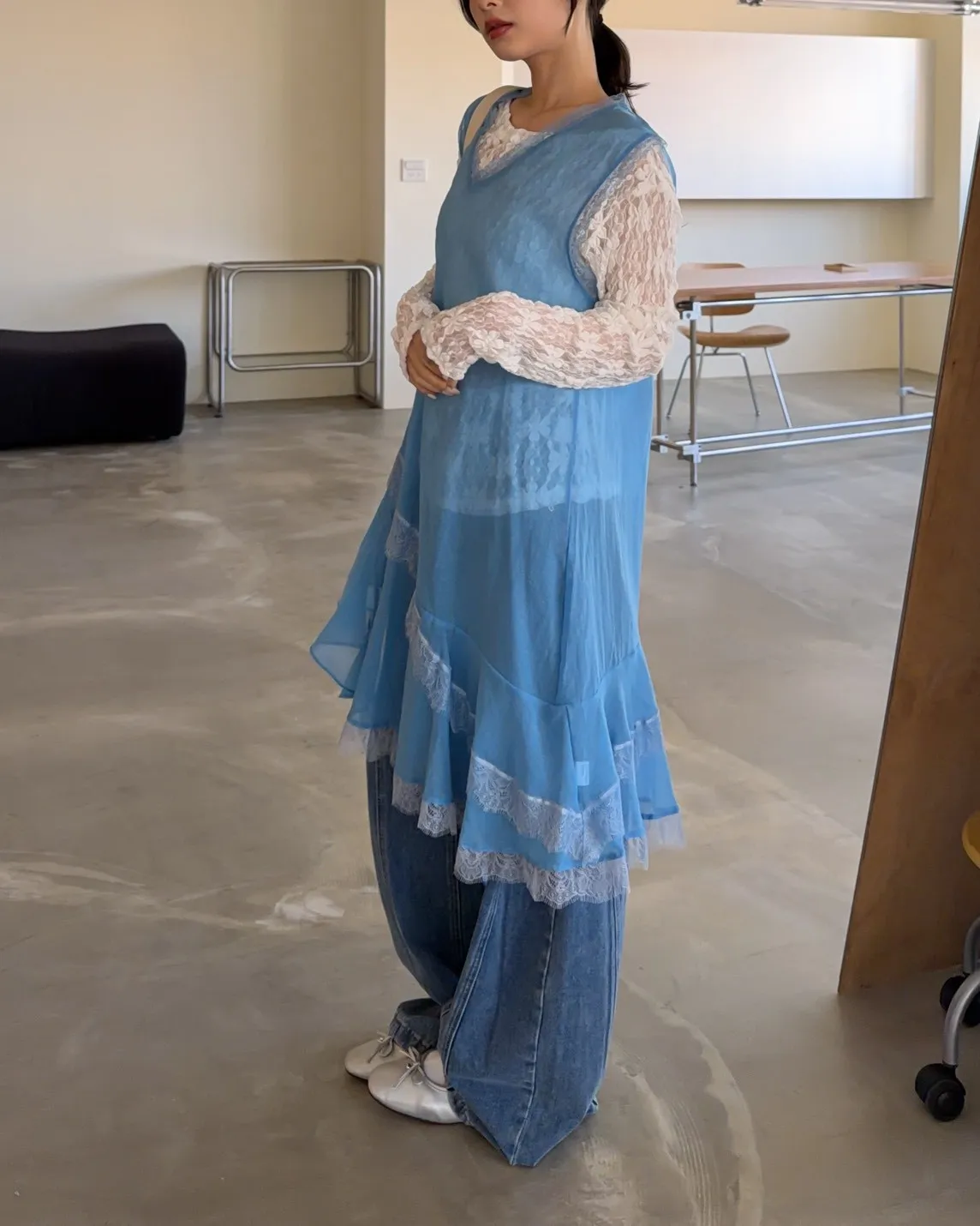 A0045蕾絲滾邊斜擺外搭洋(白/藍/灰)