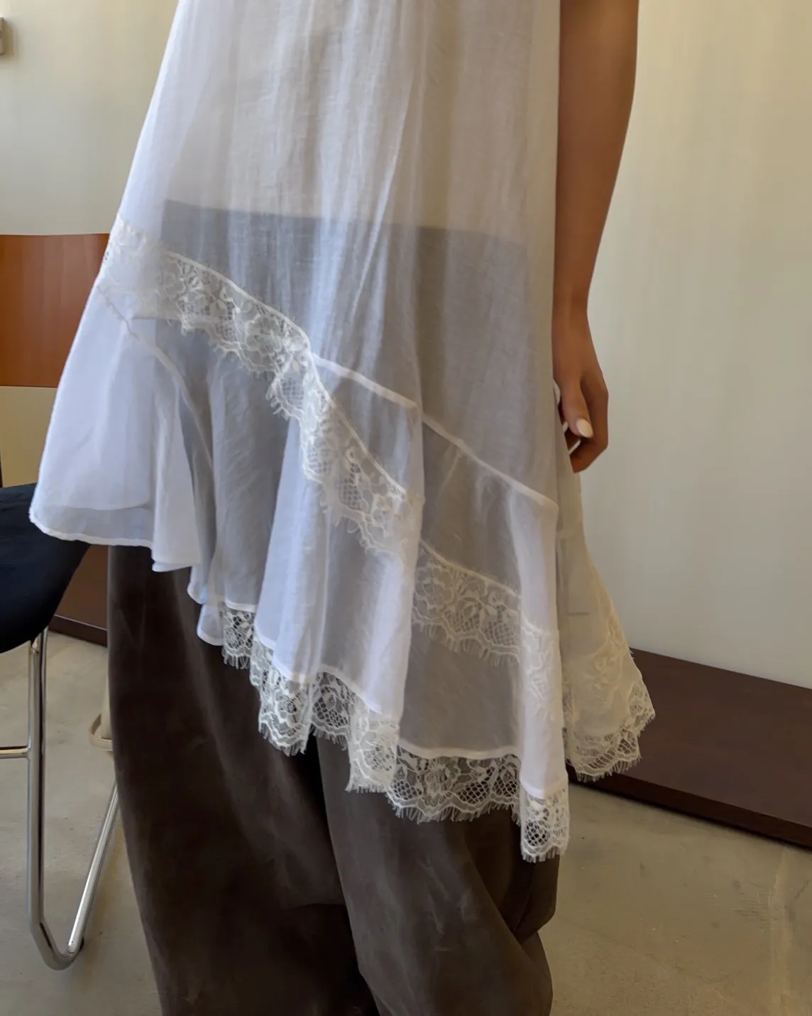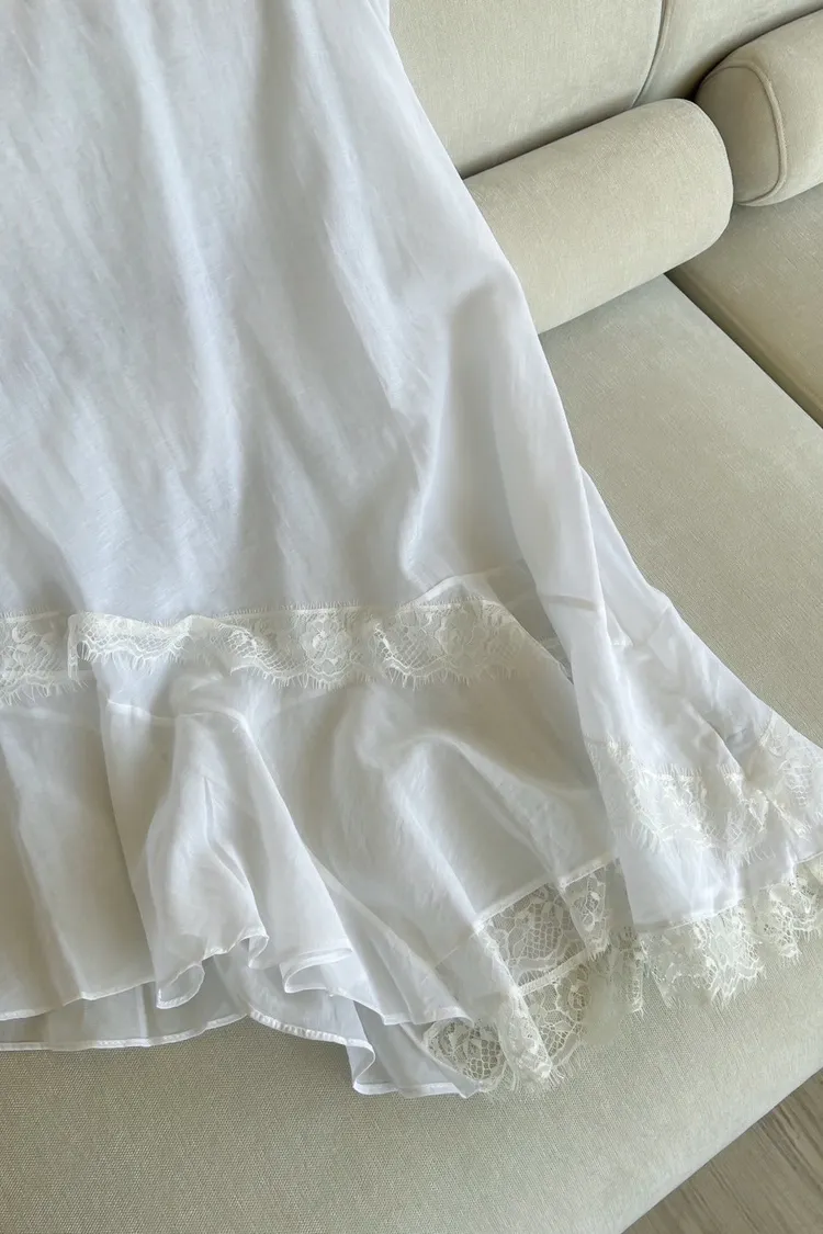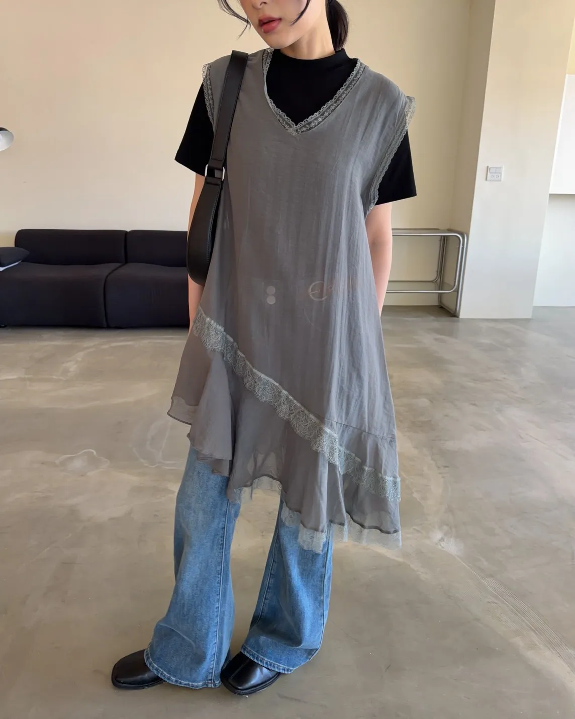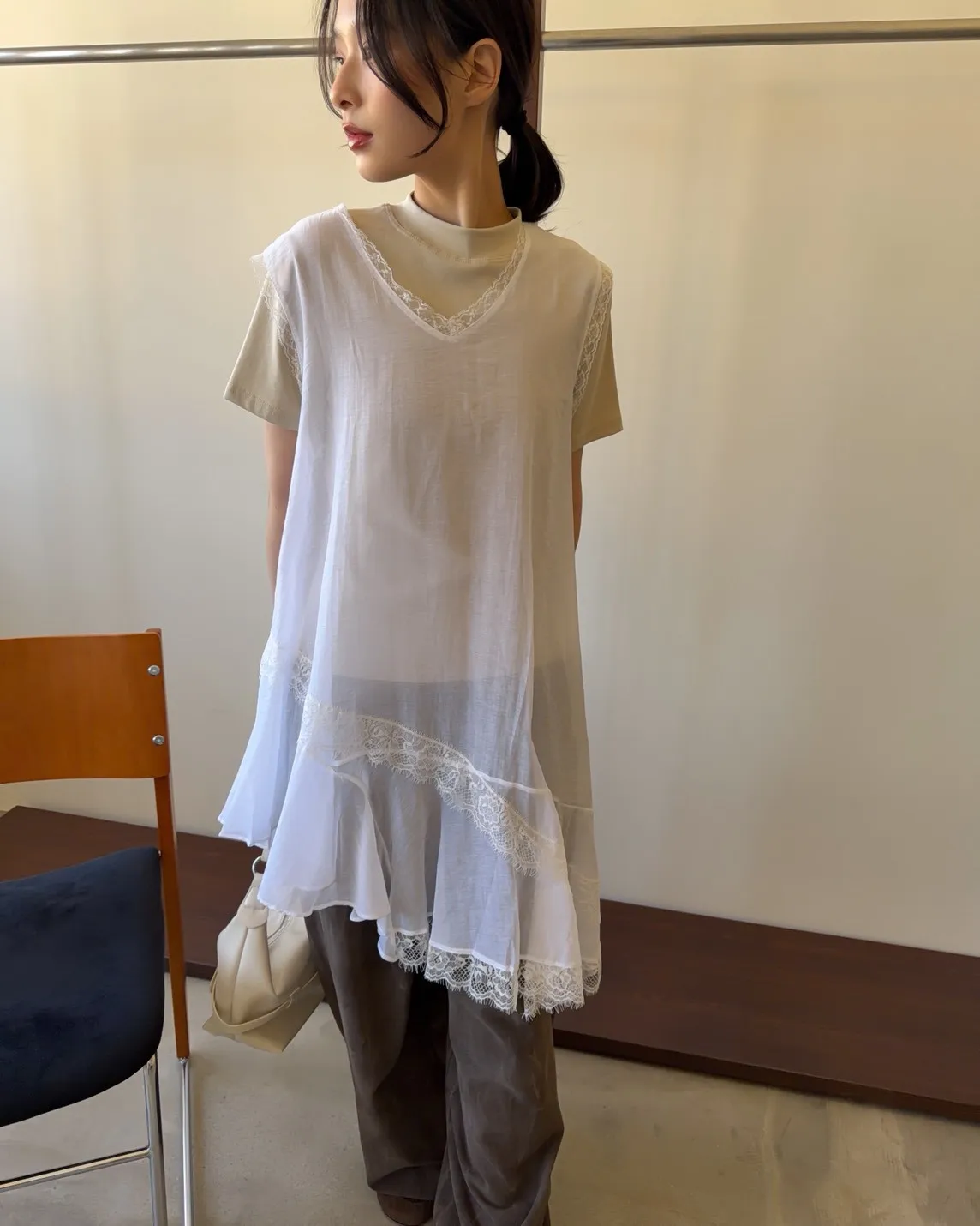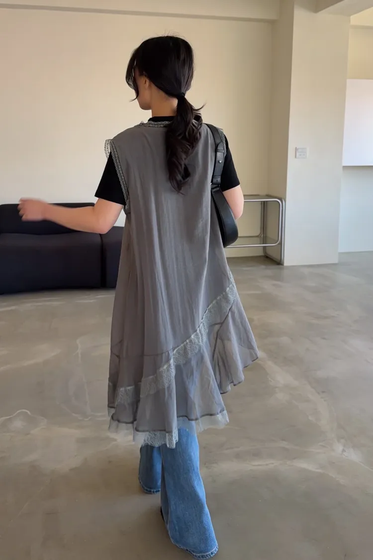V領 領口/袖口蕾絲滾邊 輕薄微透 蕾絲斜下擺
