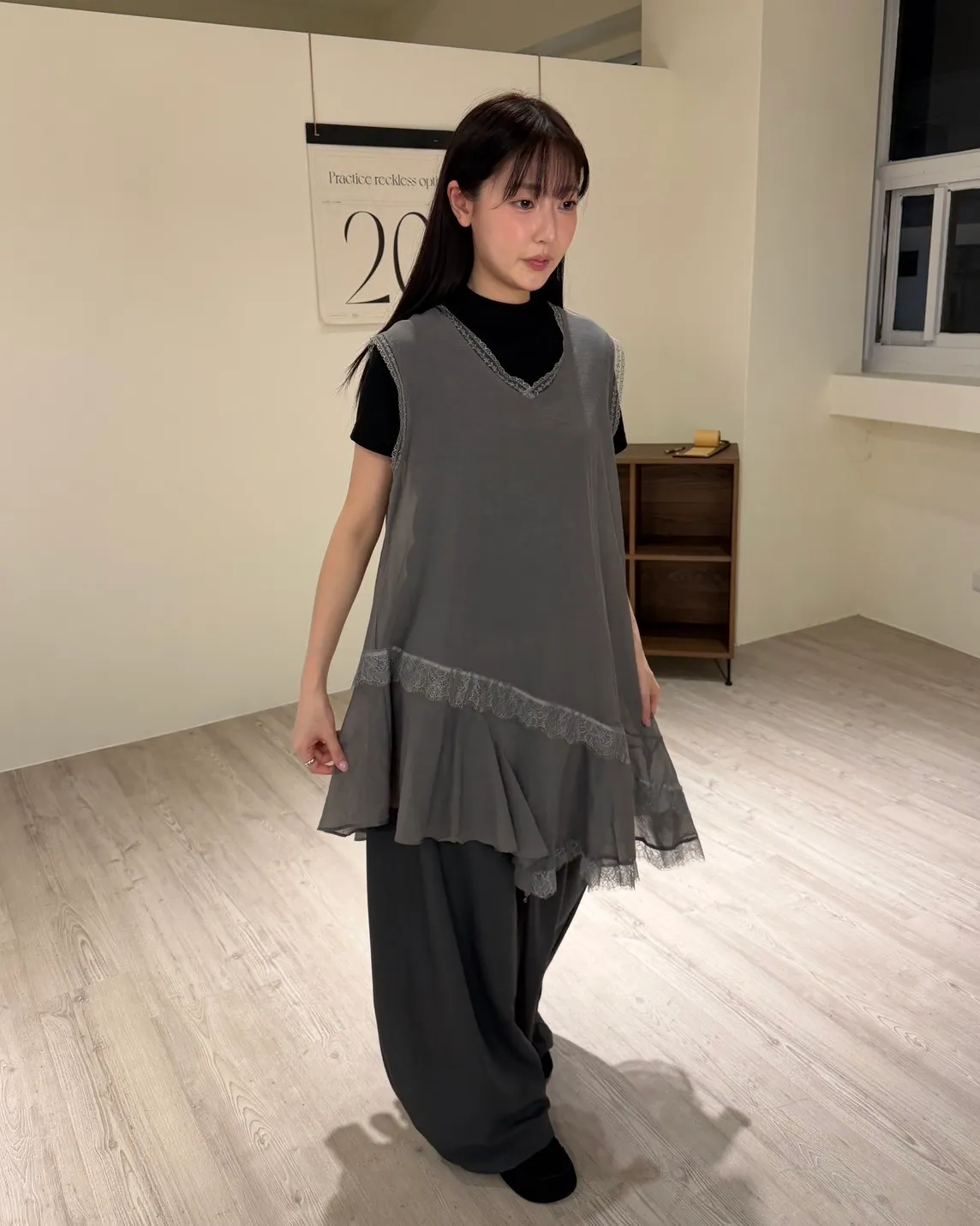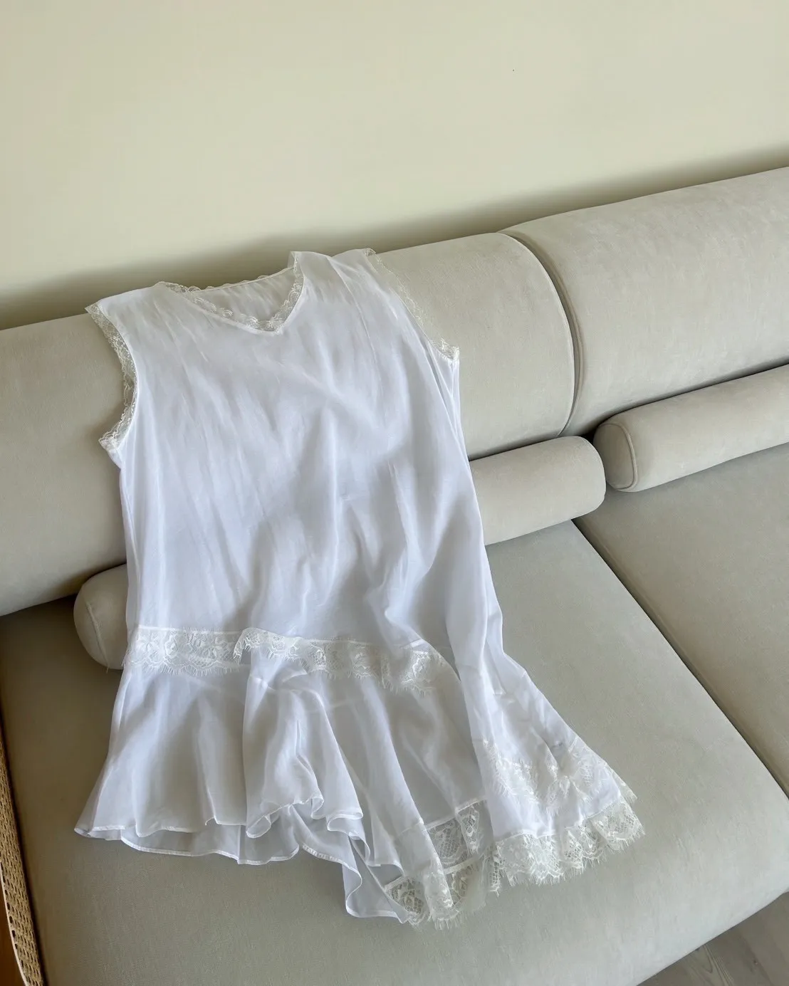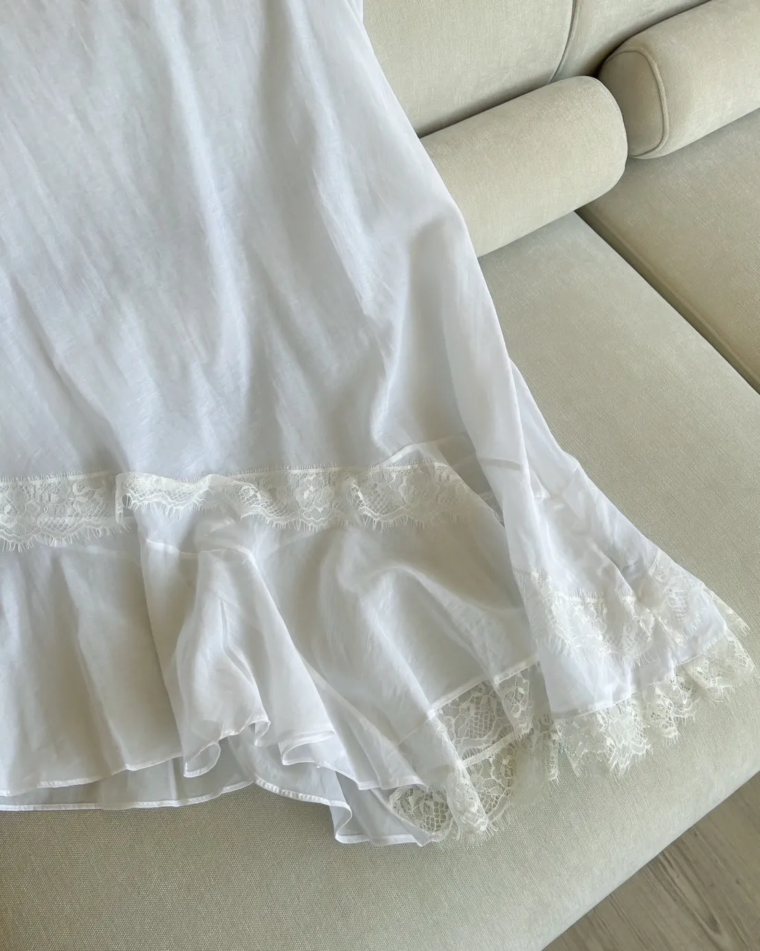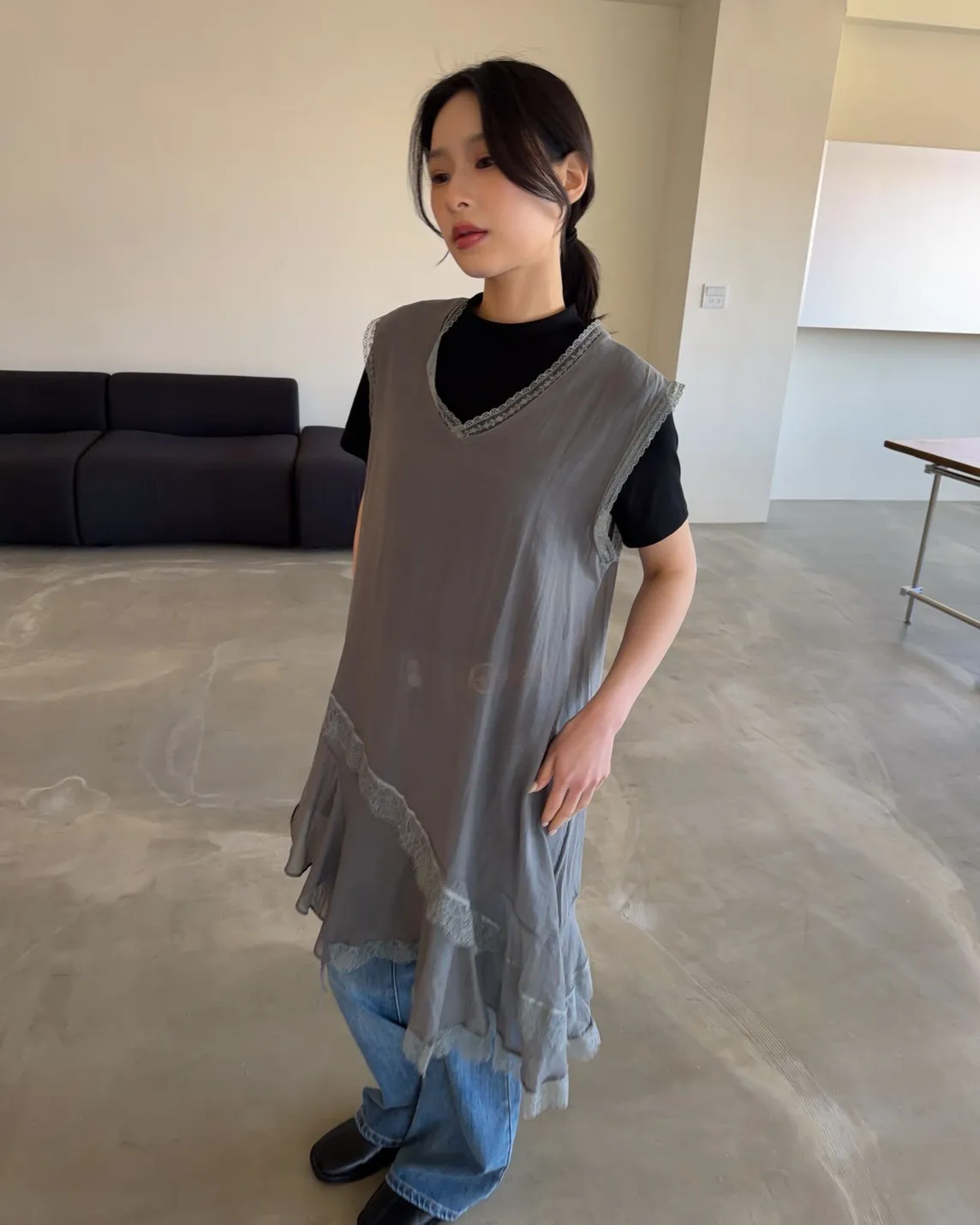 V領 領口/袖口蕾絲滾邊 輕薄微透 蕾絲斜下擺