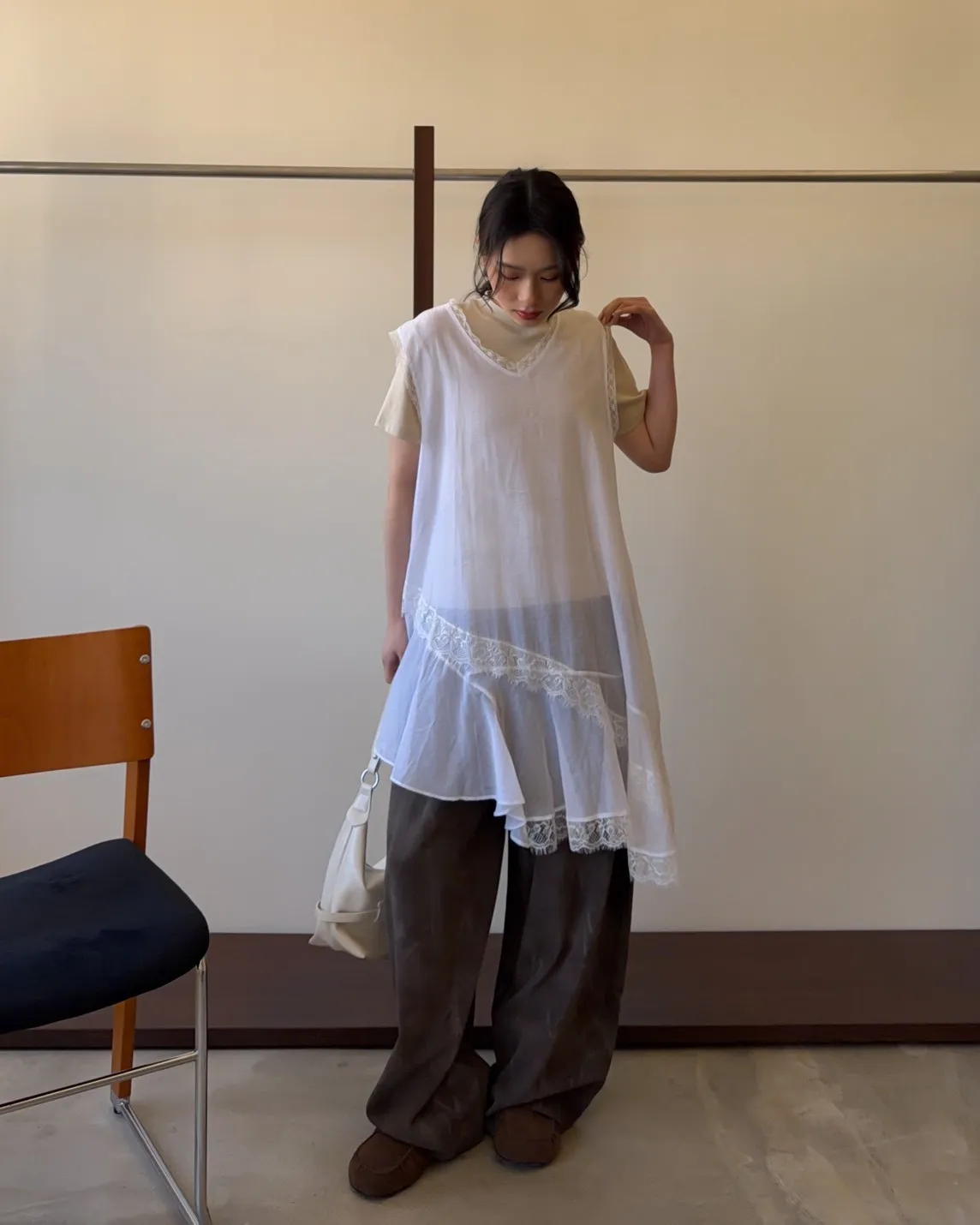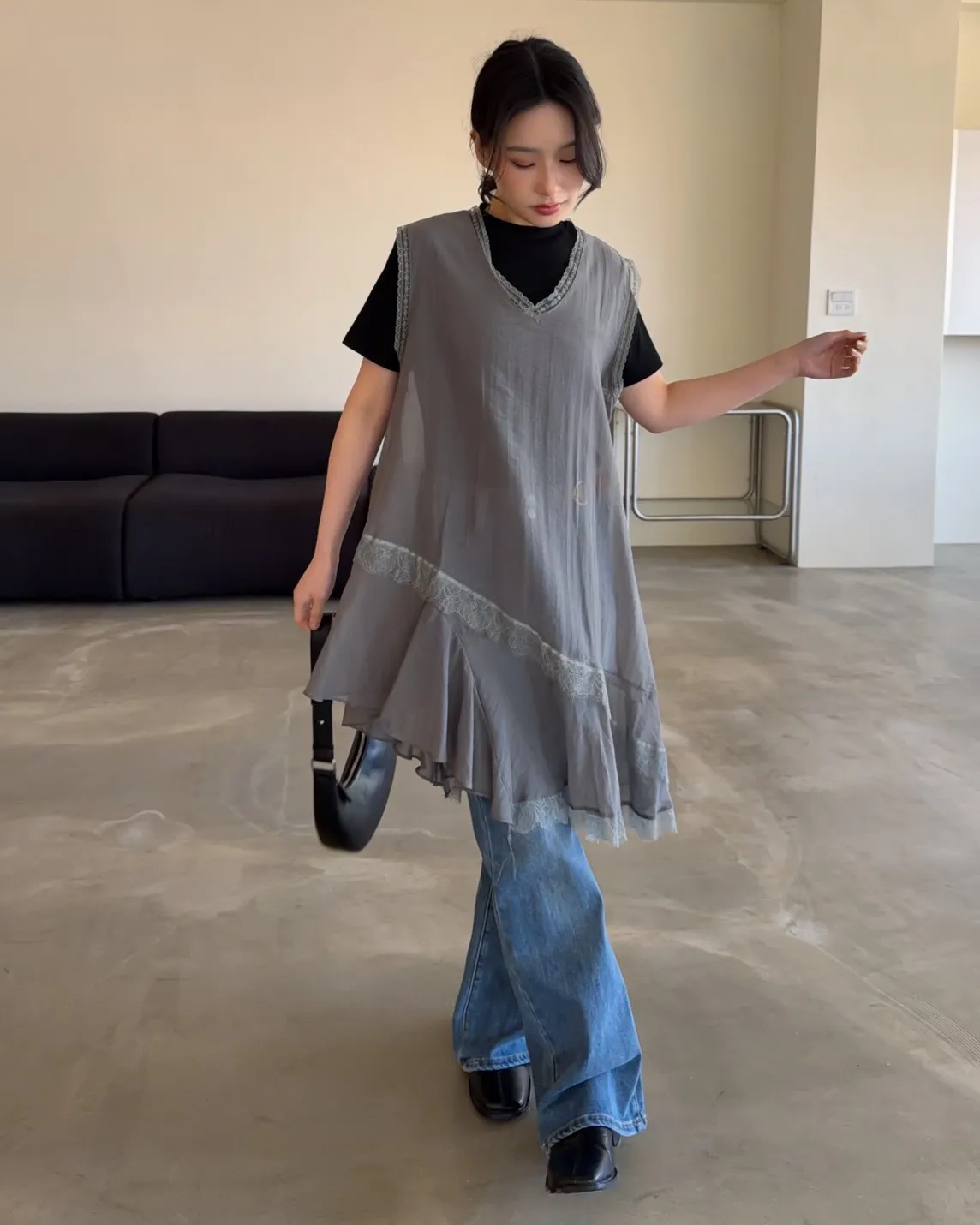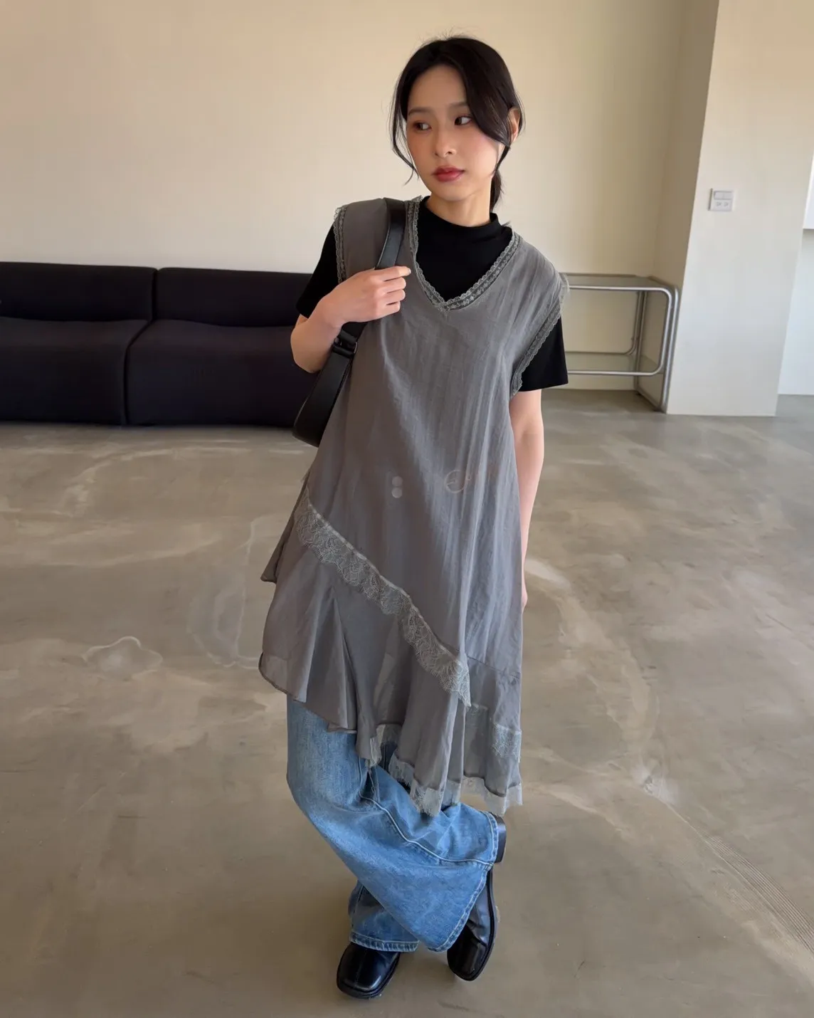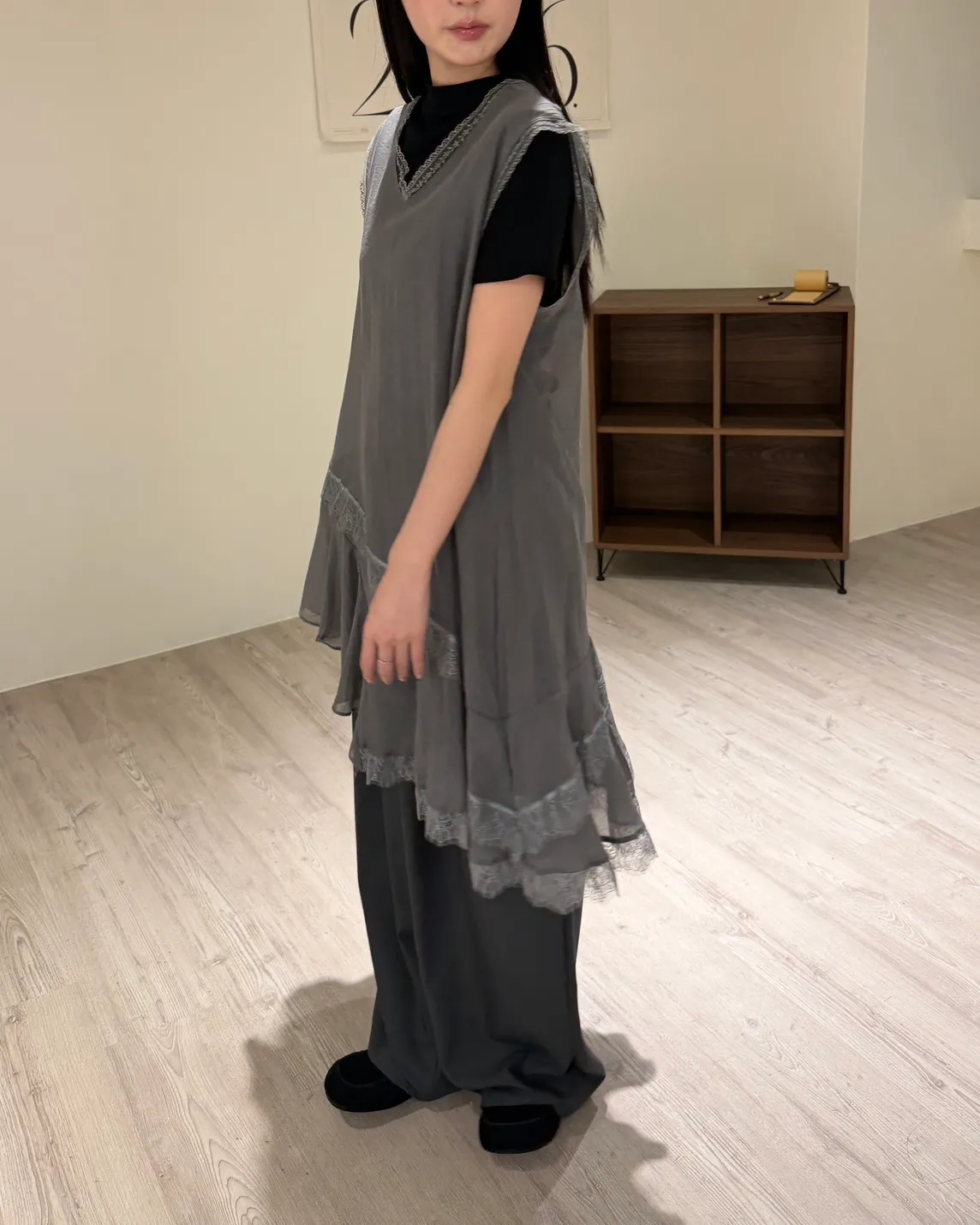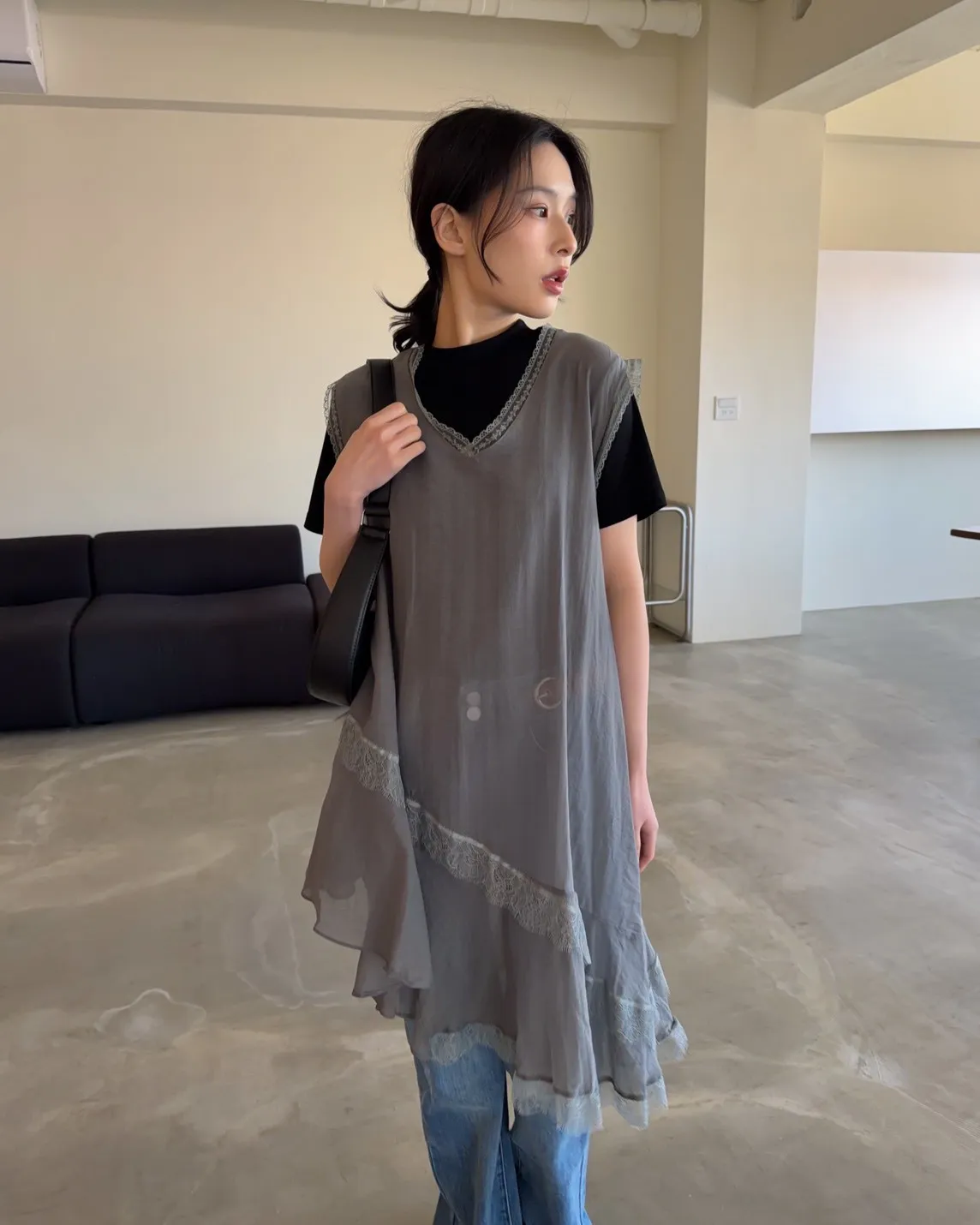 V領 領口/袖口蕾絲滾邊 輕薄微透 蕾絲斜下擺