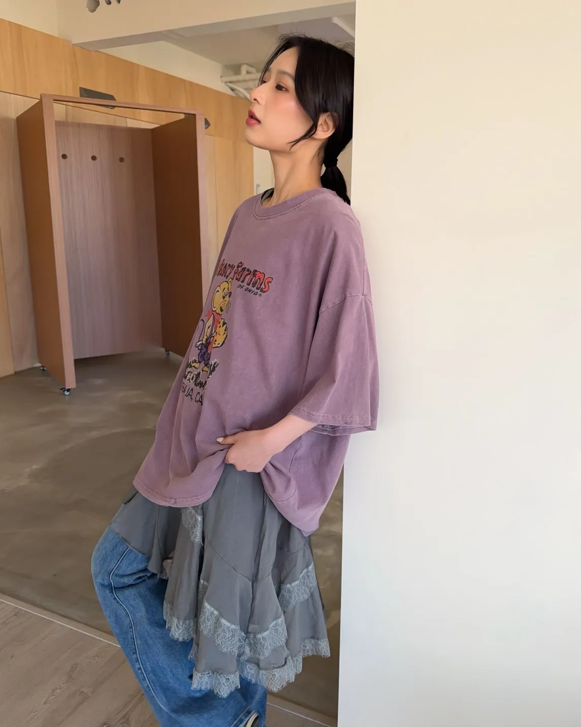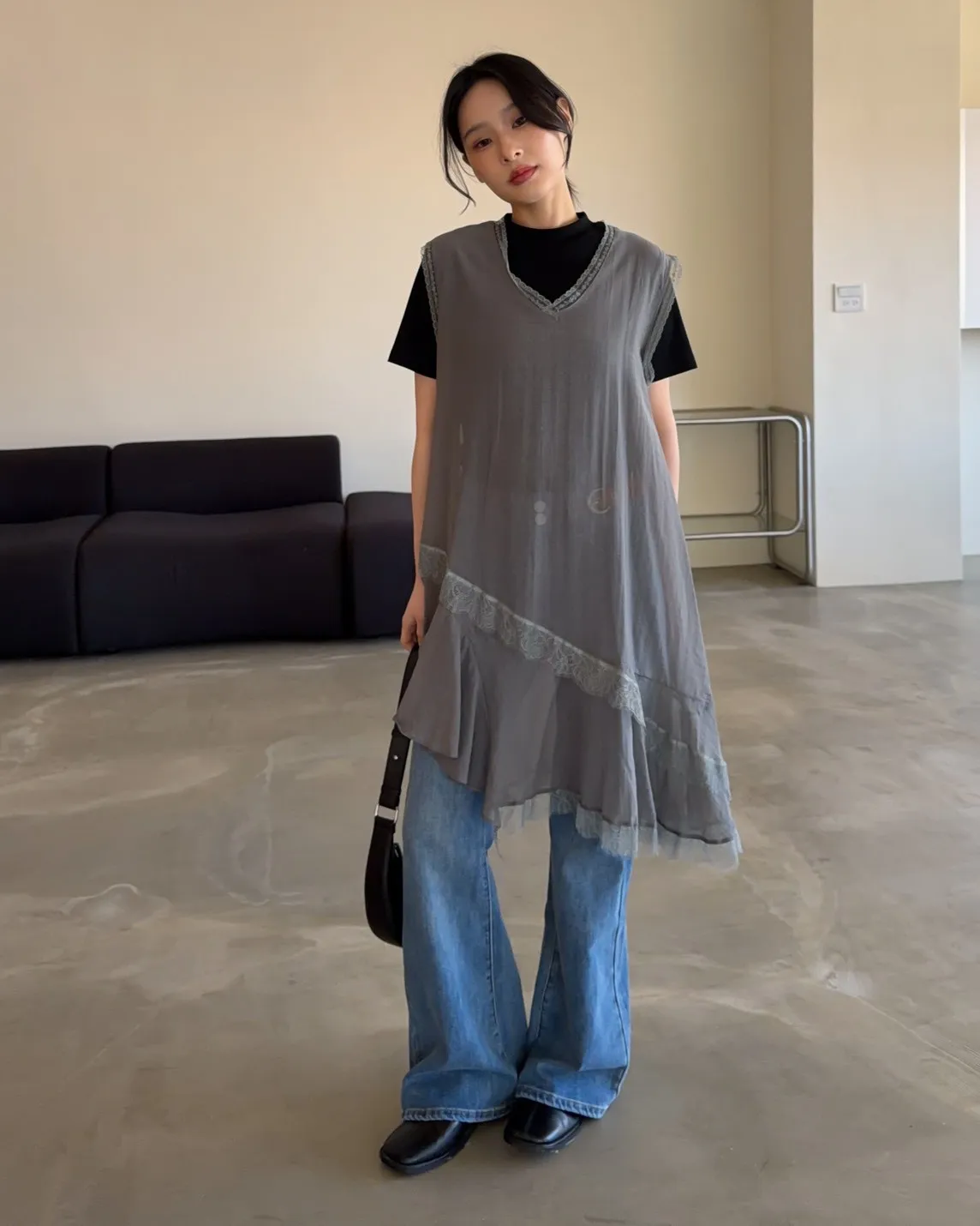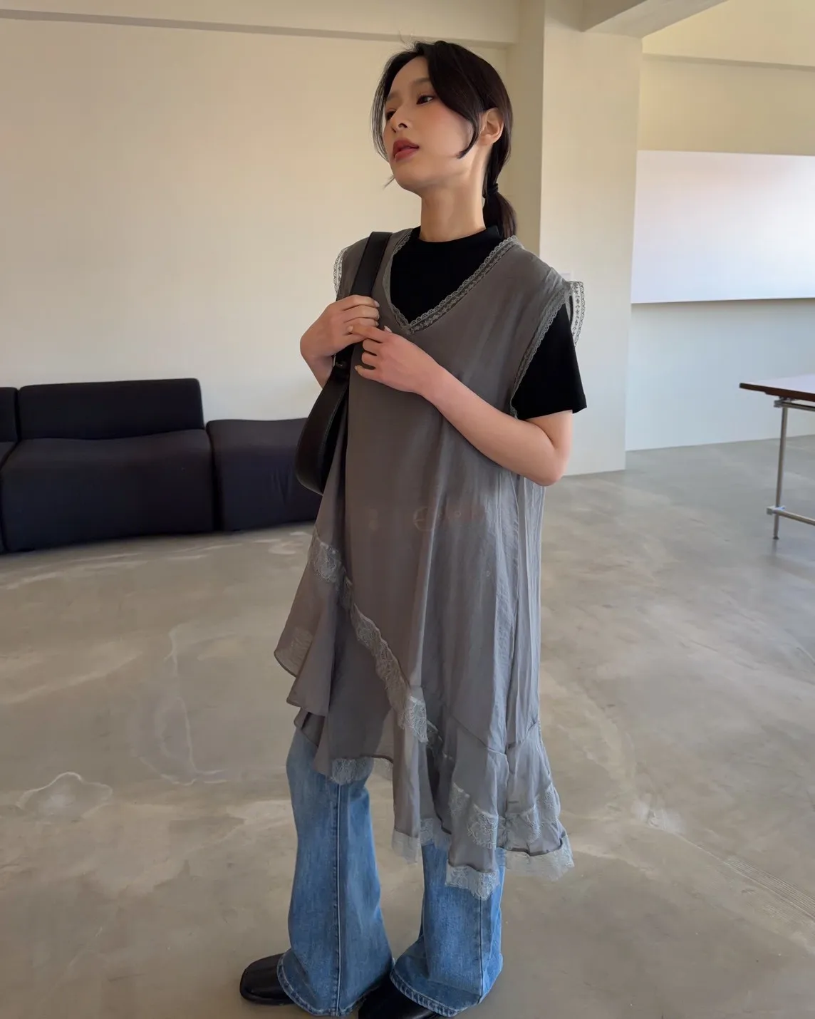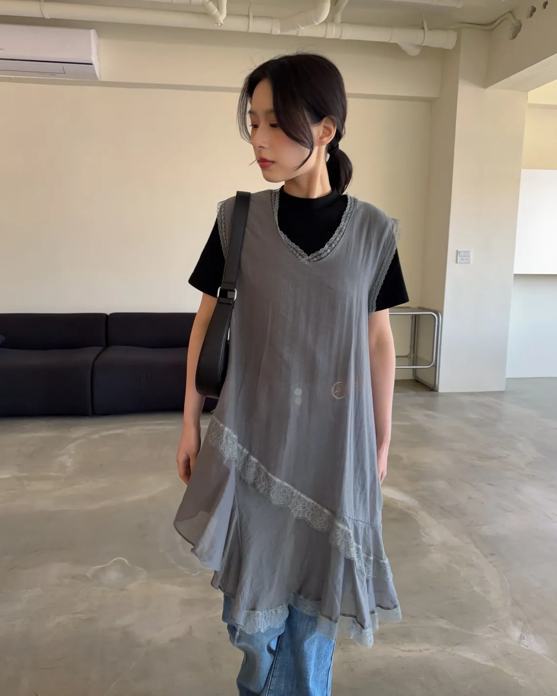 V領 領口/袖口蕾絲滾邊 輕薄微透 蕾絲斜下擺