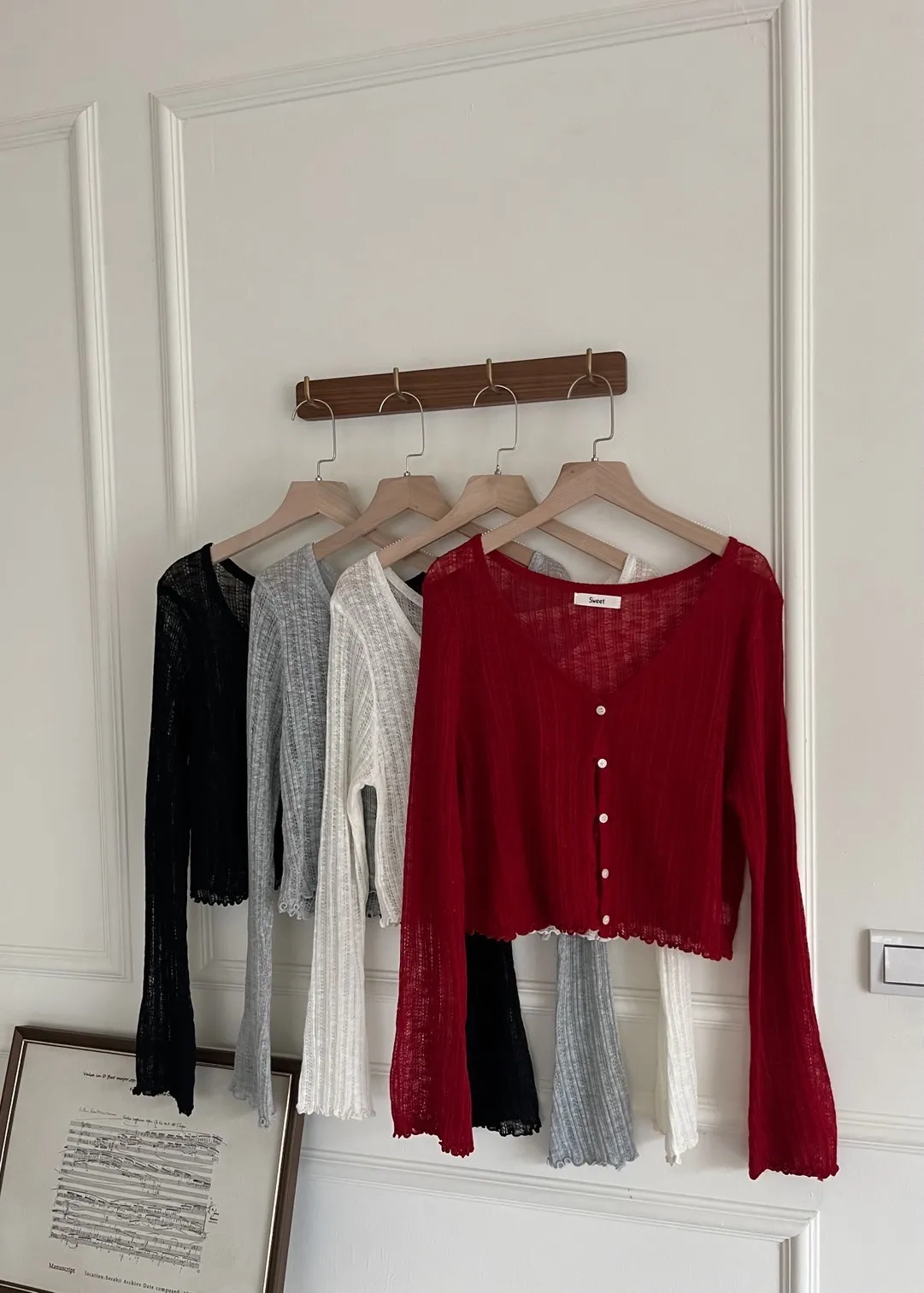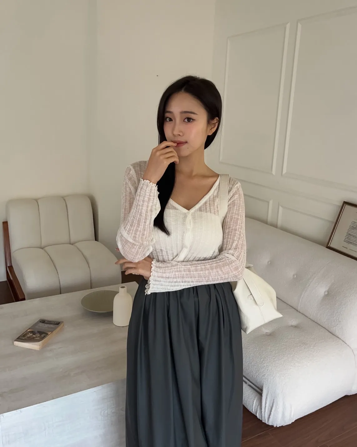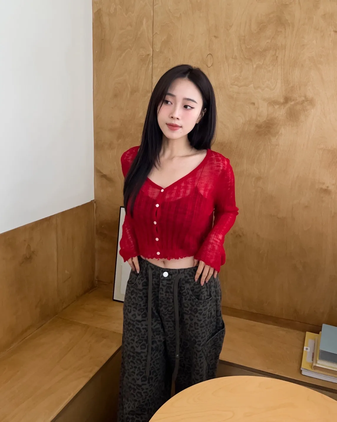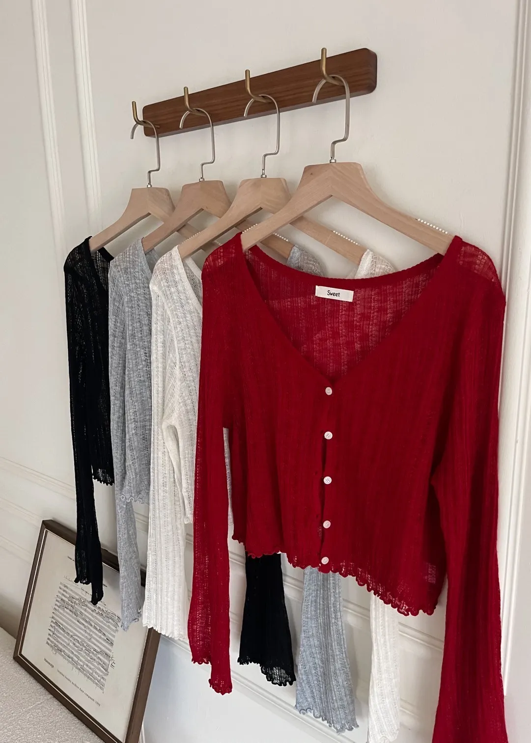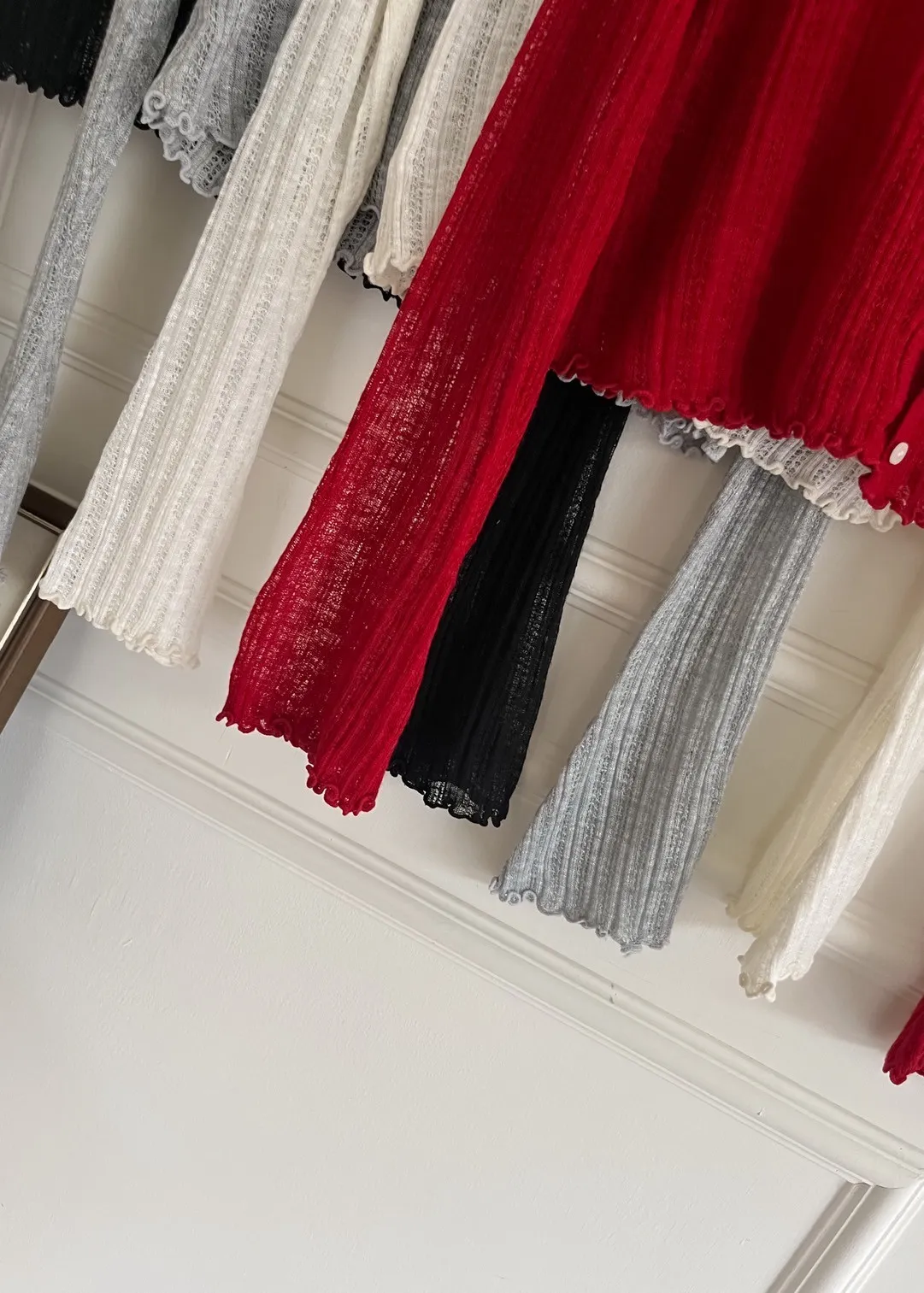T0042喇叭袖捲邊鏤空針織上衣(米白/紅/灰/黑)