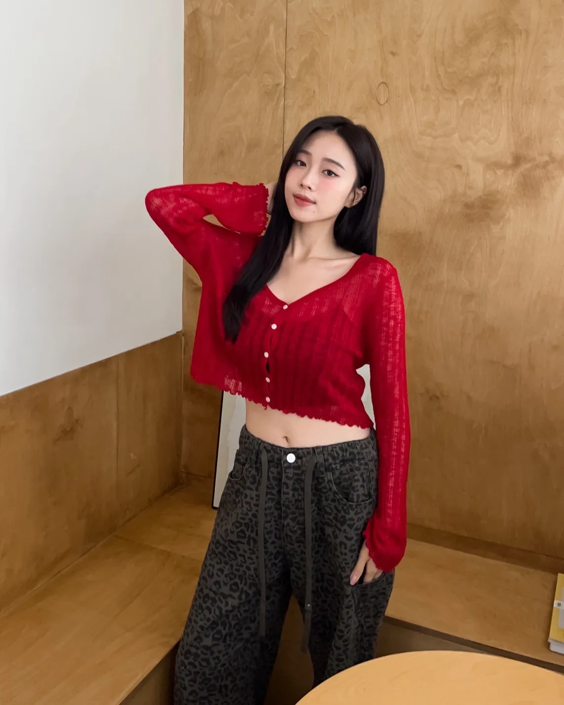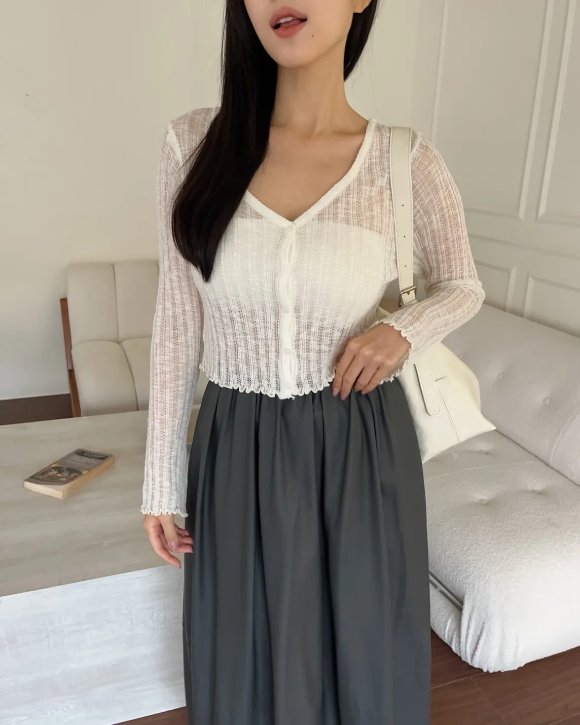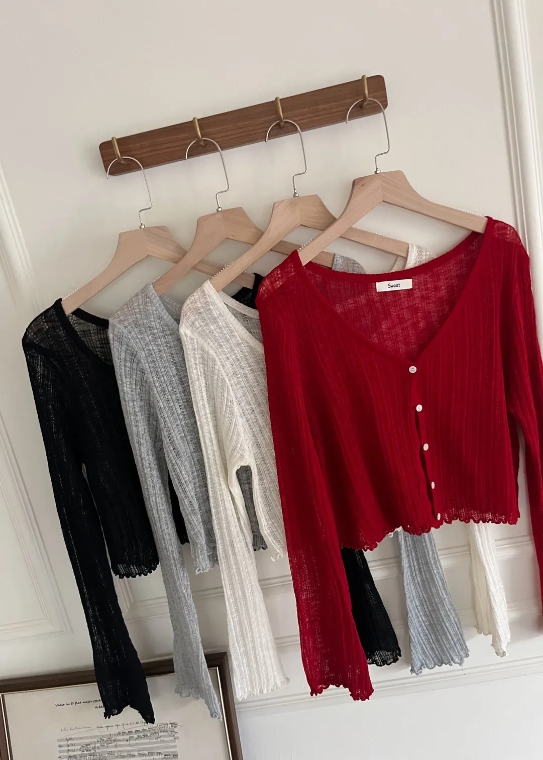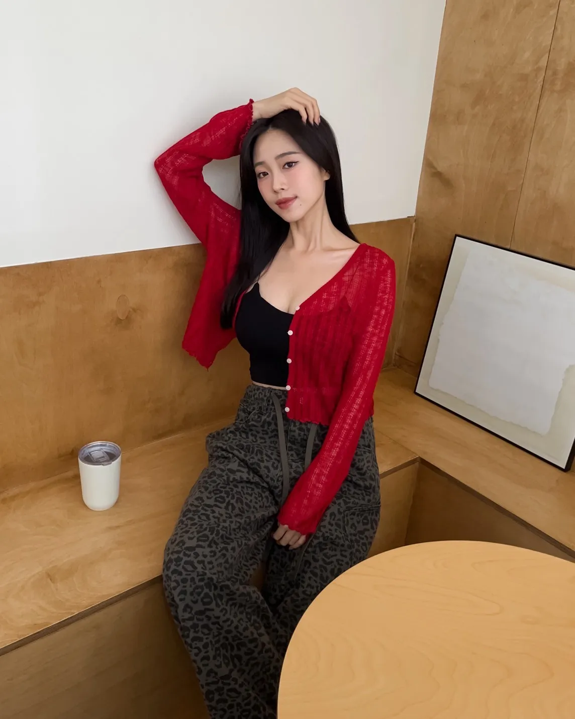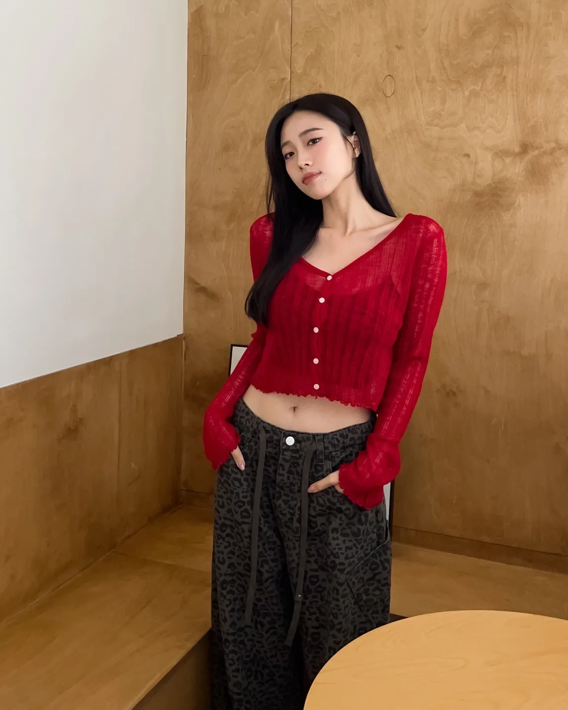 T0042喇叭袖捲邊鏤空針織上衣(米白/紅/灰/黑)