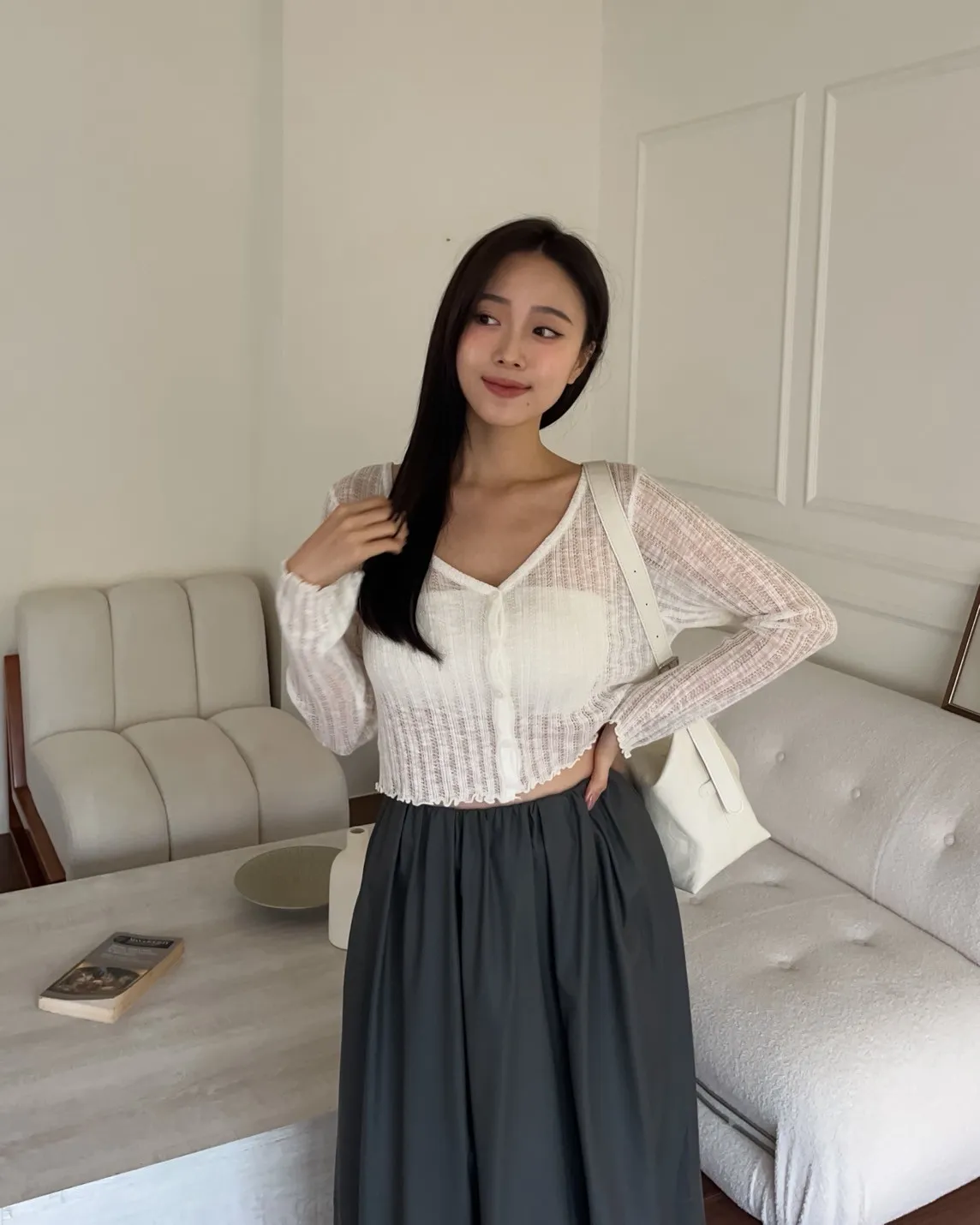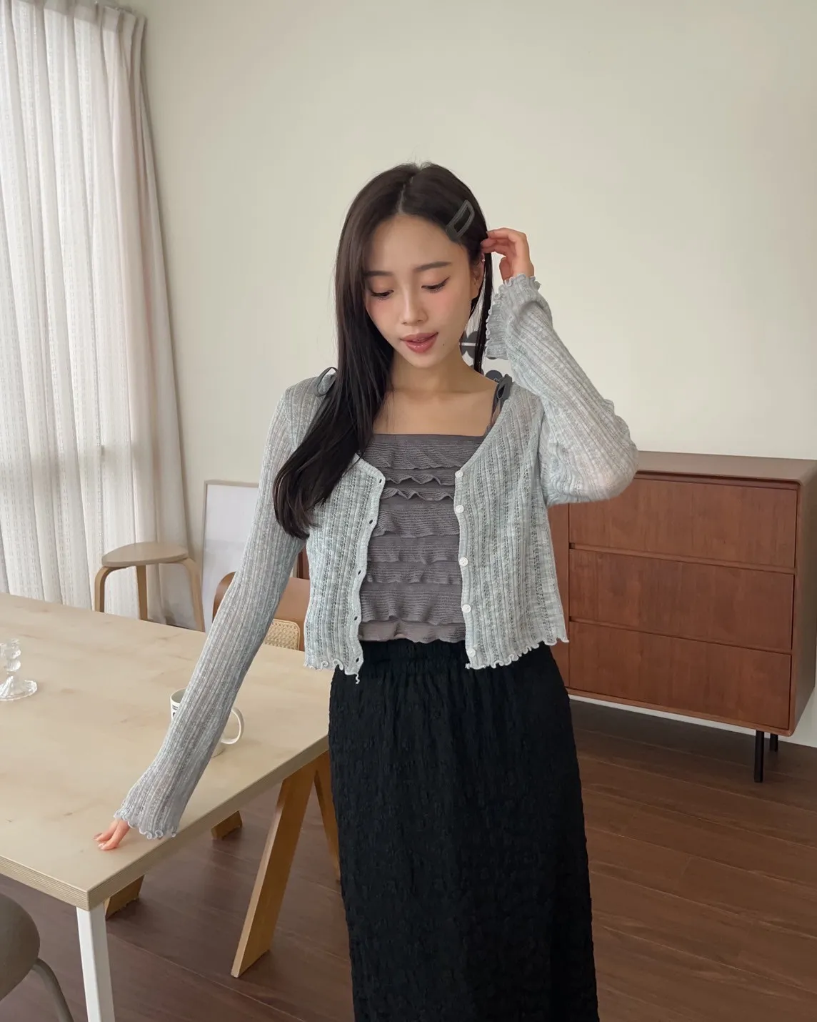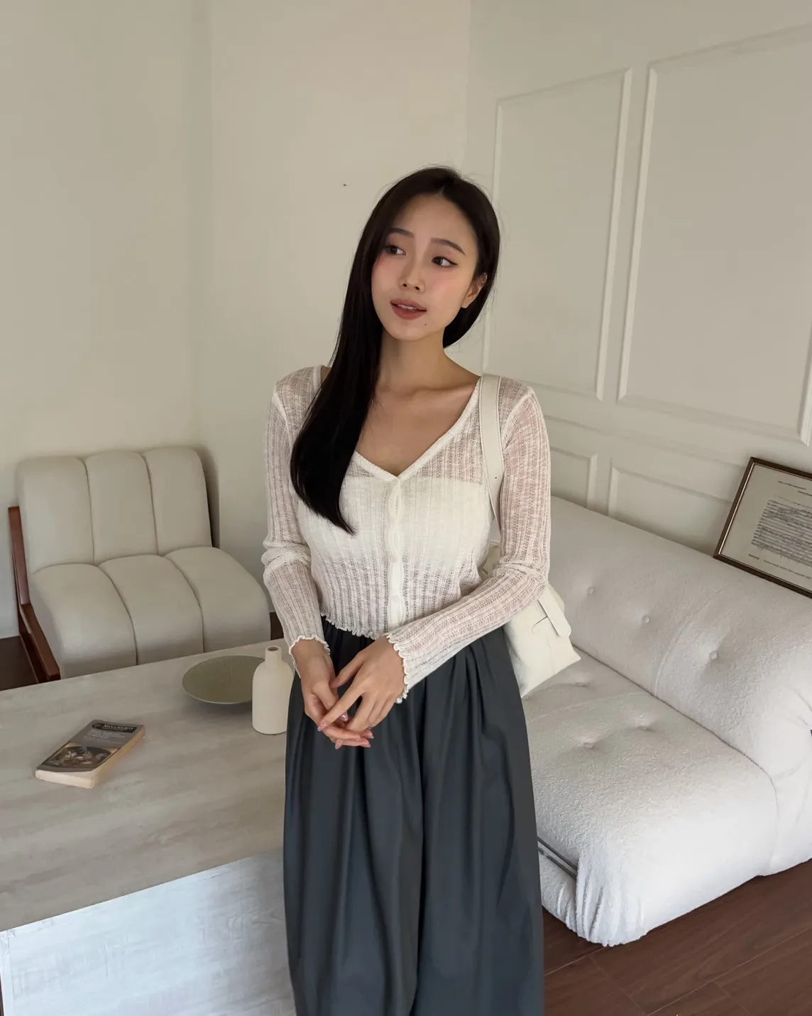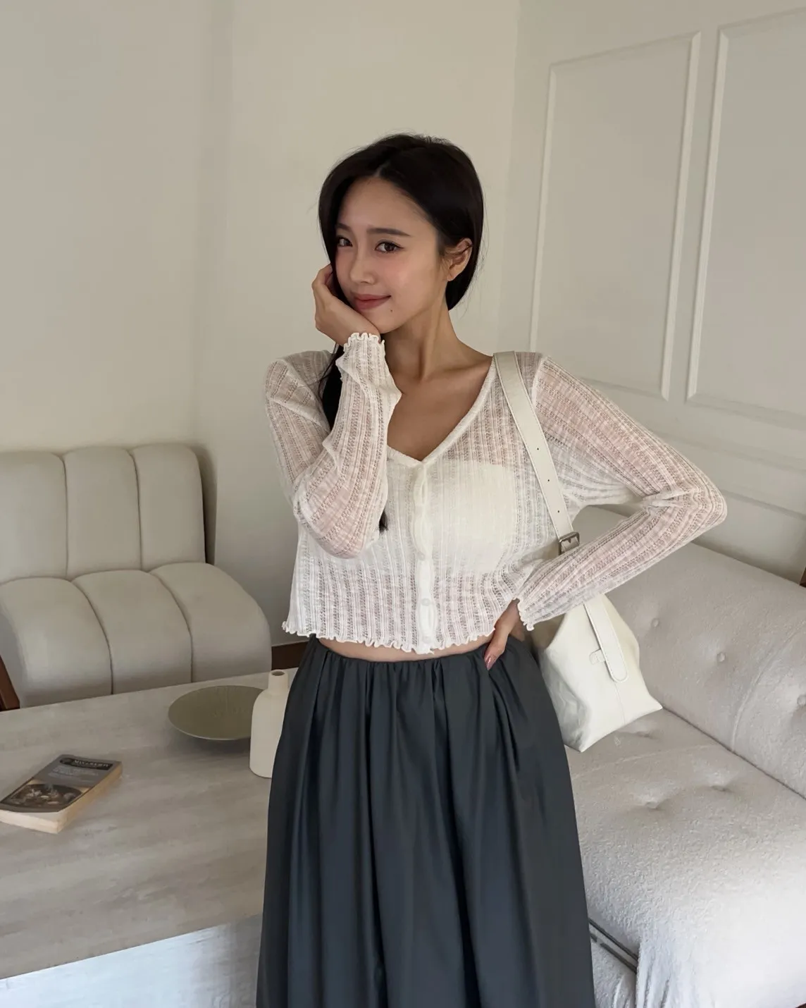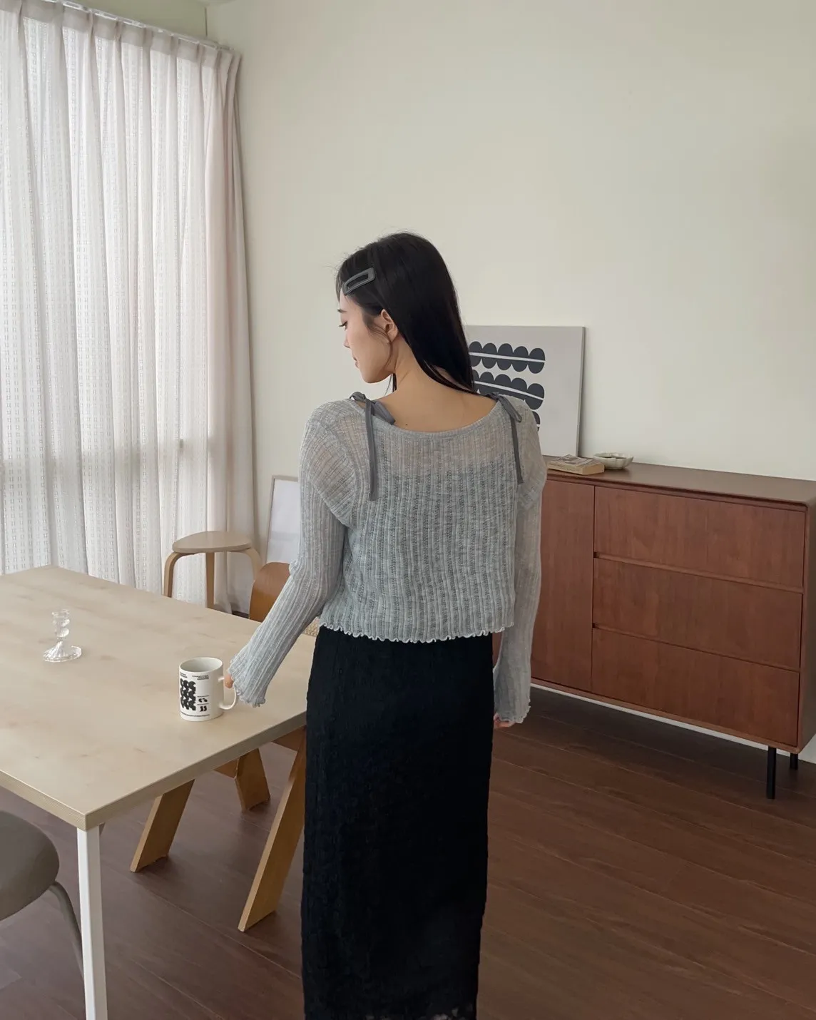 T0042喇叭袖捲邊鏤空針織上衣(米白/紅/灰/黑)