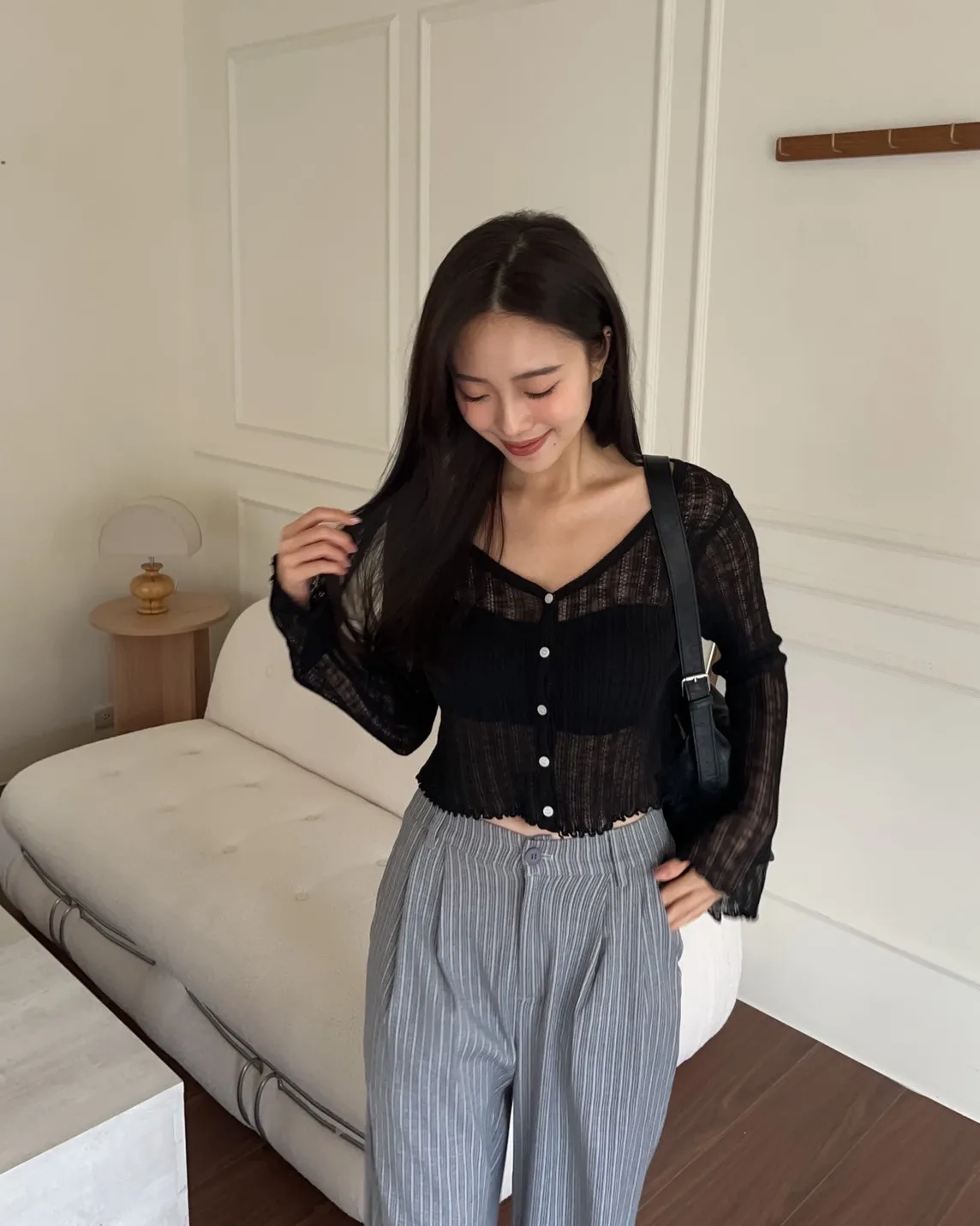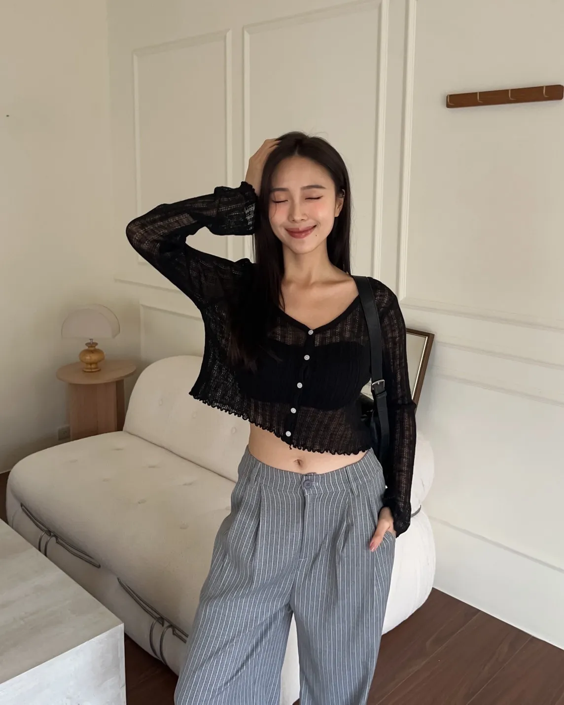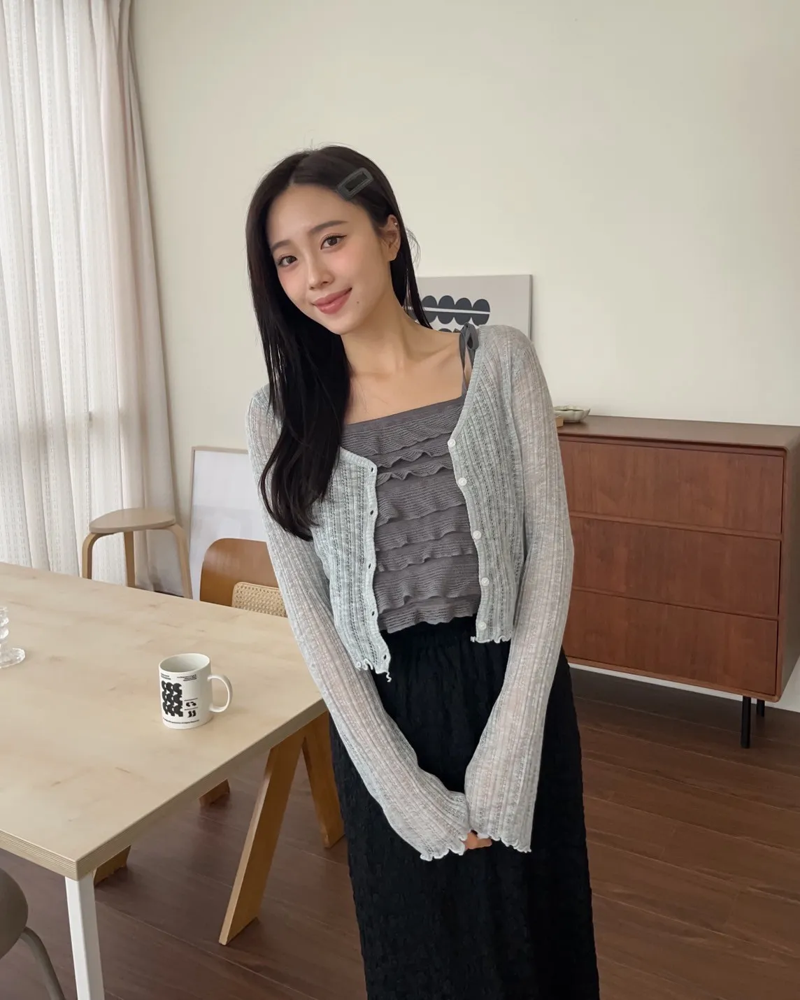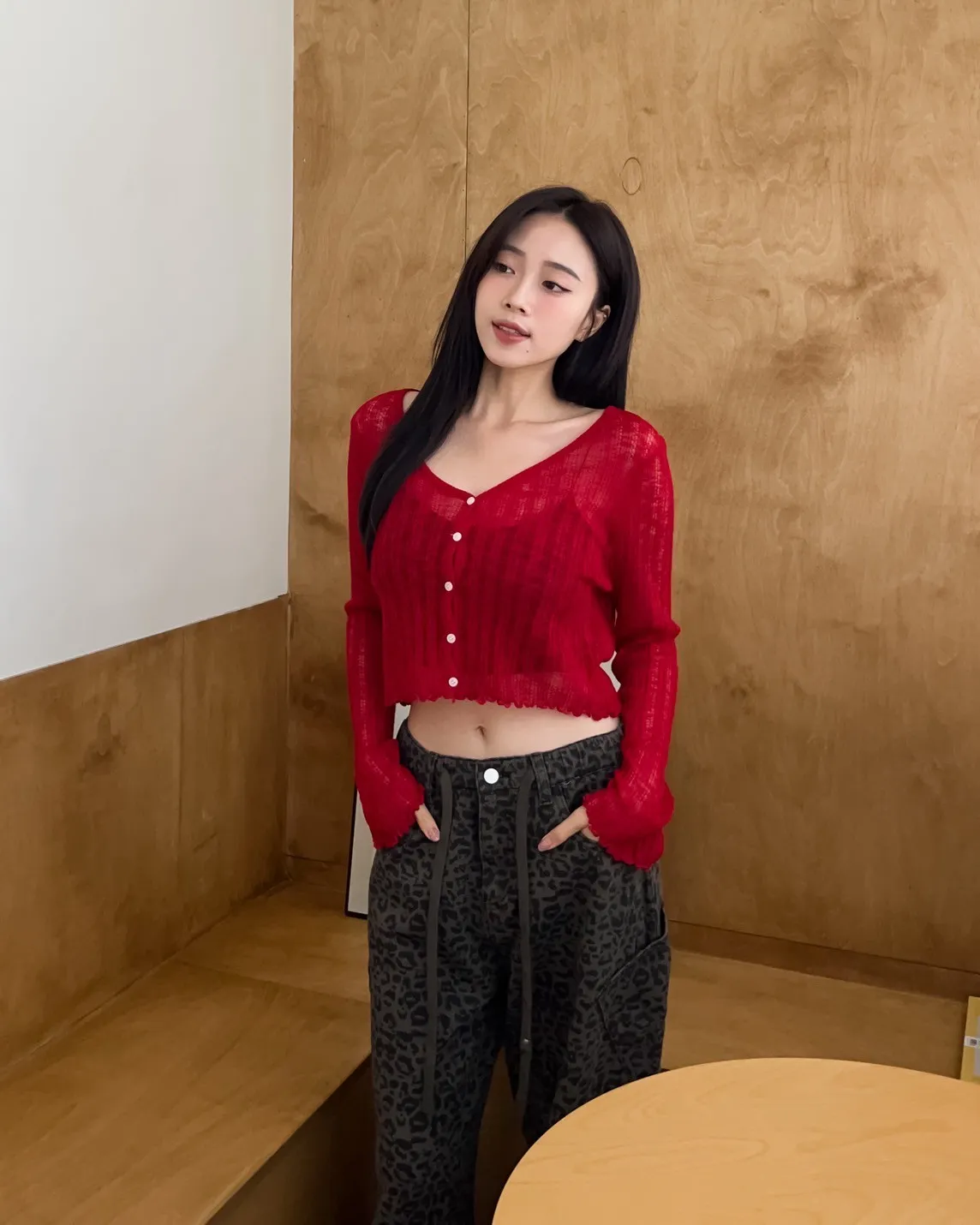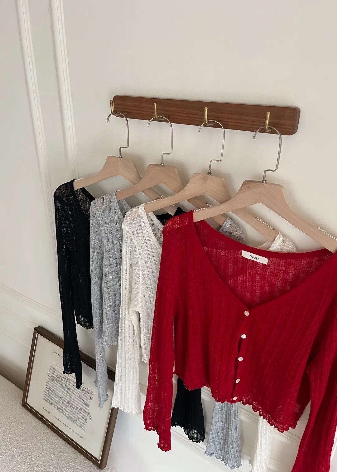 T0042喇叭袖捲邊鏤空針織上衣(米白/紅/灰/黑)