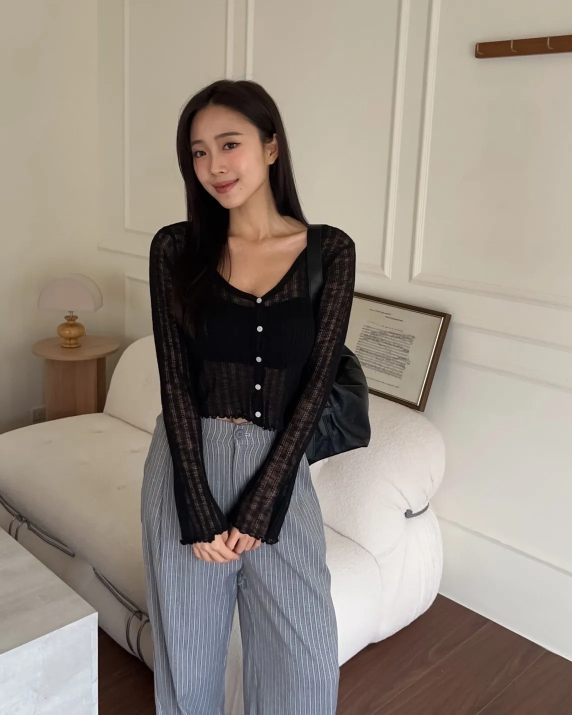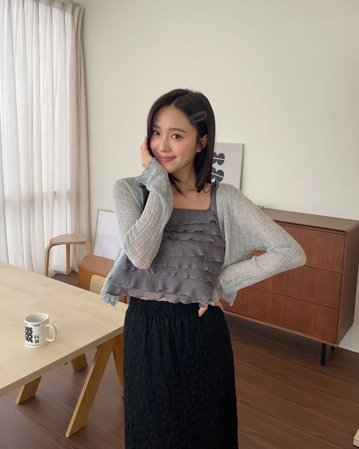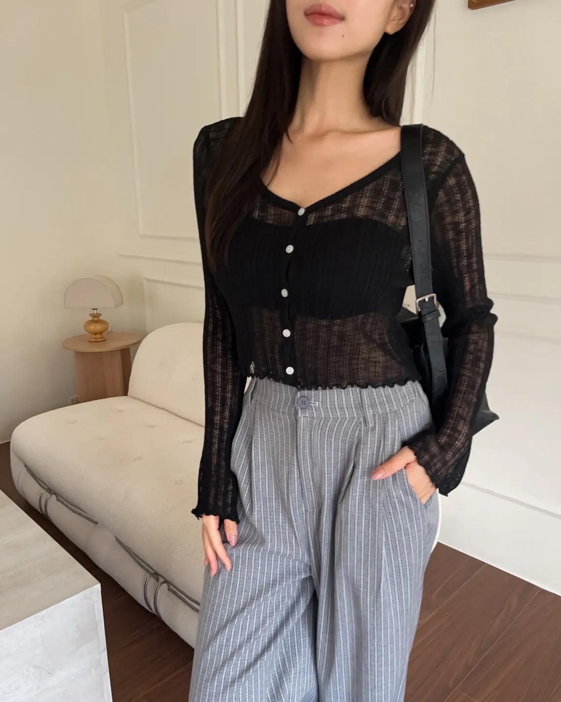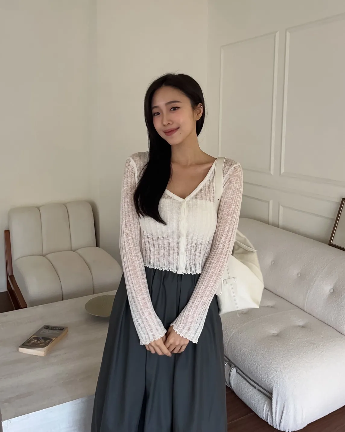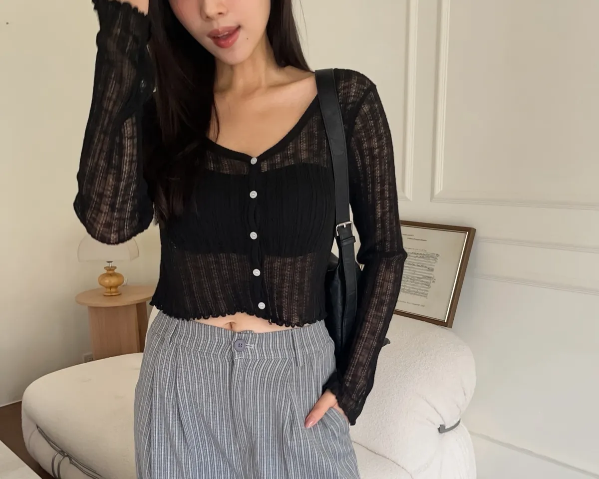 T0042喇叭袖捲邊鏤空針織上衣(米白/紅/灰/黑)