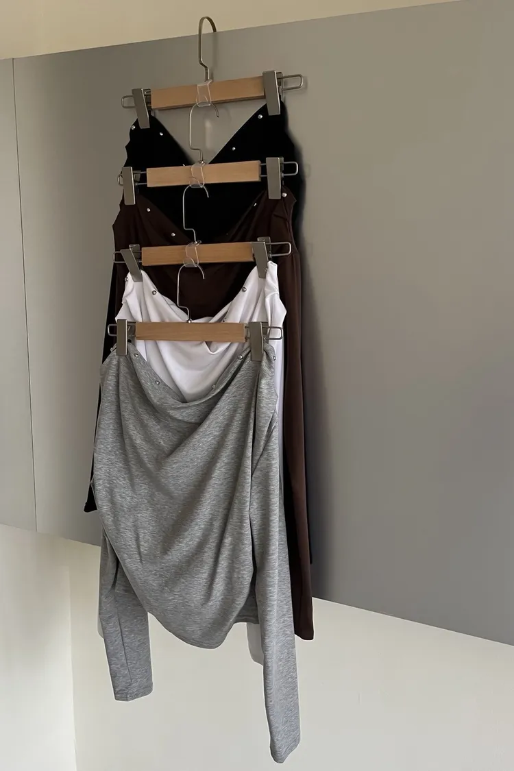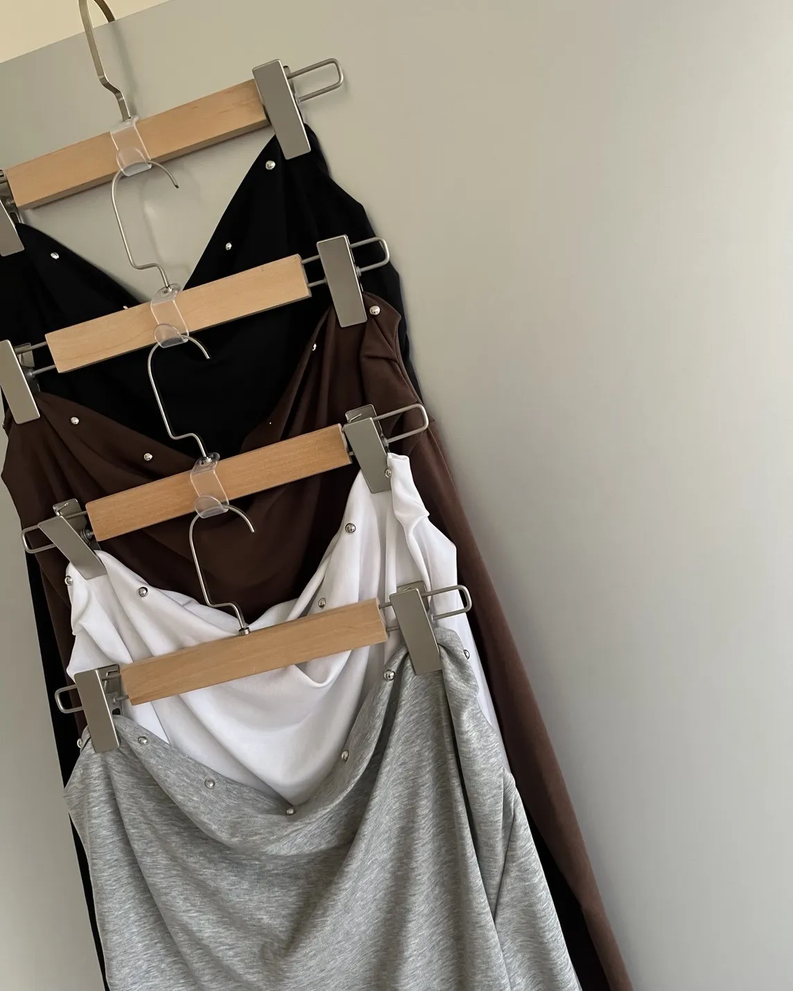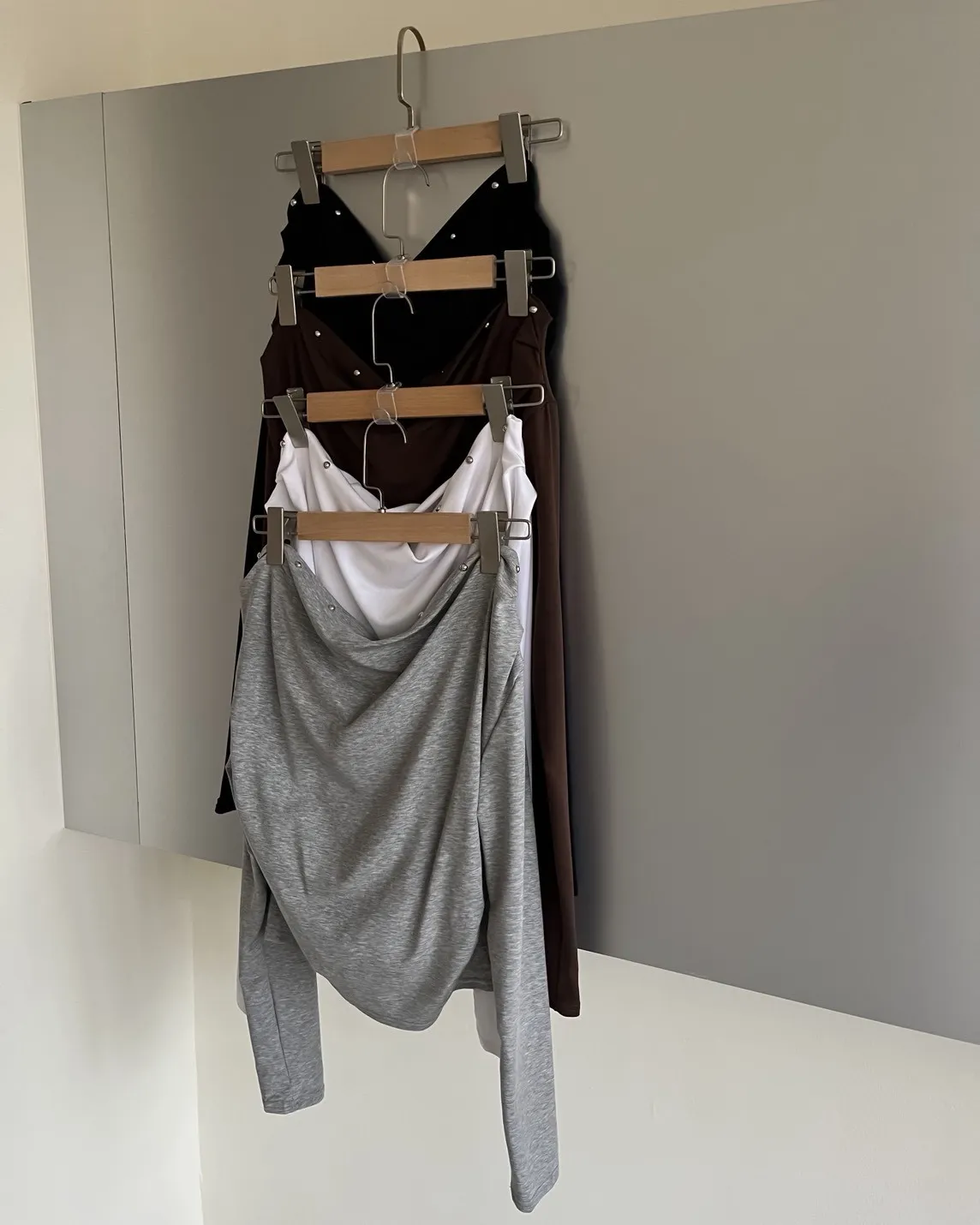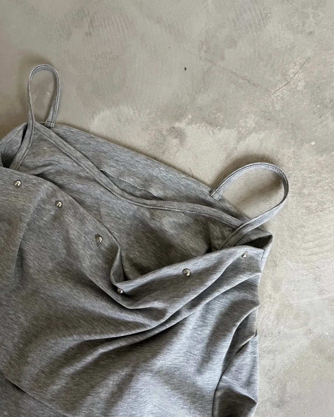 假兩件 內有細肩小背心(固定不可拆) 胸前鉚釘裝飾 平領 彈性滑棉料 兩側腰抓皺