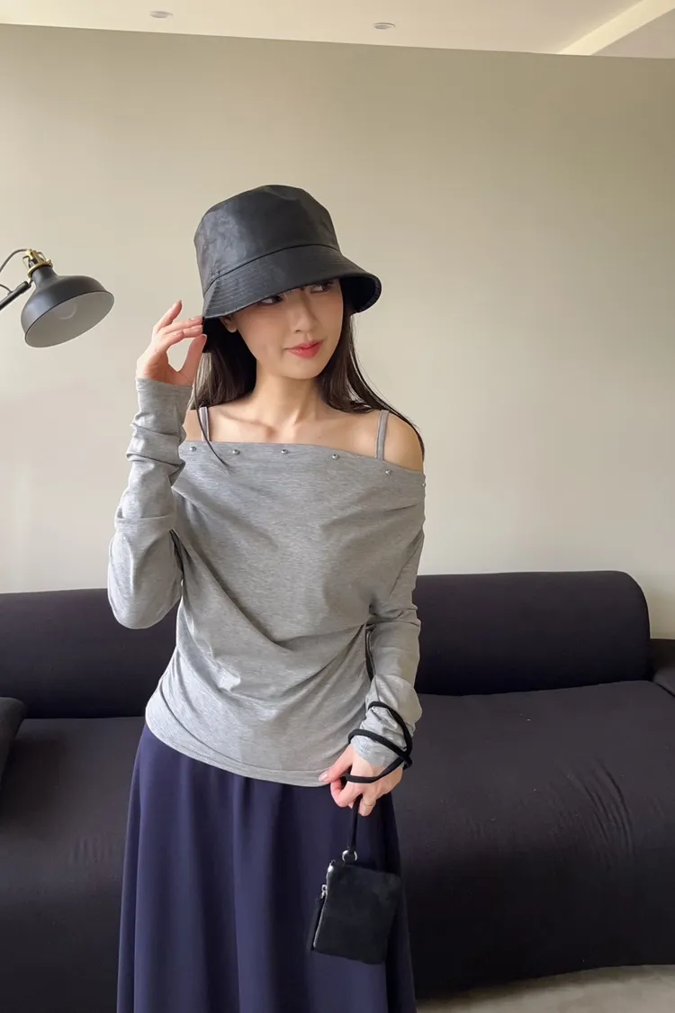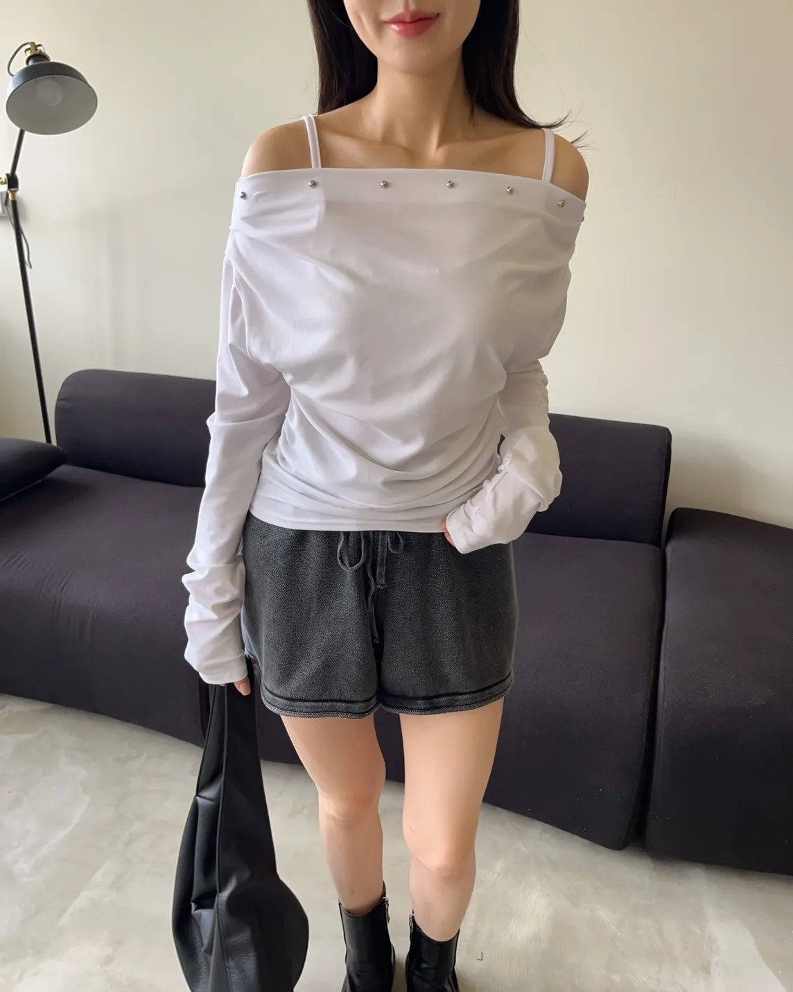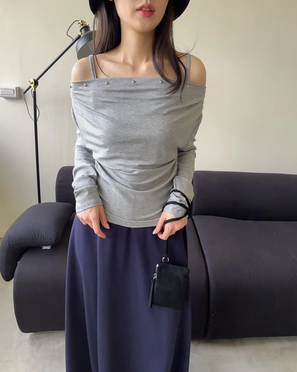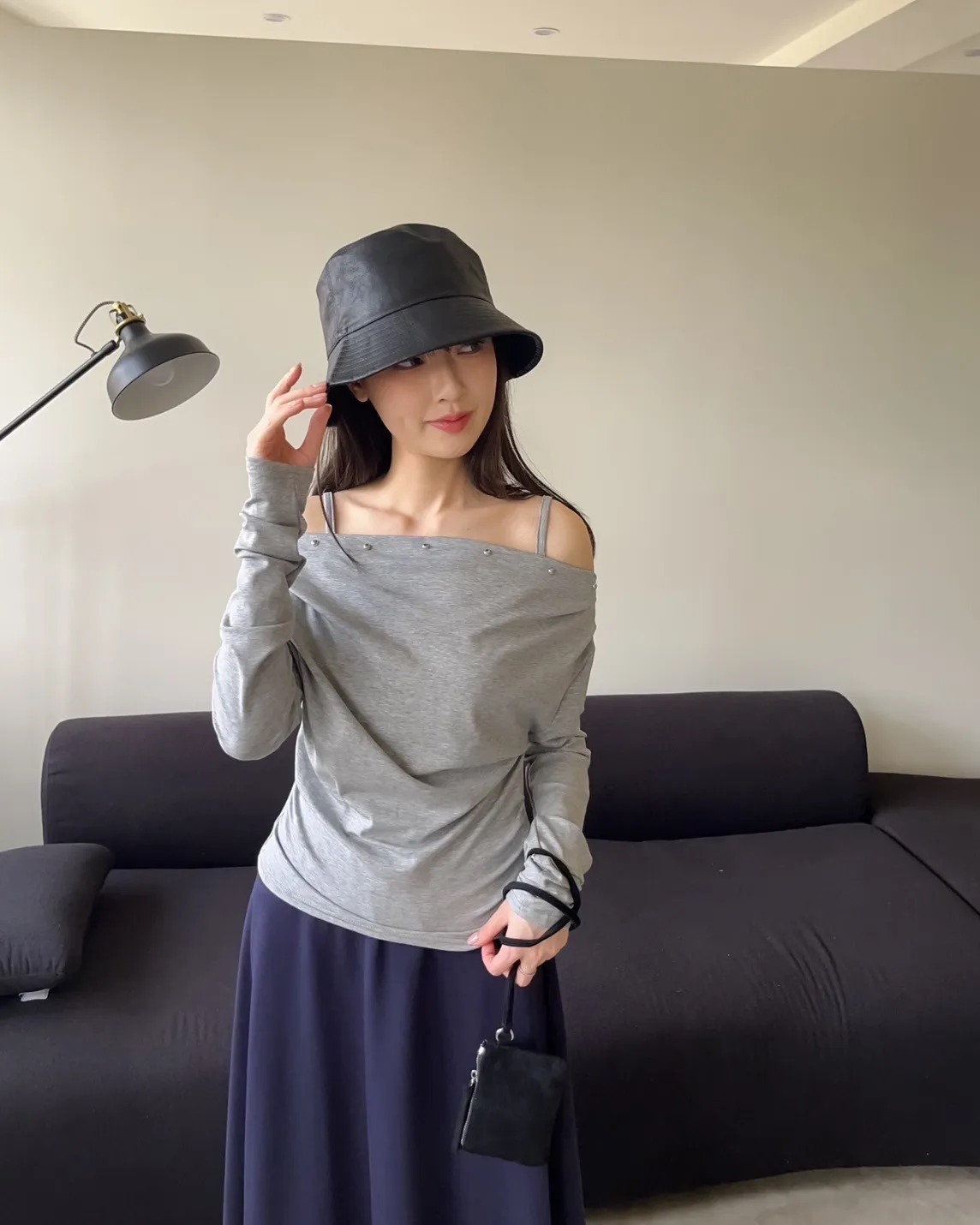 假兩件 內有細肩小背心(固定不可拆) 胸前鉚釘裝飾 平領 彈性滑棉料 兩側腰抓皺